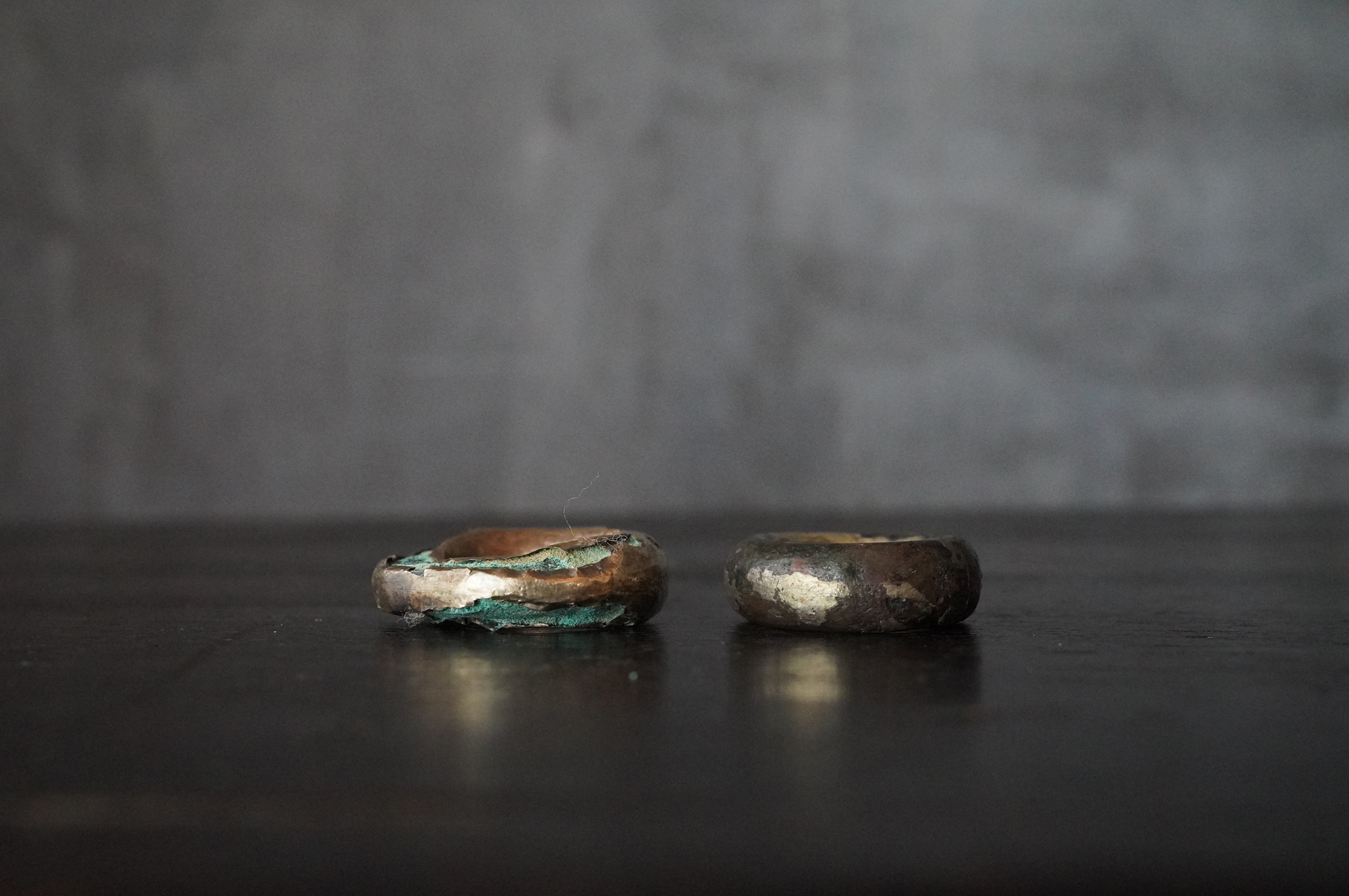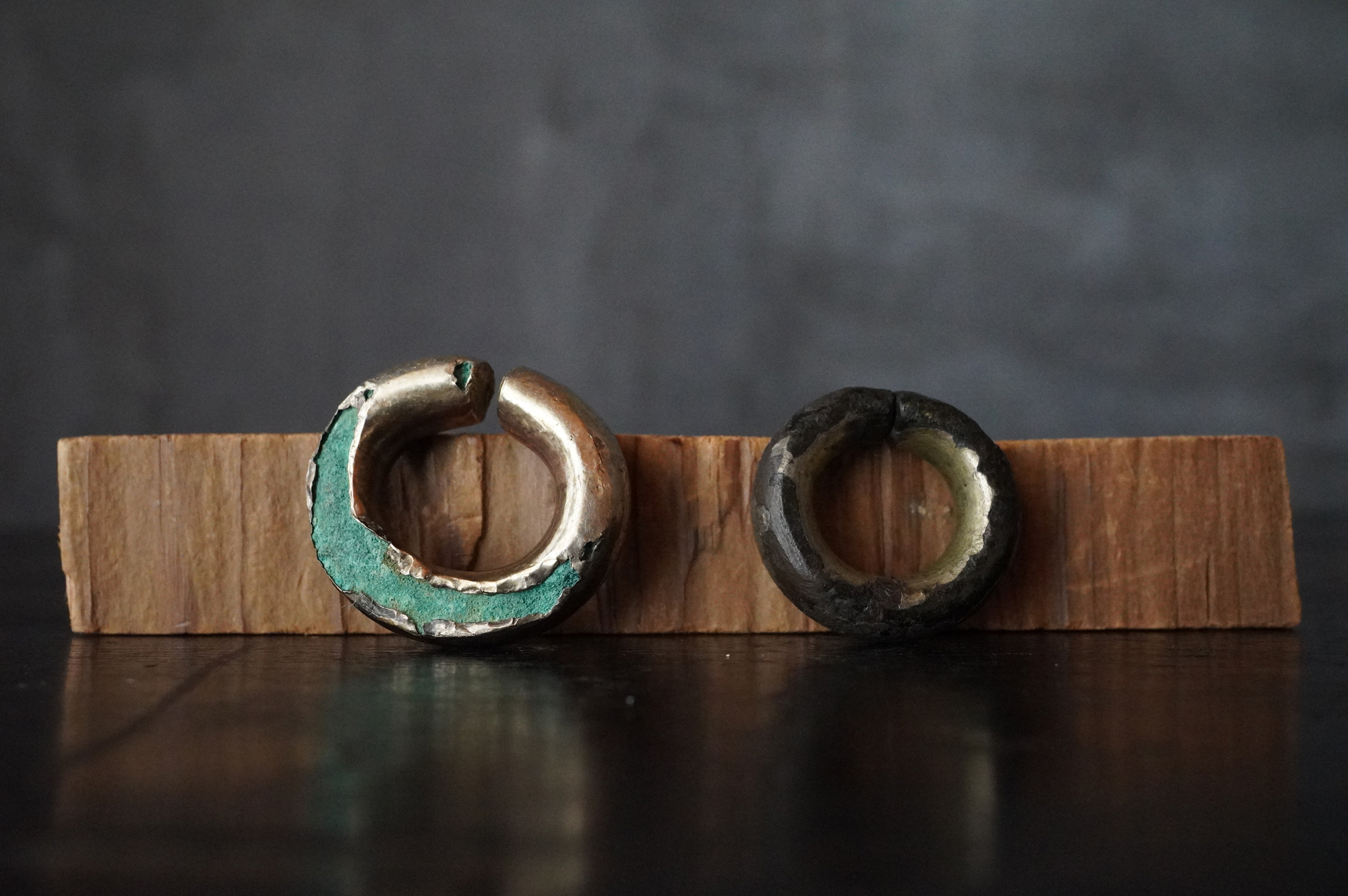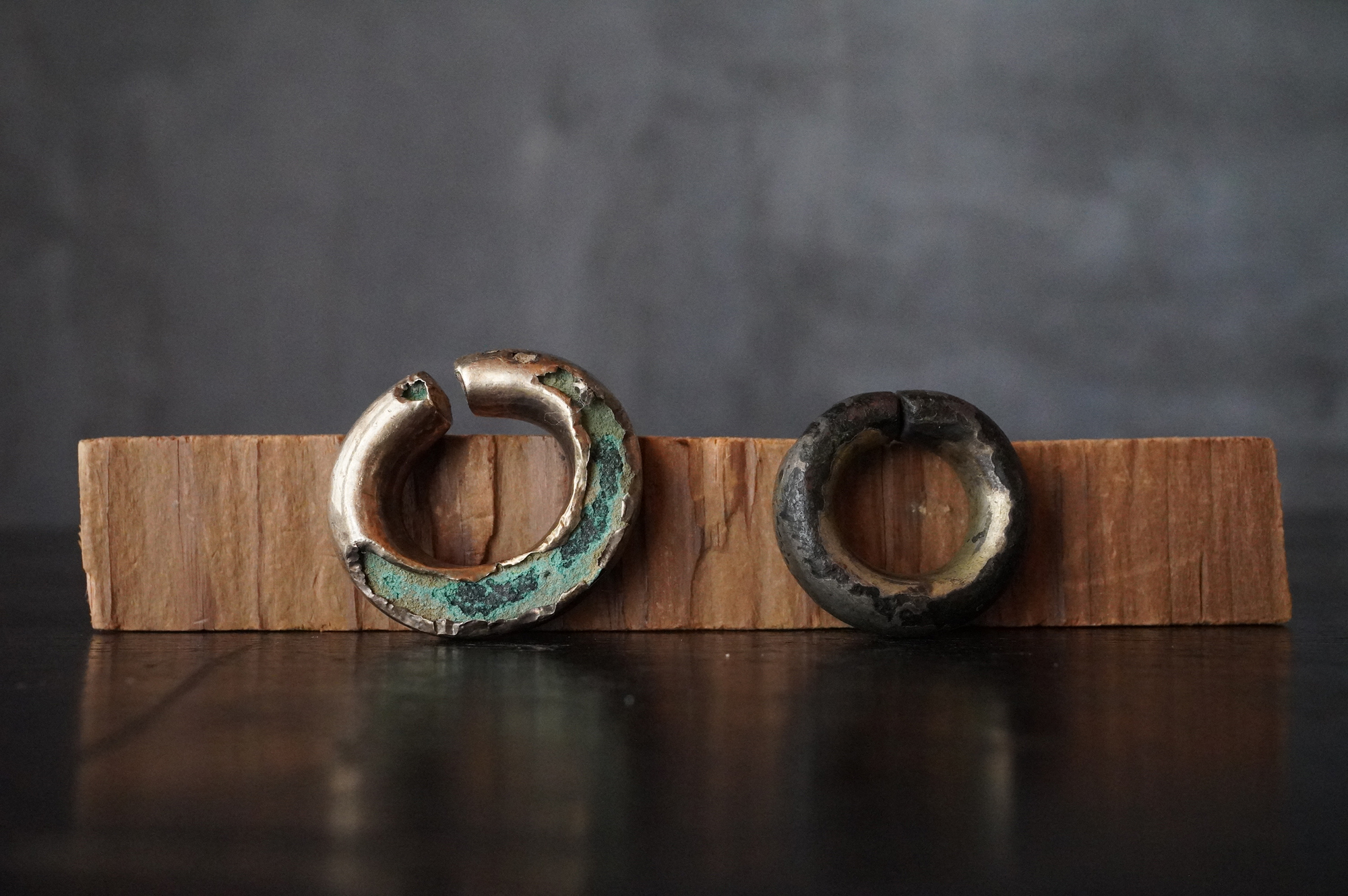 金環2点、銀環3点、白色石製品1点の計6点から成る一括資料。各資料には腐食が認められるものの、一部にはなお金属光沢(黄金色・銀白色)が残存しており、古墳時代の装身具としての性格を十分に示しております。腐食の様相、保存状態から、同一遺構に由来する可能性が高いと考えられますが詳細な出土状況についてはわかりません。古墳時代。