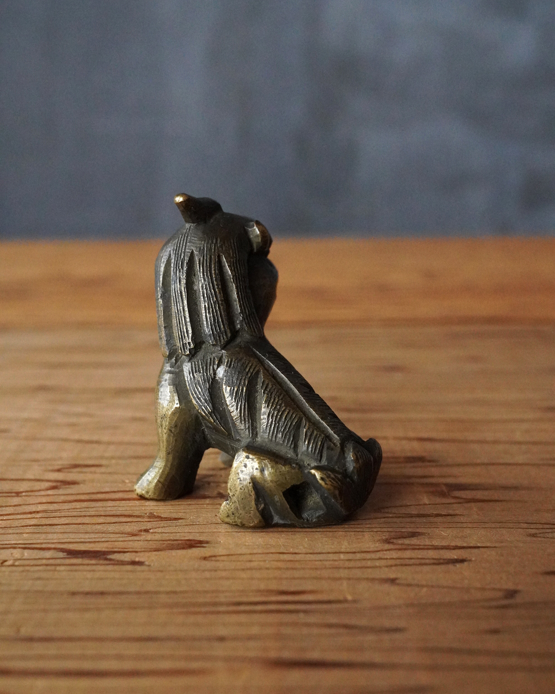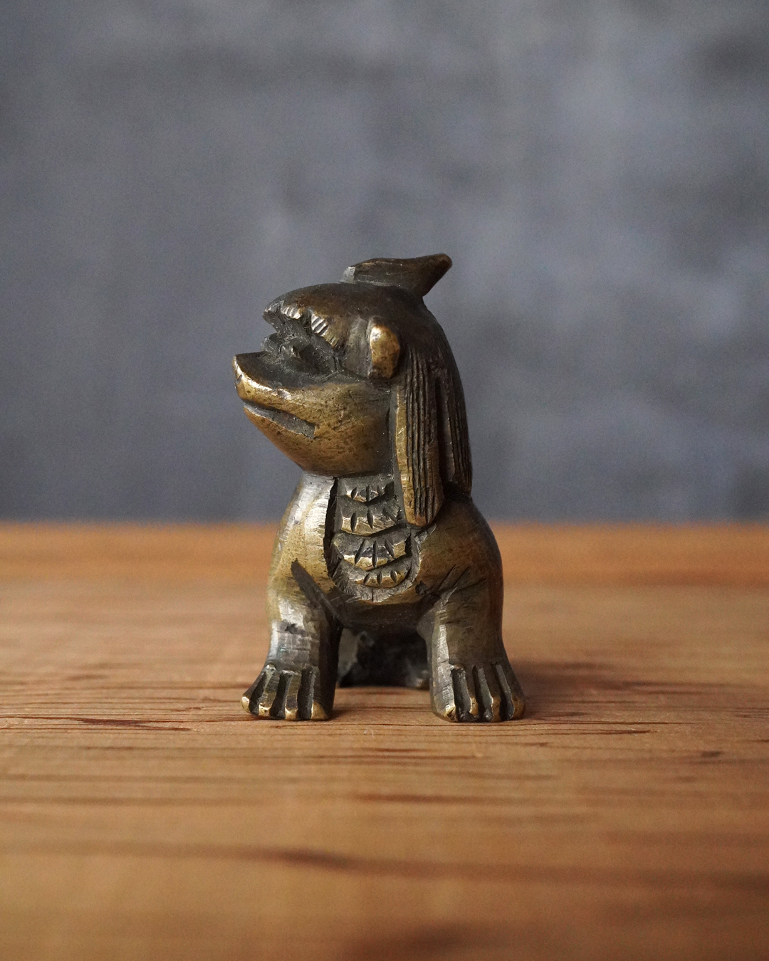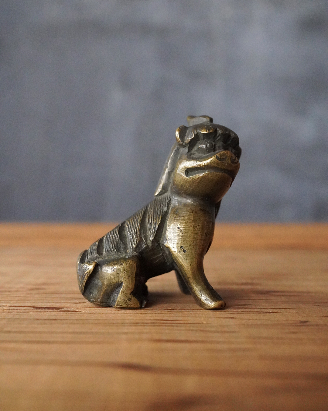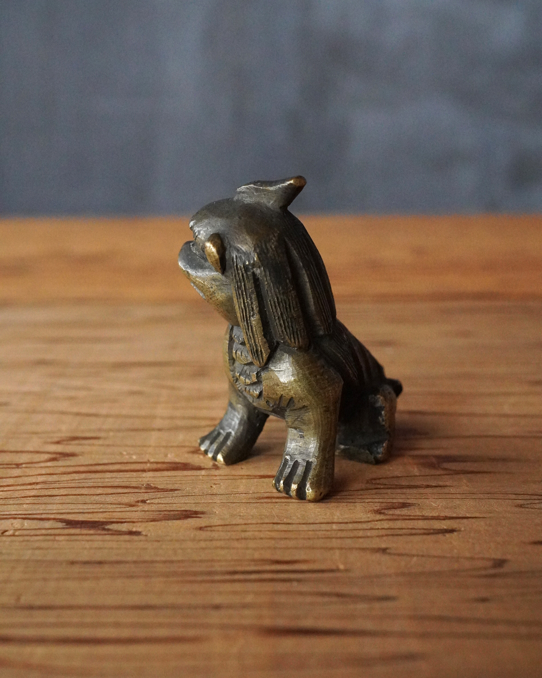 太い足でどっしりと踏ん張った姿が力強く、どこか愛らしい趣のある獅子像です。鏨で細やかに刻まれた立ち鬣は生き生きとした表情を与え、丸っこい体つきには温かみのある魅力が感じられます。もとは香炉の蓋のつまみとして用いられていたものと思われますが、後には数寄者によって書鎮などに見立てられ、日々の暮らしに遊び心を添えてきたのでしょう。江戸時代。