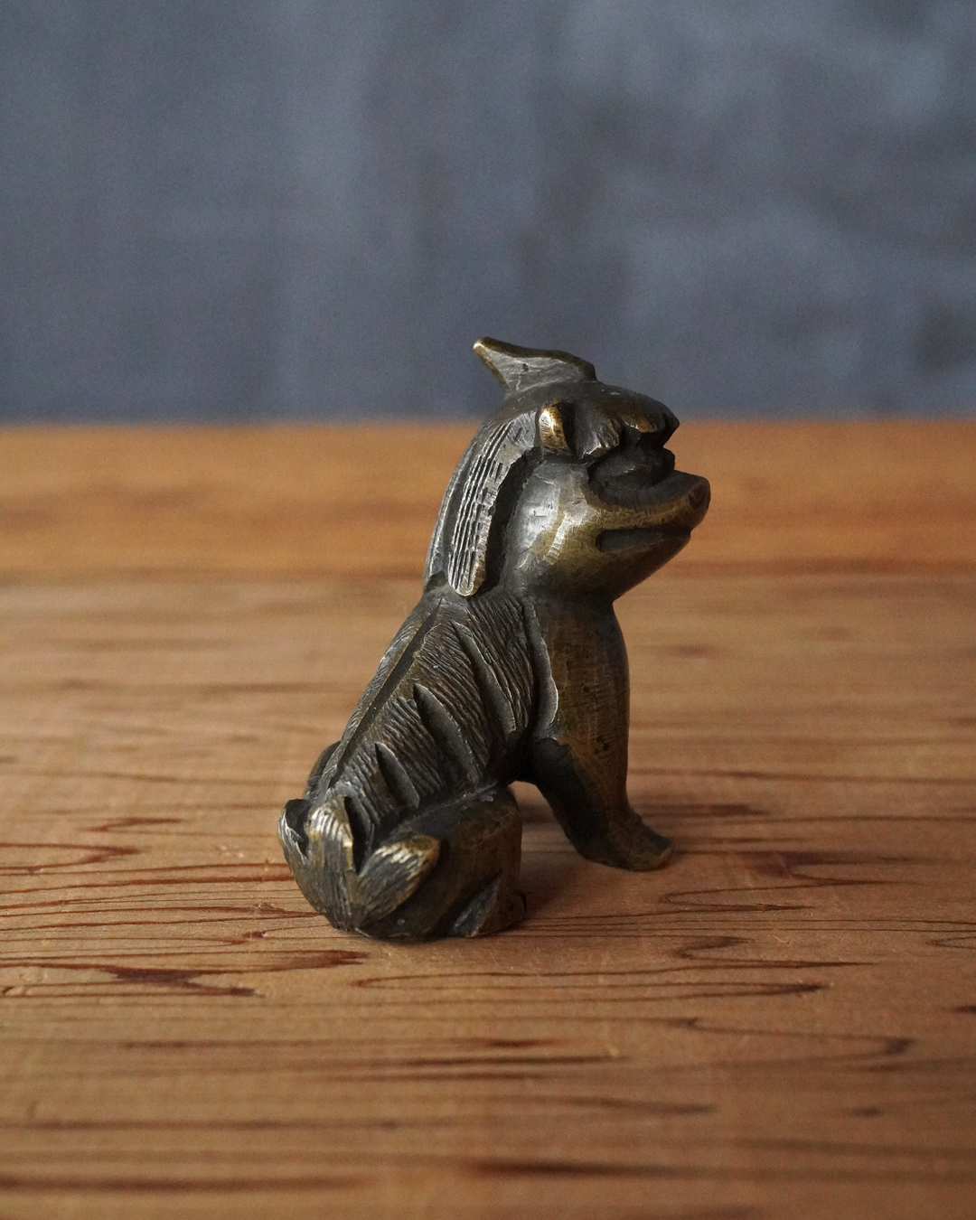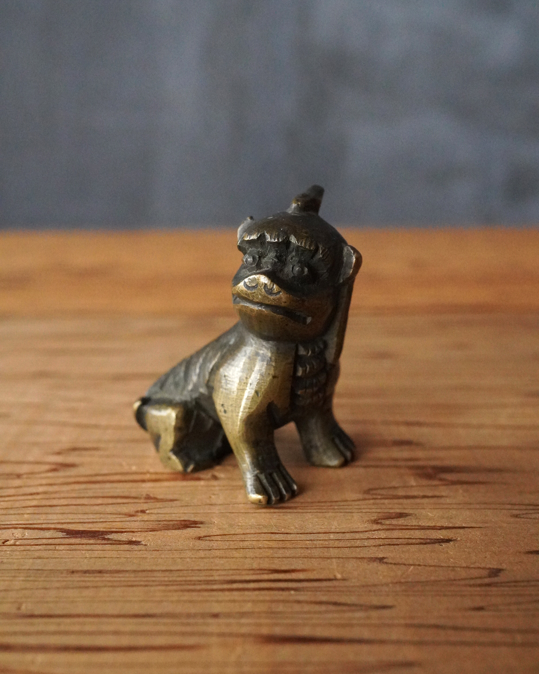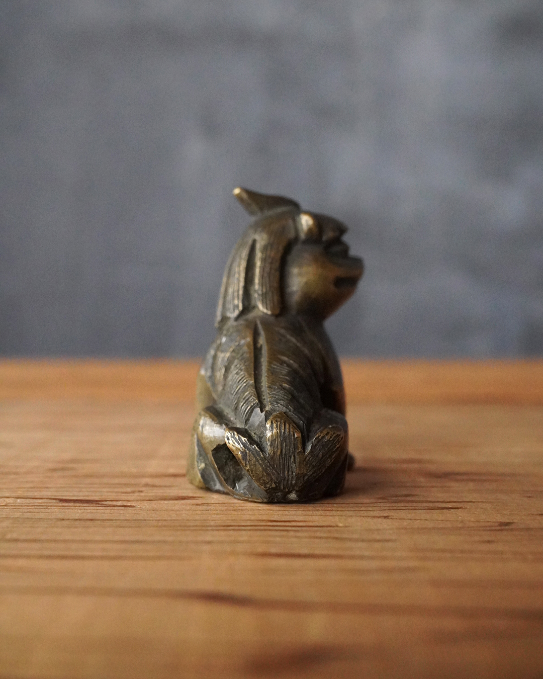 太い足でどっしりと踏ん張った姿が力強く、どこか愛らしい趣のある獅子像です。鏨で細やかに刻まれた立ち鬣は生き生きとした表情を与え、丸っこい体つきには温かみのある魅力が感じられます。もとは香炉の蓋のつまみとして用いられていたものと思われますが、後には数寄者によって書鎮などに見立てられ、日々の暮らしに遊び心を添えてきたのでしょう。江戸時代。