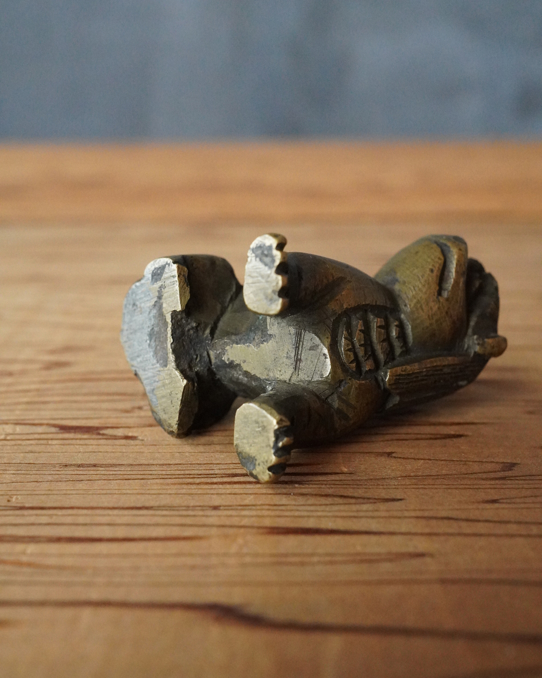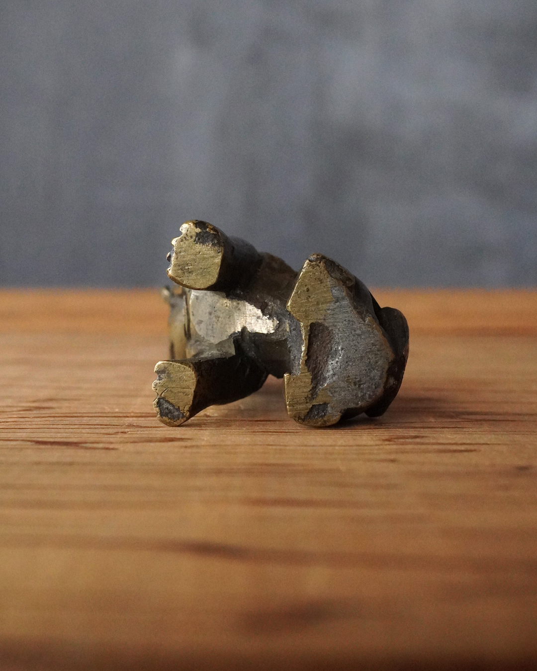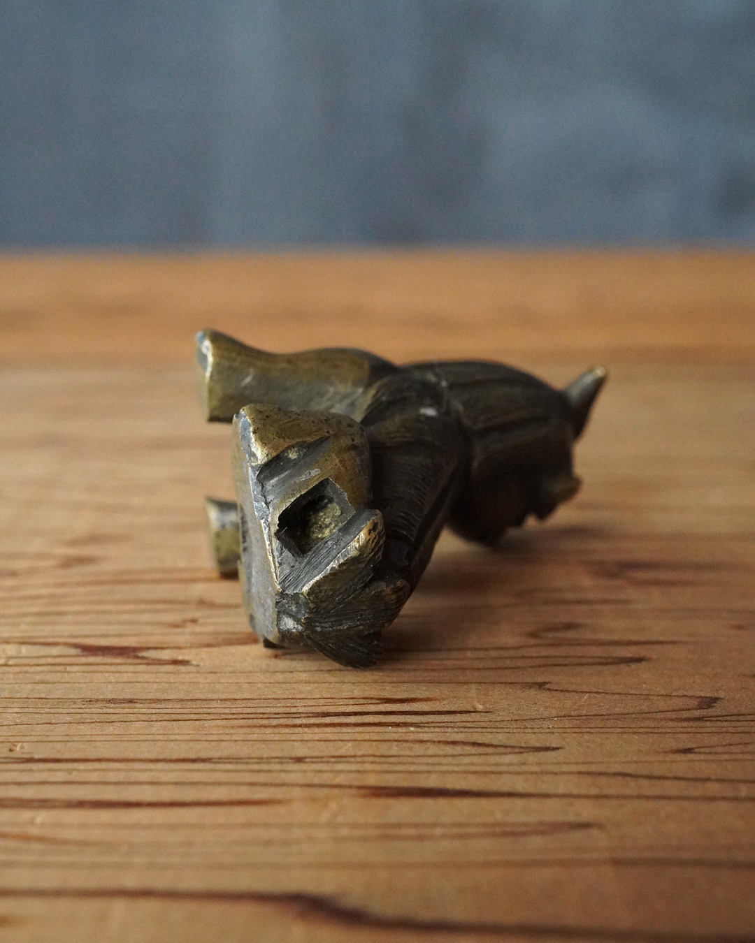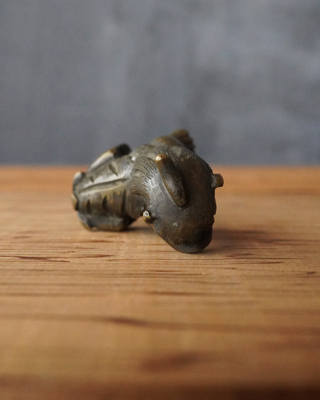 太い足でどっしりと踏ん張った姿が力強く、どこか愛らしい趣のある獅子像です。鏨で細やかに刻まれた立ち鬣は生き生きとした表情を与え、丸っこい体つきには温かみのある魅力が感じられます。もとは香炉の蓋のつまみとして用いられていたものと思われますが、後には数寄者によって書鎮などに見立てられ、日々の暮らしに遊び心を添えてきたのでしょう。江戸時代。