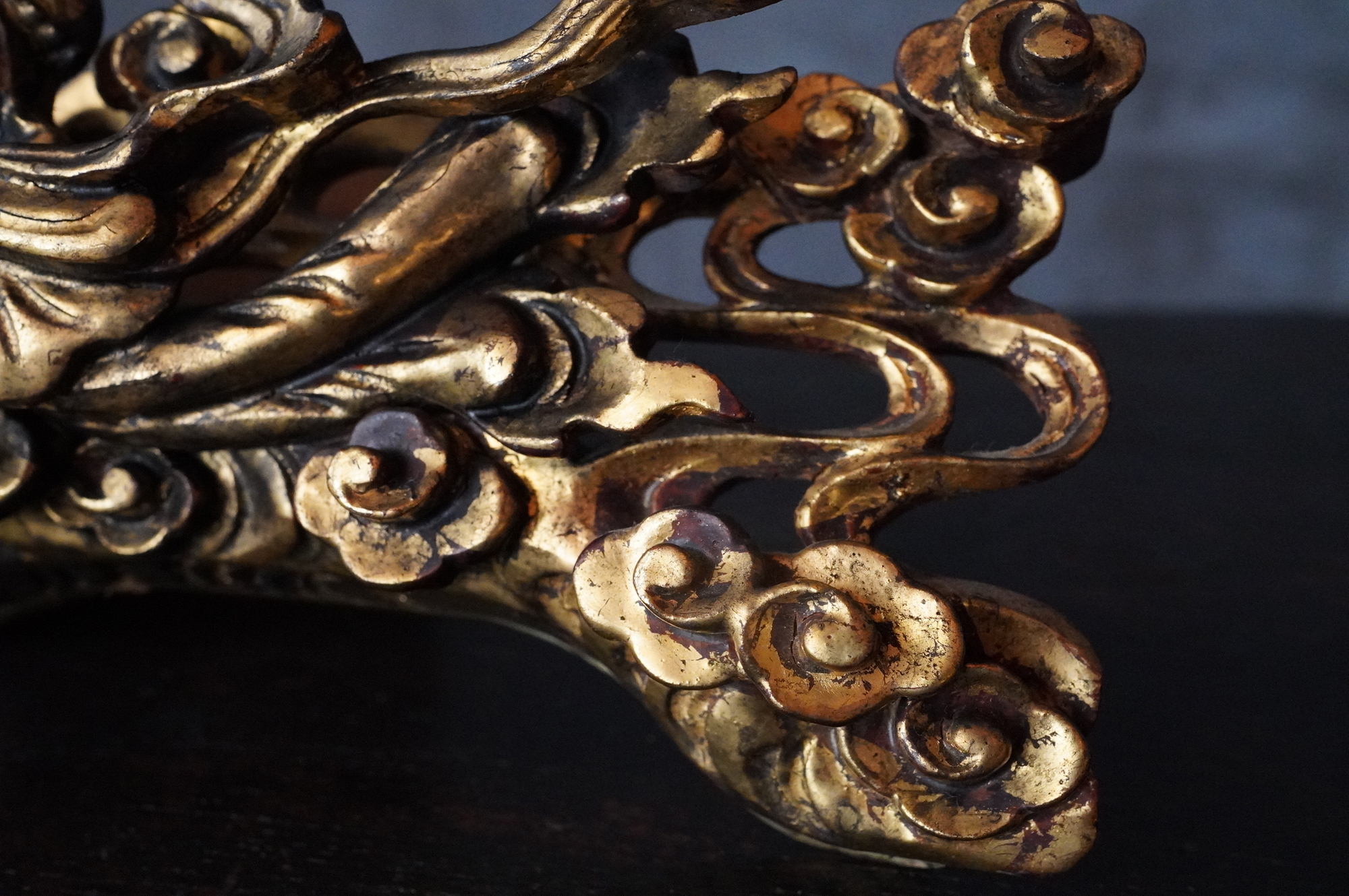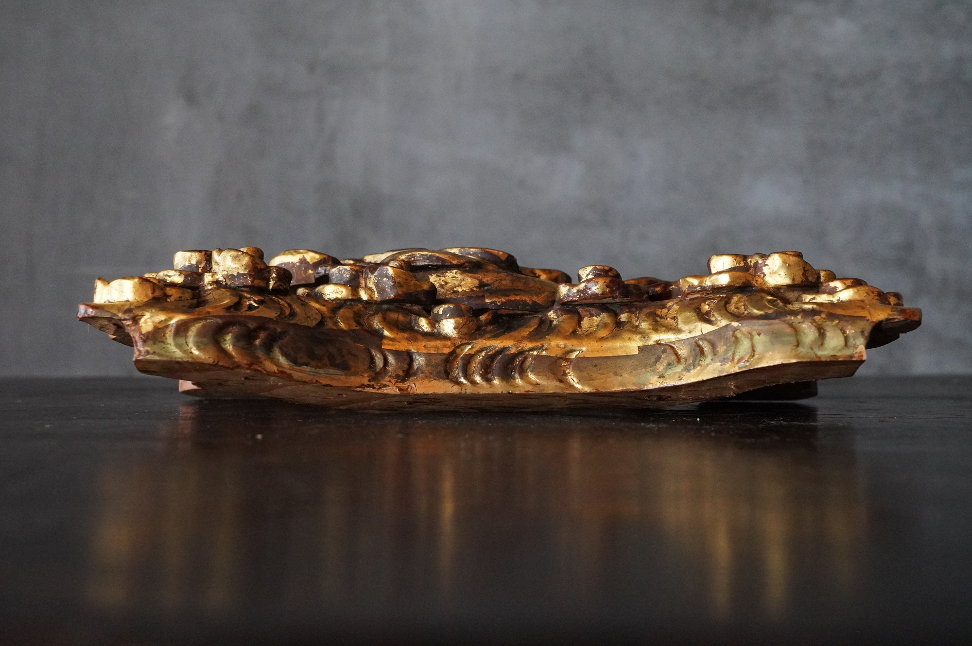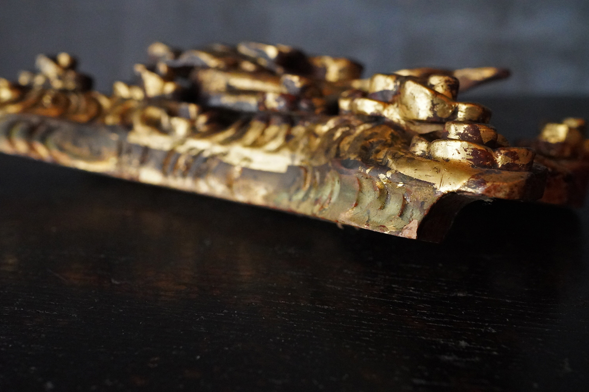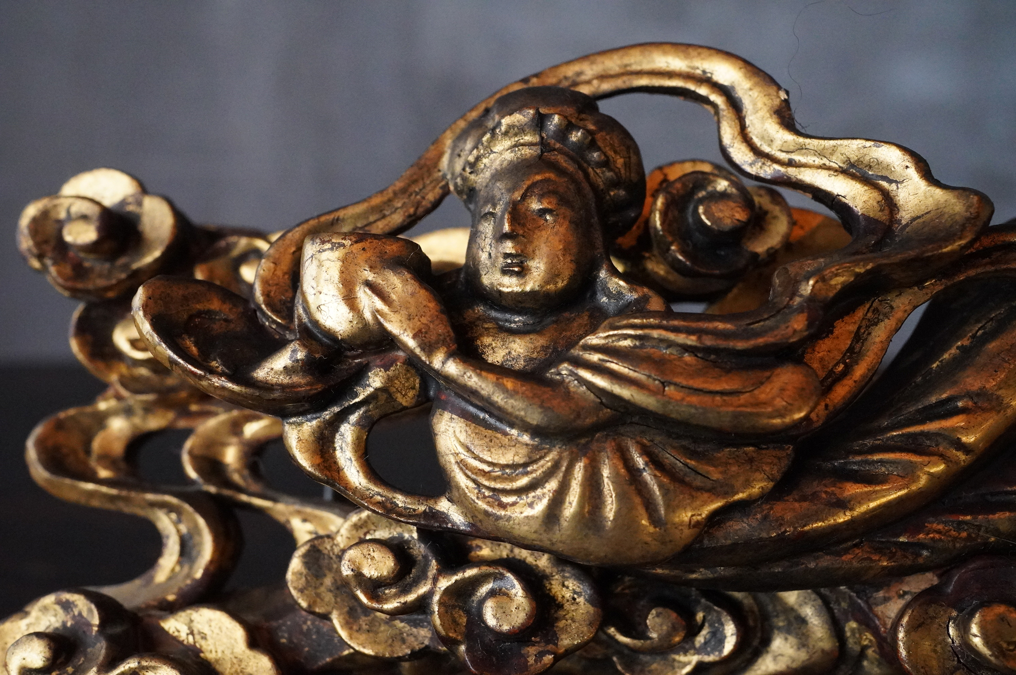 内陣欄間装飾の一部分であった木彫飛天像。漆下地の上に金彩が施され、荘厳な趣きを今尚感じさせてくれます。飾り方ひとつで空間に厳かな演出ができ、その存在感を存分にお楽しみいただけるのではないでしょうか。もとより欄間の一部であったものです状態につきましては掲載画像を十分にご確認のうえご注文下さい。江戸〜明治時代。*自立はしません(撮影時はスタンド立たせています)。