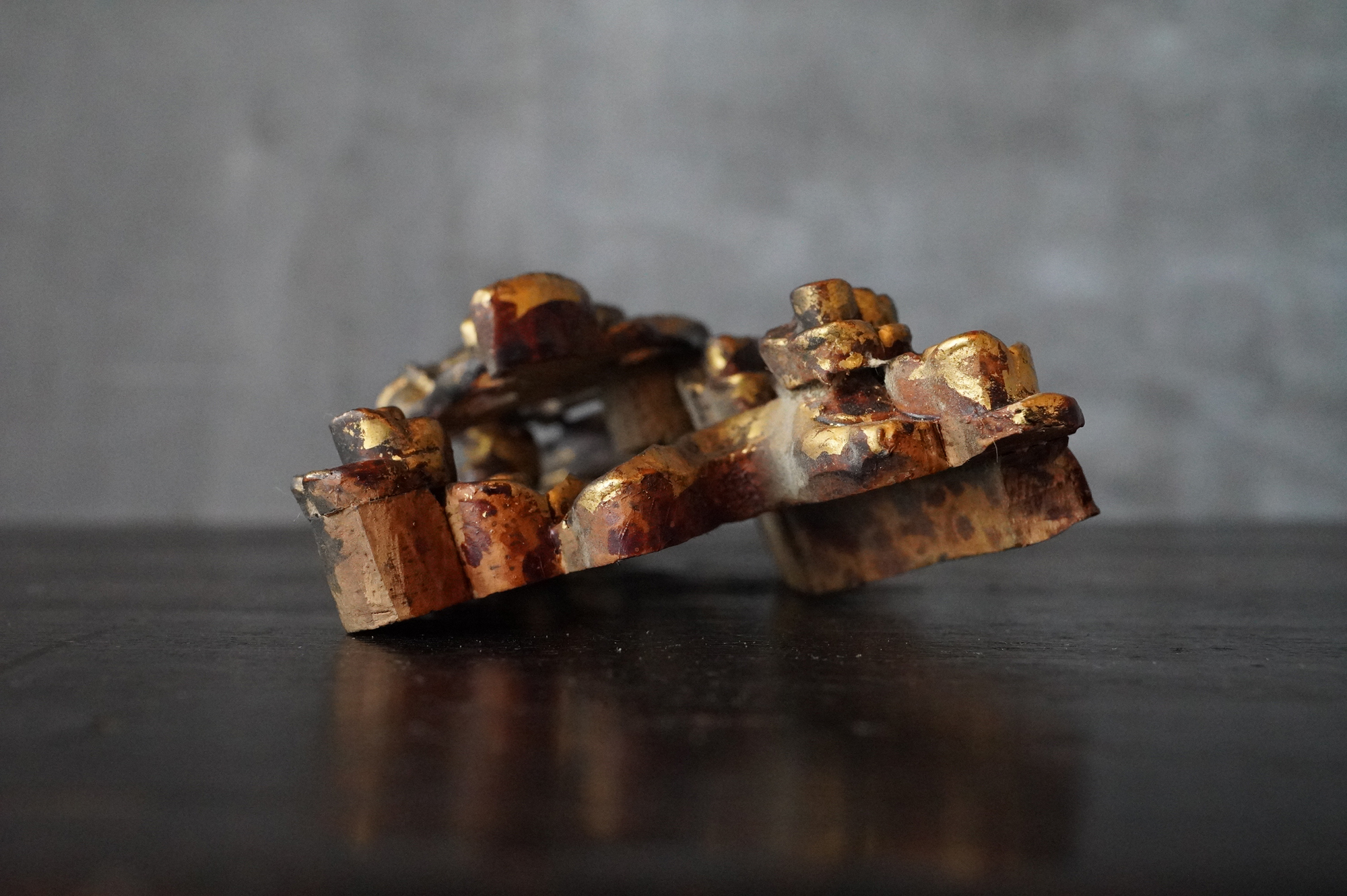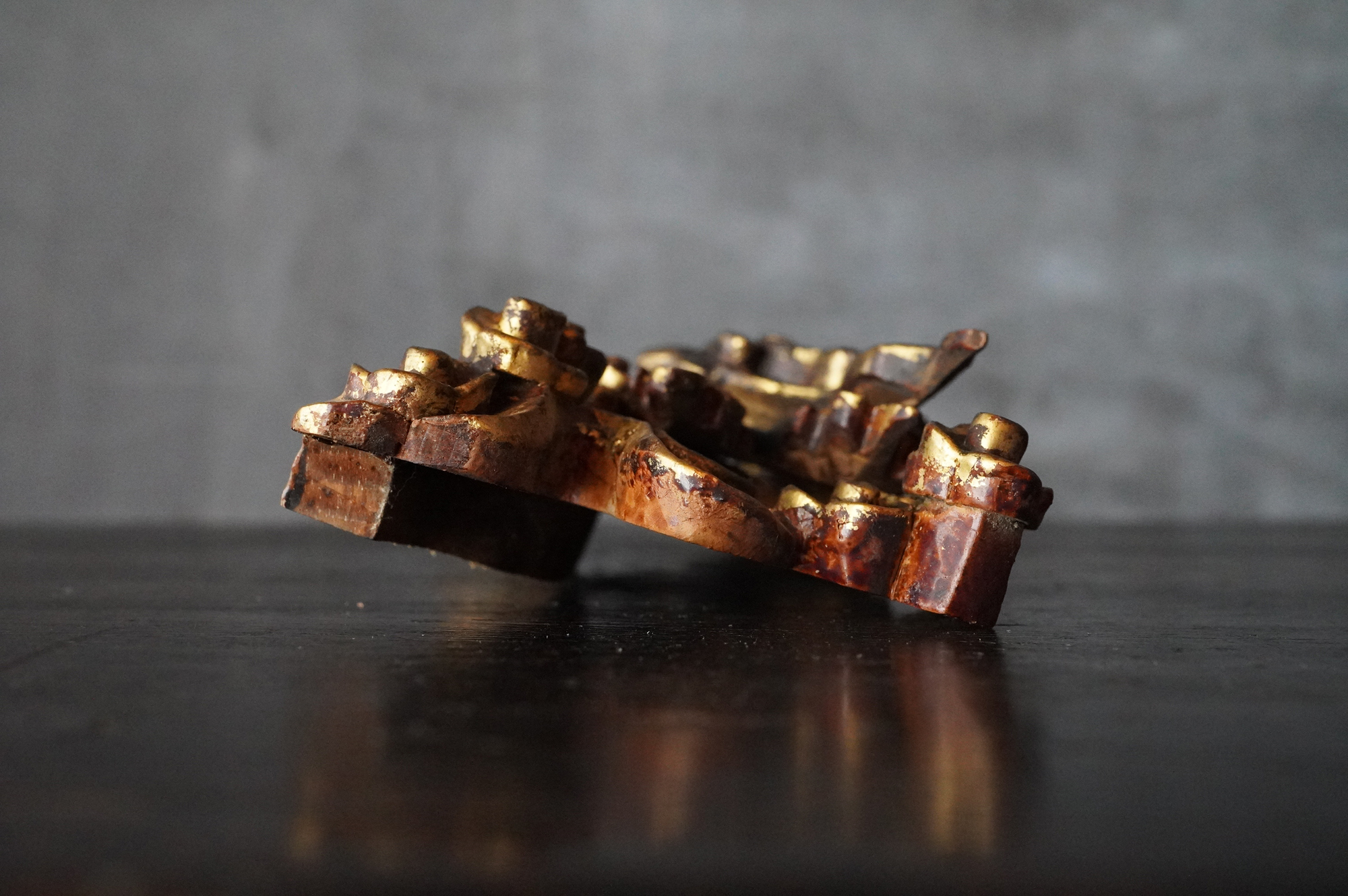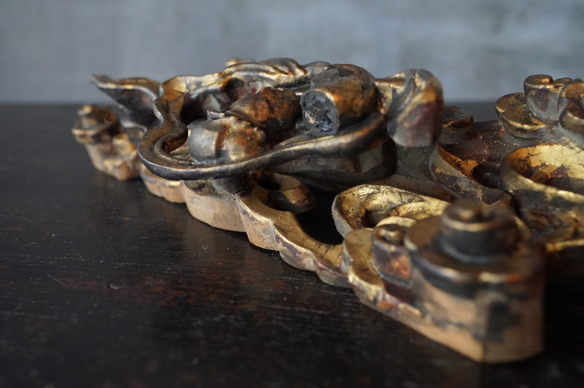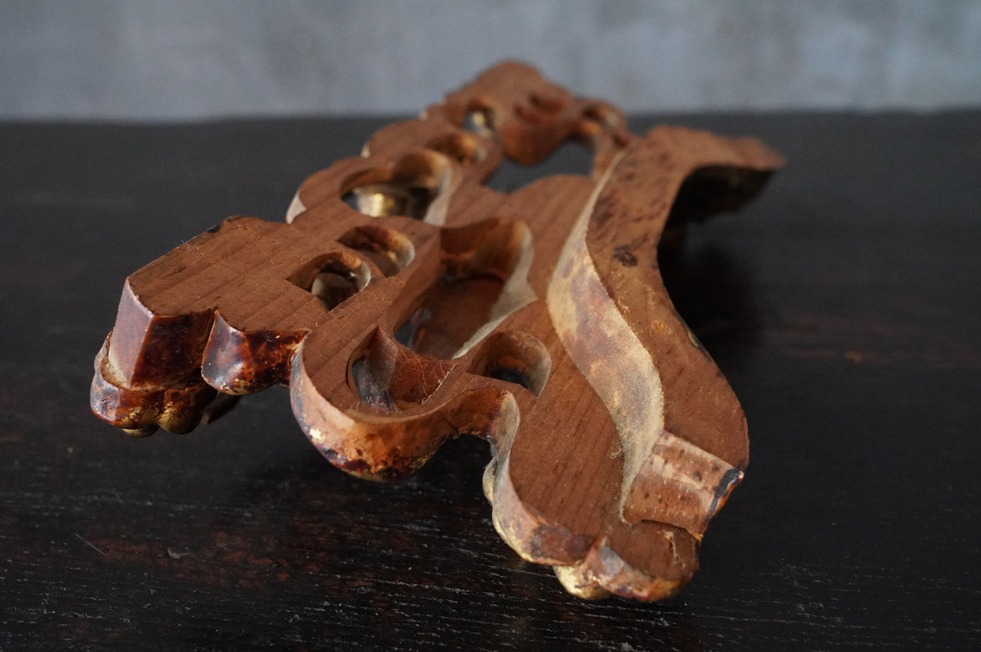 内陣欄間装飾の一部分であった木彫飛天像。漆下地の上に金彩が施され、荘厳な趣きを今尚感じさせてくれます。飾り方ひとつで空間に厳かな演出ができ、その存在感を存分にお楽しみいただけるのではないでしょうか。もとより欄間の一部であったものです状態につきましては掲載画像を十分にご確認のうえご注文下さい。江戸〜明治時代。*自立はしません(撮影時はスタンド立たせています)。