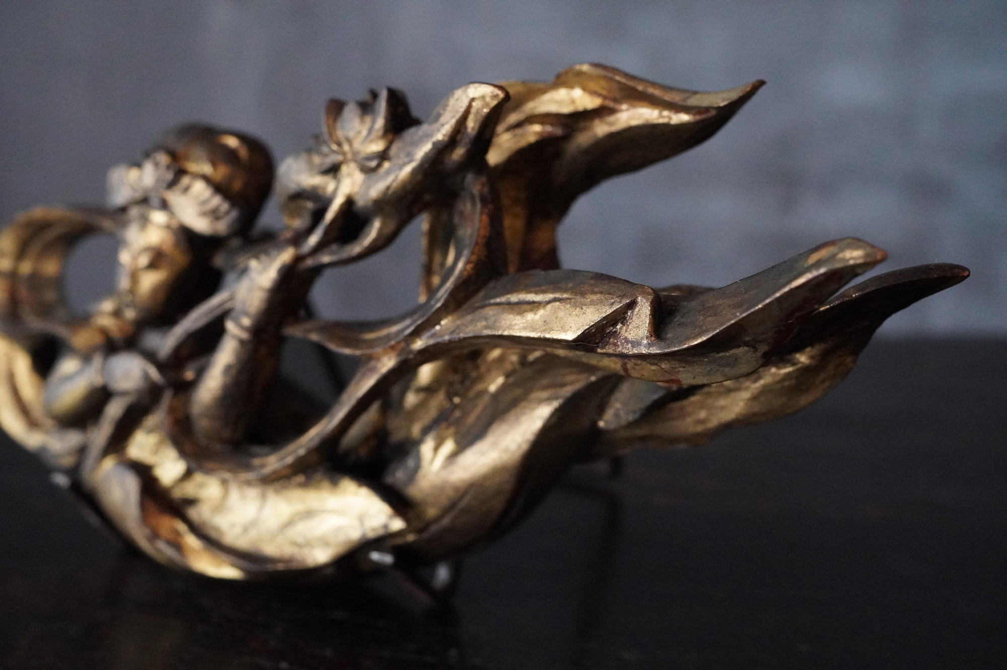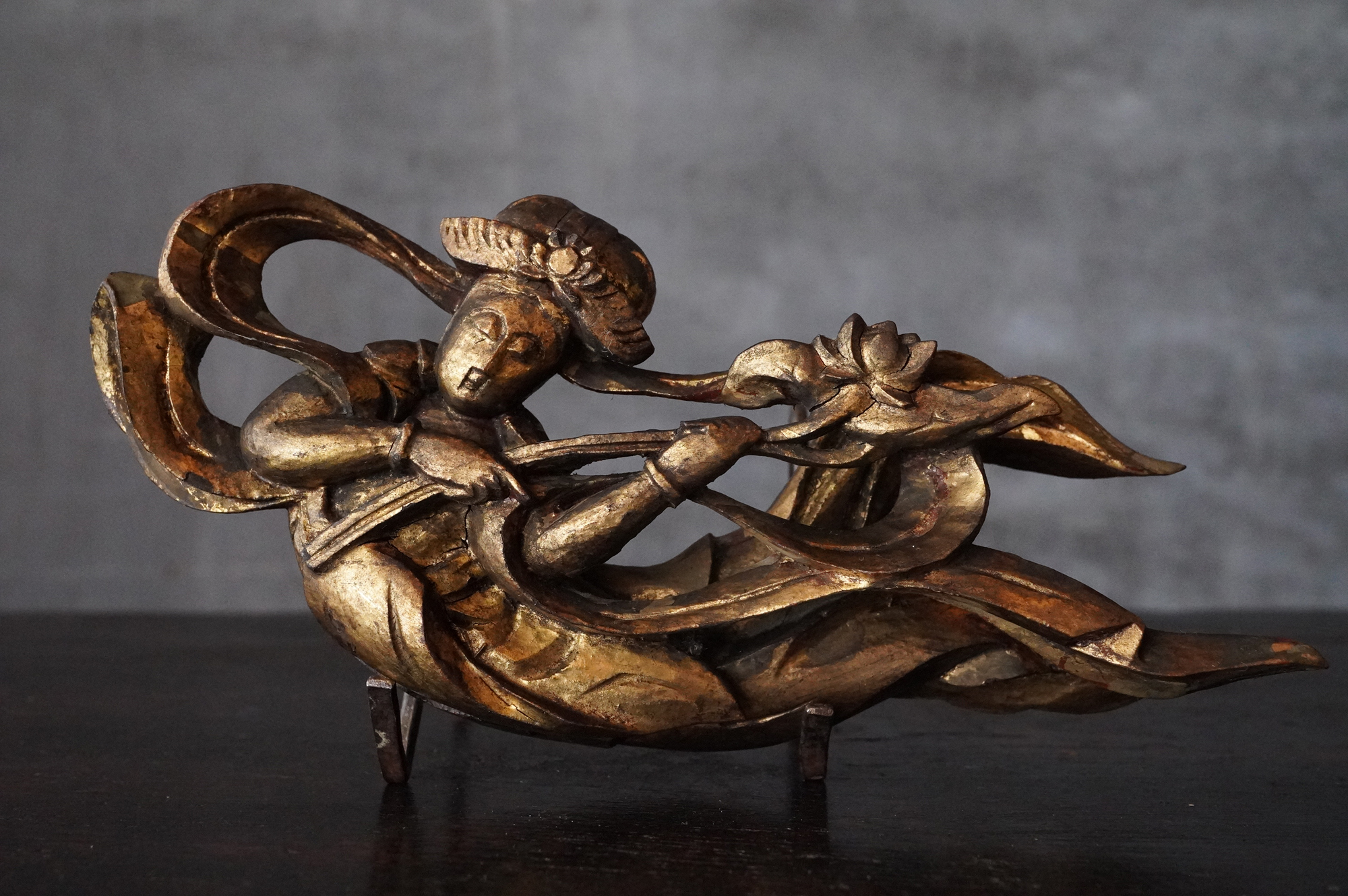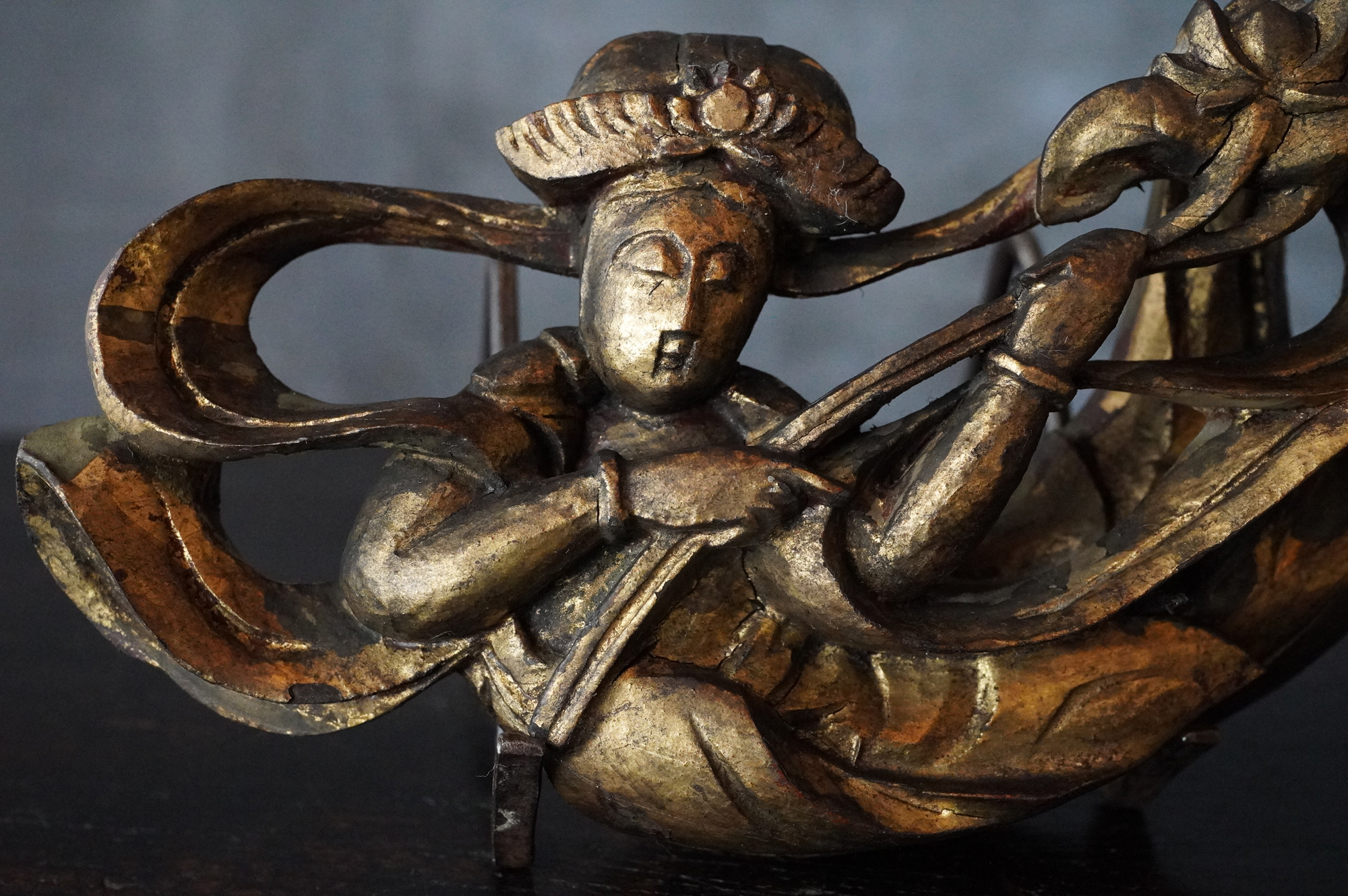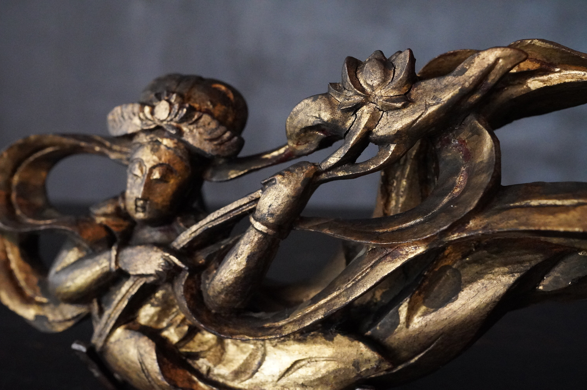 内陣欄間装飾の一部分であった木彫飛天像。漆下地の上に金彩が施され、荘厳な趣きを今尚感じさせてくれます。飾り方ひとつで空間に厳かな演出ができ、その存在感を存分にお楽しみいただけるのではないでしょうか。もとより欄間の一部であったものです状態につきましては掲載画像を十分にご確認のうえご注文下さい。江戸〜明治時代。*自立はしません(撮影時はスタンド立たせています)。取り付けの際の釘がついております。そのままで販売ですので必要の際はご購入様の方で外してください。