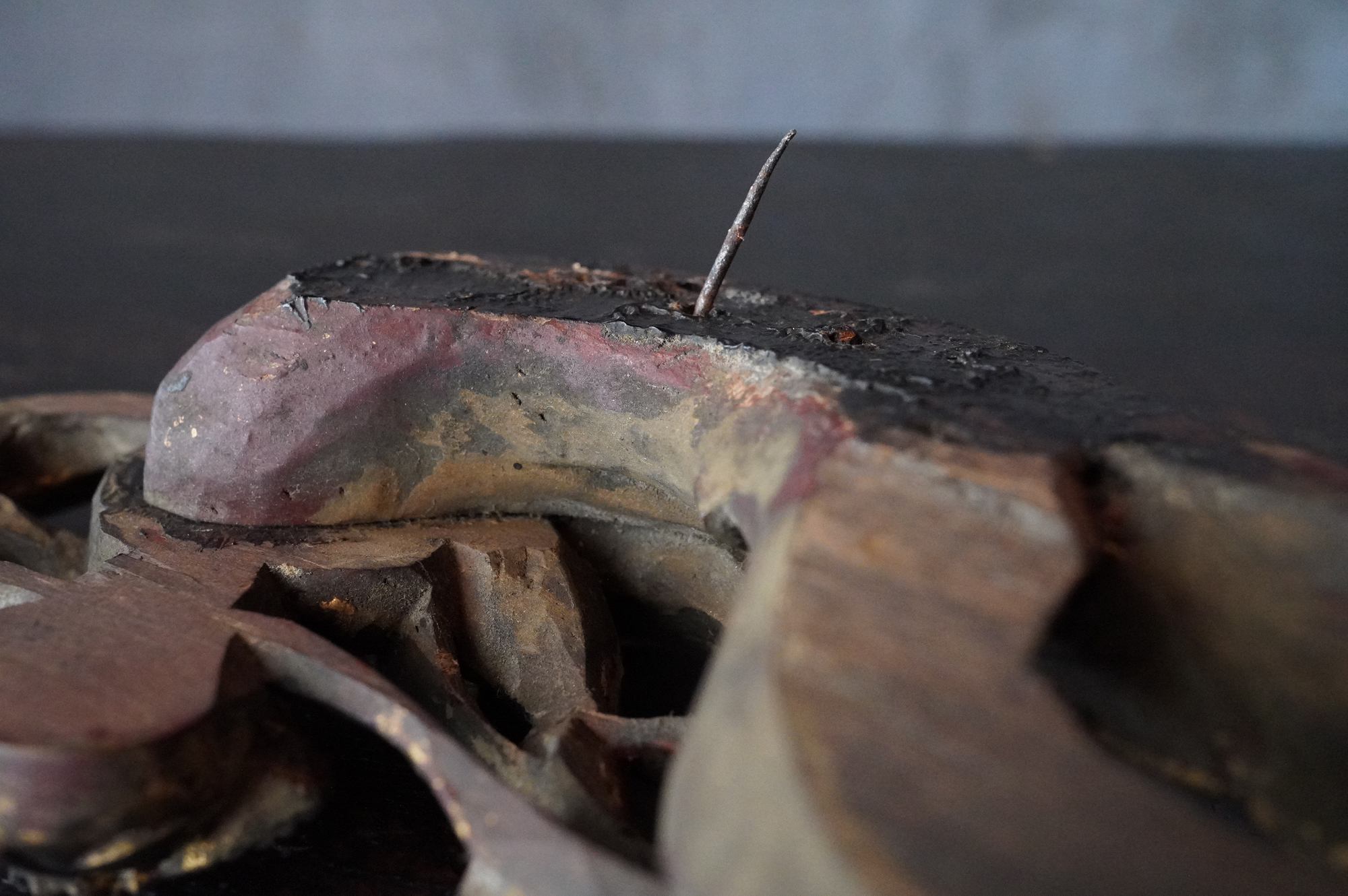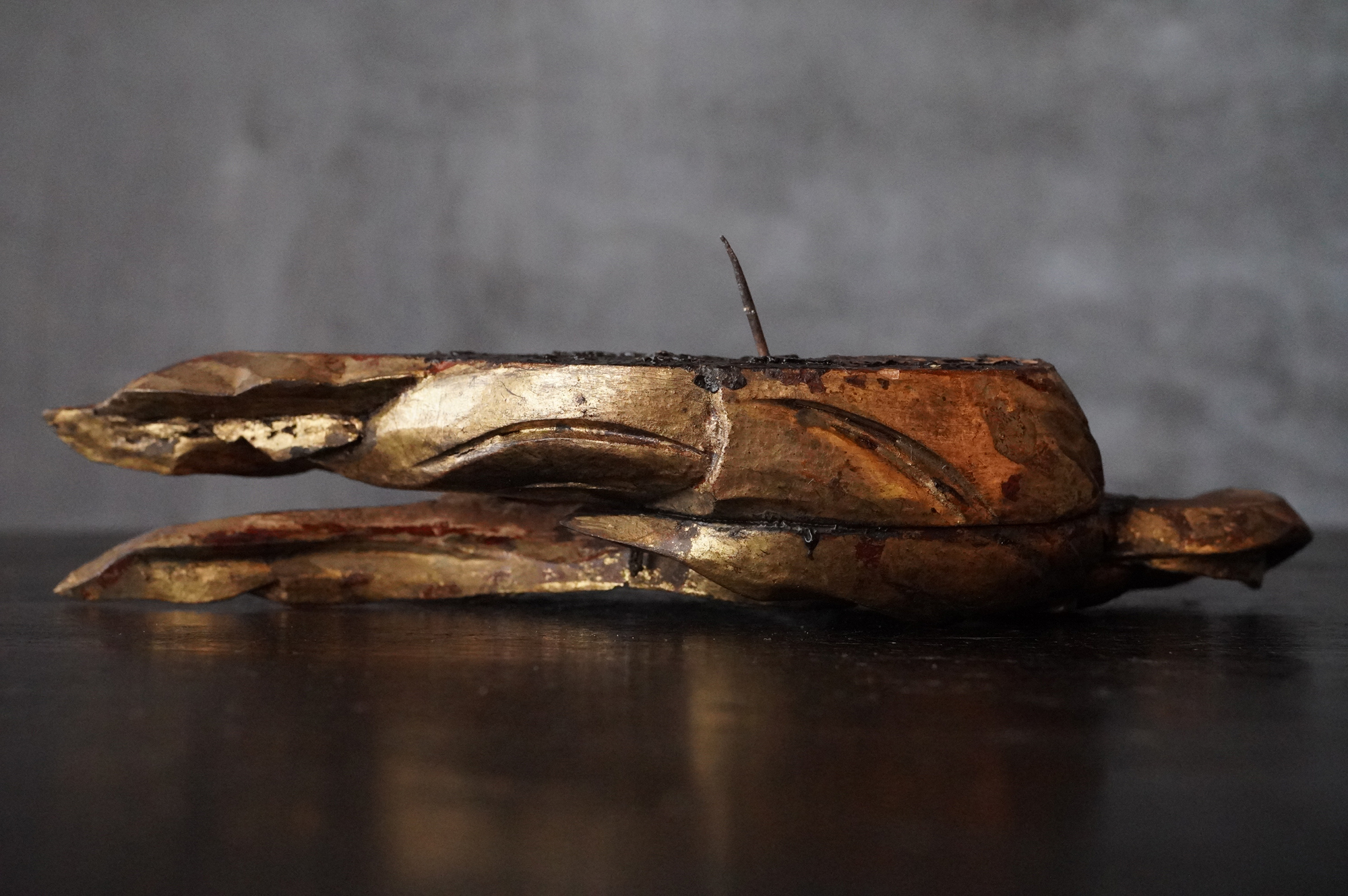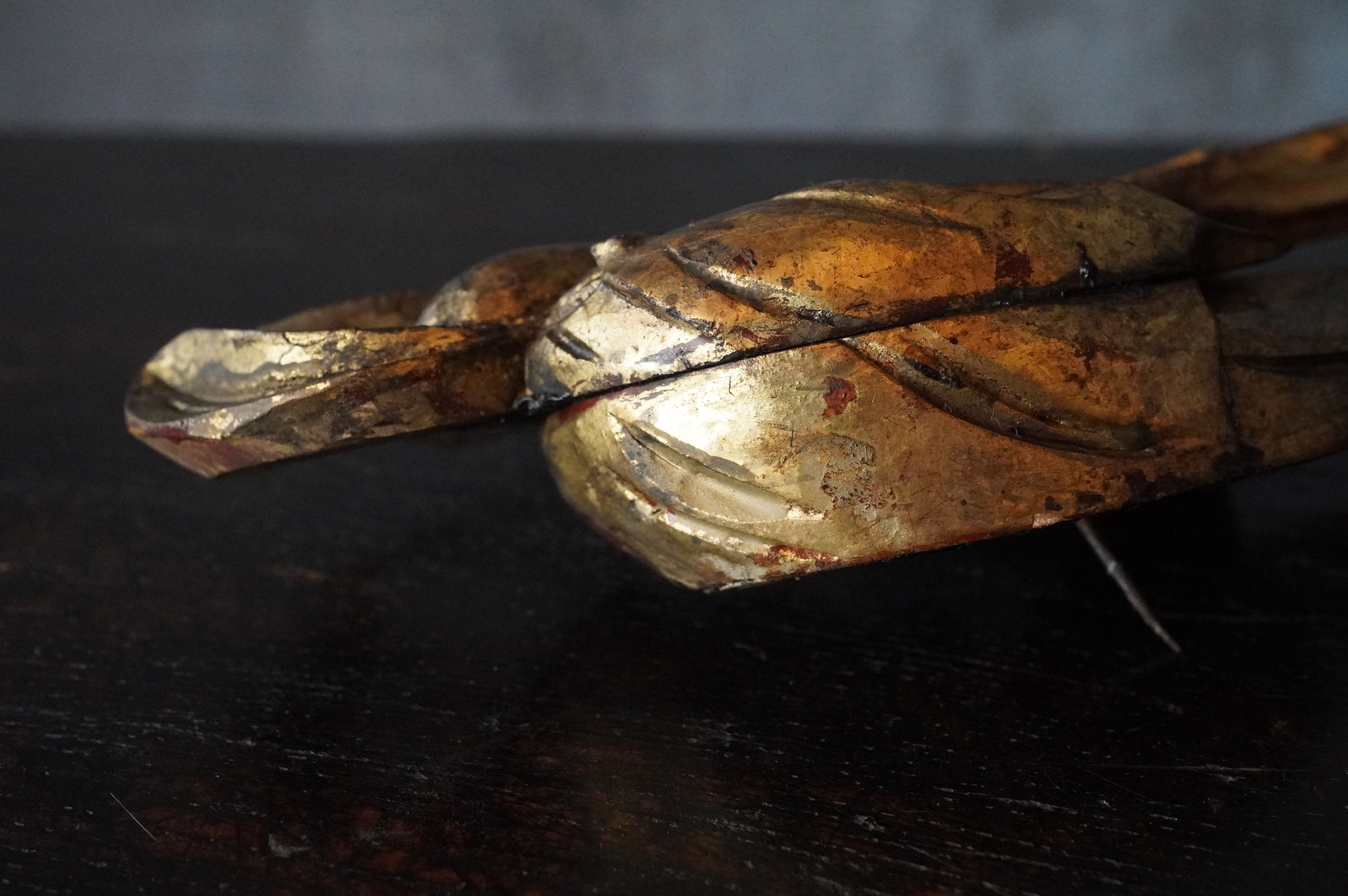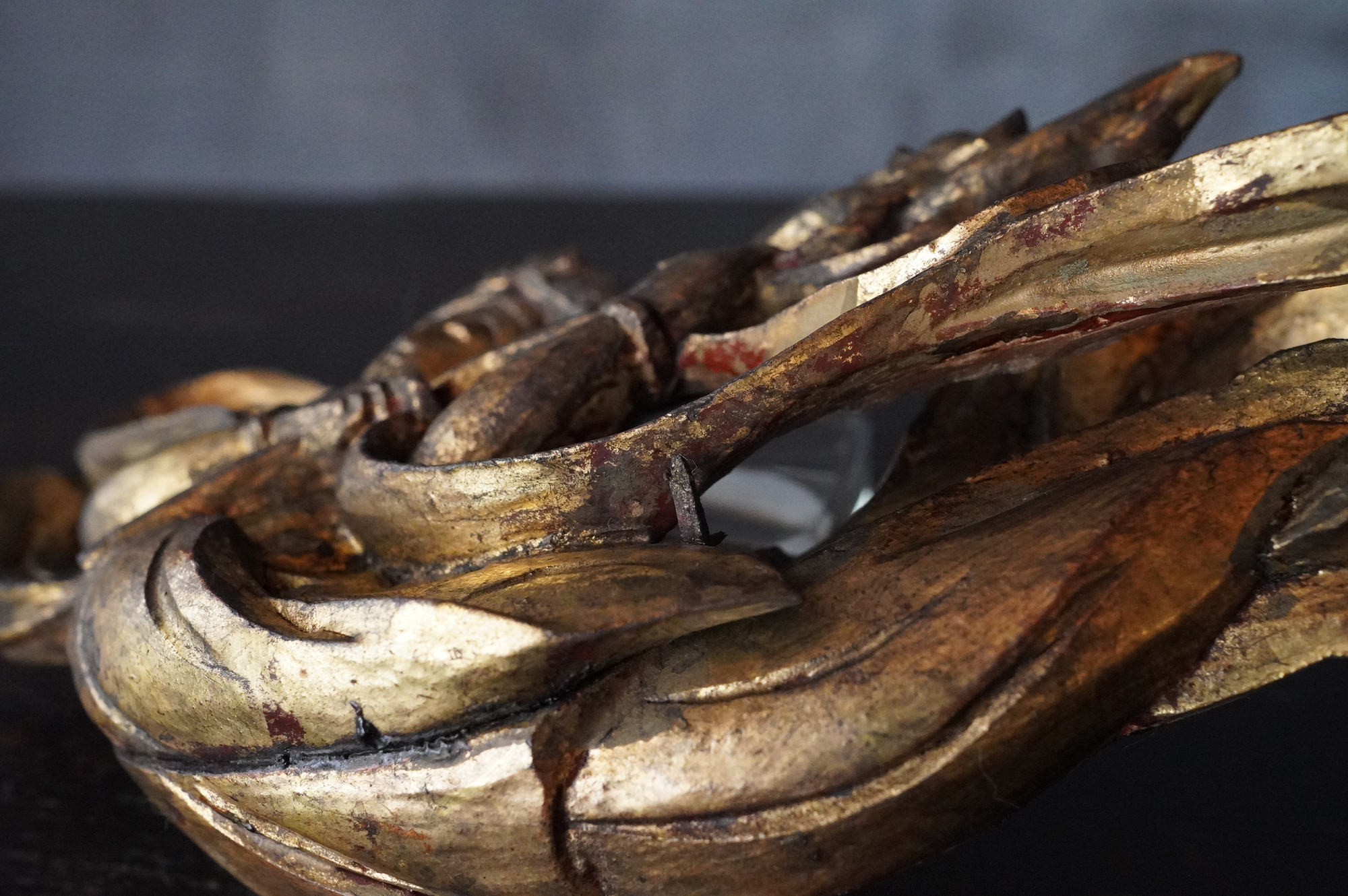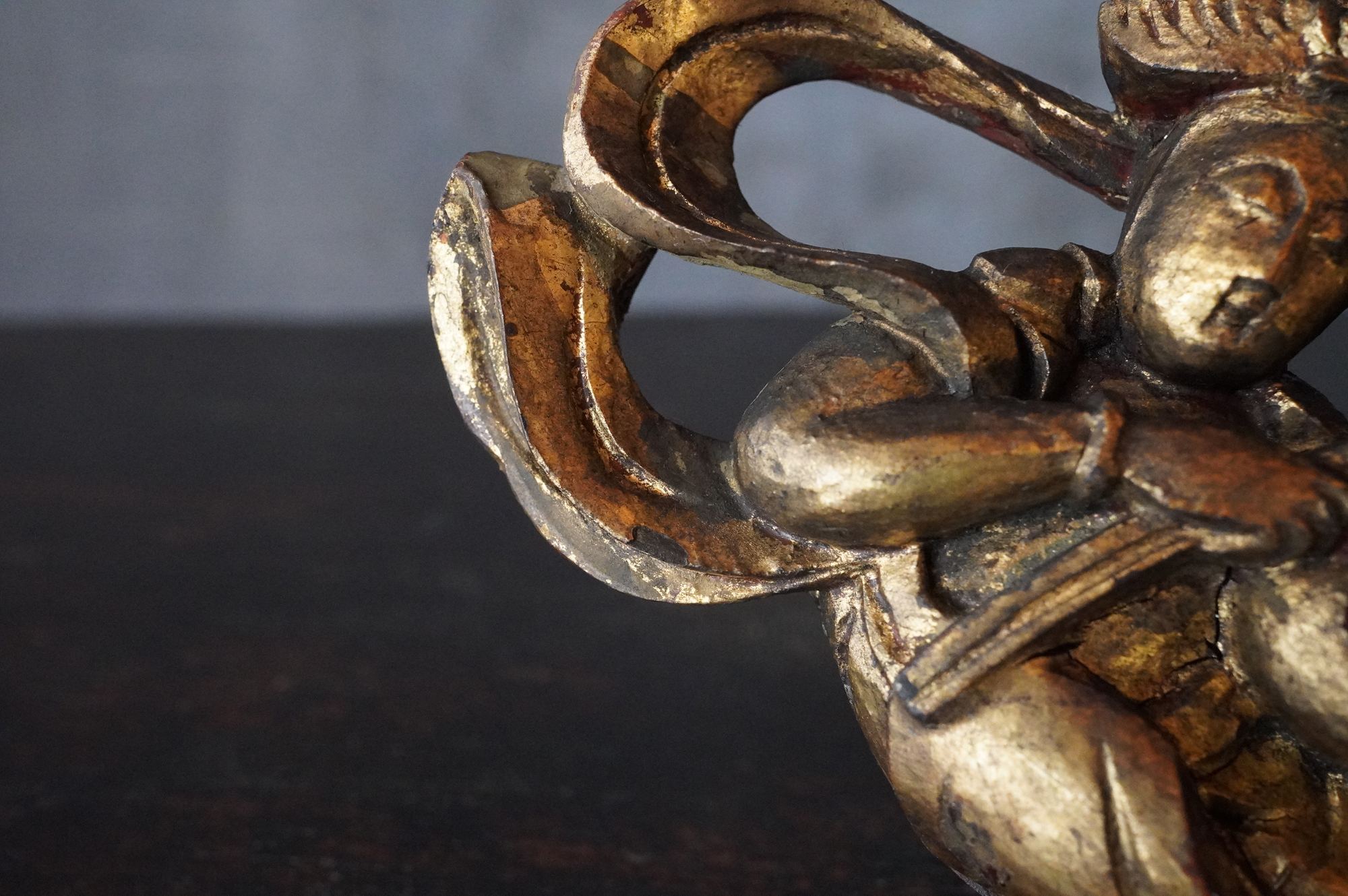 内陣欄間装飾の一部分であった木彫飛天像。漆下地の上に金彩が施され、荘厳な趣きを今尚感じさせてくれます。飾り方ひとつで空間に厳かな演出ができ、その存在感を存分にお楽しみいただけるのではないでしょうか。もとより欄間の一部であったものです状態につきましては掲載画像を十分にご確認のうえご注文下さい。江戸〜明治時代。*自立はしません(撮影時はスタンド立たせています)。取り付けの際の釘がついております。そのままで販売ですので必要の際はご購入様の方で外してください。