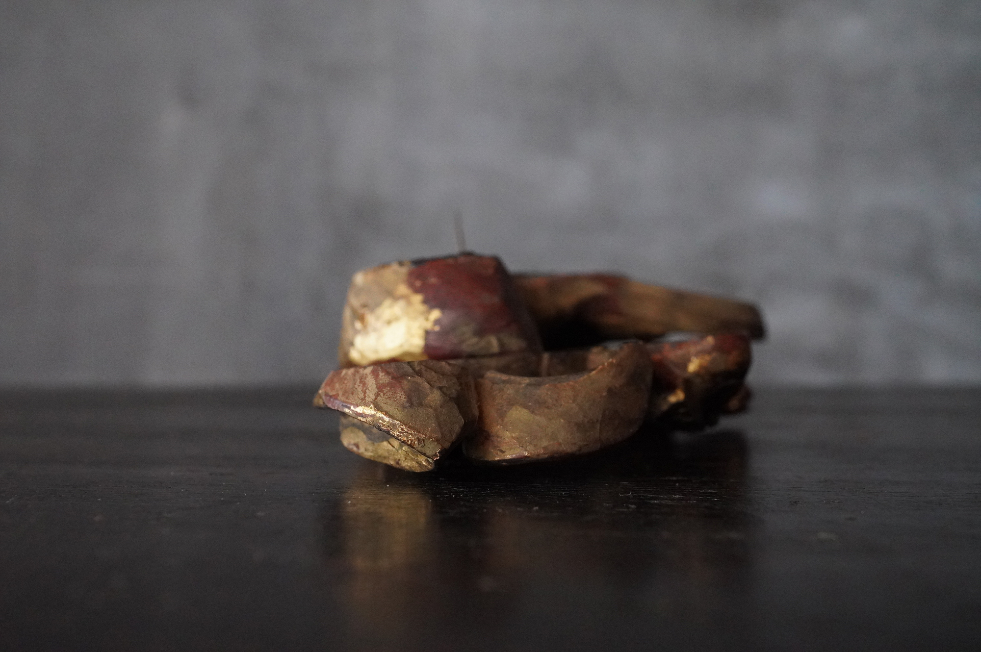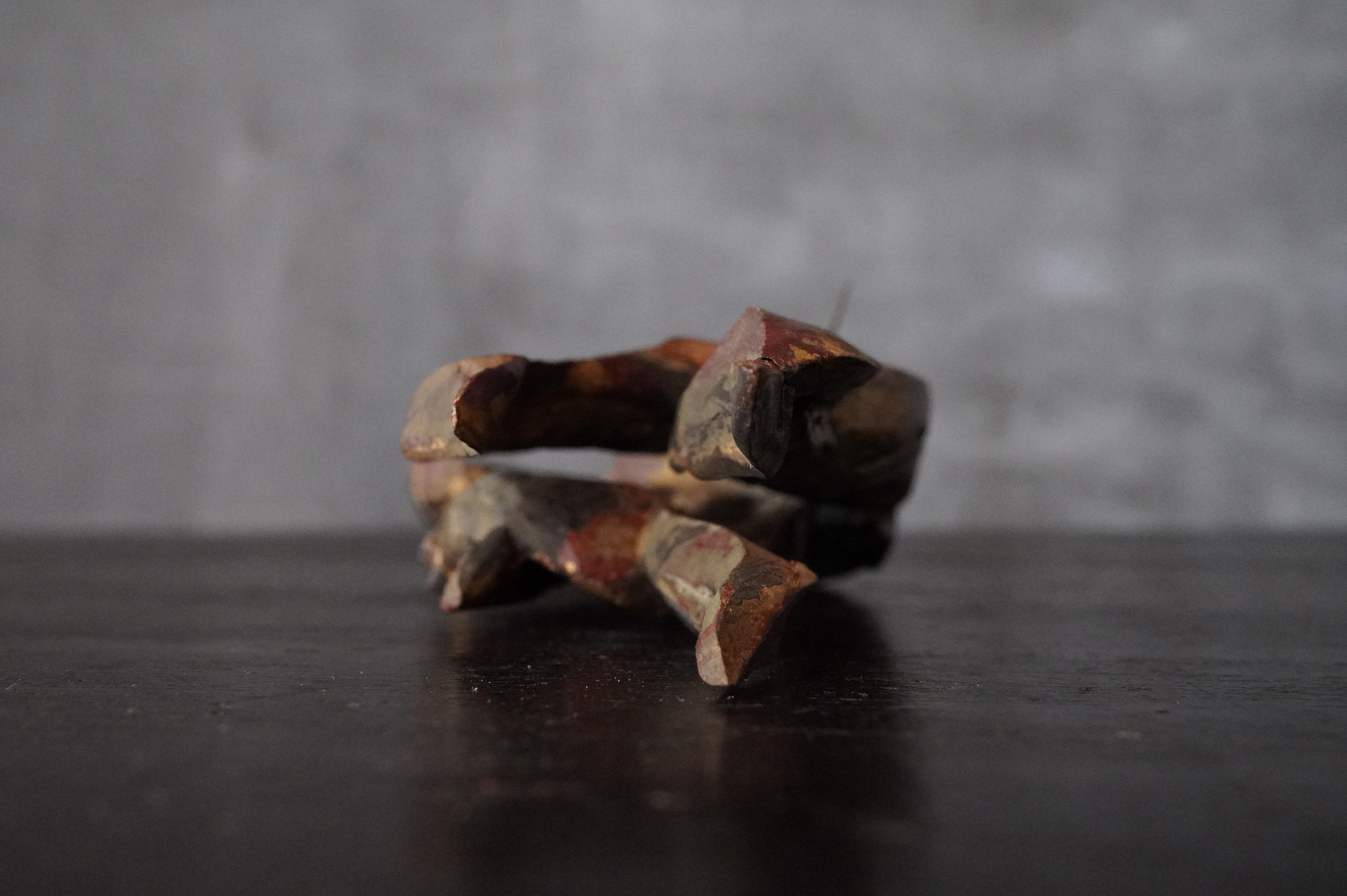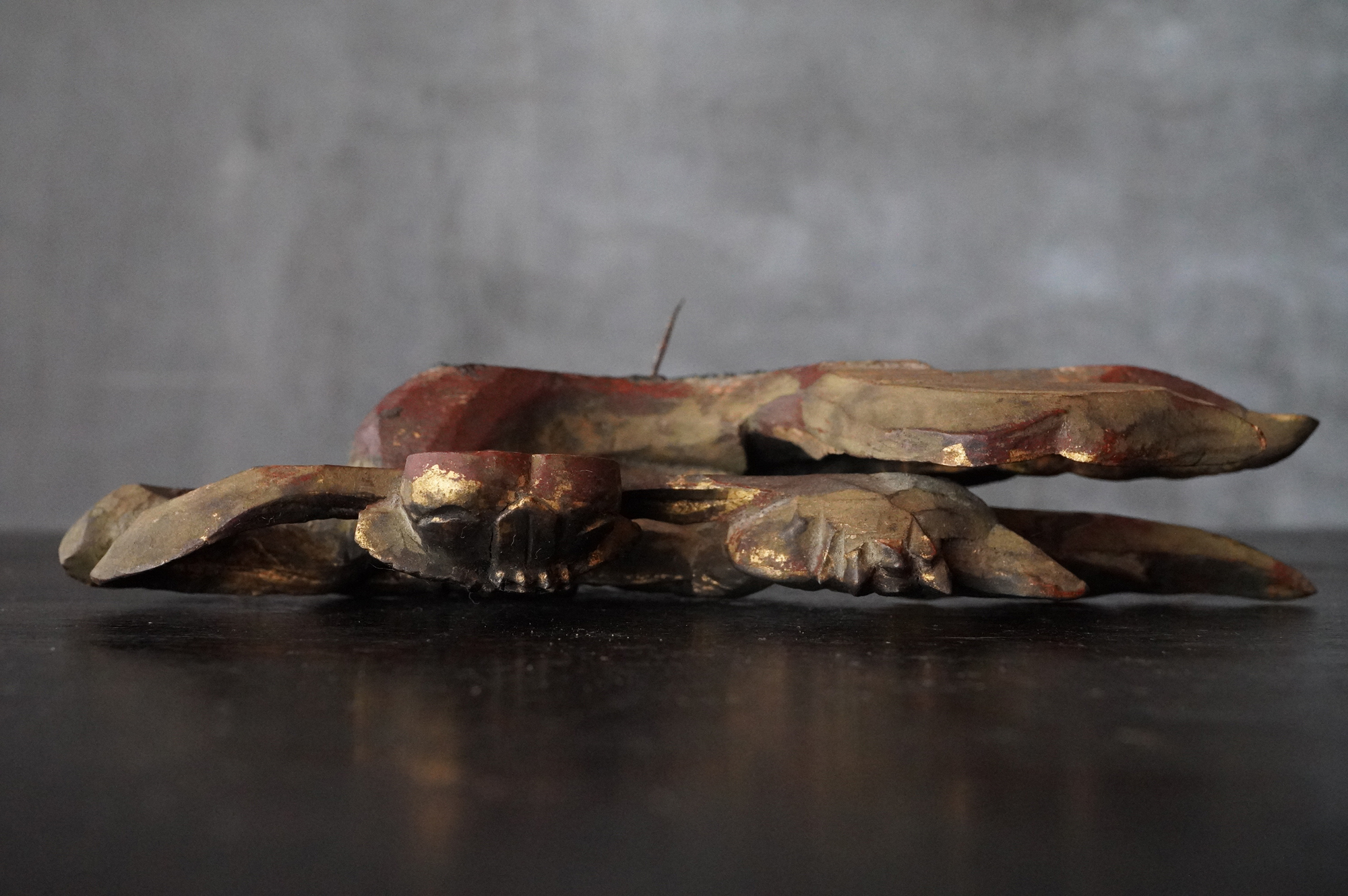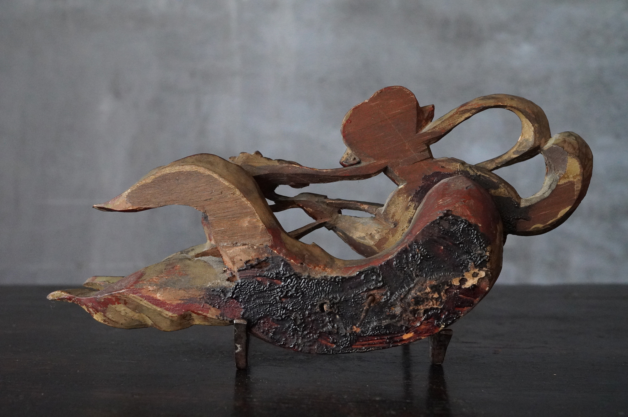 内陣欄間装飾の一部分であった木彫飛天像。漆下地の上に金彩が施され、荘厳な趣きを今尚感じさせてくれます。飾り方ひとつで空間に厳かな演出ができ、その存在感を存分にお楽しみいただけるのではないでしょうか。もとより欄間の一部であったものです状態につきましては掲載画像を十分にご確認のうえご注文下さい。江戸〜明治時代。*自立はしません(撮影時はスタンド立たせています)。取り付けの際の釘がついております。そのままで販売ですので必要の際はご購入様の方で外してください。
