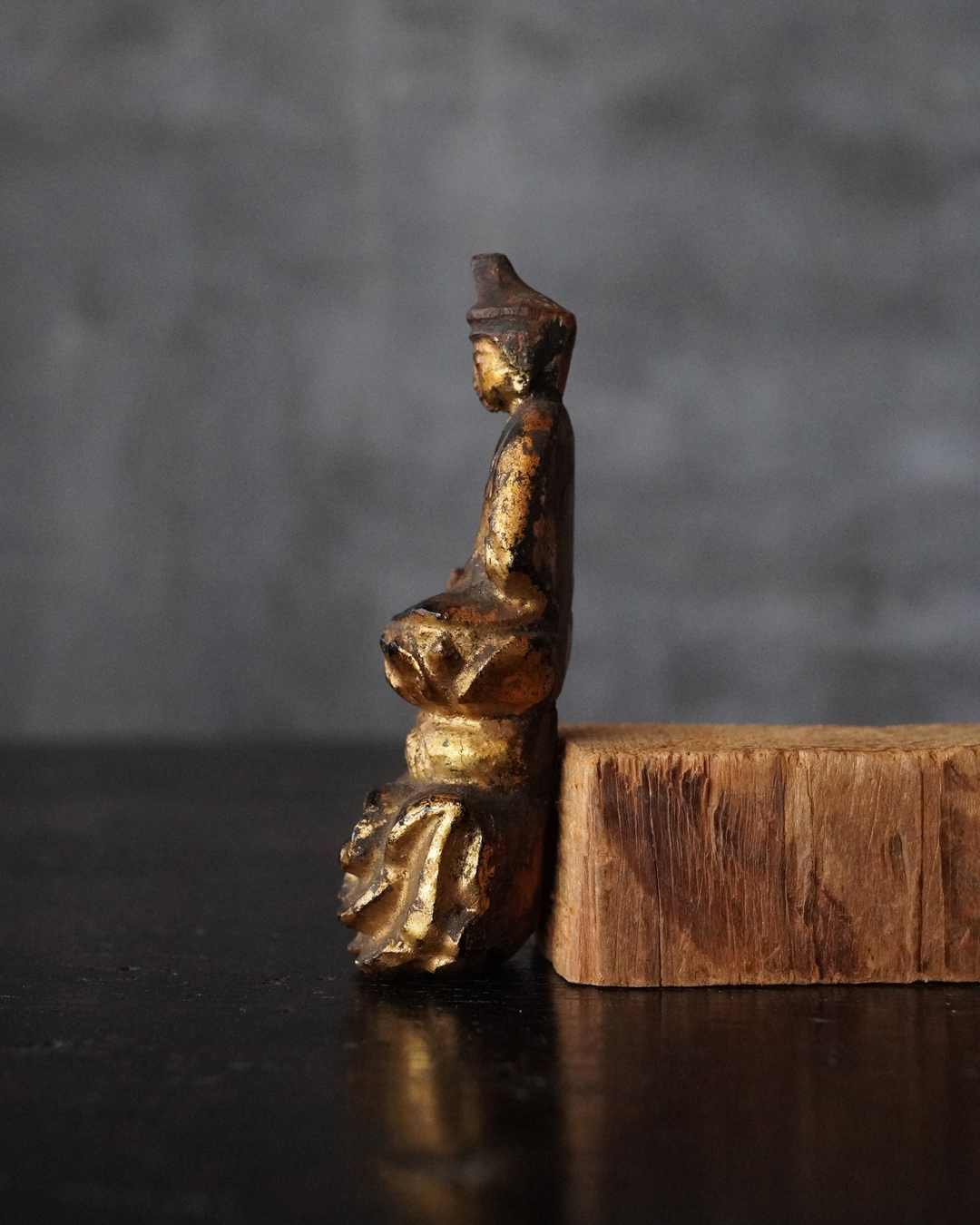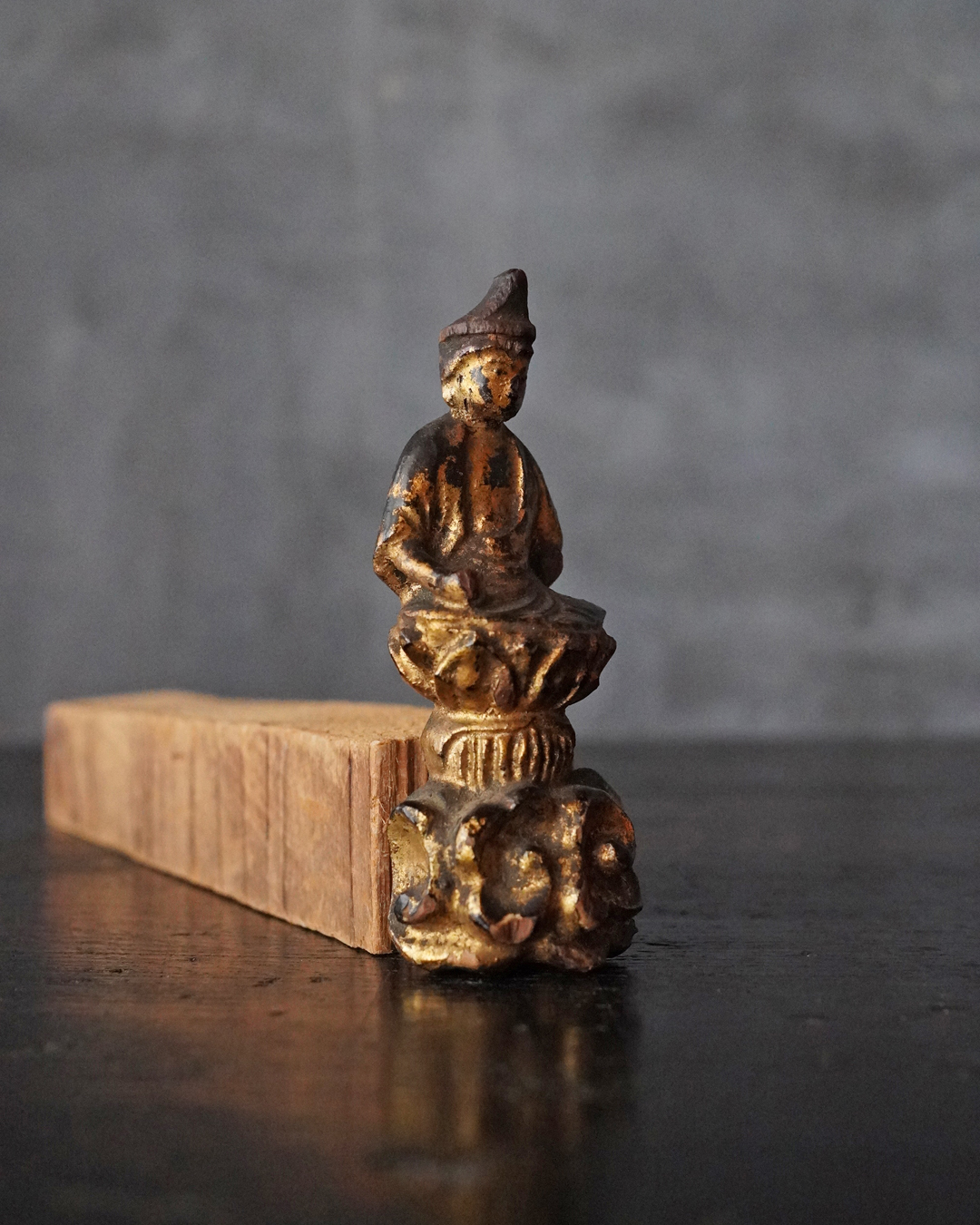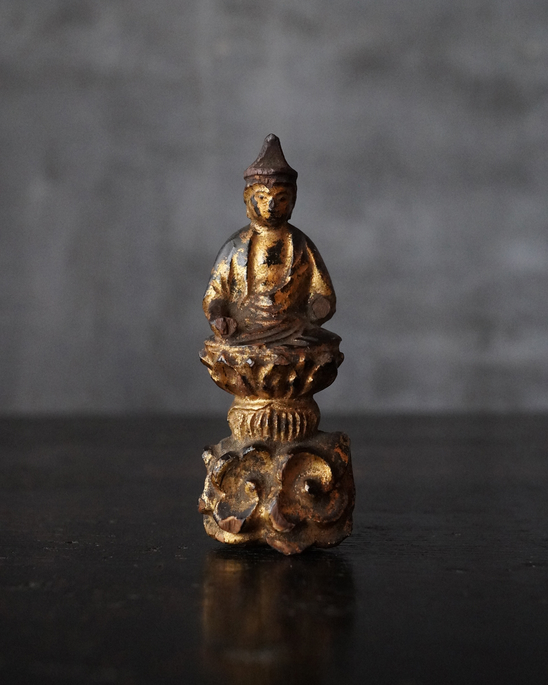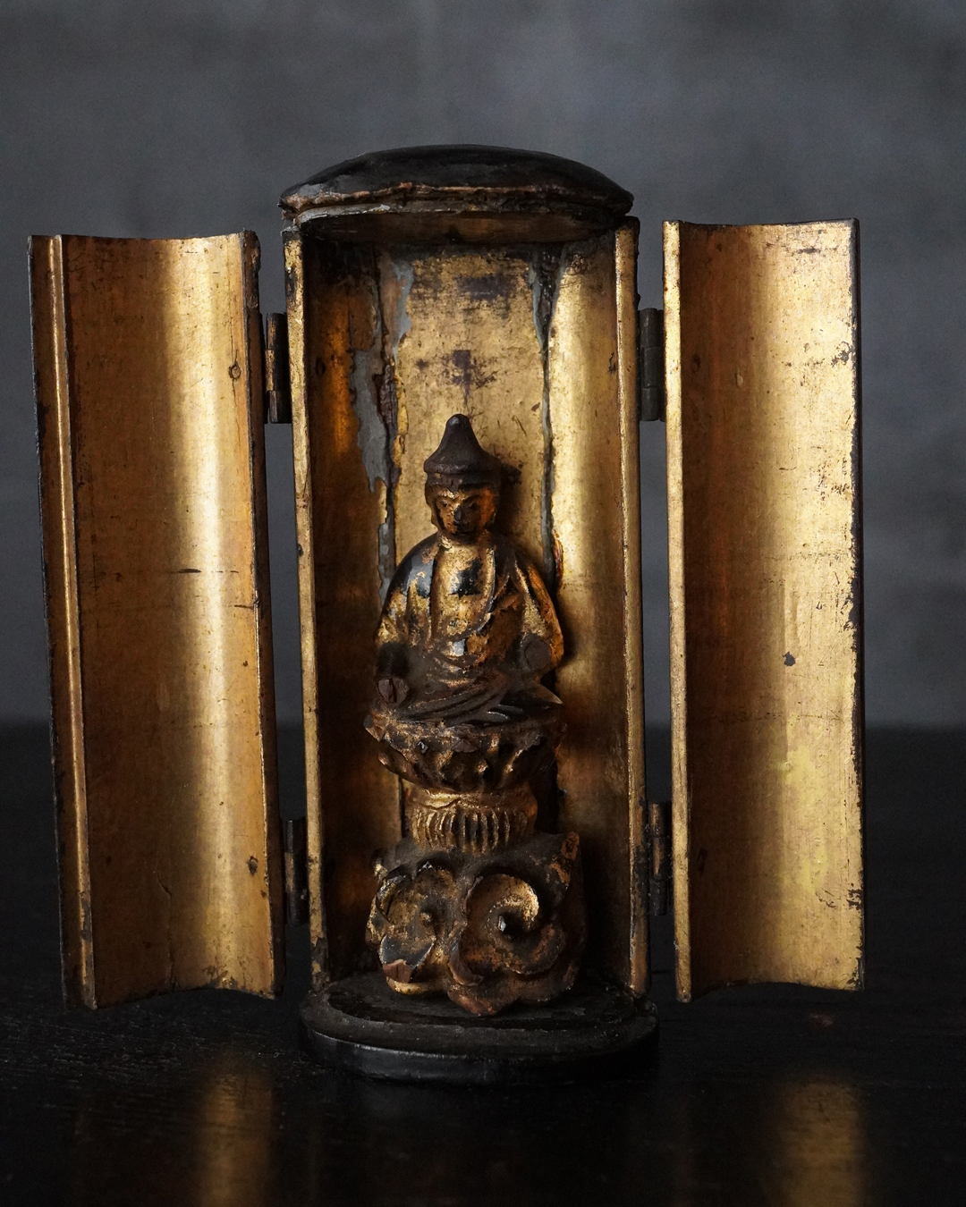 厨子に納められておりますが、本来は単独で製作された念持仏ではなく、光背を伴う仏像群の一部であったものと考えられる菩薩坐像。自立はせず、また両腕に損傷が見られますが、小品ながら端正な面貌と姿態を備えており、前の所持者もその魅力を感じ取り、念持仏として尊んでいたのでしょう。金彩は剥落している部分がございますが下地の黒漆が美しく表出し、時代を経た作品ならではの深い味わいです。江戸時代。