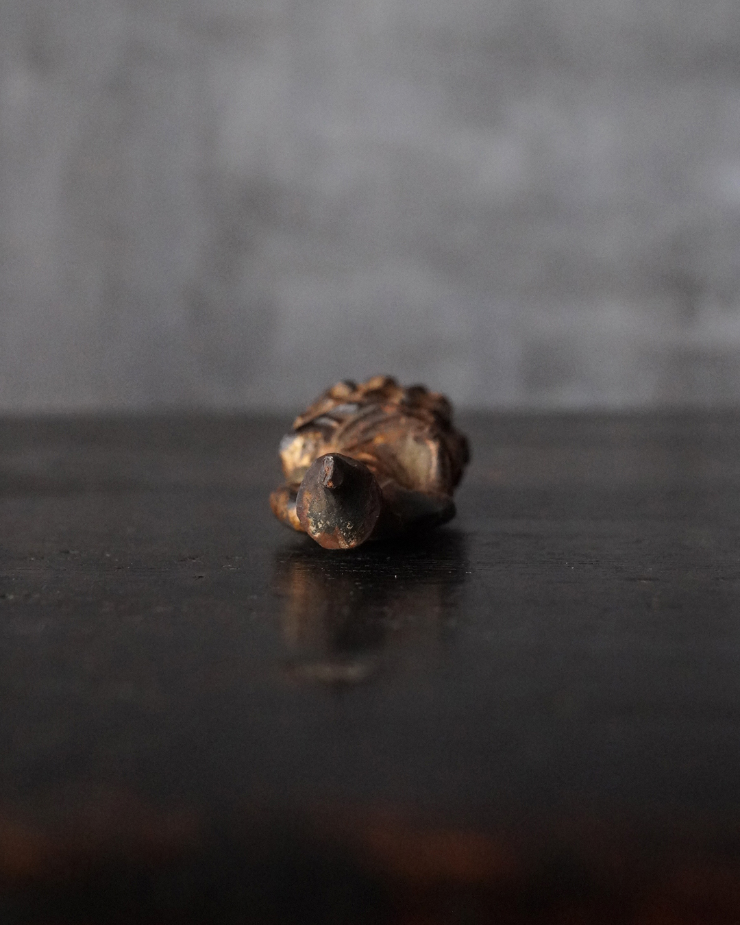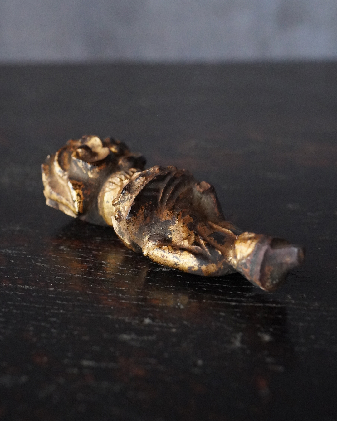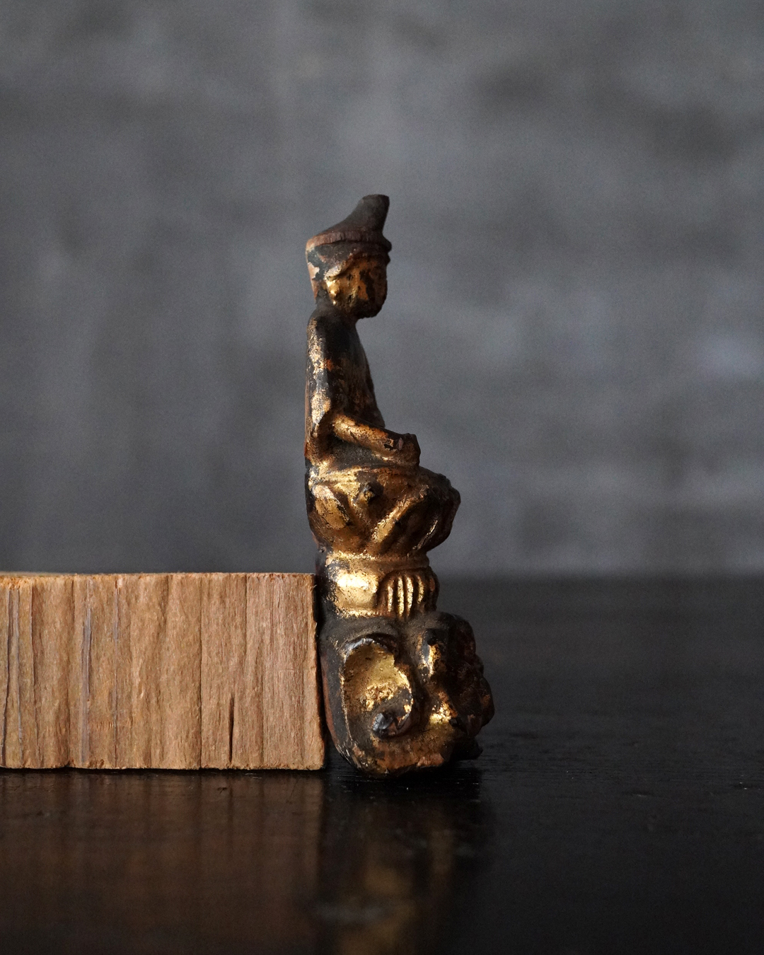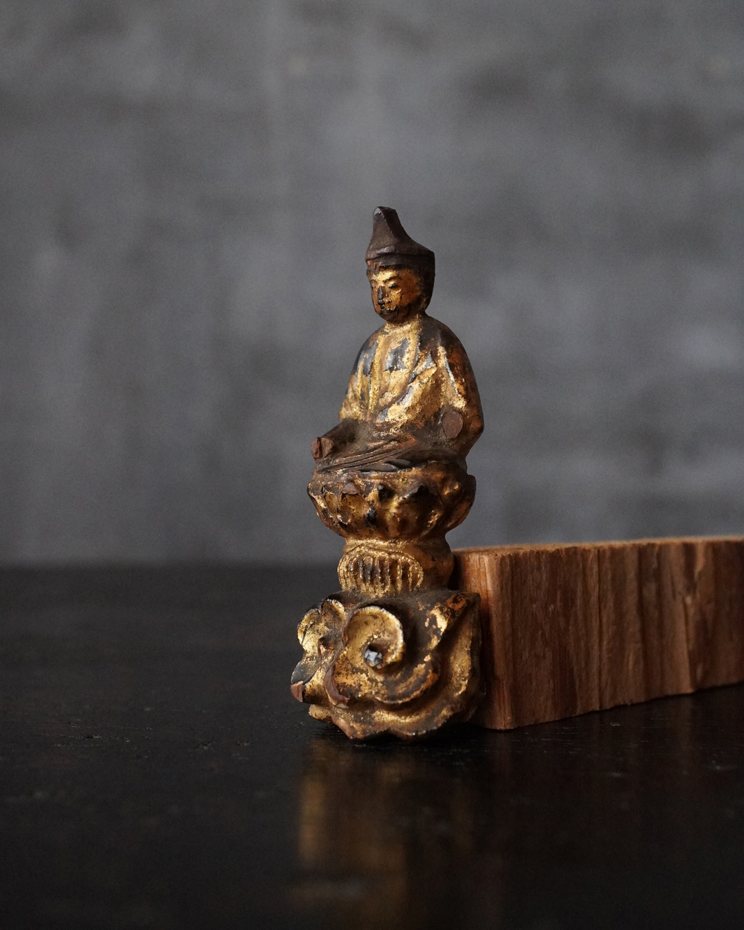 厨子に納められておりますが、本来は単独で製作された念持仏ではなく、光背を伴う仏像群の一部であったものと考えられる菩薩坐像。自立はせず、また両腕に損傷が見られますが、小品ながら端正な面貌と姿態を備えており、前の所持者もその魅力を感じ取り、念持仏として尊んでいたのでしょう。金彩は剥落している部分がございますが下地の黒漆が美しく表出し、時代を経た作品ならではの深い味わいです。江戸時代。