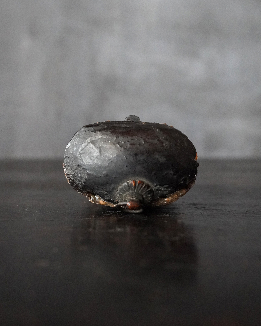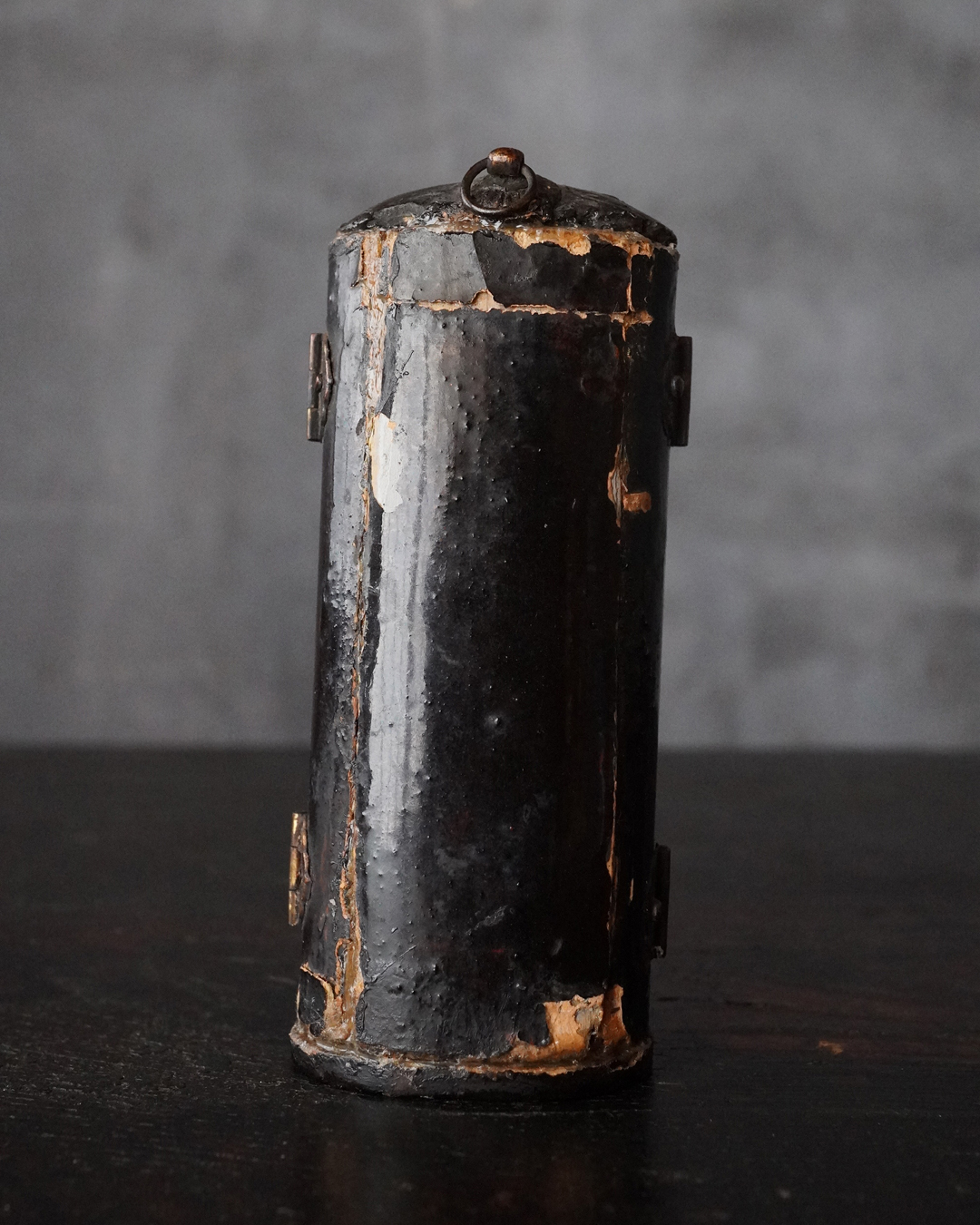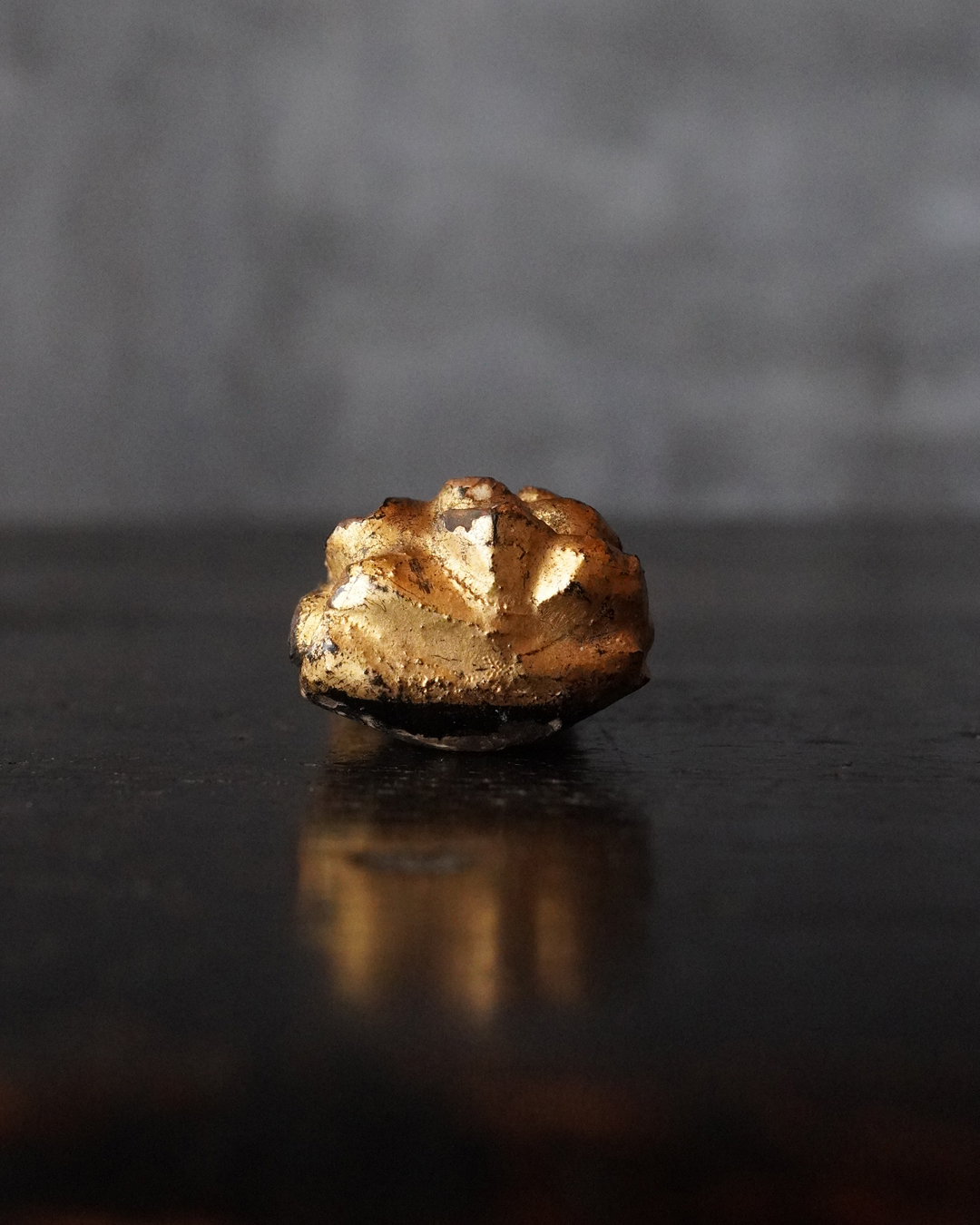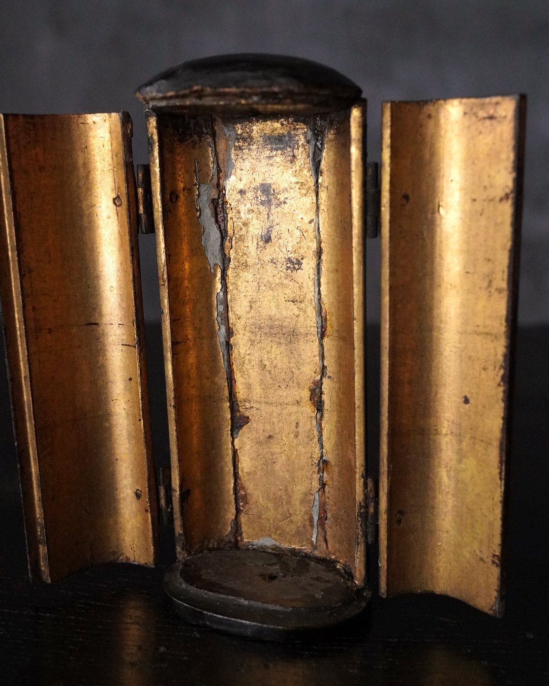 厨子に納められておりますが、本来は単独で製作された念持仏ではなく、光背を伴う仏像群の一部であったものと考えられる菩薩坐像。自立はせず、また両腕に損傷が見られますが、小品ながら端正な面貌と姿態を備えており、前の所持者もその魅力を感じ取り、念持仏として尊んでいたのでしょう。金彩は剥落している部分がございますが下地の黒漆が美しく表出し、時代を経た作品ならではの深い味わいです。江戸時代。