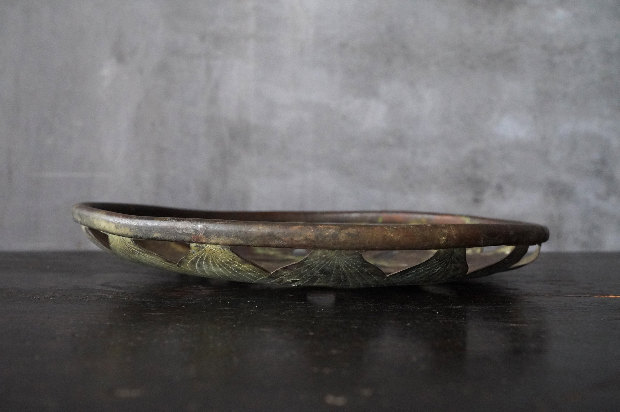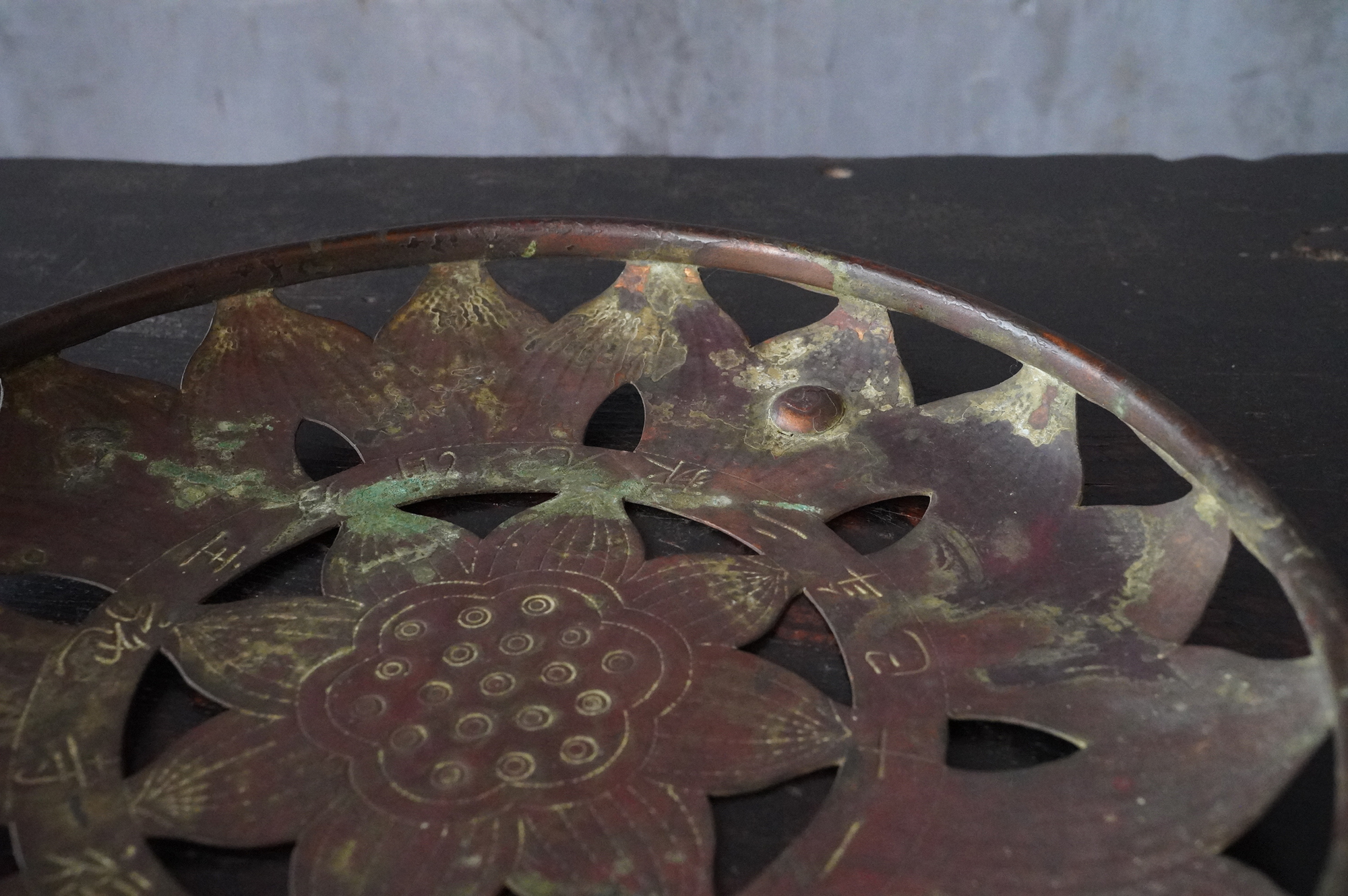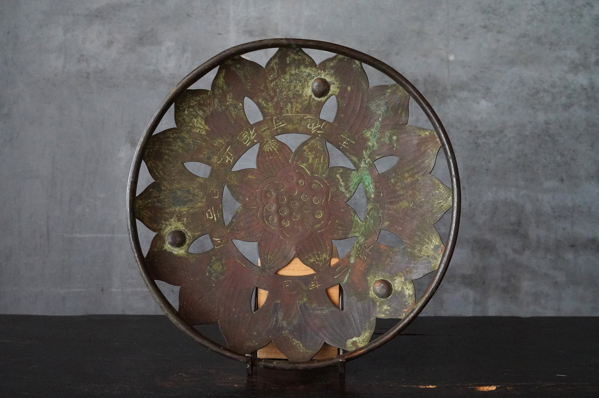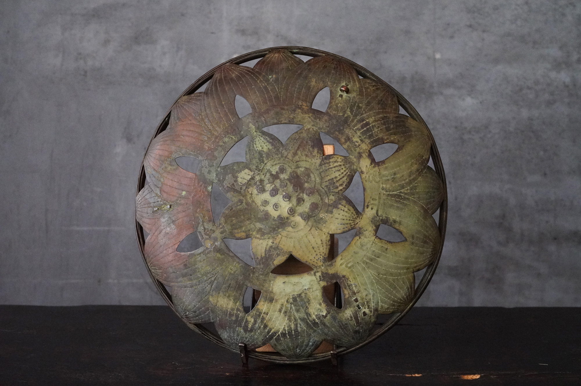 鍍金は施されておりませんが、時を経た銅味が滋味深い華籠。裏面の組紐を通す丸環は三個のうち二個を欠きますが、それ以外に目立った損傷はございません。「正福寺施主〇〇 元禄二年巳十一月吉日」との銘が刻まれております。ただし「正福寺」の名は各地に見られるため、どこのものかを推定するのは困難です。壁に掛けて飾るととても良い雰囲気です。
