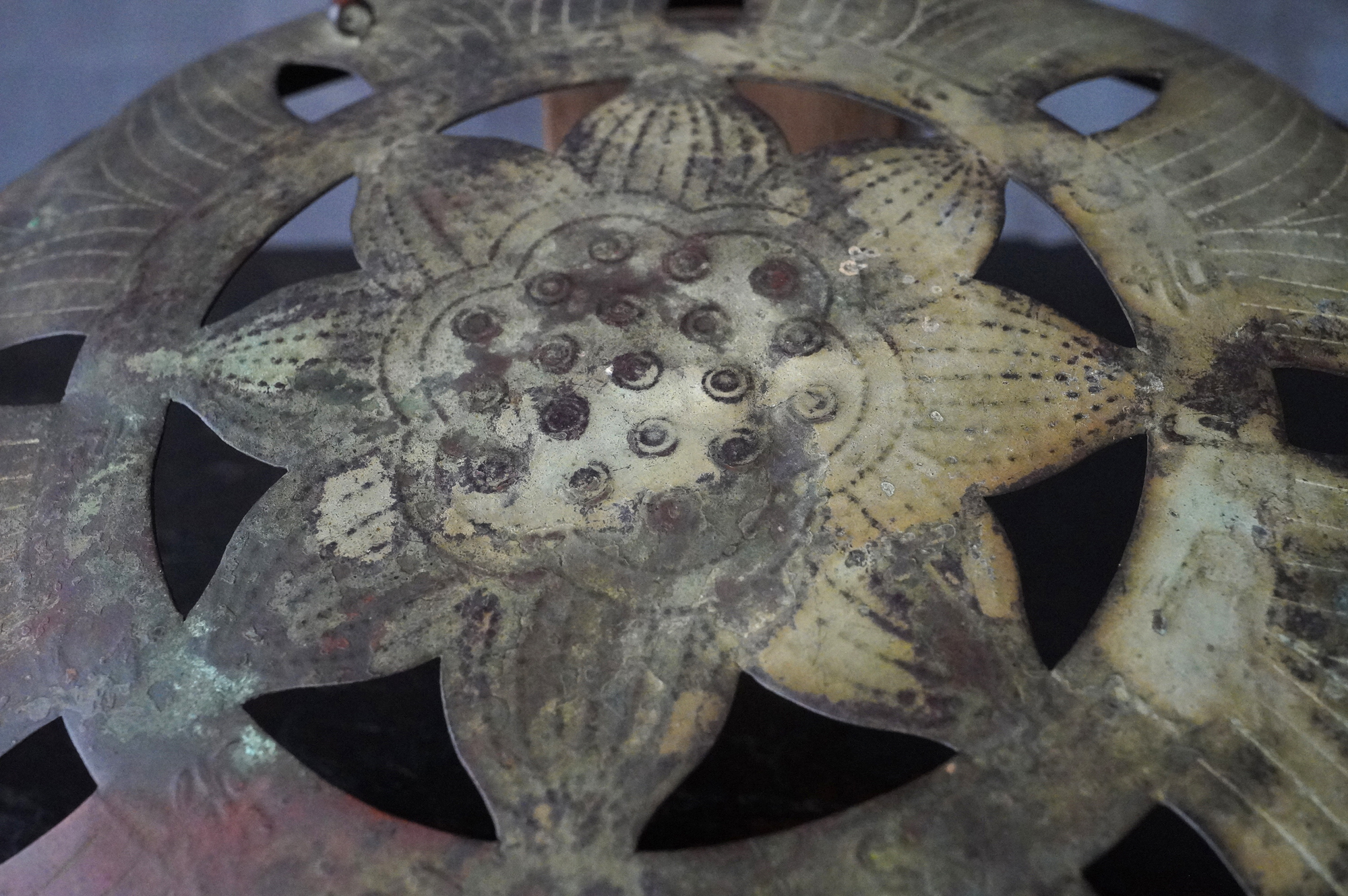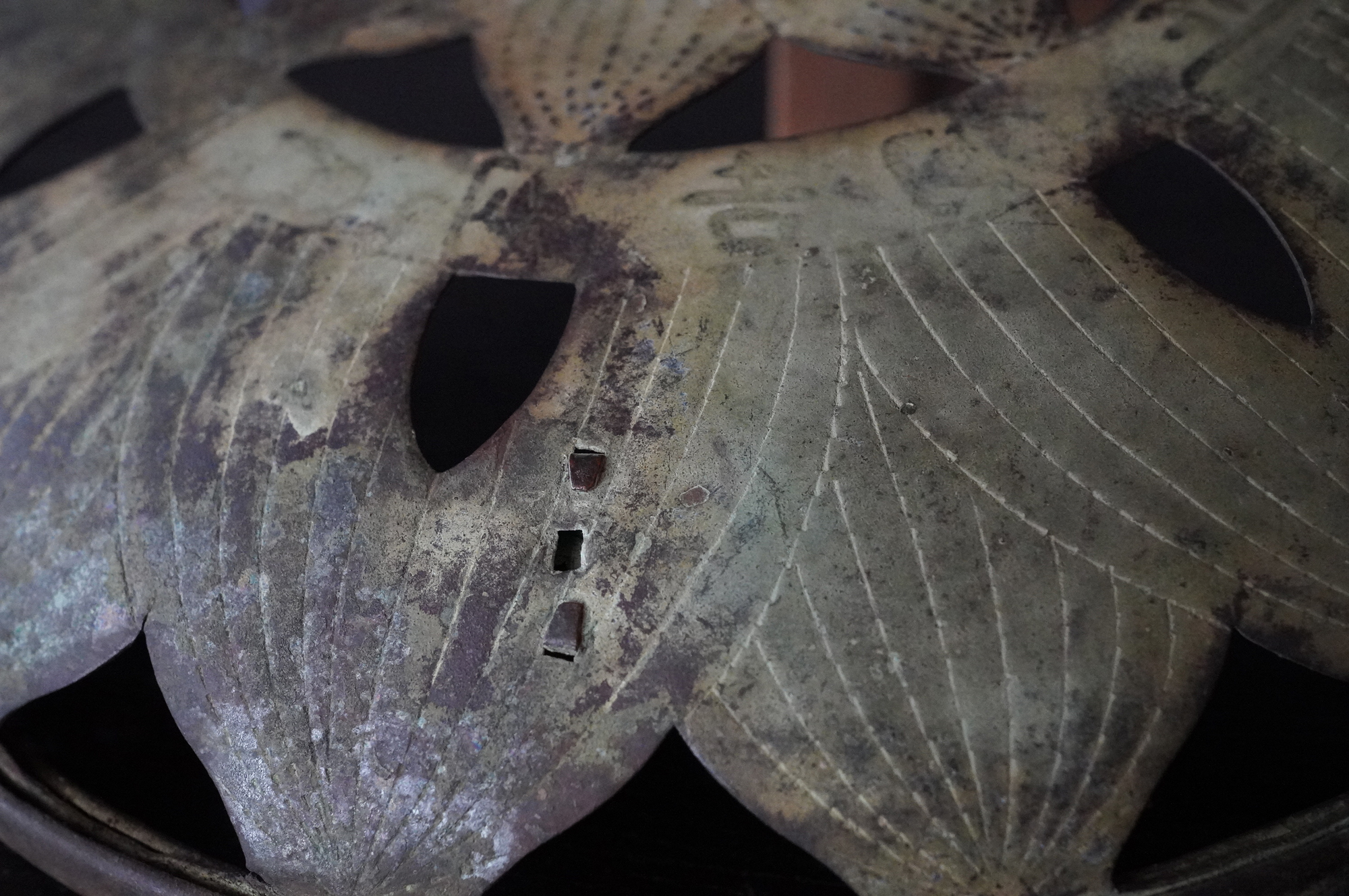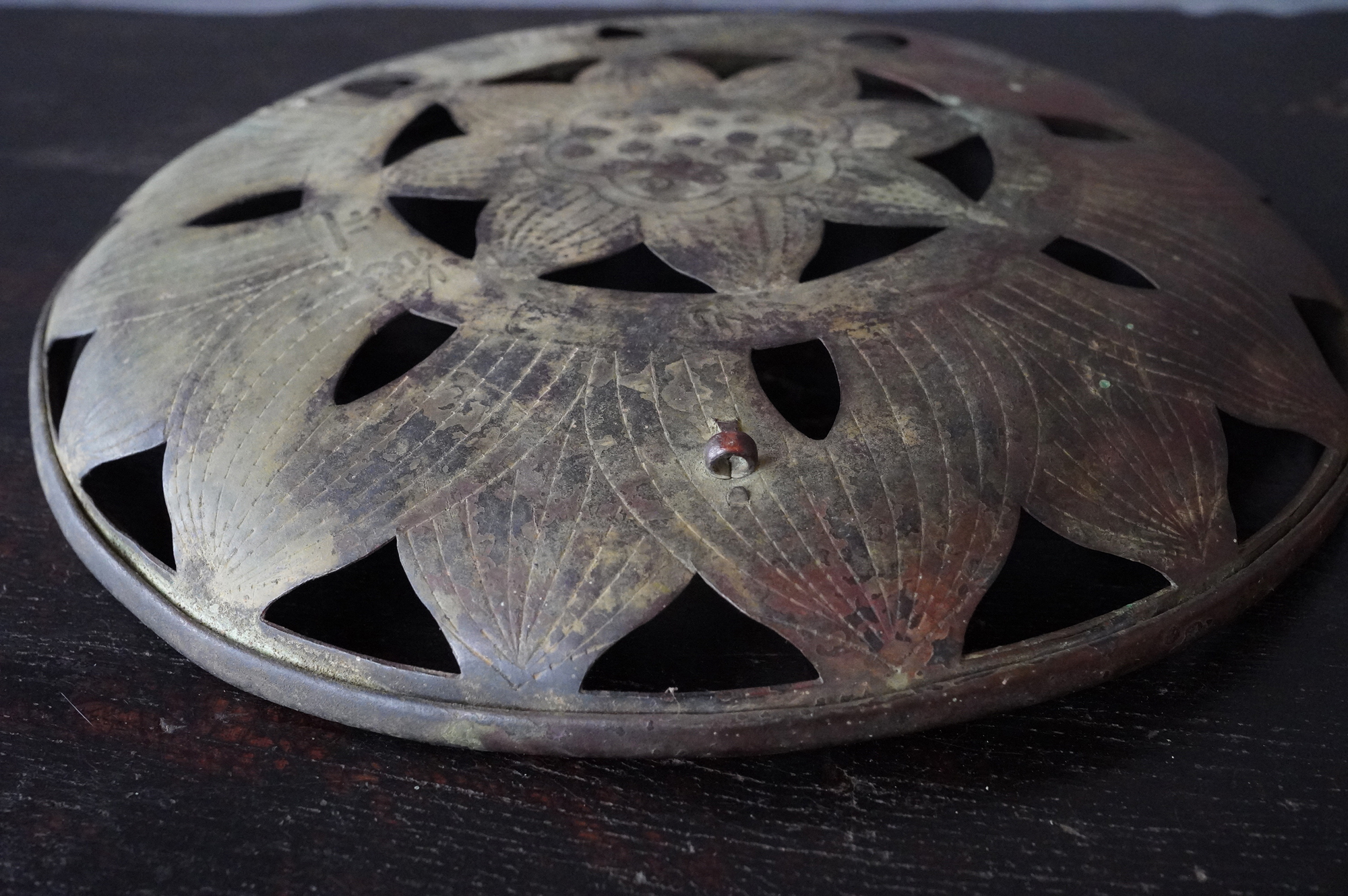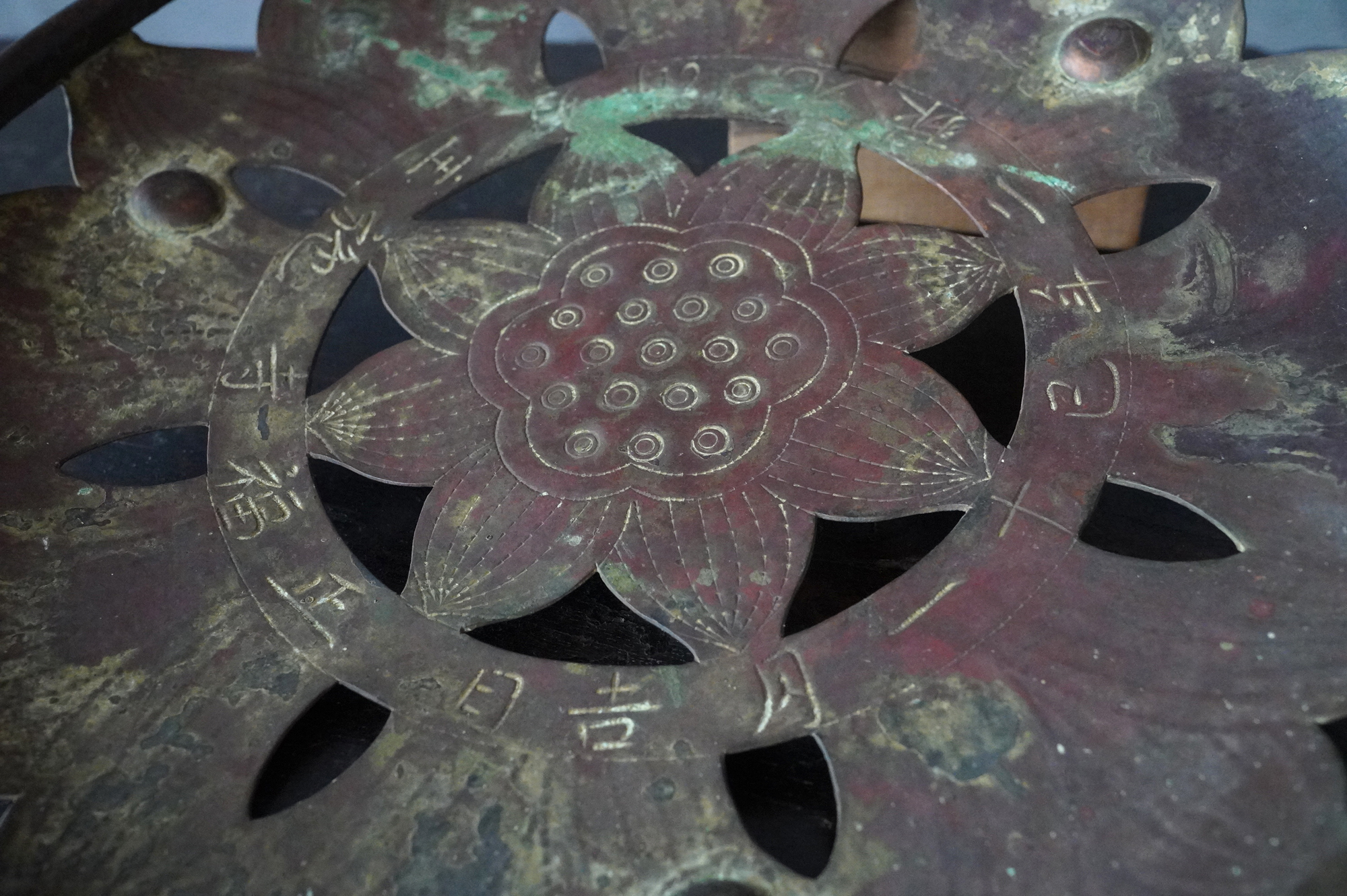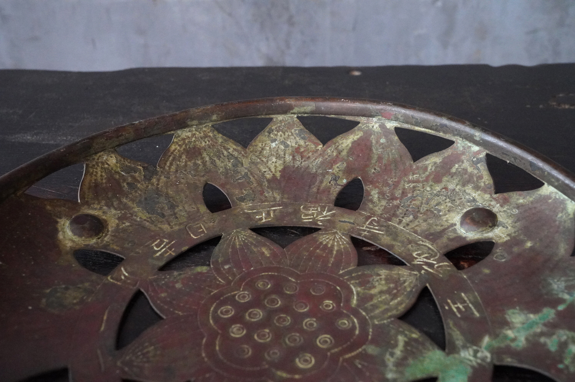 鍍金は施されておりませんが、時を経た銅味が滋味深い華籠。裏面の組紐を通す丸環は三個のうち二個を欠きますが、それ以外に目立った損傷はございません。「正福寺施主〇〇 元禄二年巳十一月吉日」との銘が刻まれております。ただし「正福寺」の名は各地に見られるため、どこのものかを推定するのは困難です。壁に掛けて飾るととても良い雰囲気です。