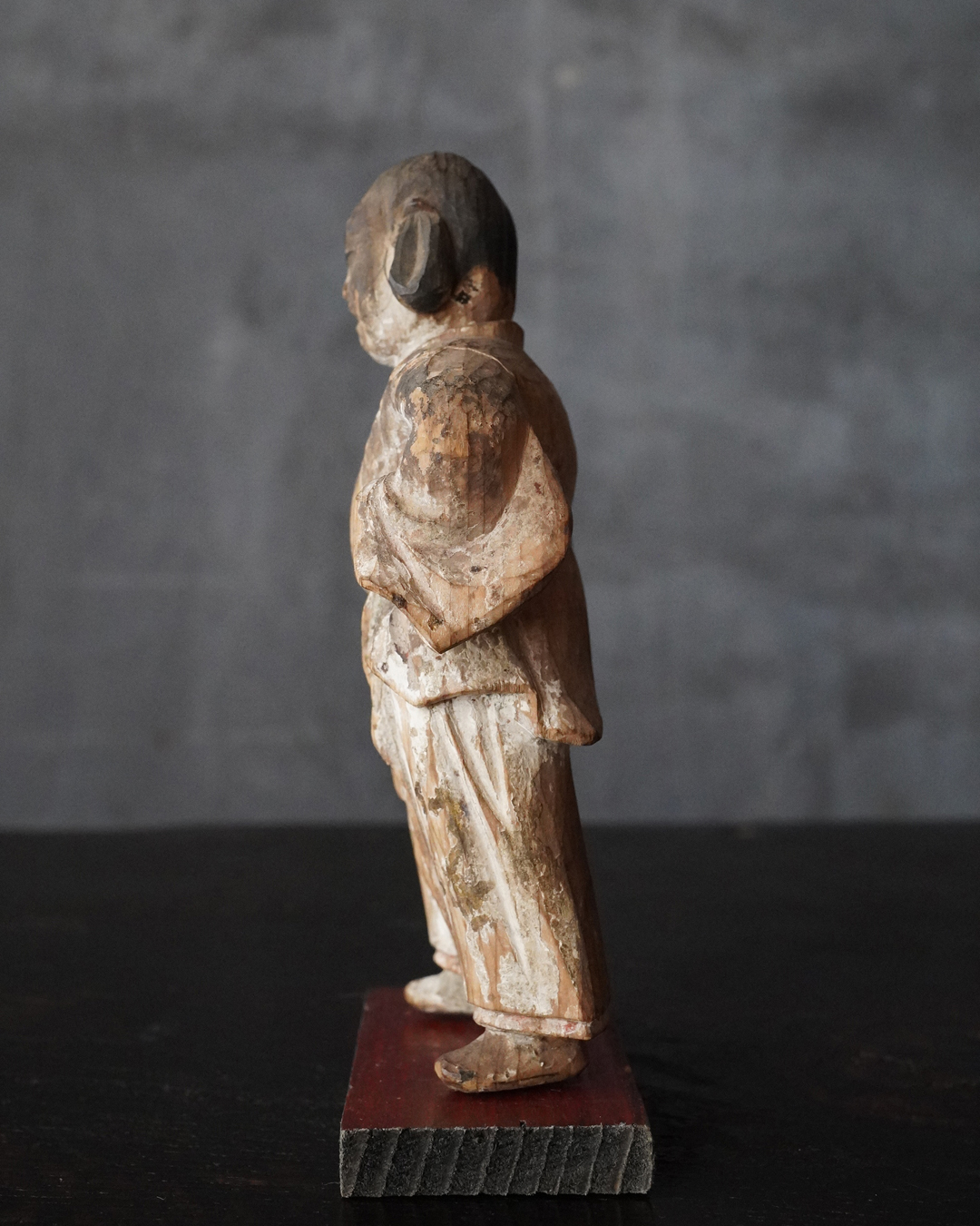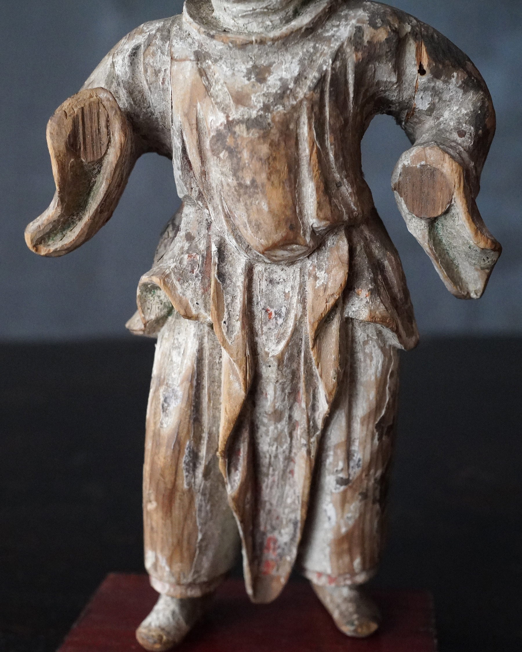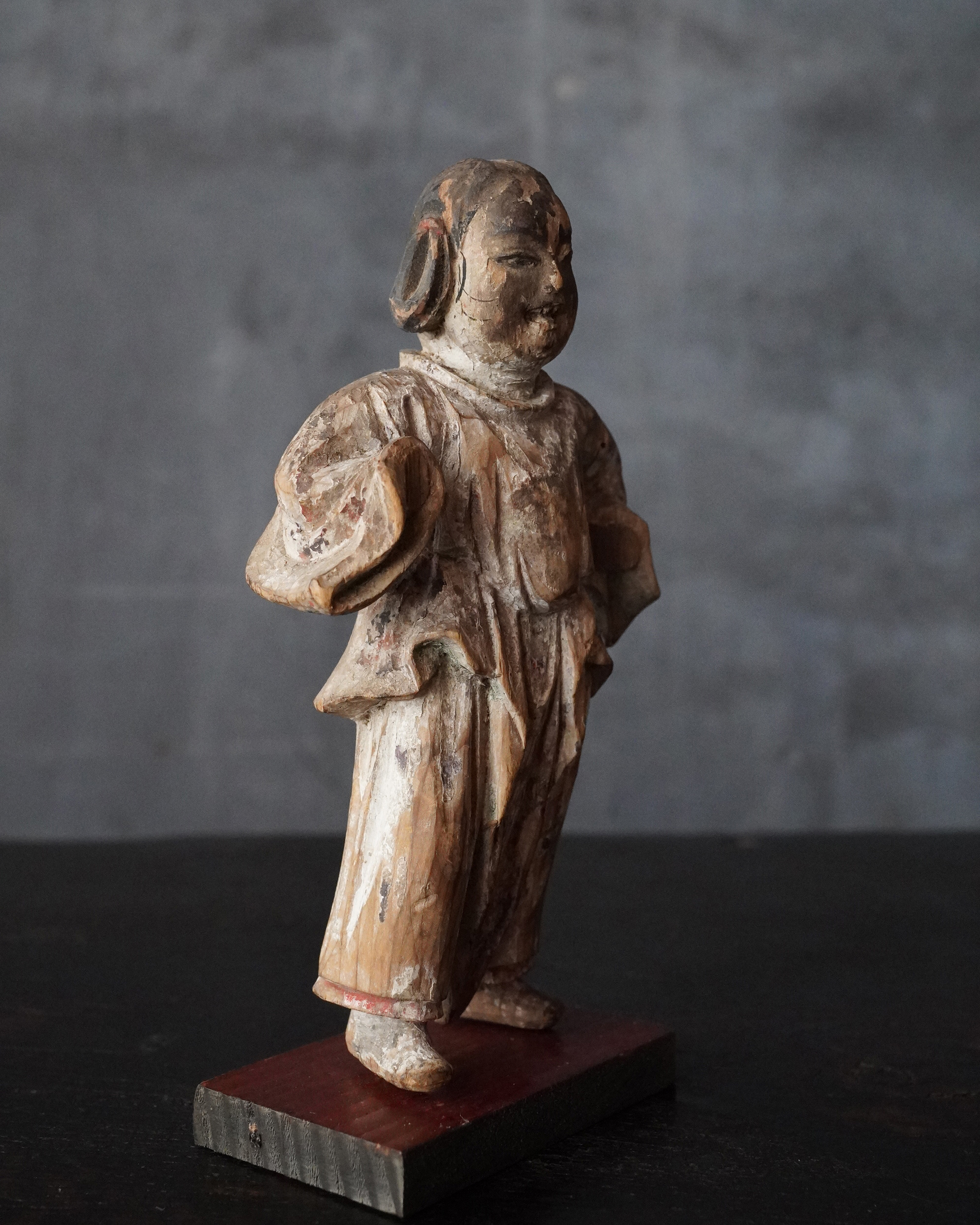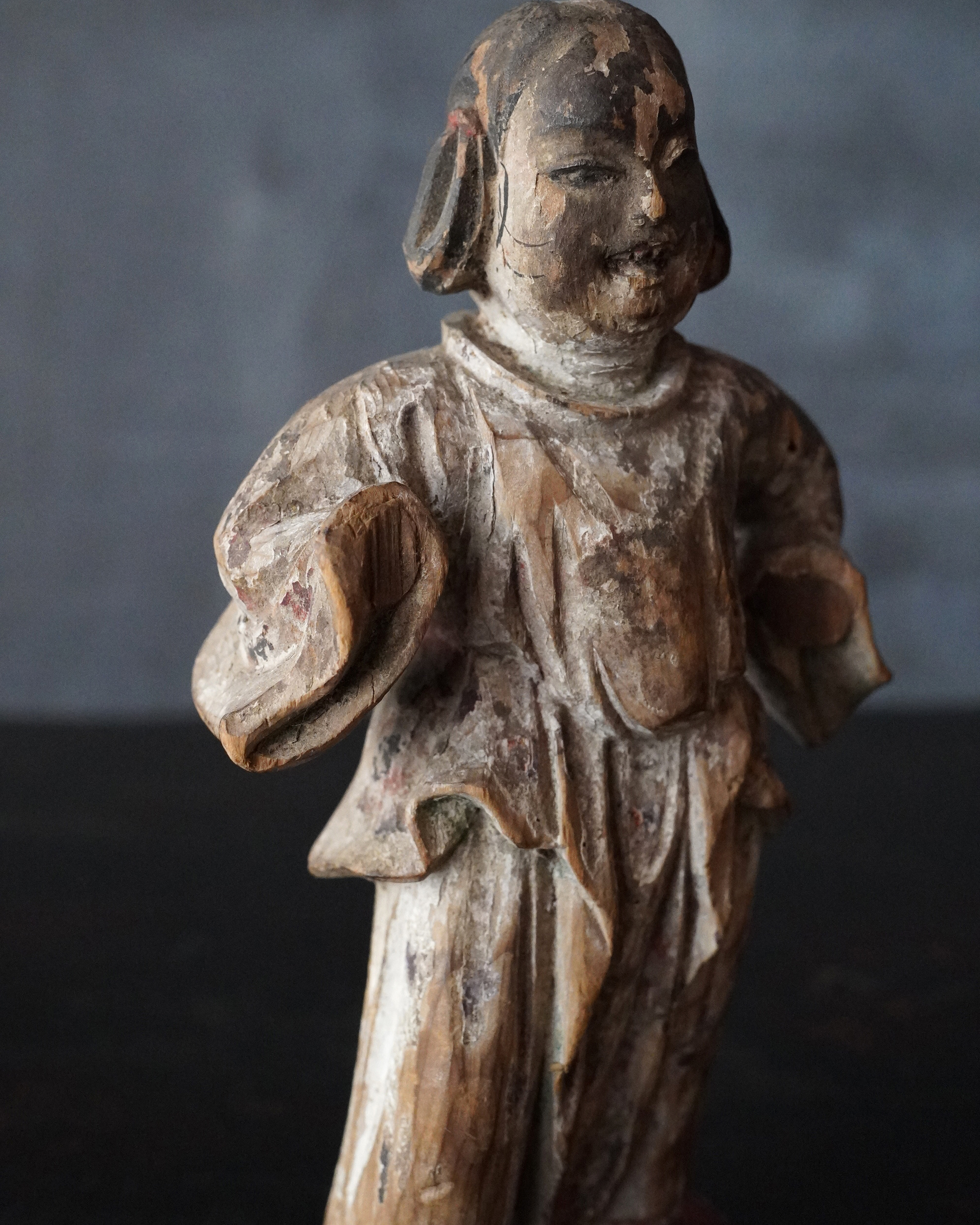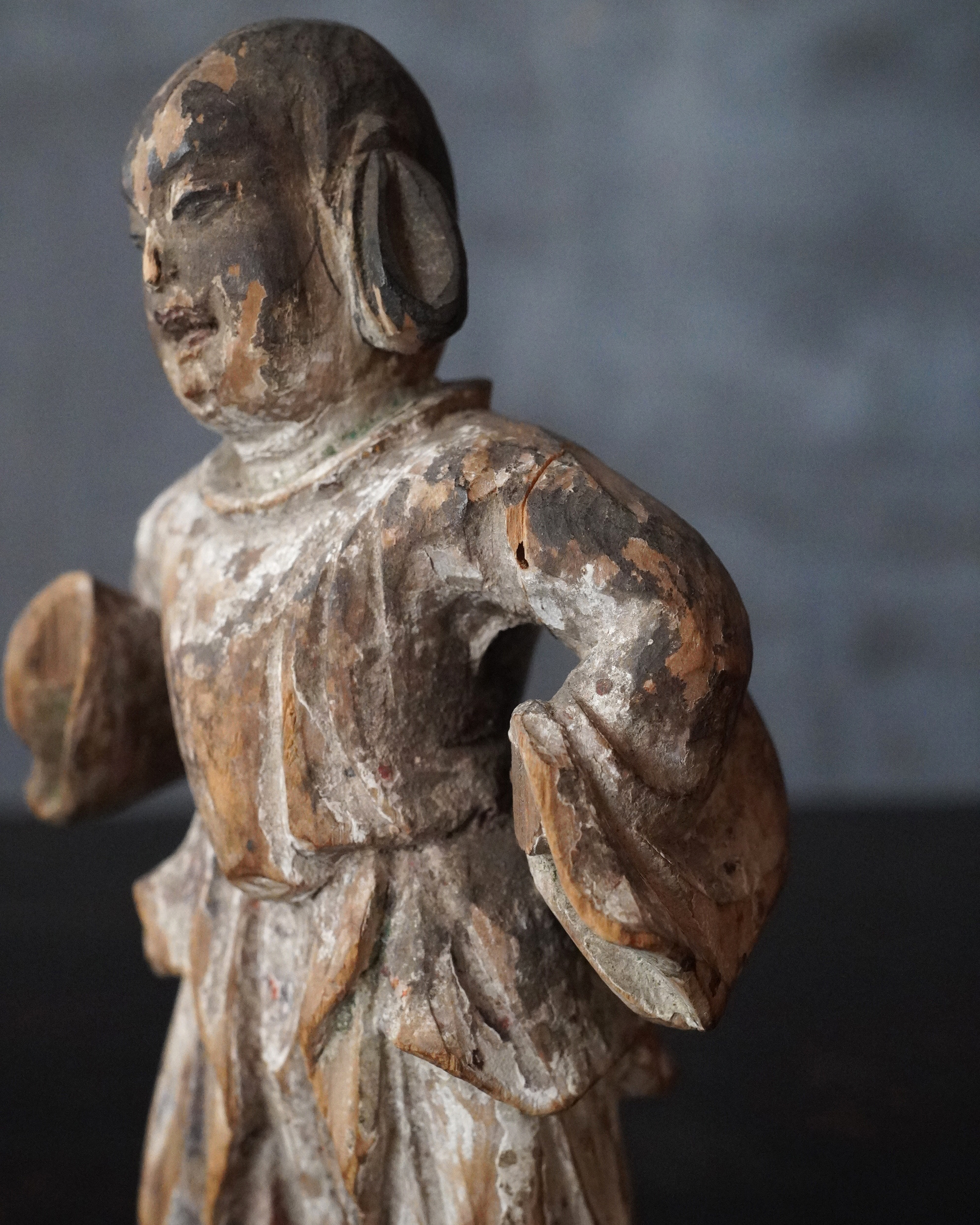 断定はできませんが像容から、作例の極めて少ない聖徳太子二王子像の脇侍、すなわち山背大兄王(太子の子)もしくは殖栗王(太子の弟)を表したものかと思われます。本来は彩色が施され、色鮮やかであったと想像されますが、現在も全体に胡粉が残り、その面影を十分に伝えております。両手を欠き、完全な姿ではございませんが、像の魅力と存在感はなお失われておりません。