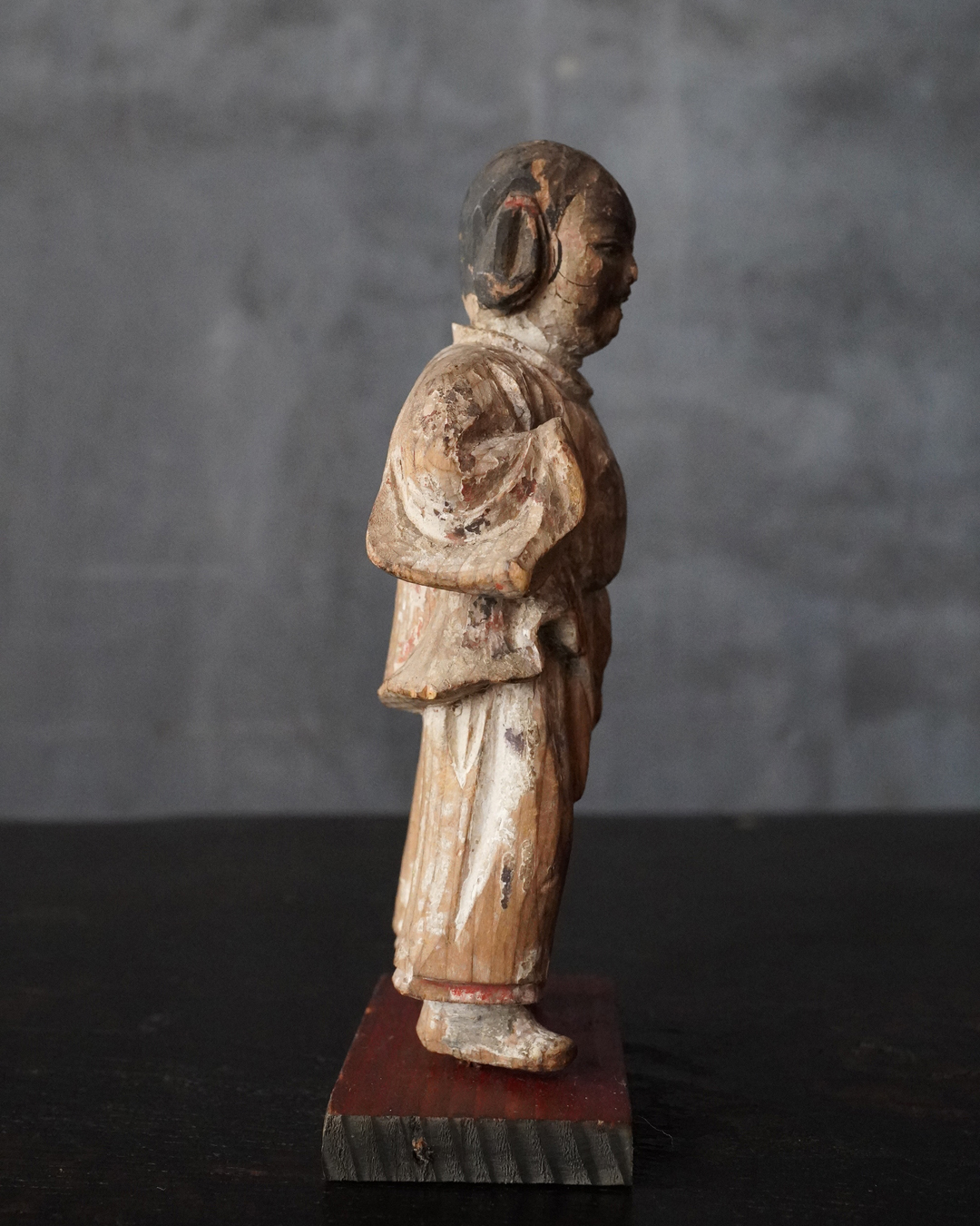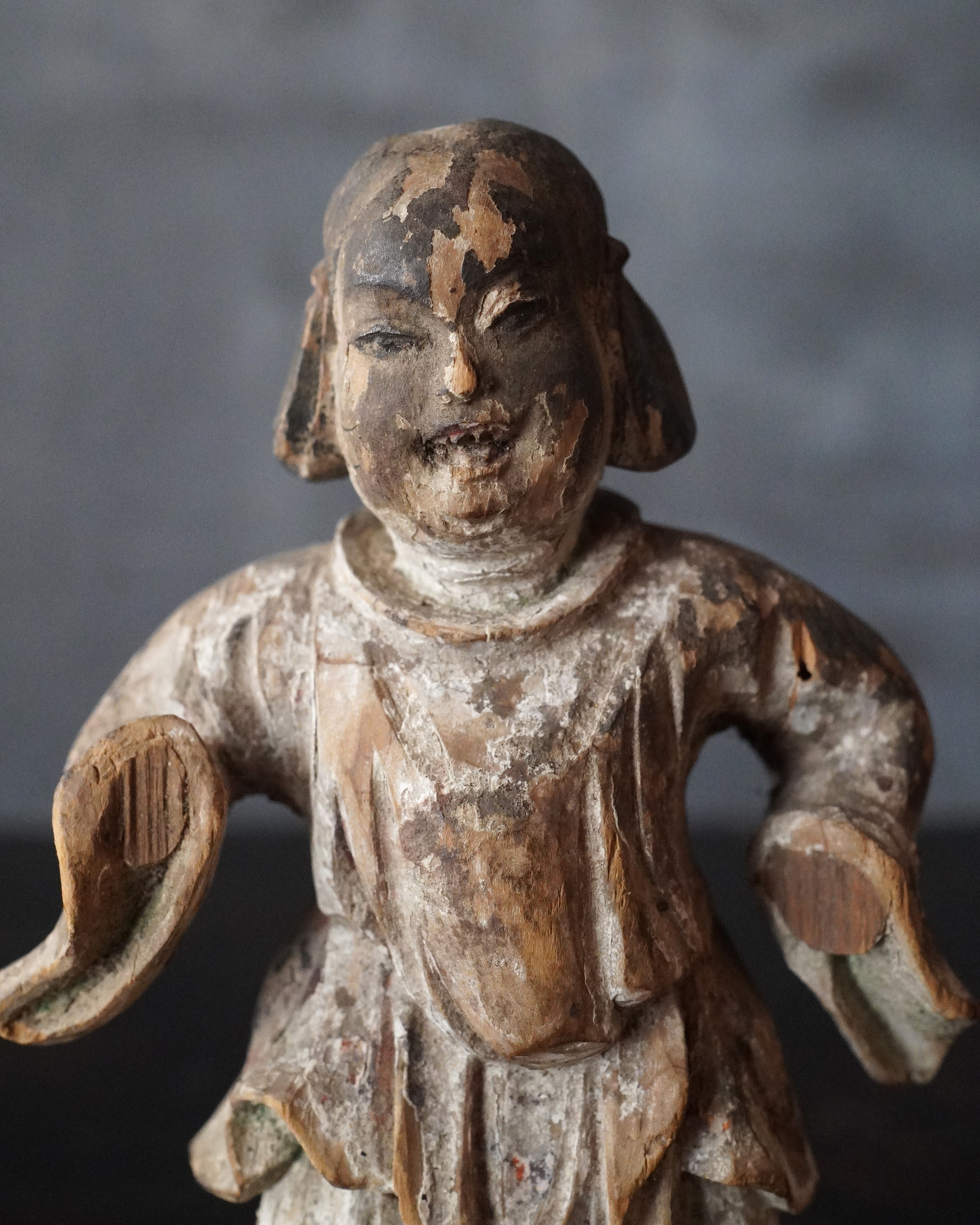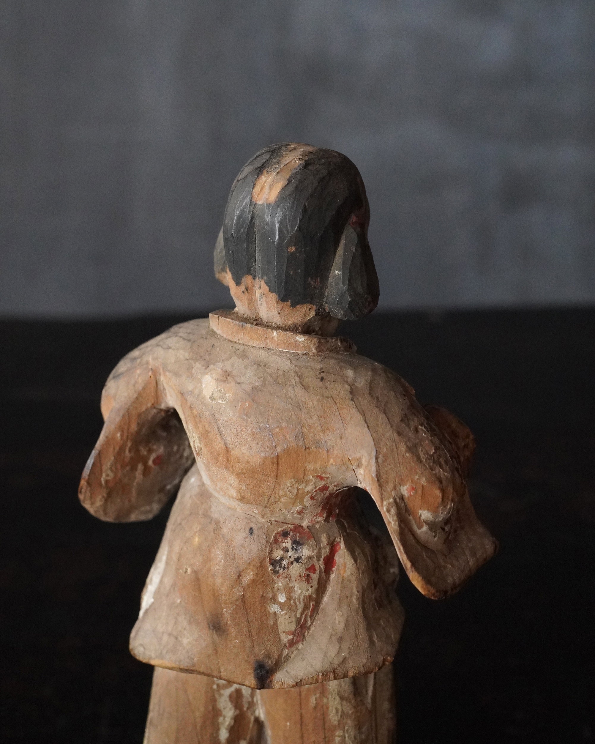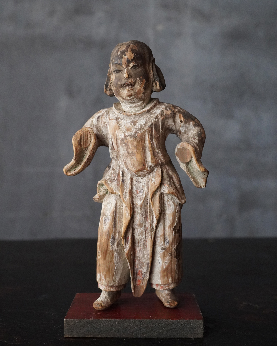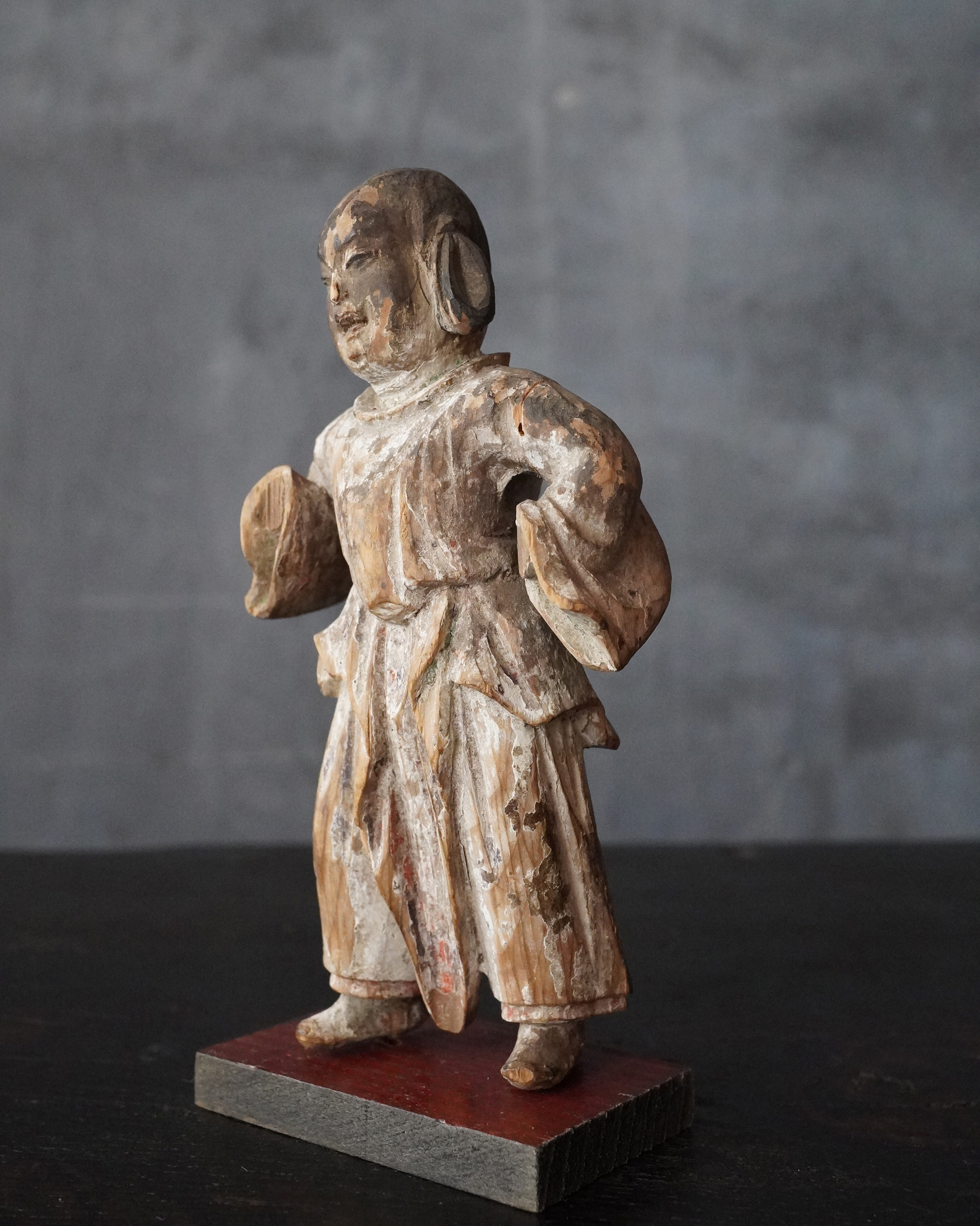 断定はできませんが像容から、作例の極めて少ない聖徳太子二王子像の脇侍、すなわち山背大兄王(太子の子)もしくは殖栗王(太子の弟)を表したものかと思われます。本来は彩色が施され、色鮮やかであったと想像されますが、現在も全体に胡粉が残り、その面影を十分に伝えております。両手を欠き、完全な姿ではございませんが、像の魅力と存在感はなお失われておりません。