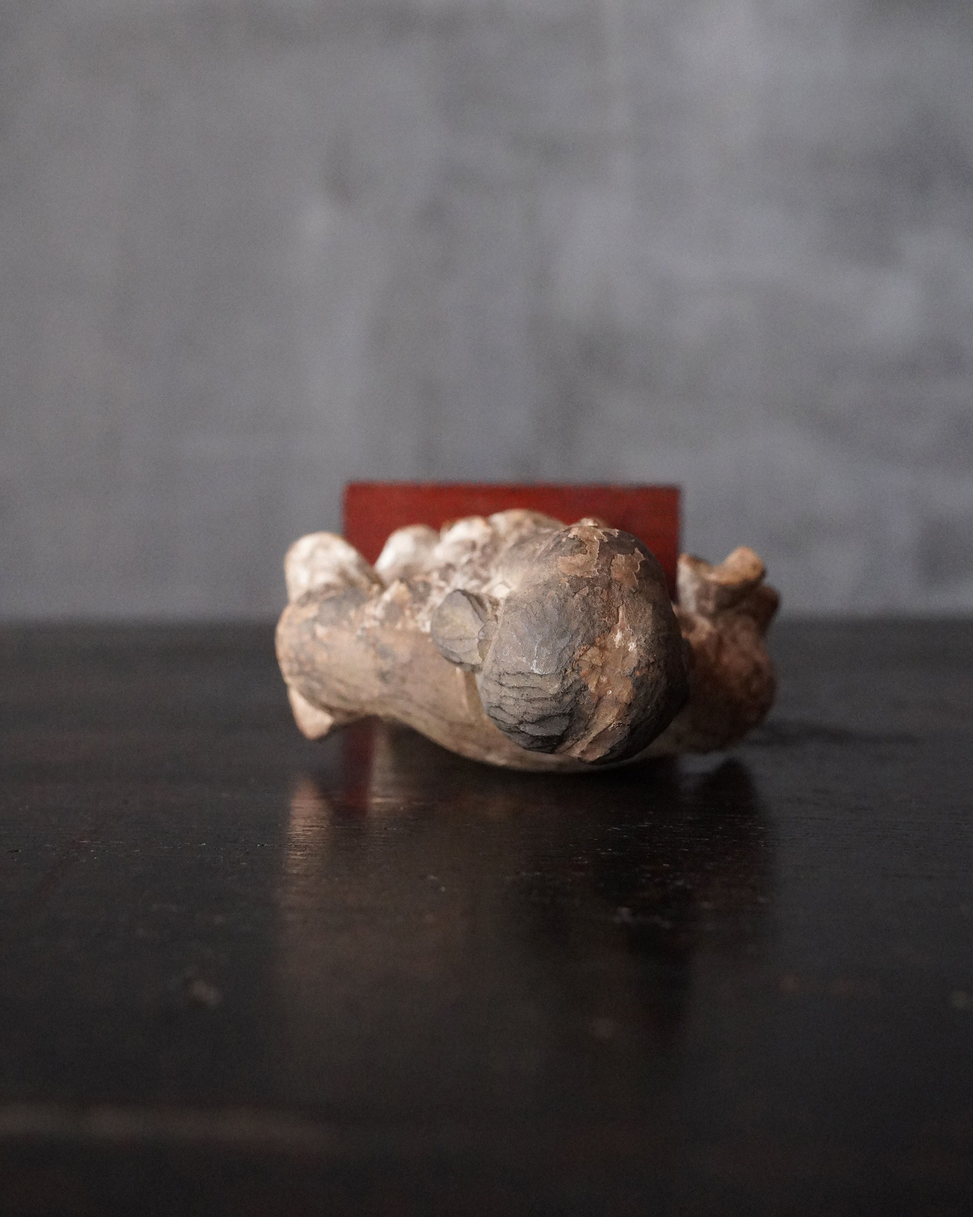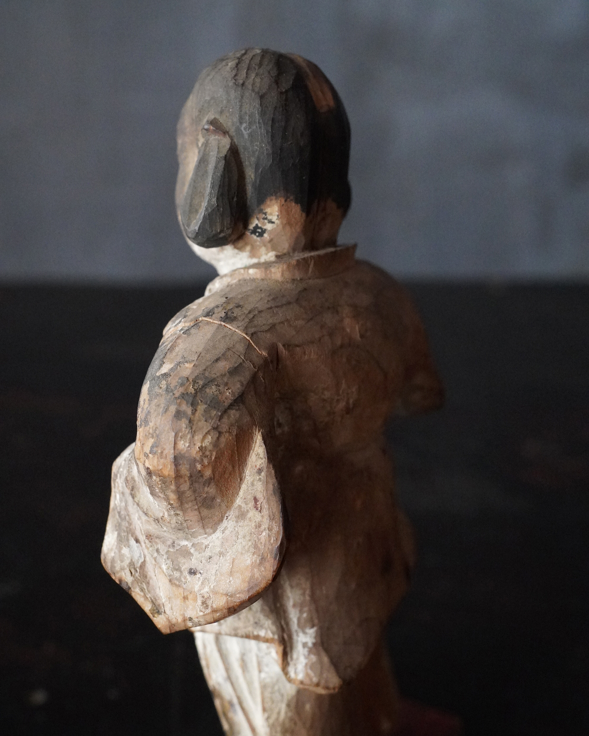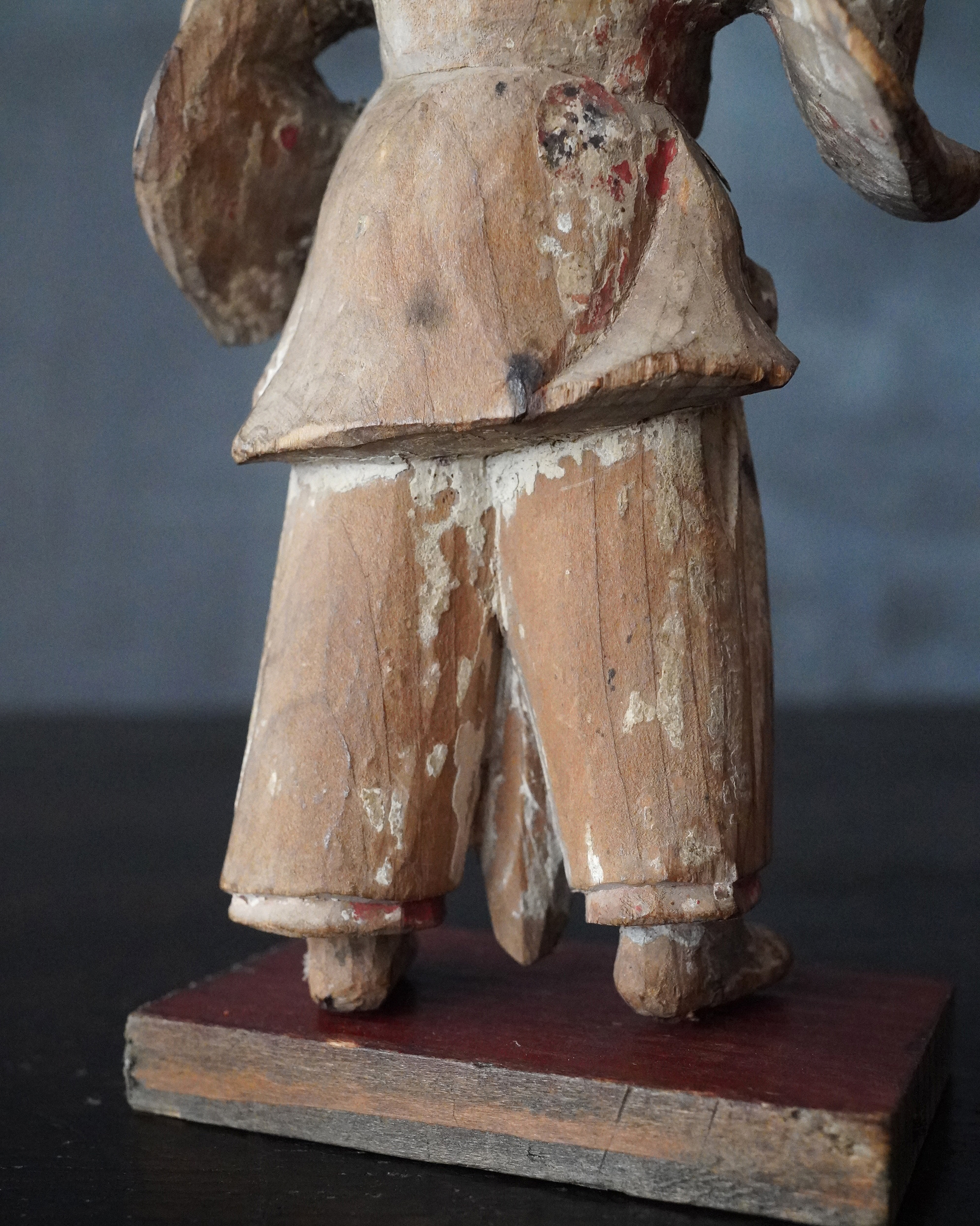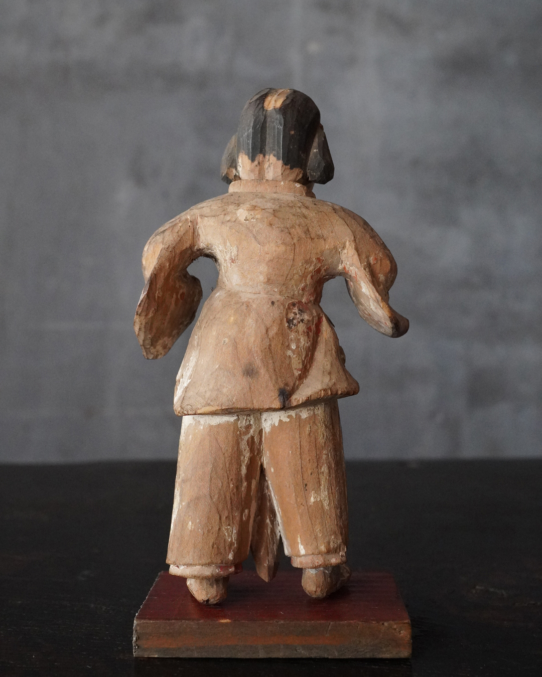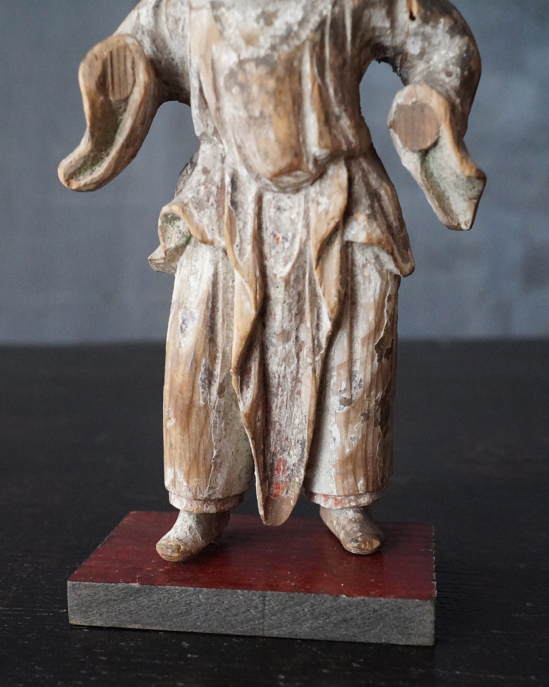 断定はできませんが像容から、作例の極めて少ない聖徳太子二王子像の脇侍、すなわち山背大兄王(太子の子)もしくは殖栗王(太子の弟)を表したものかと思われます。本来は彩色が施され、色鮮やかであったと想像されますが、現在も全体に胡粉が残り、その面影を十分に伝えております。両手を欠き、完全な姿ではございませんが、像の魅力と存在感はなお失われておりません。