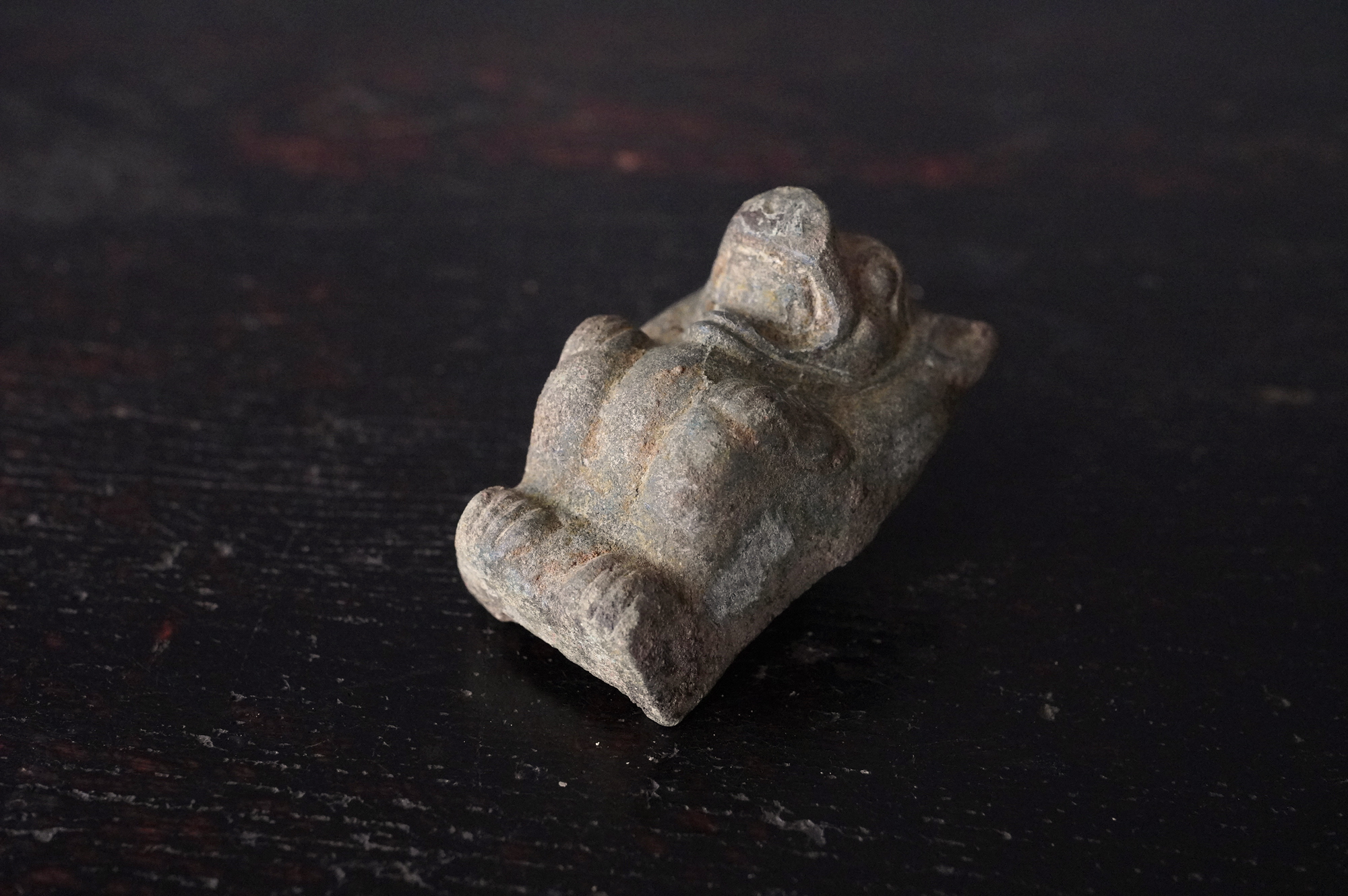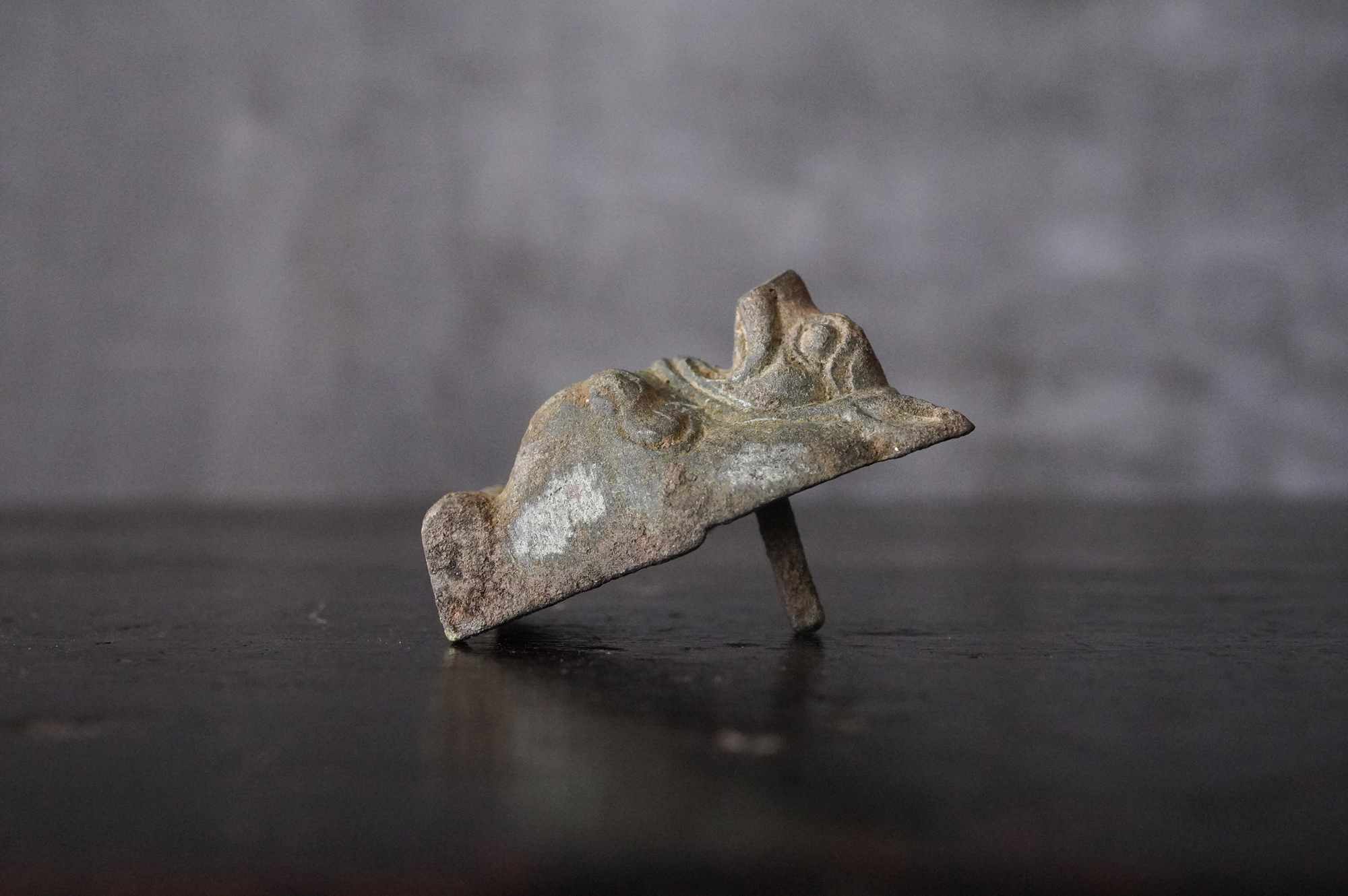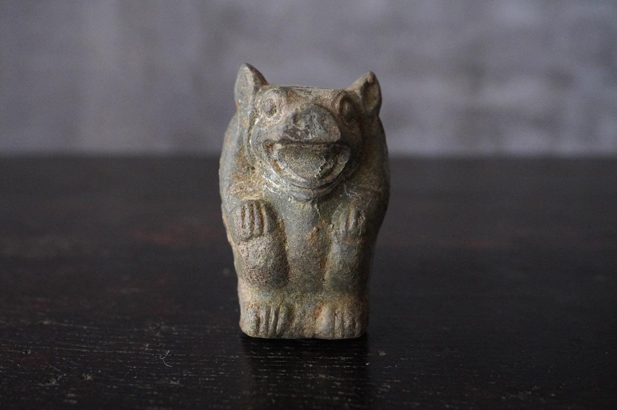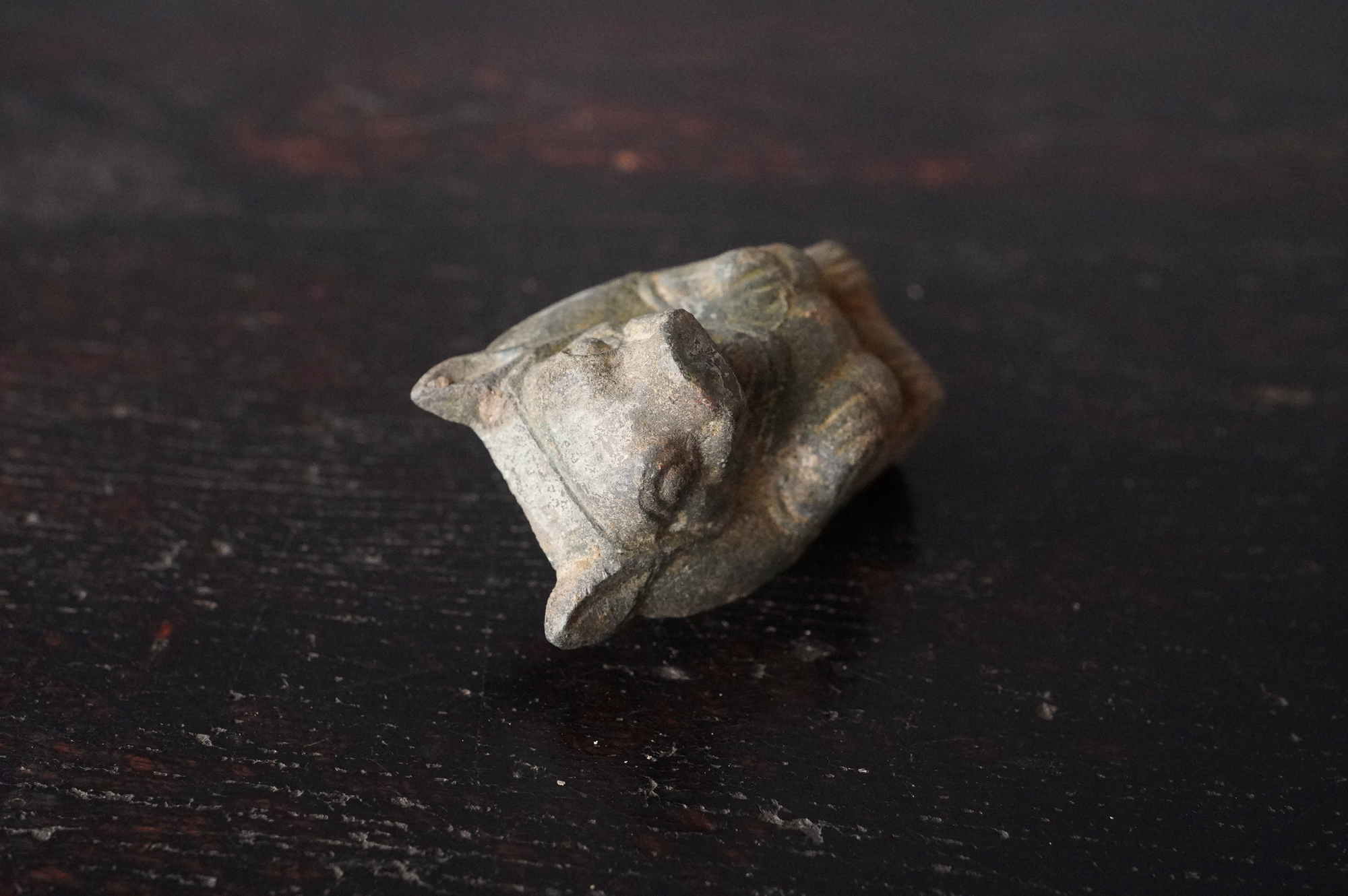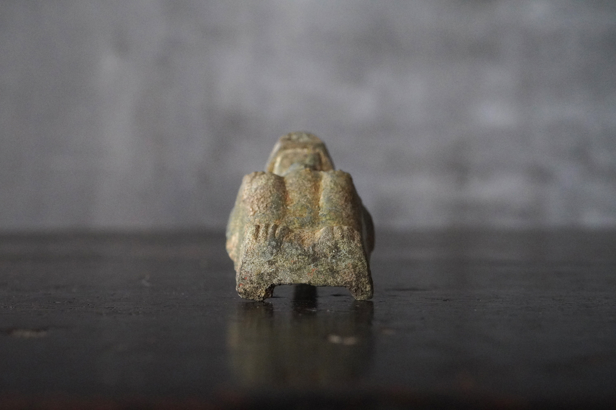 全体に緑青を帯び、発掘品らしい風合いの青銅製の熊像。愛らしい姿ながら、造形には力強さが感じられ、中国大陸出土のものと考えます。背面には突起が設けられており、何らかの器物に差し込んで装飾として用いられていたものと思われます。自立しませんので予めご了承下さい。時代はおそらく漢代前後の頃に遡るものでしょう。