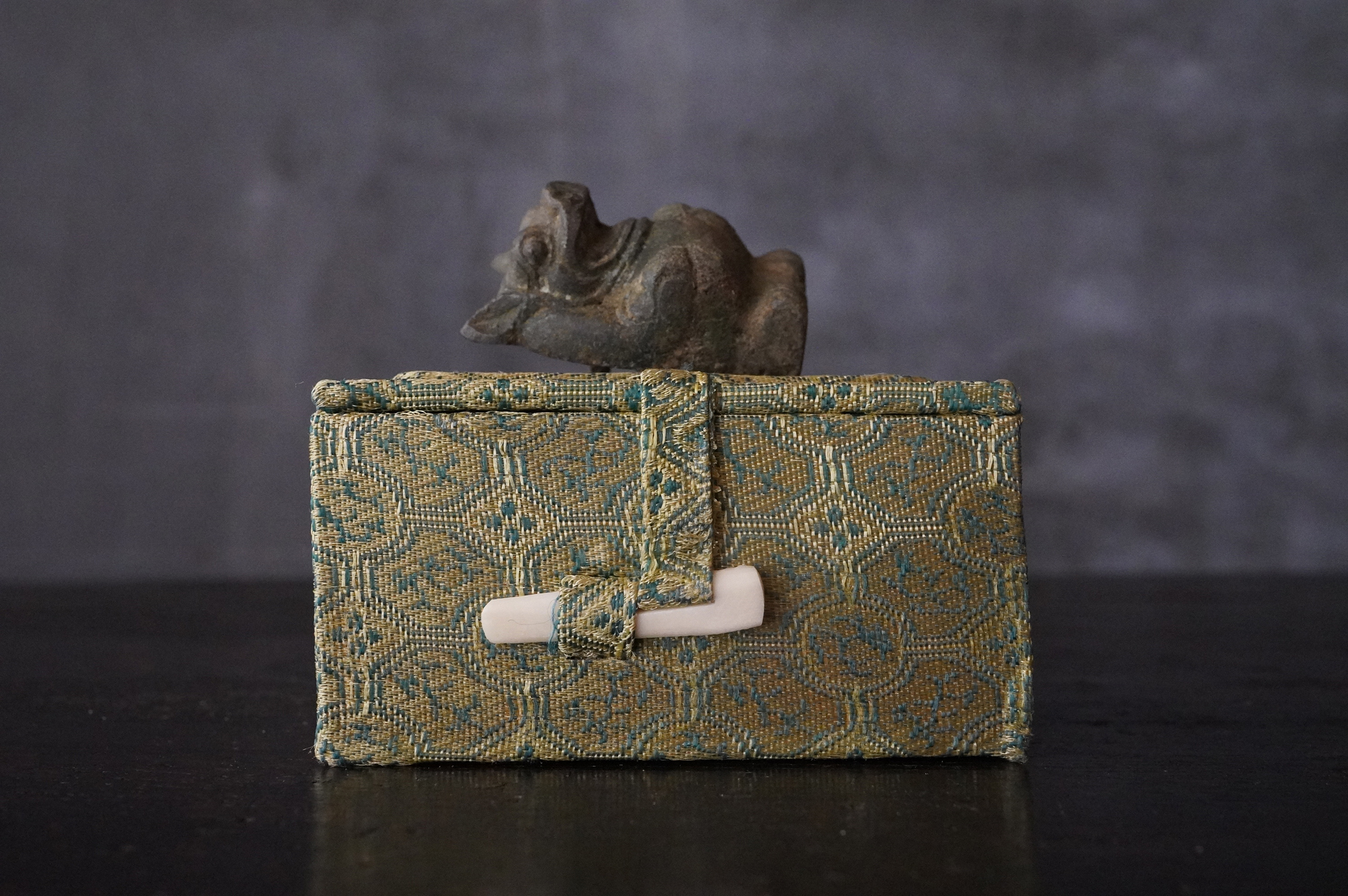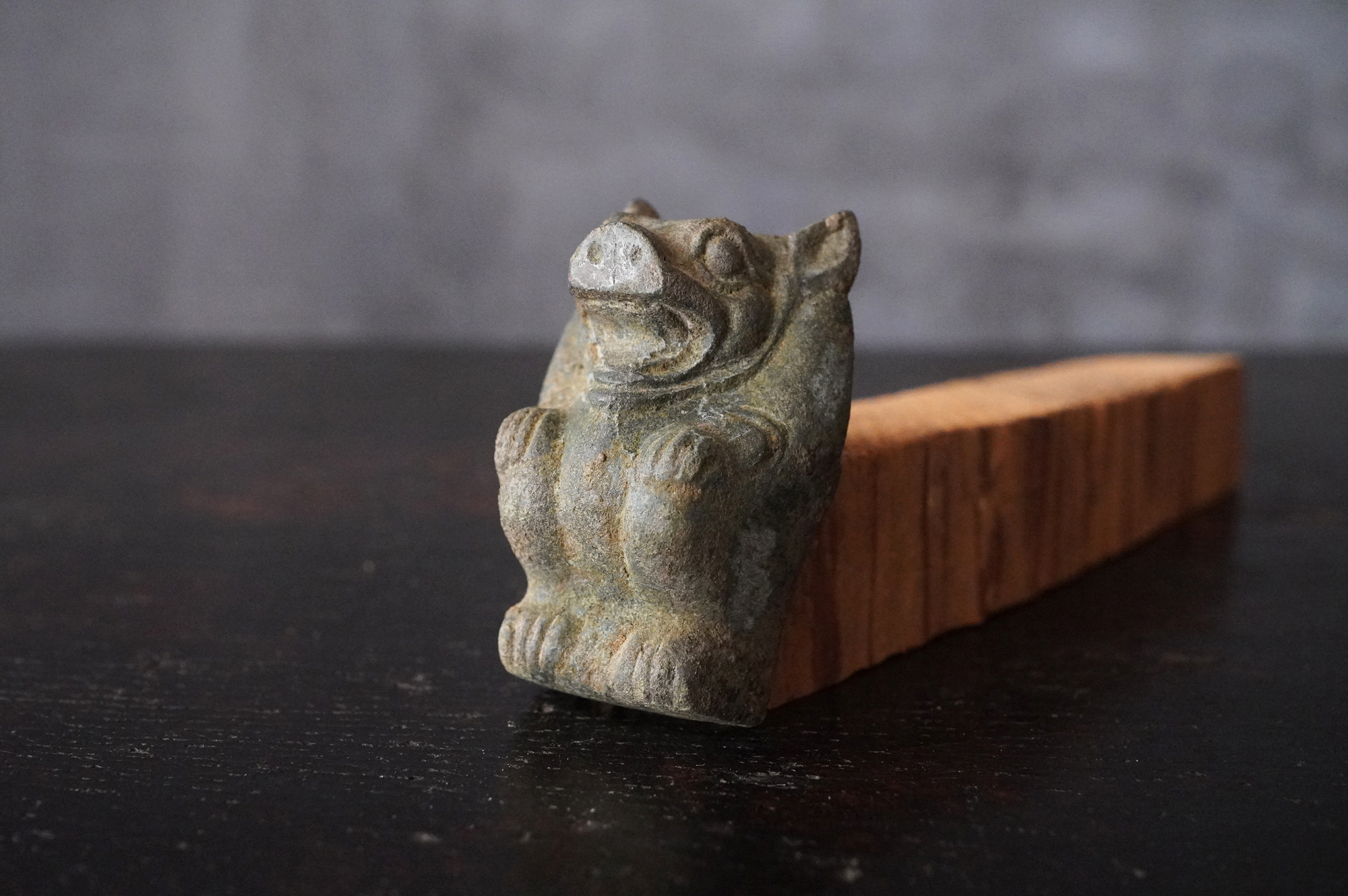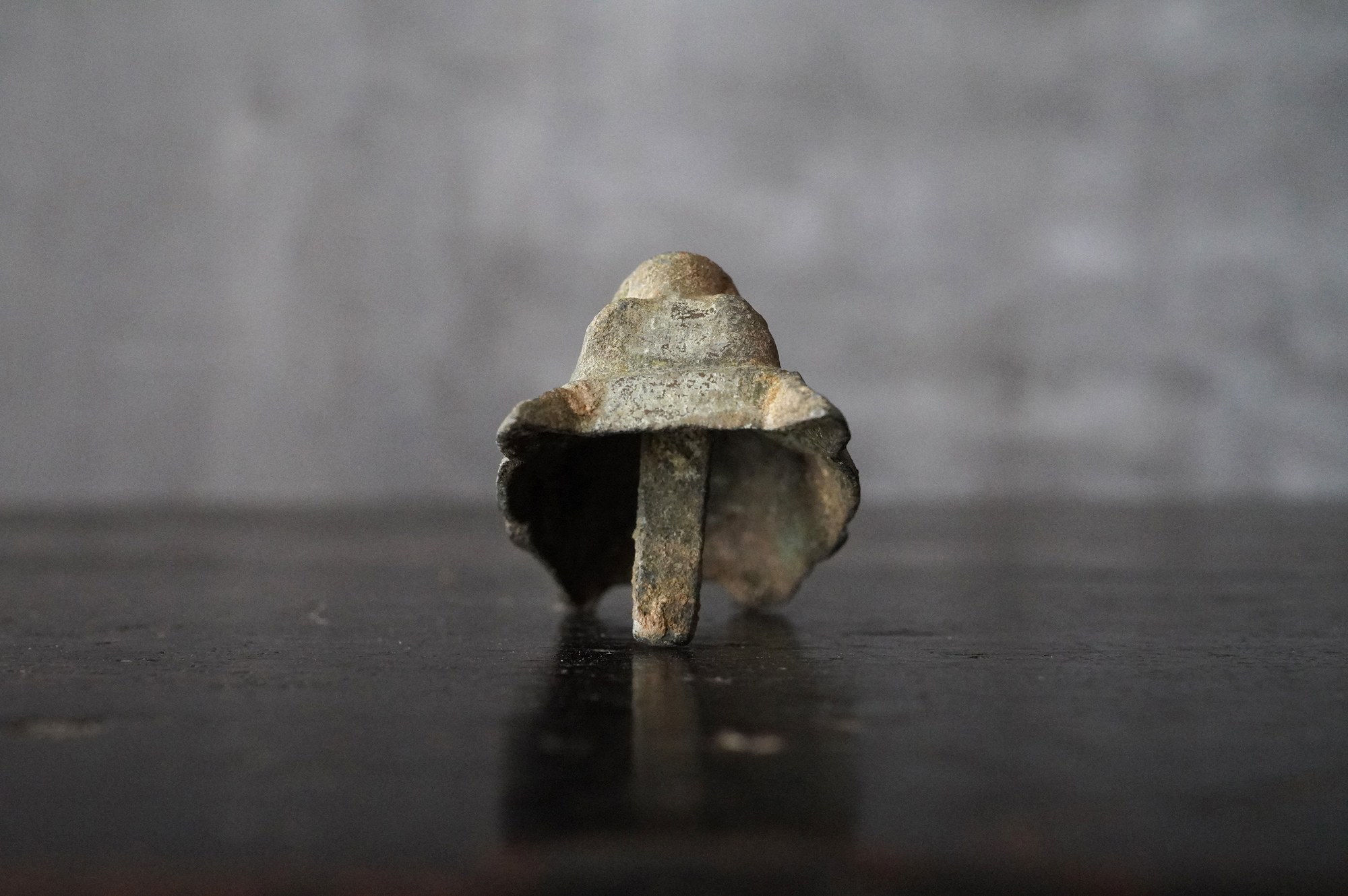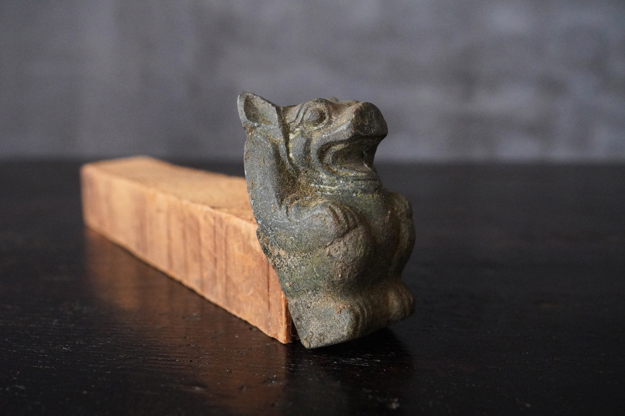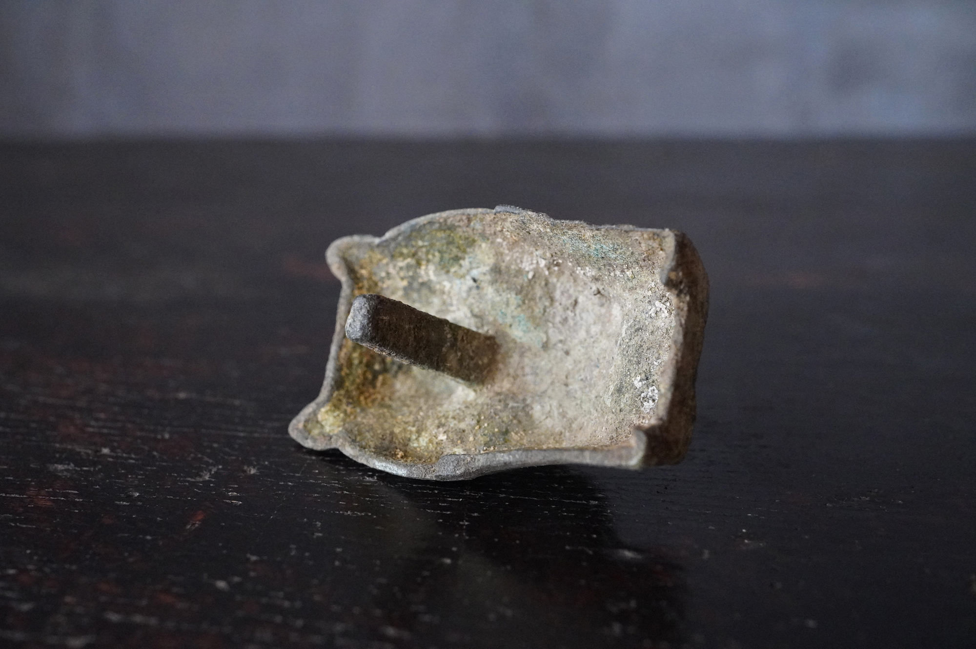 全体に緑青を帯び、発掘品らしい風合いの青銅製の熊像。愛らしい姿ながら、造形には力強さが感じられ、中国大陸出土のものと考えます。背面には突起が設けられており、何らかの器物に差し込んで装飾として用いられていたものと思われます。自立しませんので予めご了承下さい。時代はおそらく漢代前後の頃に遡るものでしょう。