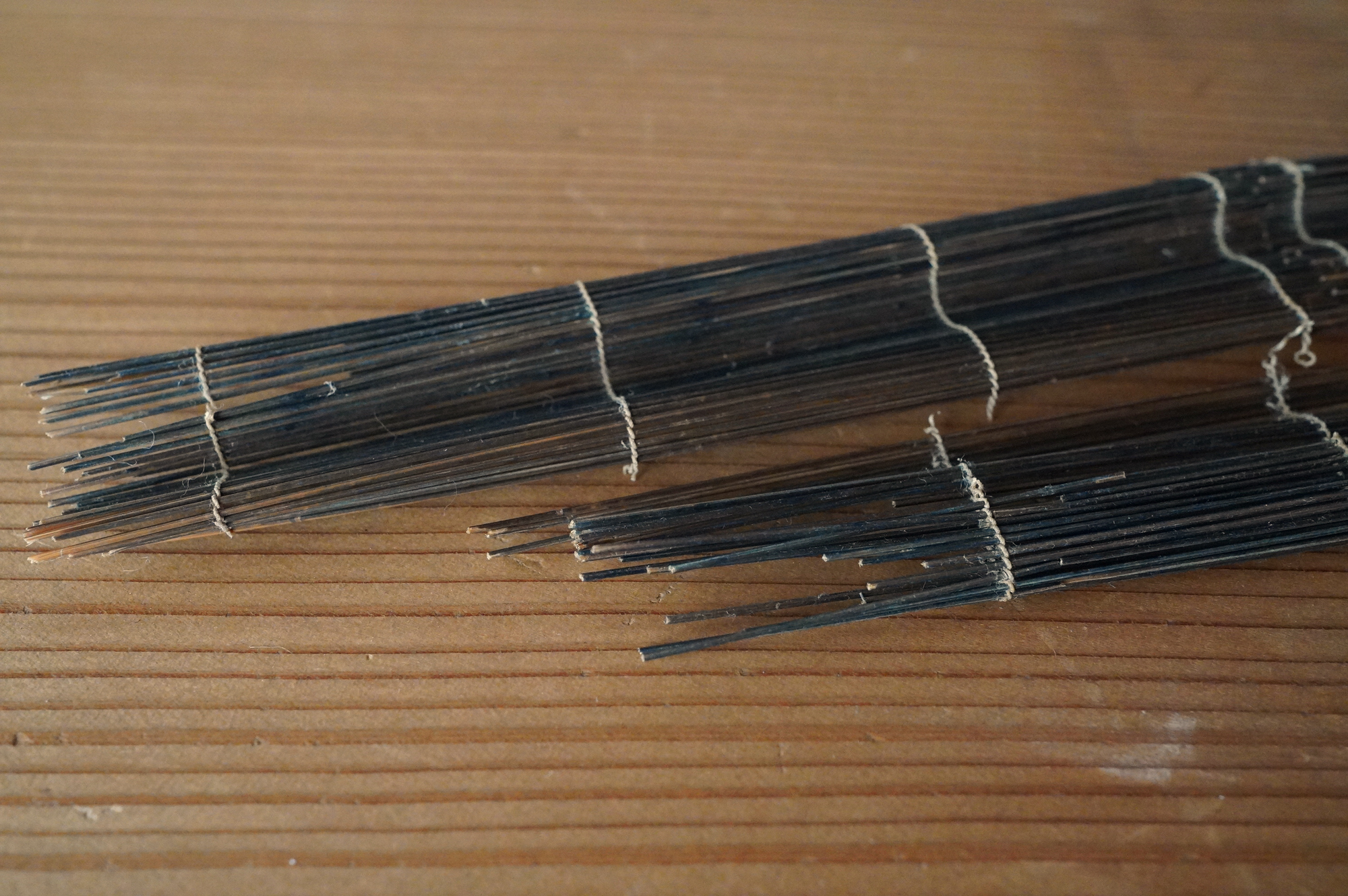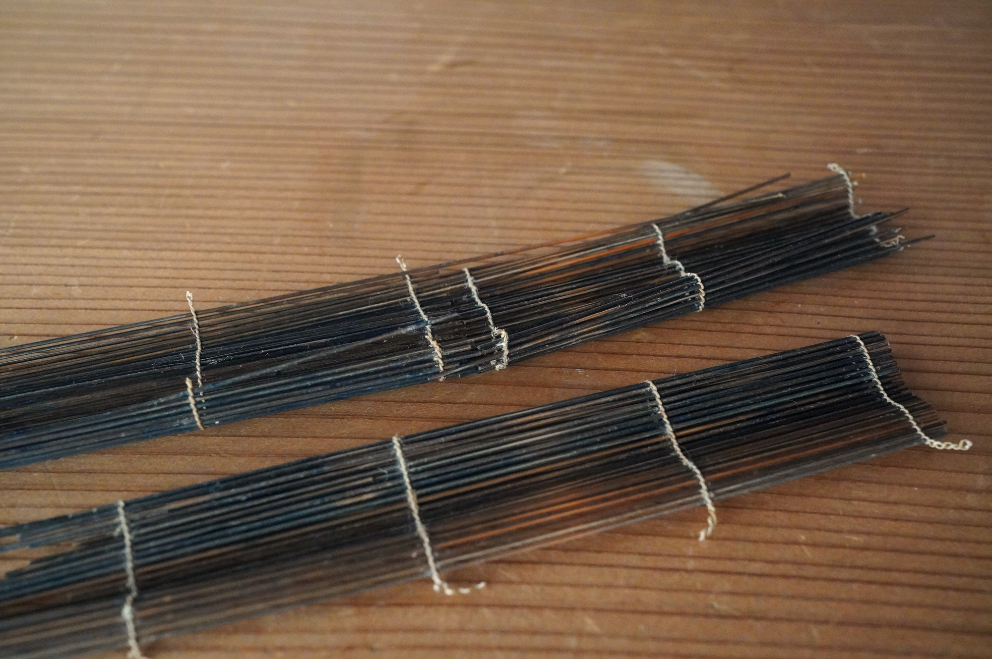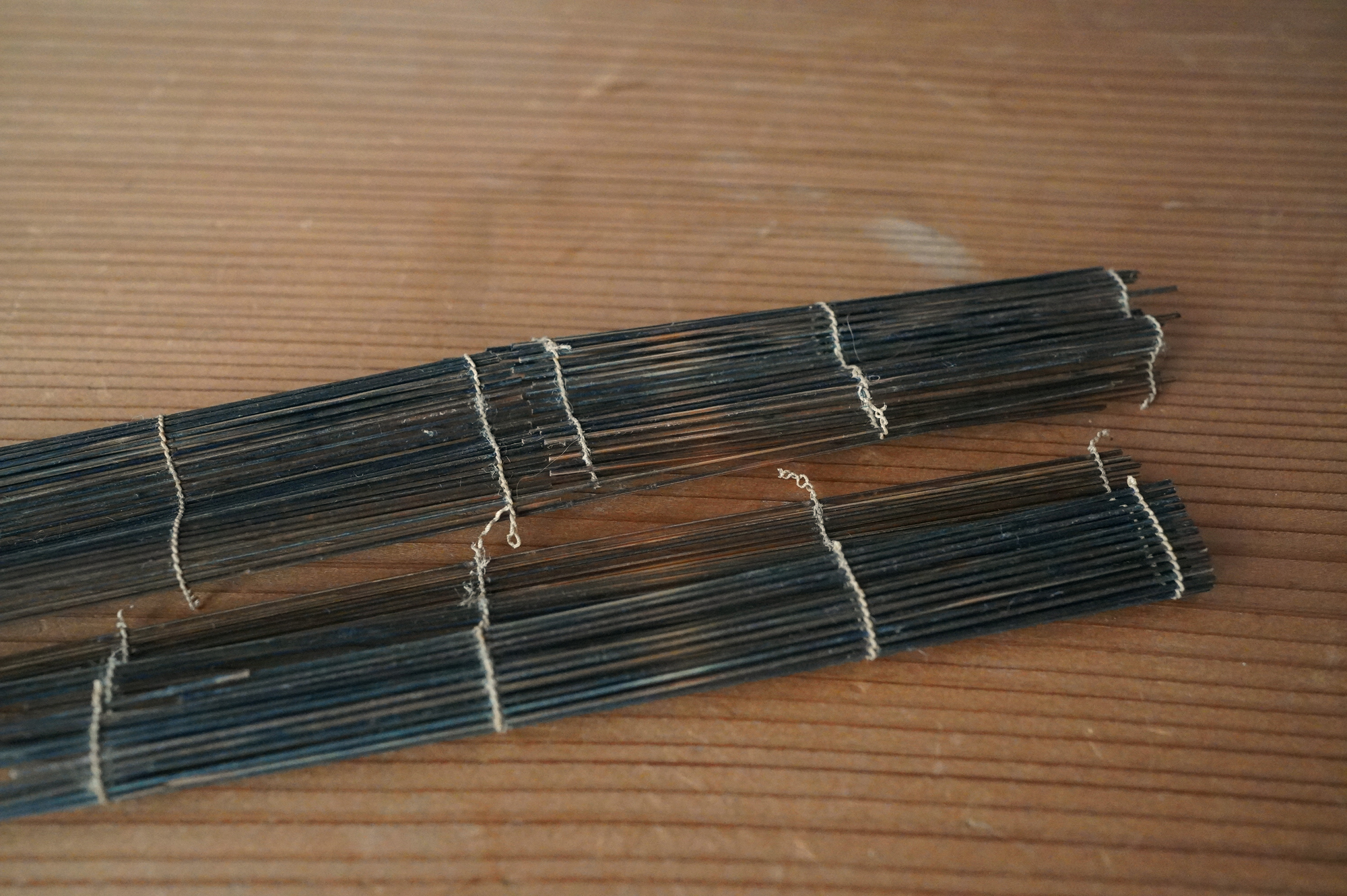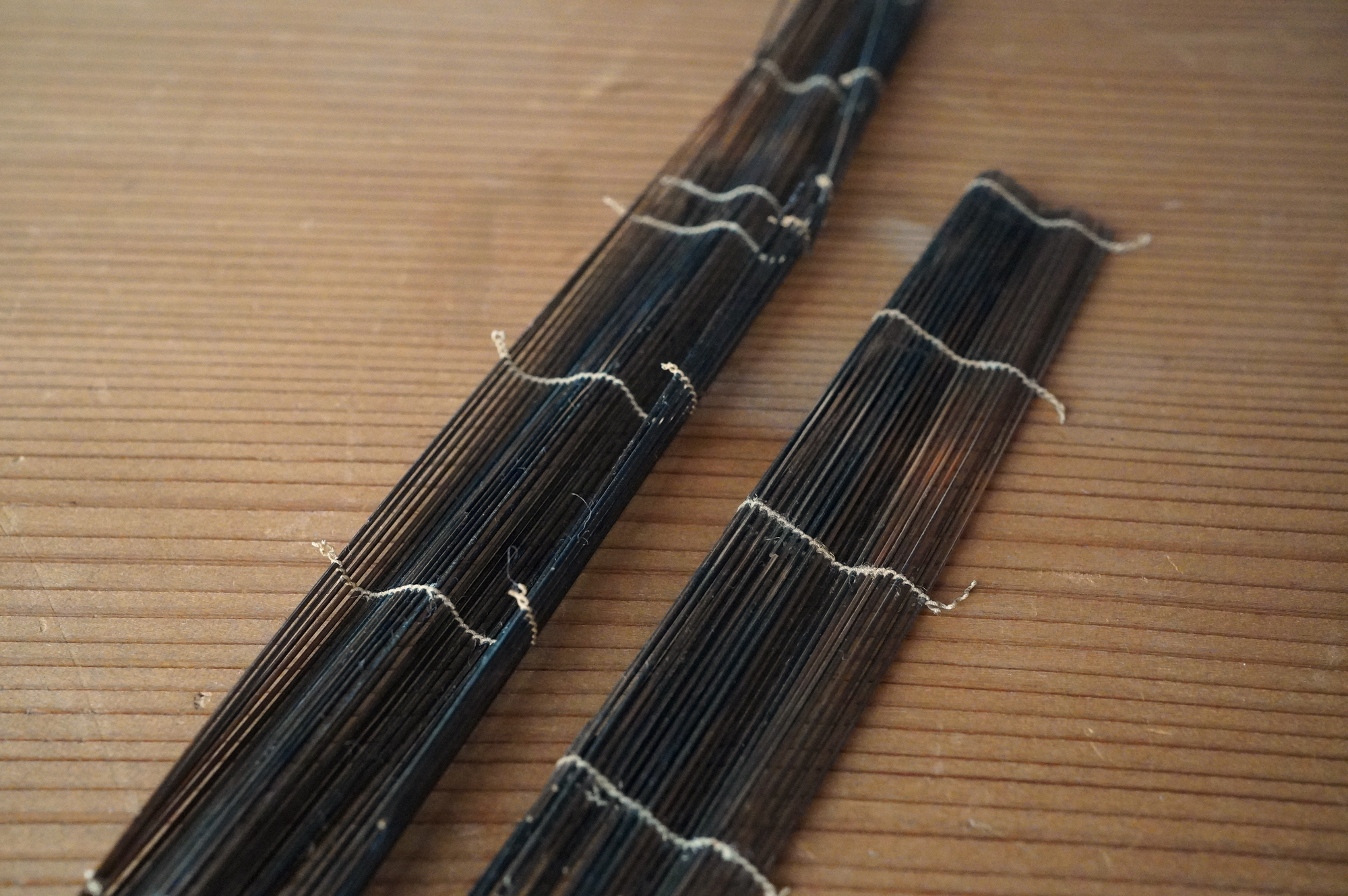 極細の竹籤を糸で繋げた簾状のものは、「経帙(きょうちつ)」すなわちお経を巻いて納めていたものの一部であると考えています。