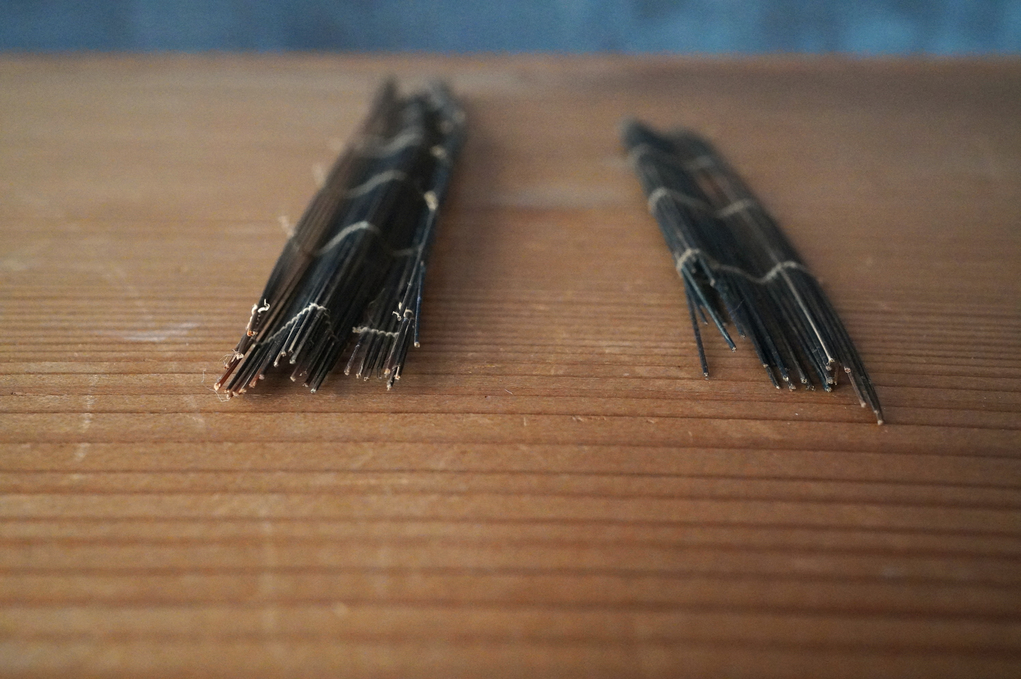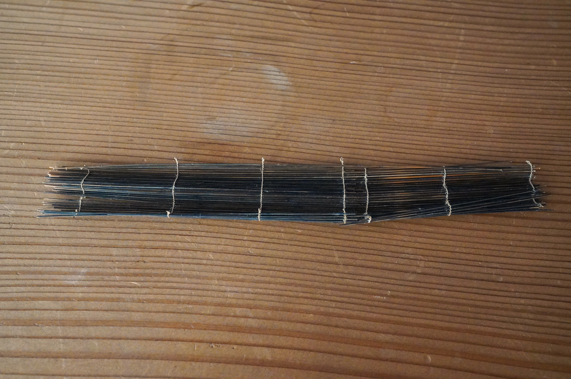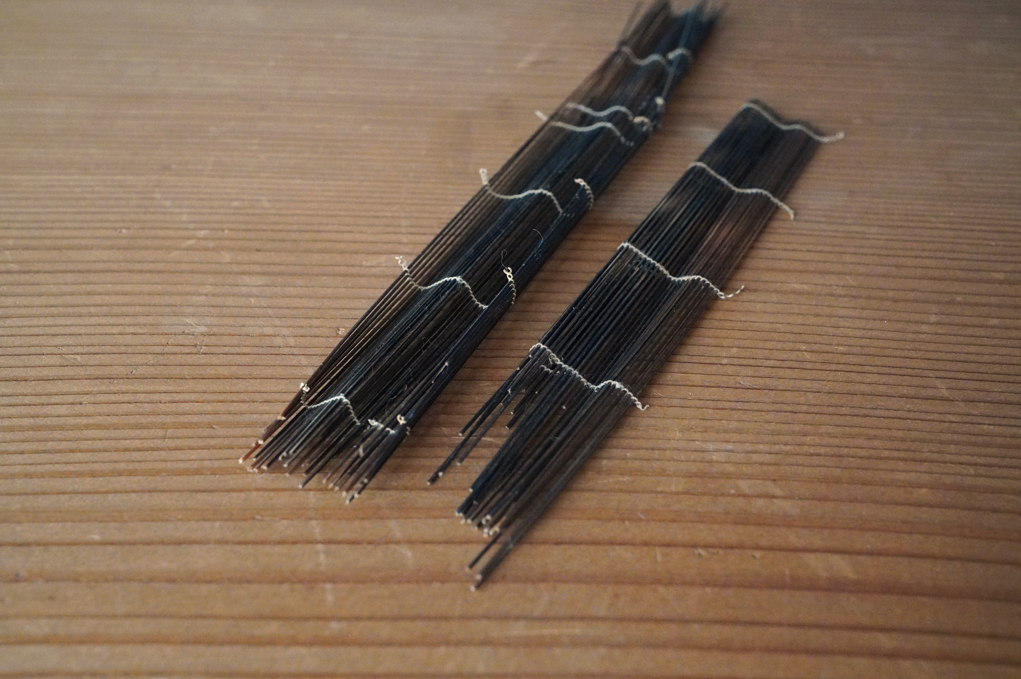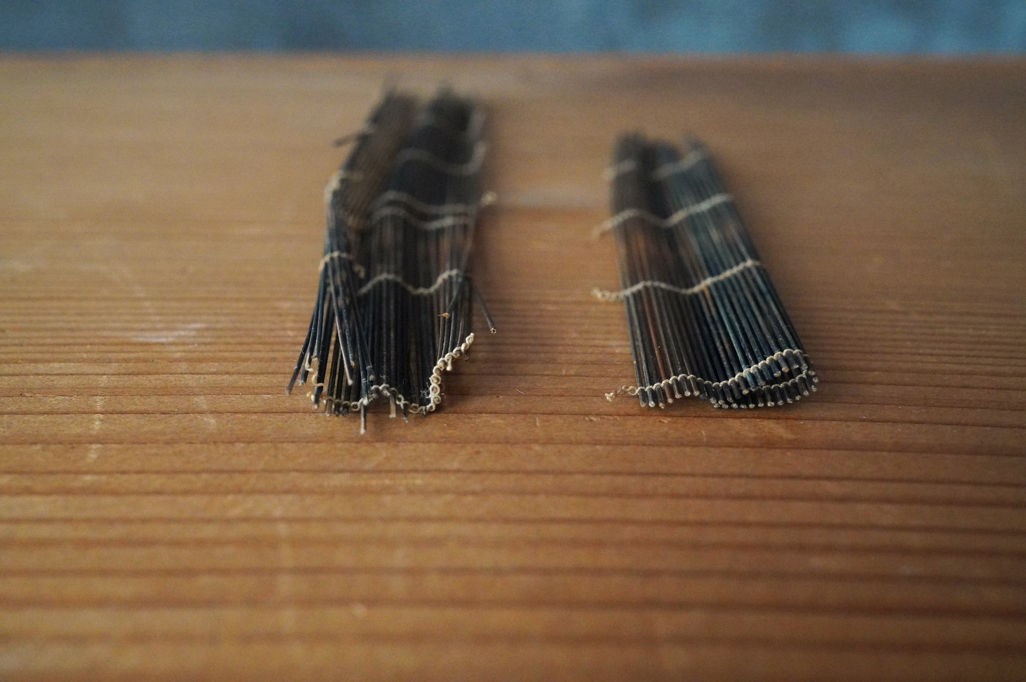 極細の竹籤を糸で繋げた簾状のものは、「経帙(きょうちつ)」すなわちお経を巻いて納めていたものの一部であると考えています。
