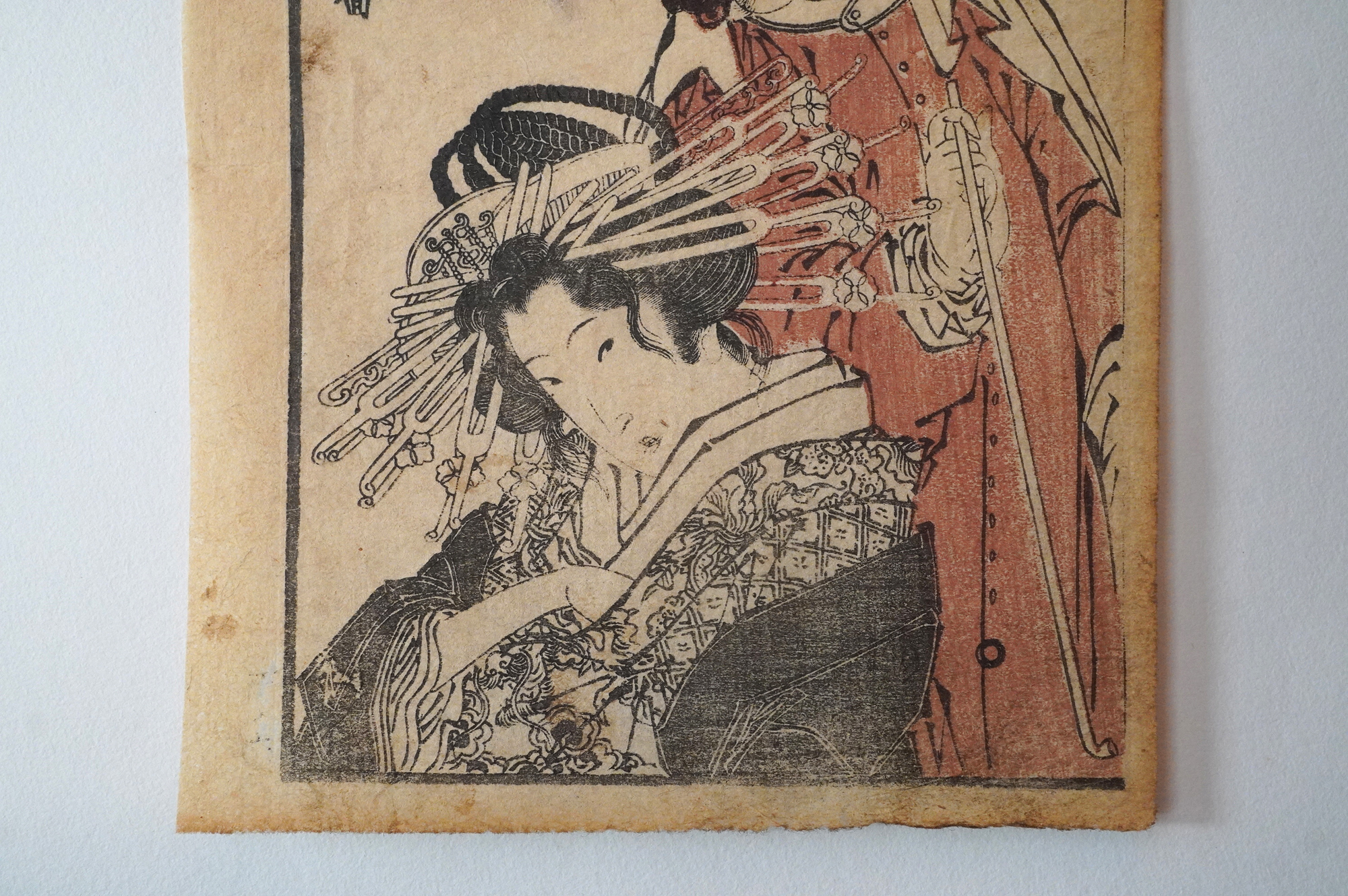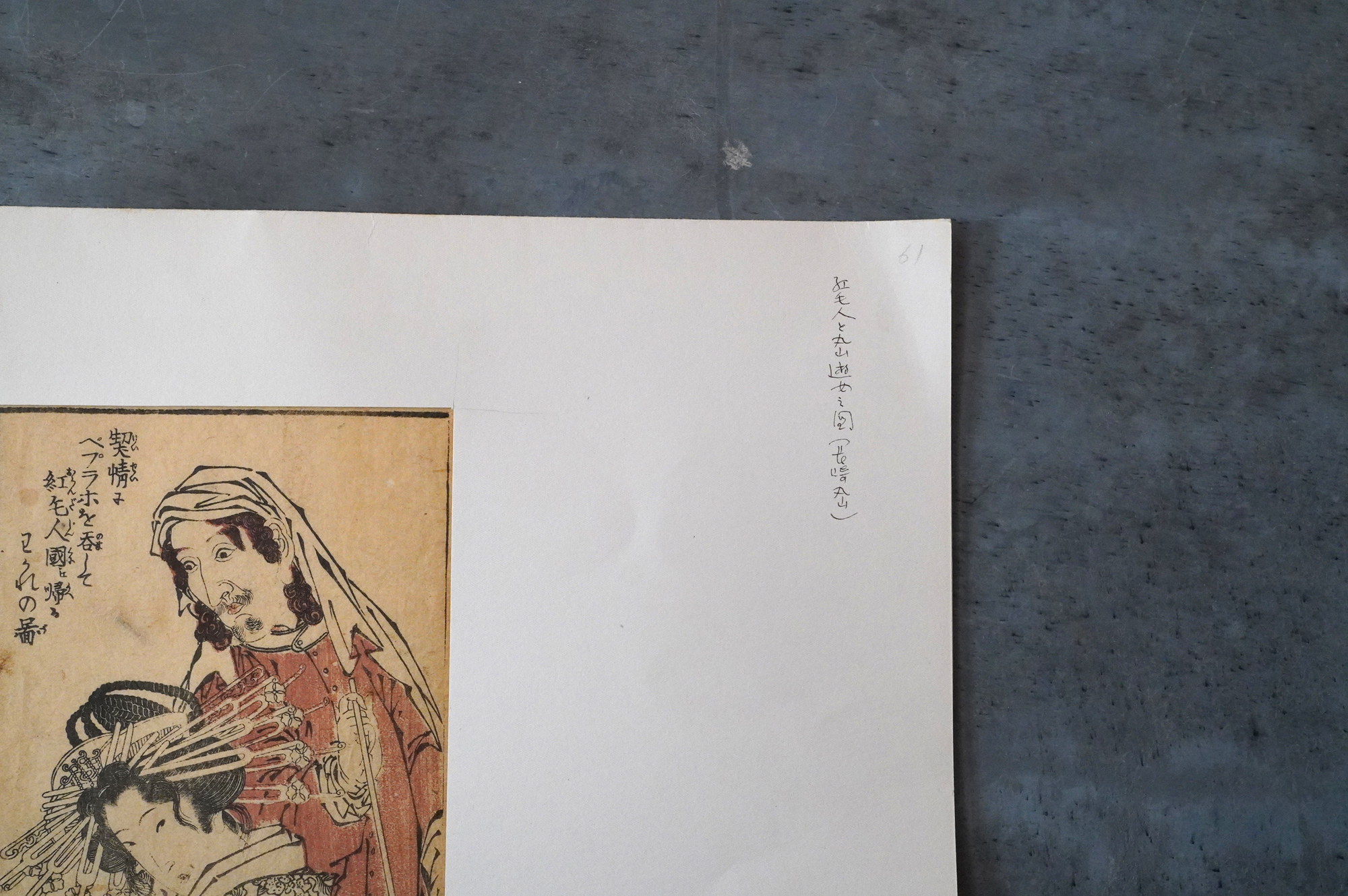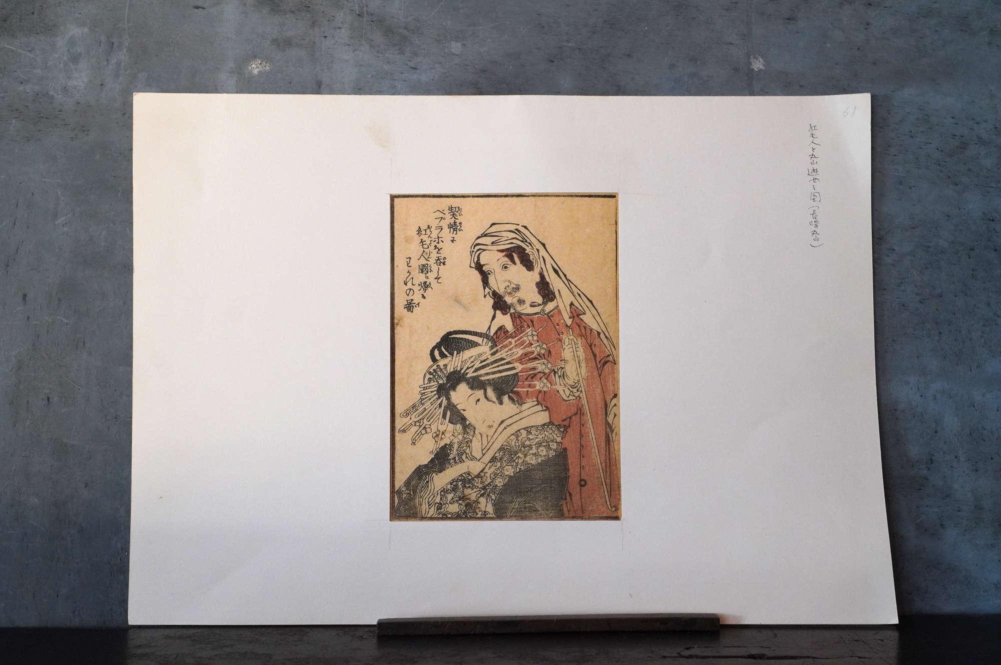 近世日本における欧風文化を研究家として著名な茅原元一郎氏旧蔵の色摺。昭和31年に三重県立博物館で開催された茅原コレクション「近世欧風文化展」で展示された現品となります。鎖国下において、外国人と会いことが許され、遊郭外への外出が許されたりなどと他の遊郭とは異なる環境であったことが垣間見れる貴重な資料の一つではないでしょうか。