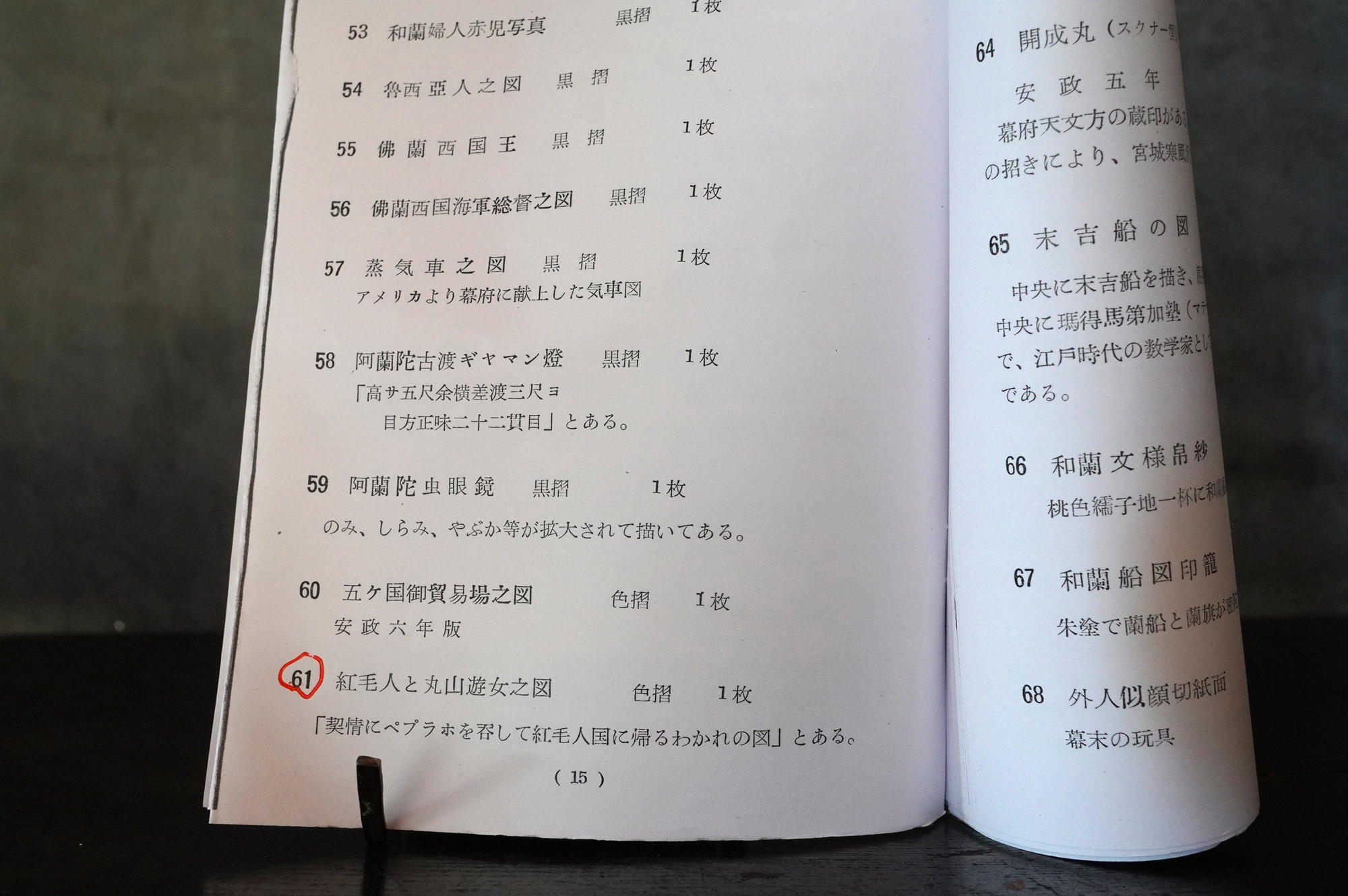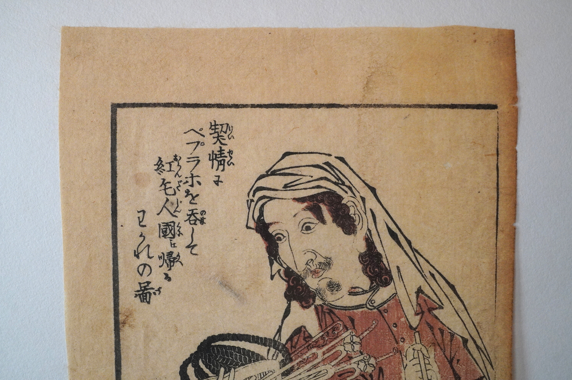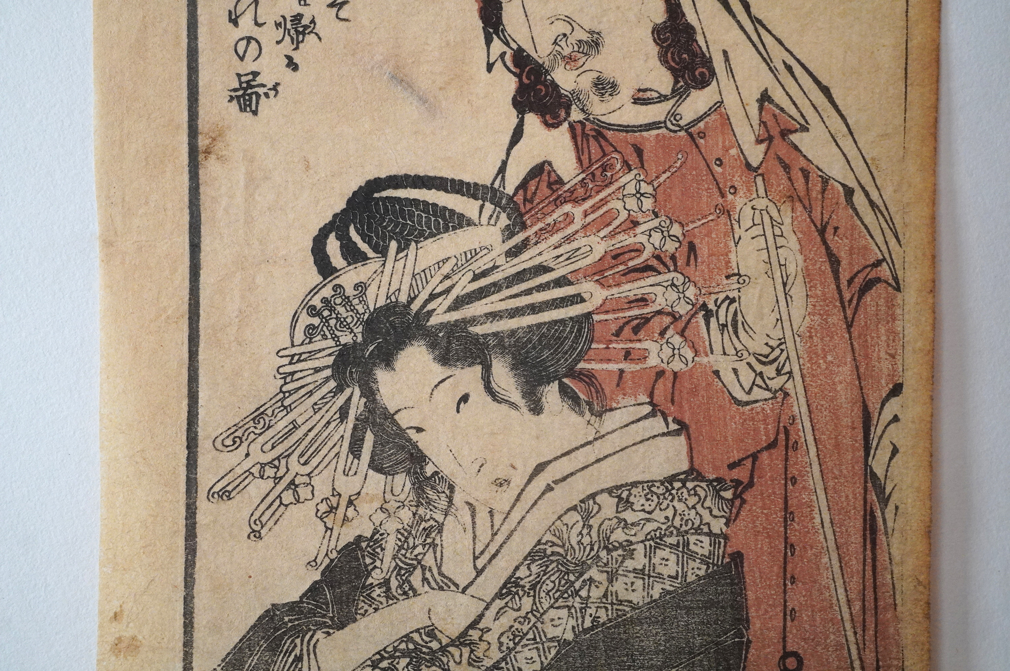 近世日本における欧風文化を研究家として著名な茅原元一郎氏旧蔵の色摺。昭和31年に三重県立博物館で開催された茅原コレクション「近世欧風文化展」で展示された現品となります。鎖国下において、外国人と会いことが許され、遊郭外への外出が許されたりなどと他の遊郭とは異なる環境であったことが垣間見れる貴重な資料の一つではないでしょうか。