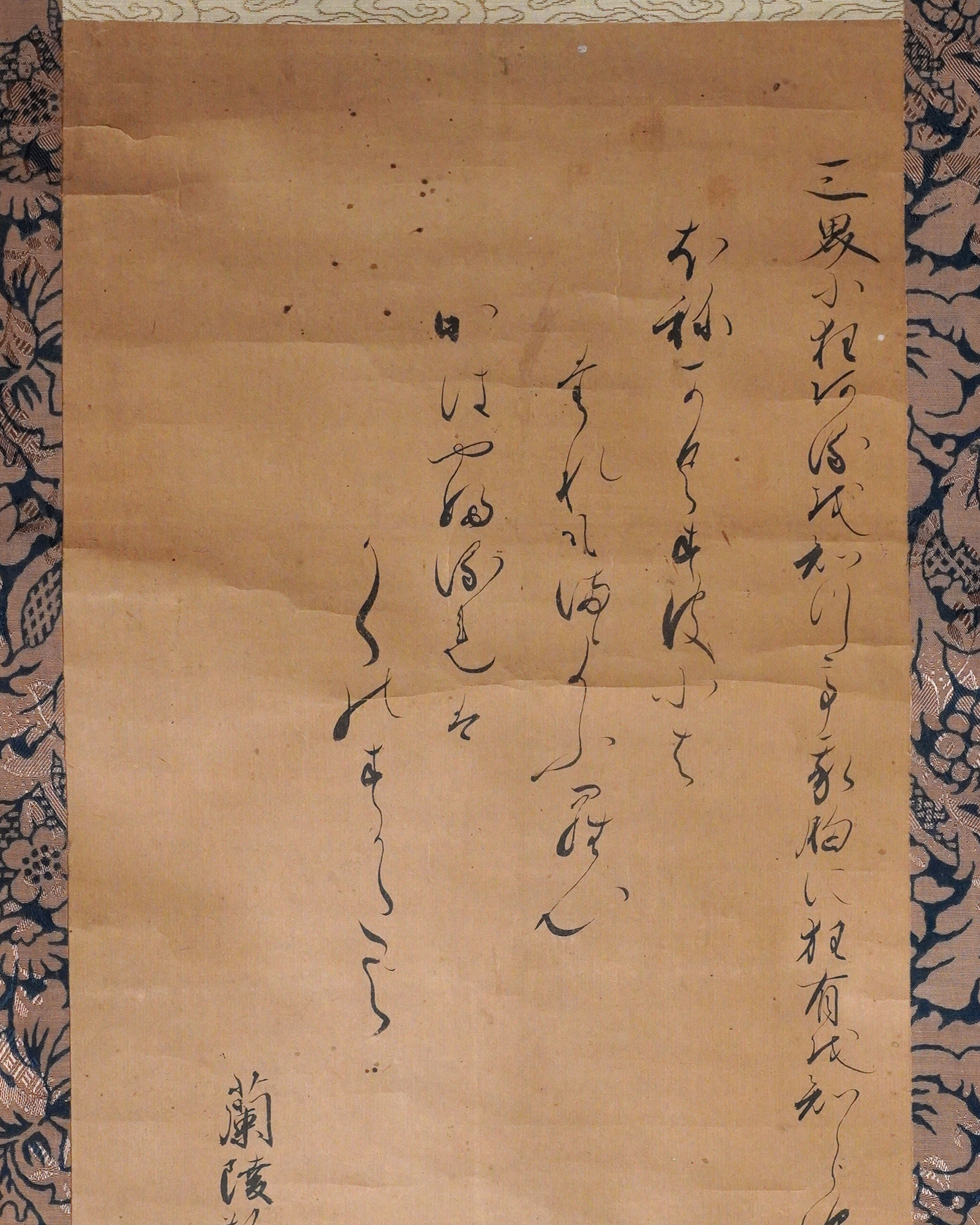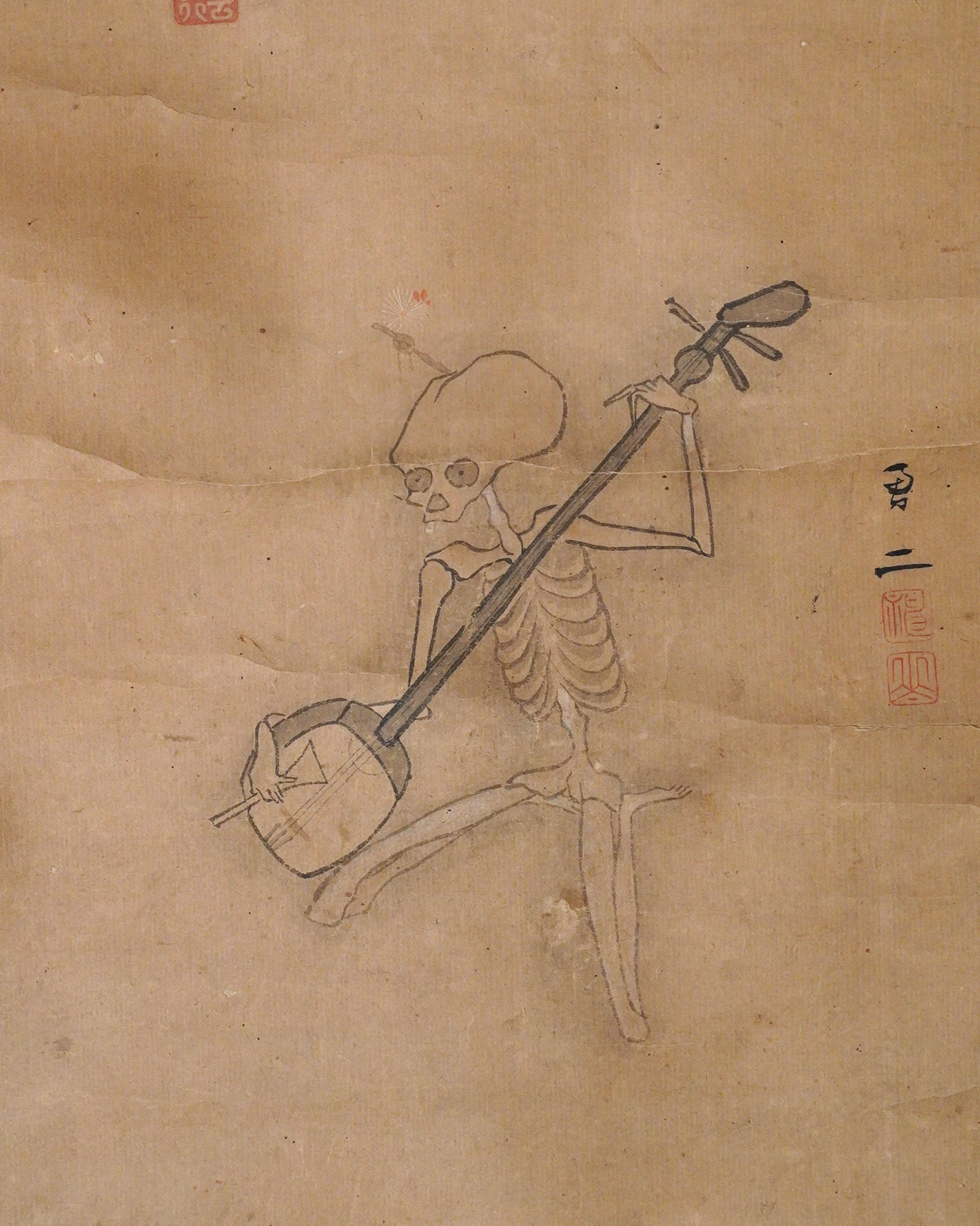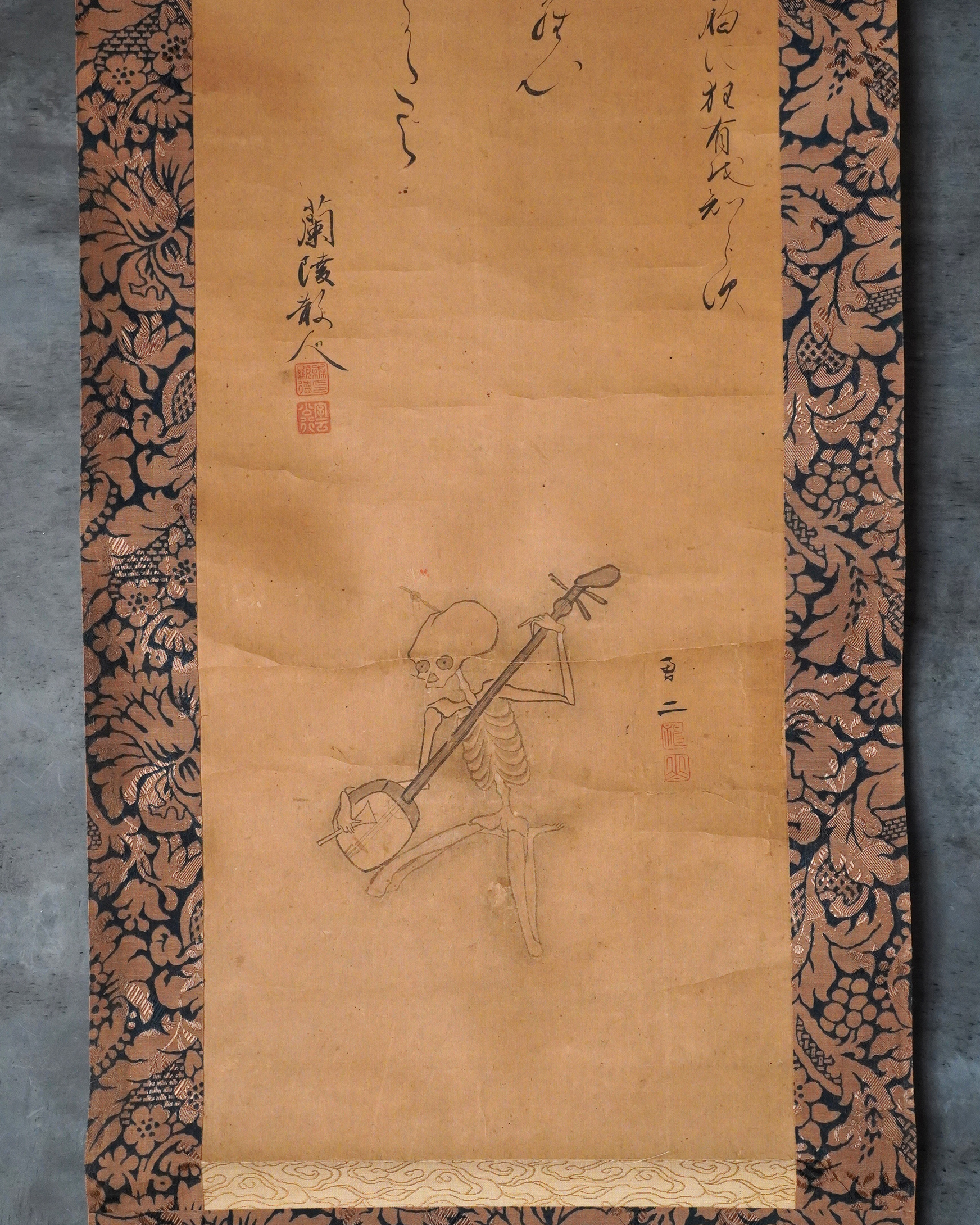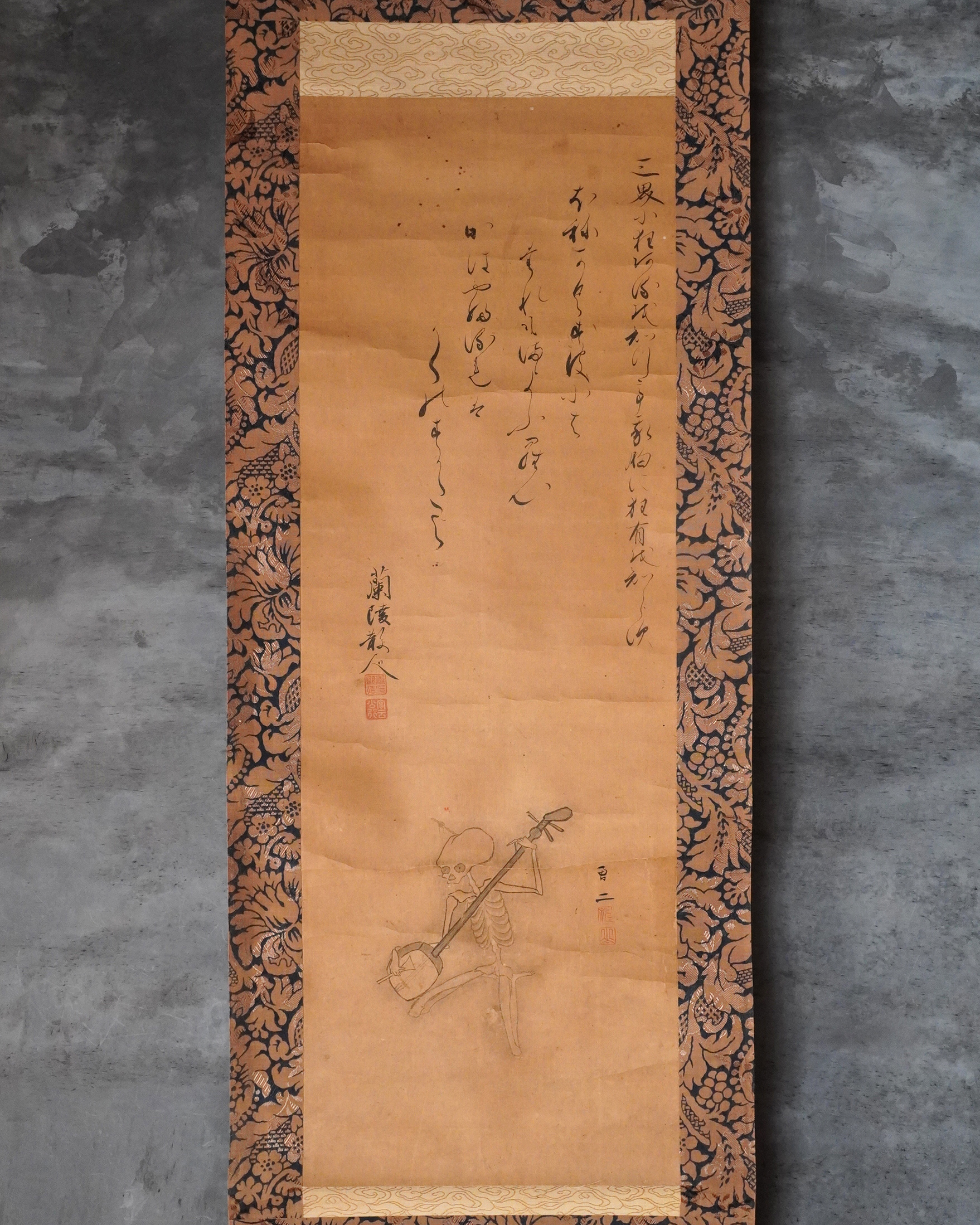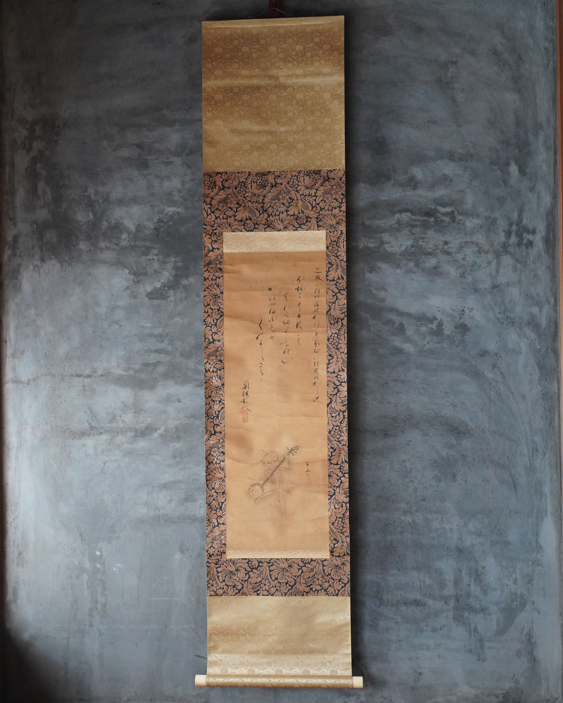 骸骨が三味線を奏でる興味深い図。銘はございますが当方浅学につき、画・賛ともに詳細なことはわかりません。しかしながら、三味線を弾く骸骨の姿には、時代を超えて人の心を惹きつける魅力があり、現代の感覚に照らしても斬新さを失わず、洒脱な意匠として映ります。意匠性の高さは、仮に現代のTシャツの図柄として用いられたとしても違和感なく受け入れられそうです。素直に「格好良い」と感じさせる力がございます。