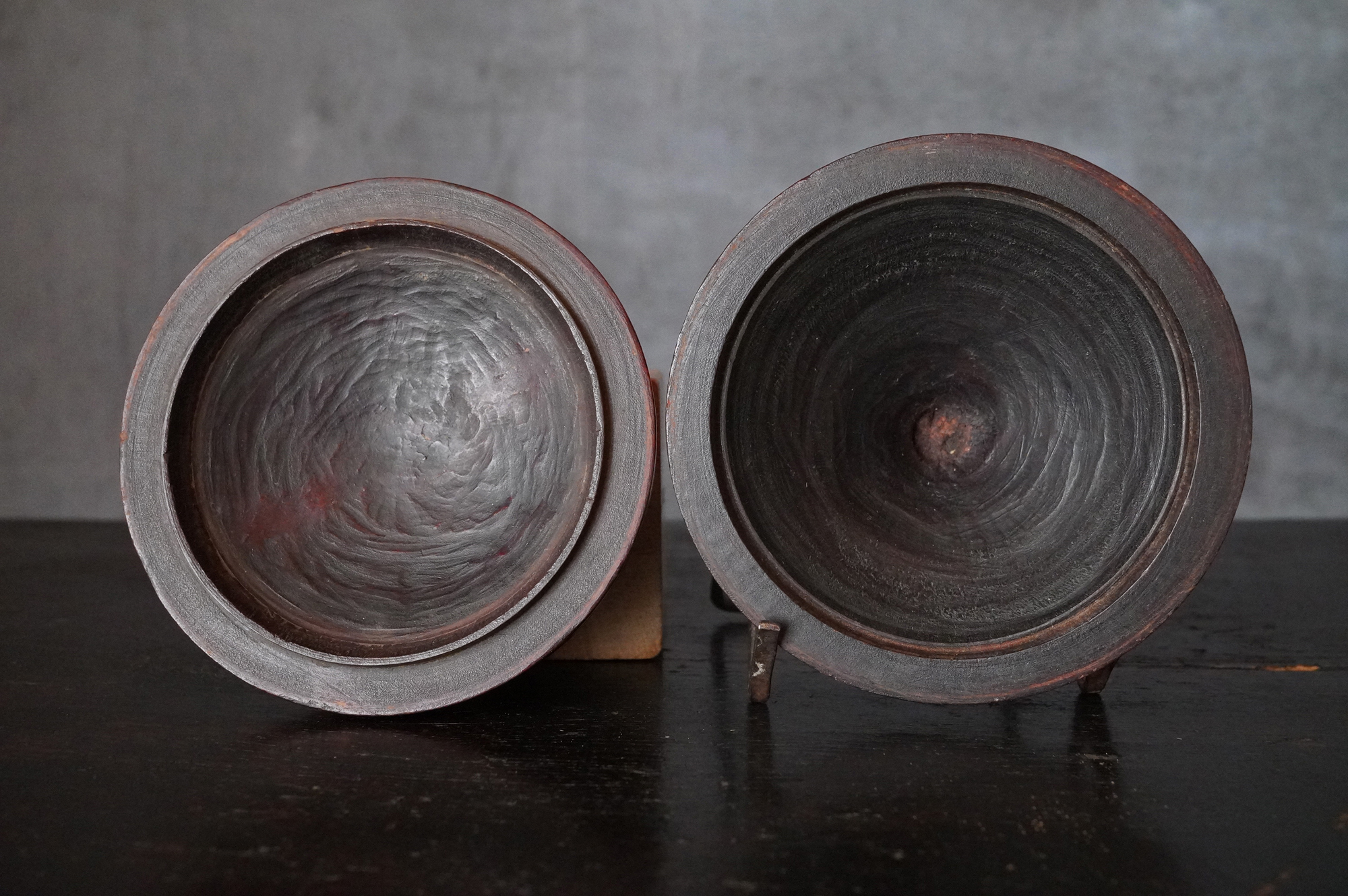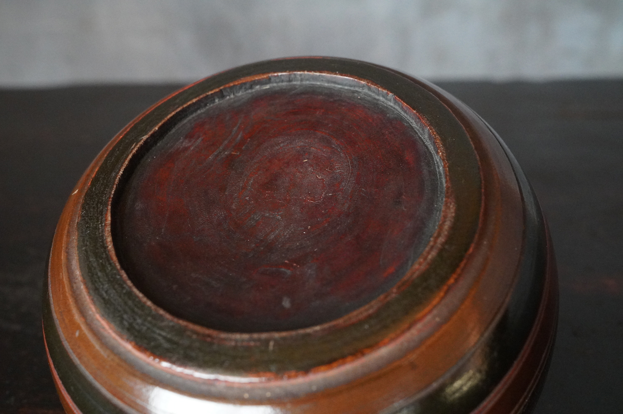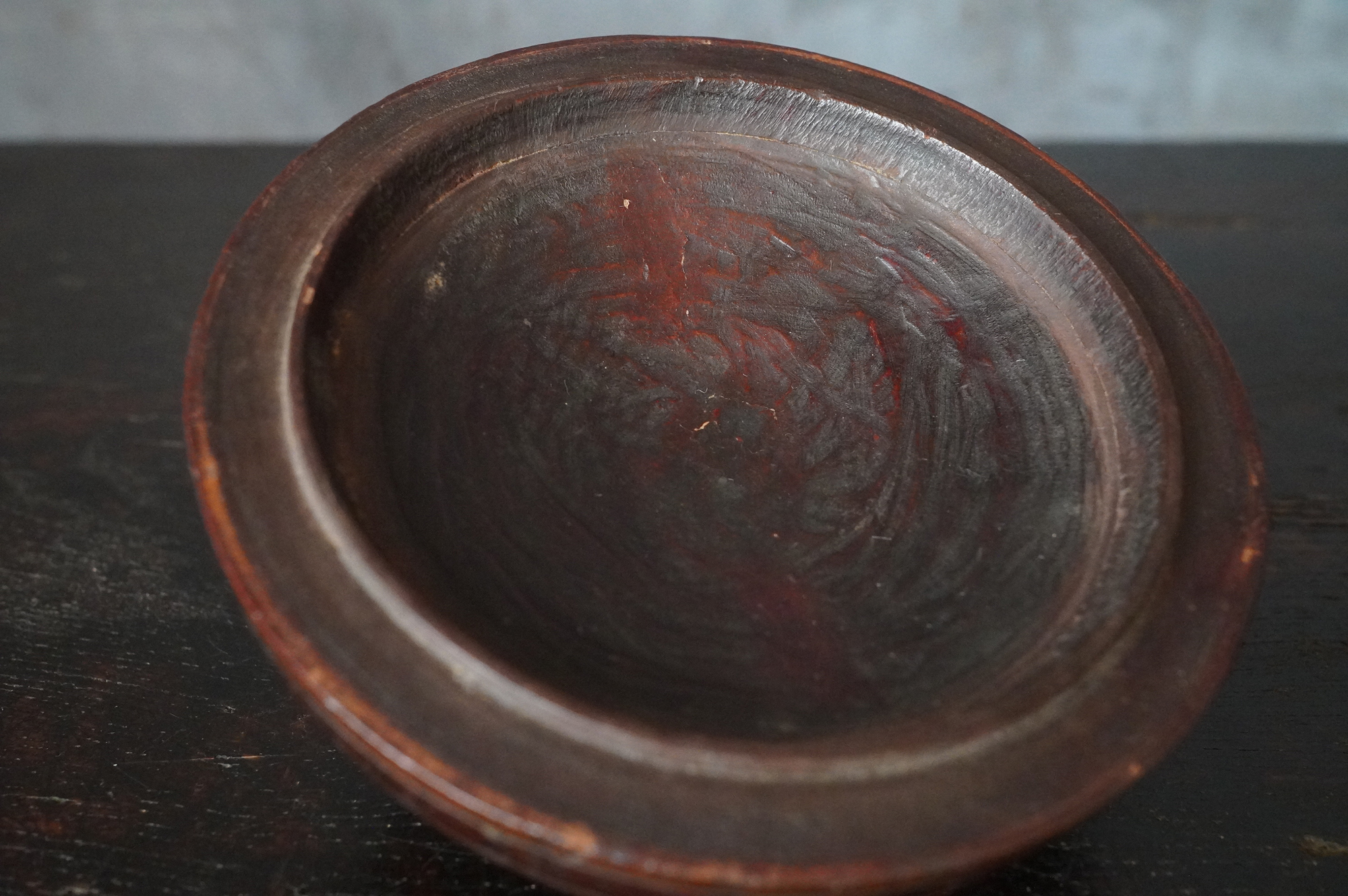 本品は、やや大振りの作りで、内部の鑿跡や彫り出しの趣は日本の轆轤挽きとは明らかに異なり、大陸系の技法をよく示すものと判断してよいでしょう。箱こそ欠きますが、全体に古格が備わり、漆の風合い・木味ともに良く魅力ある品です。時代は16〜17世紀頃と考えます。