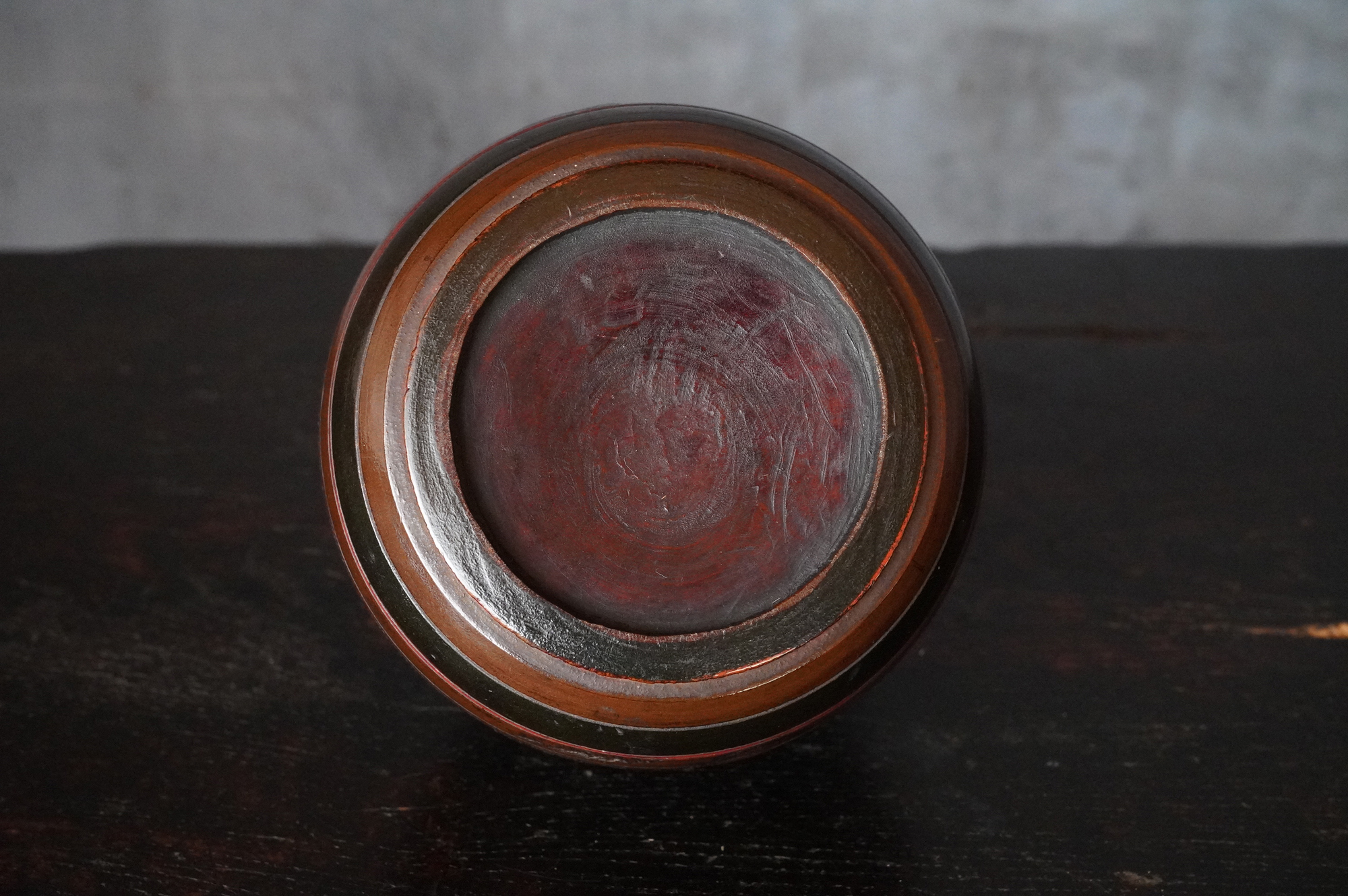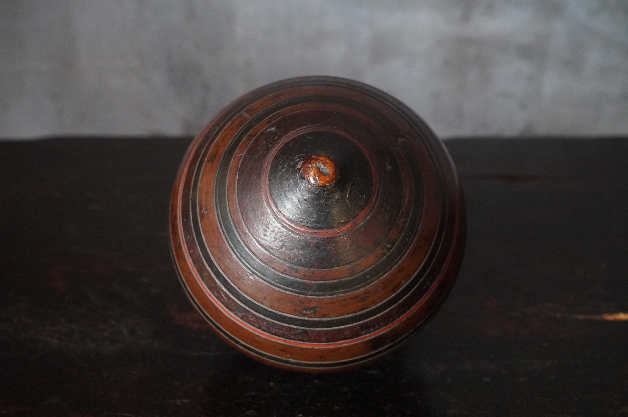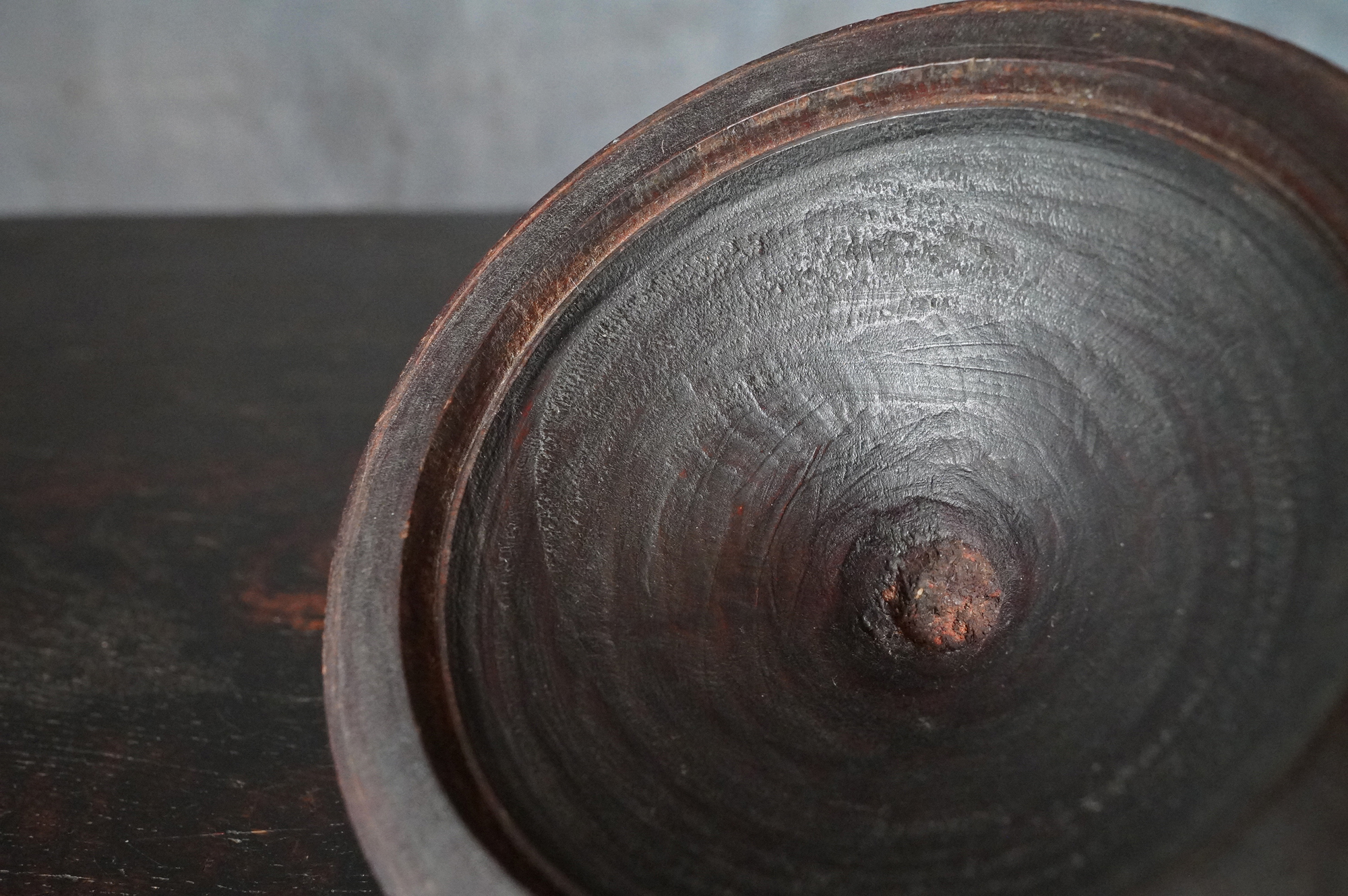 本品は、やや大振りの作りで、内部の鑿跡や彫り出しの趣は日本の轆轤挽きとは明らかに異なり、大陸系の技法をよく示すものと判断してよいでしょう。箱こそ欠きますが、全体に古格が備わり、漆の風合い・木味ともに良く魅力ある品です。時代は16〜17世紀頃と考えます。