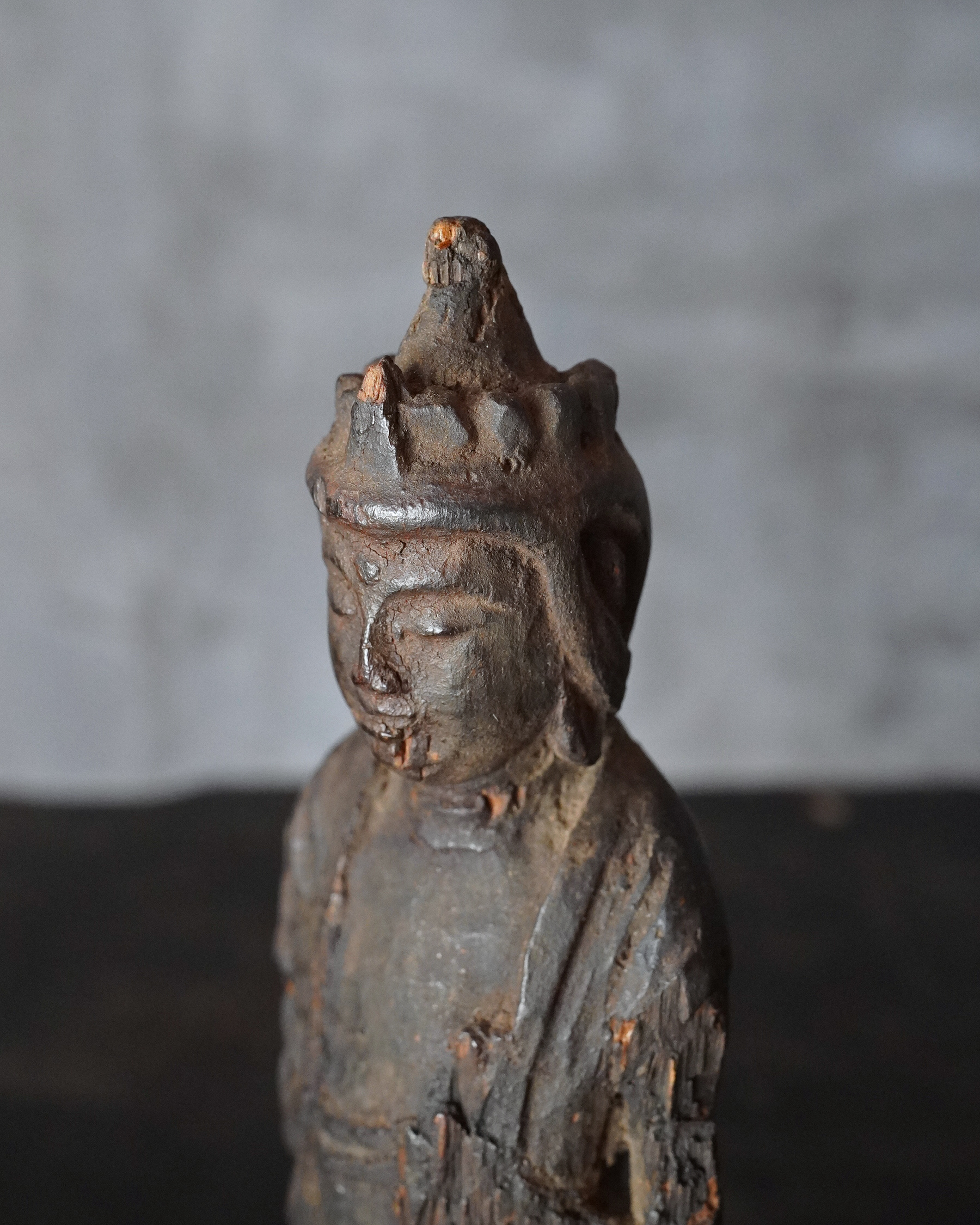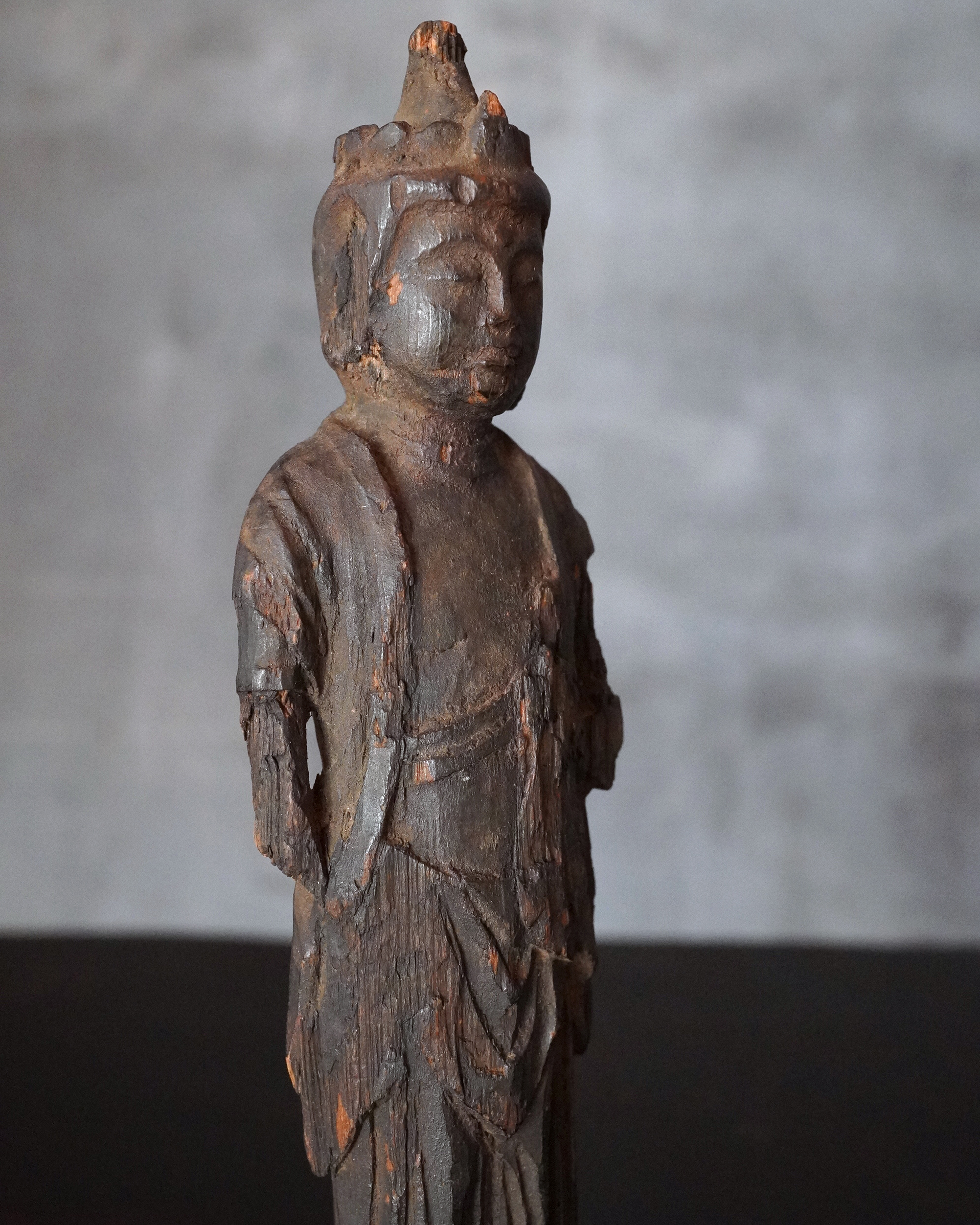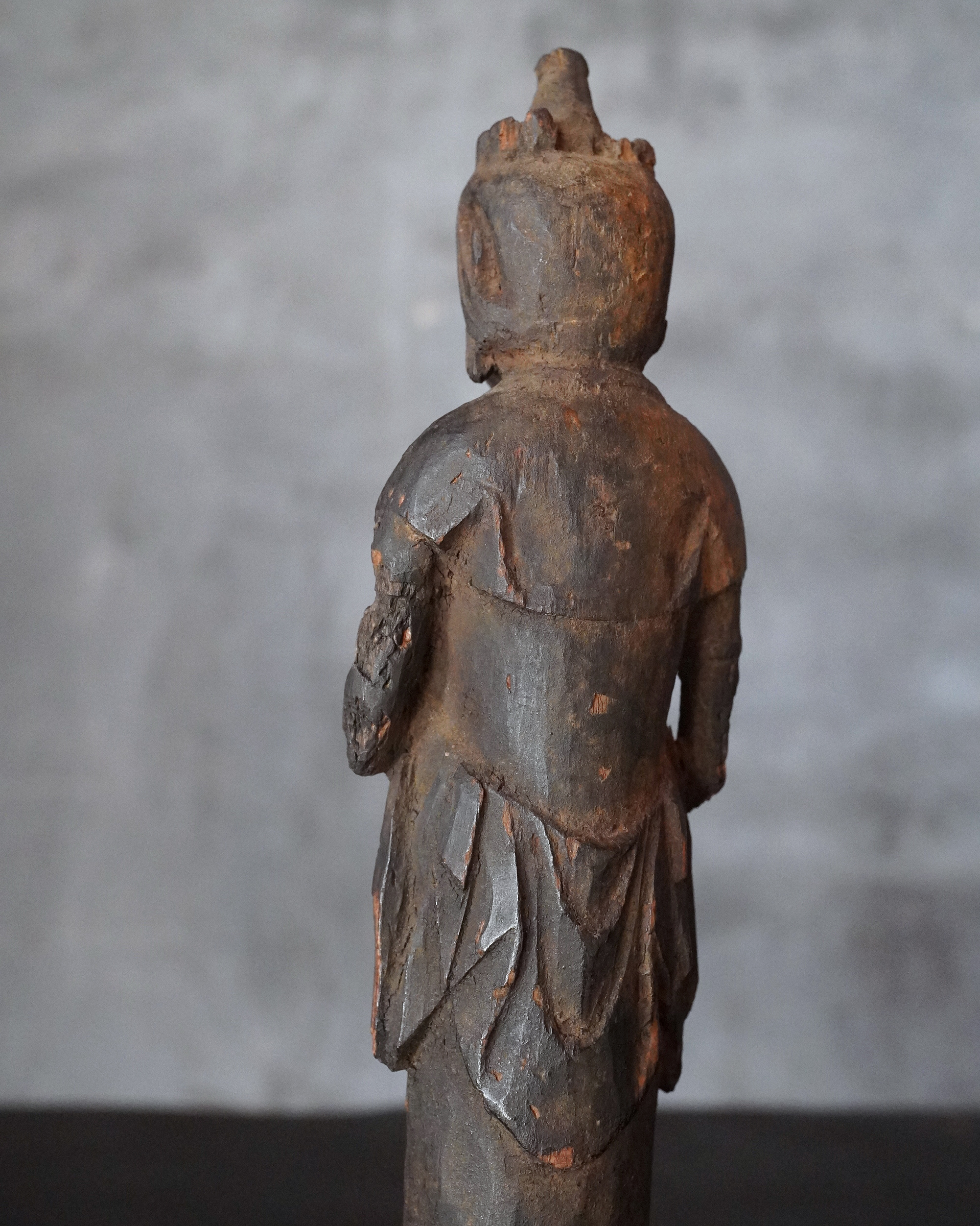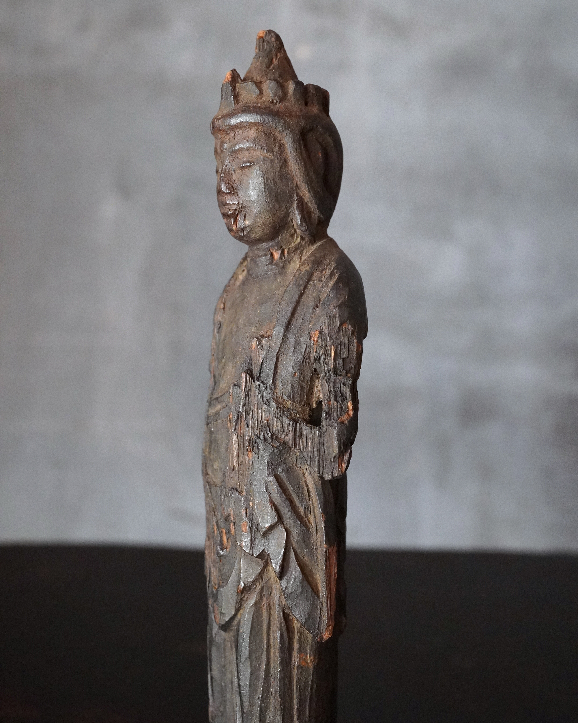 全体の状態こそ経年による傷みが見られますが、その佇まいには時代を経た木彫仏ならではの気品が漂い、非常に端正な立ち姿を保っております。頭上の表現は一見すると宝冠風にも見受けられますが、造形の特徴から十一面観音としての可能性が高いと考えられます。