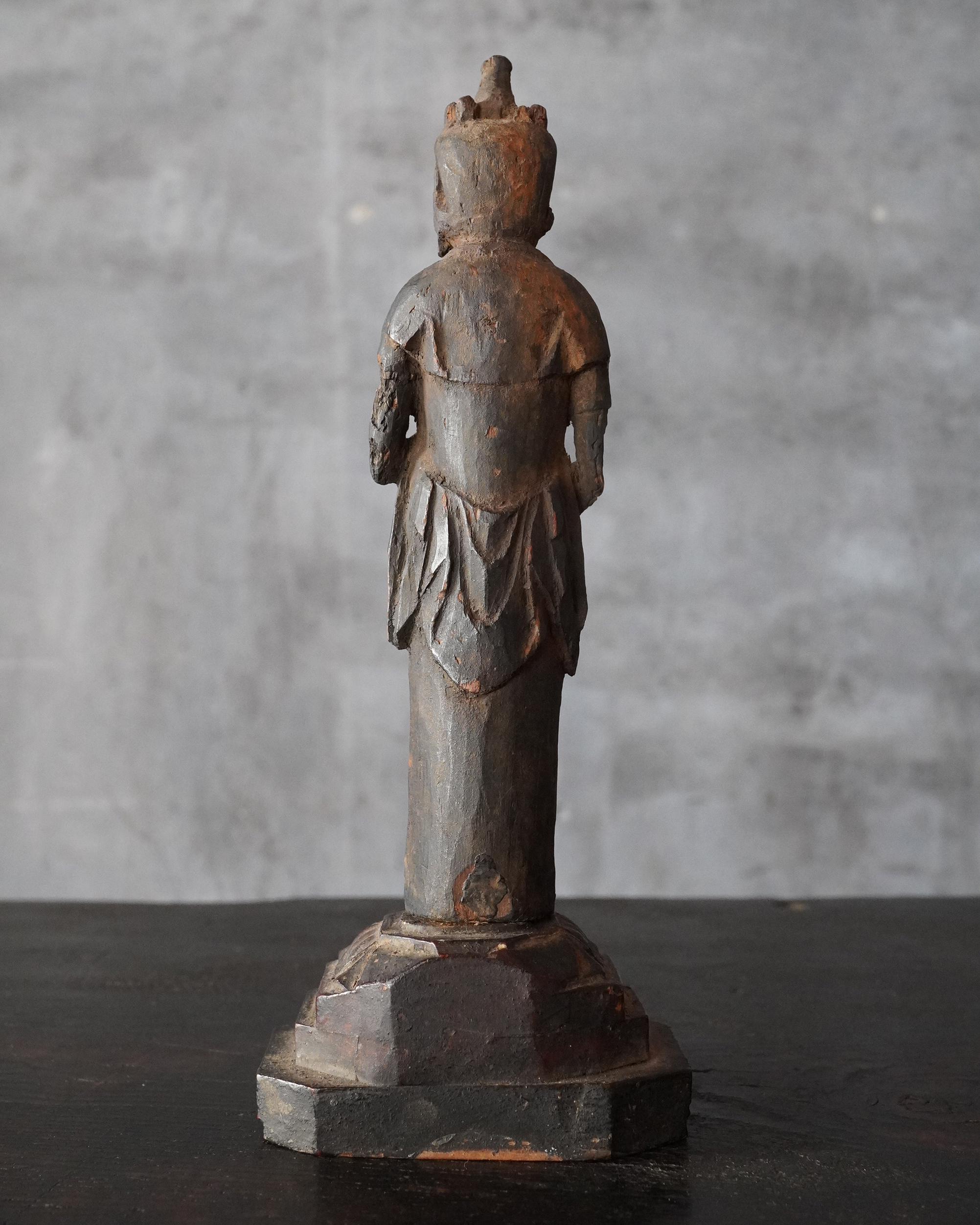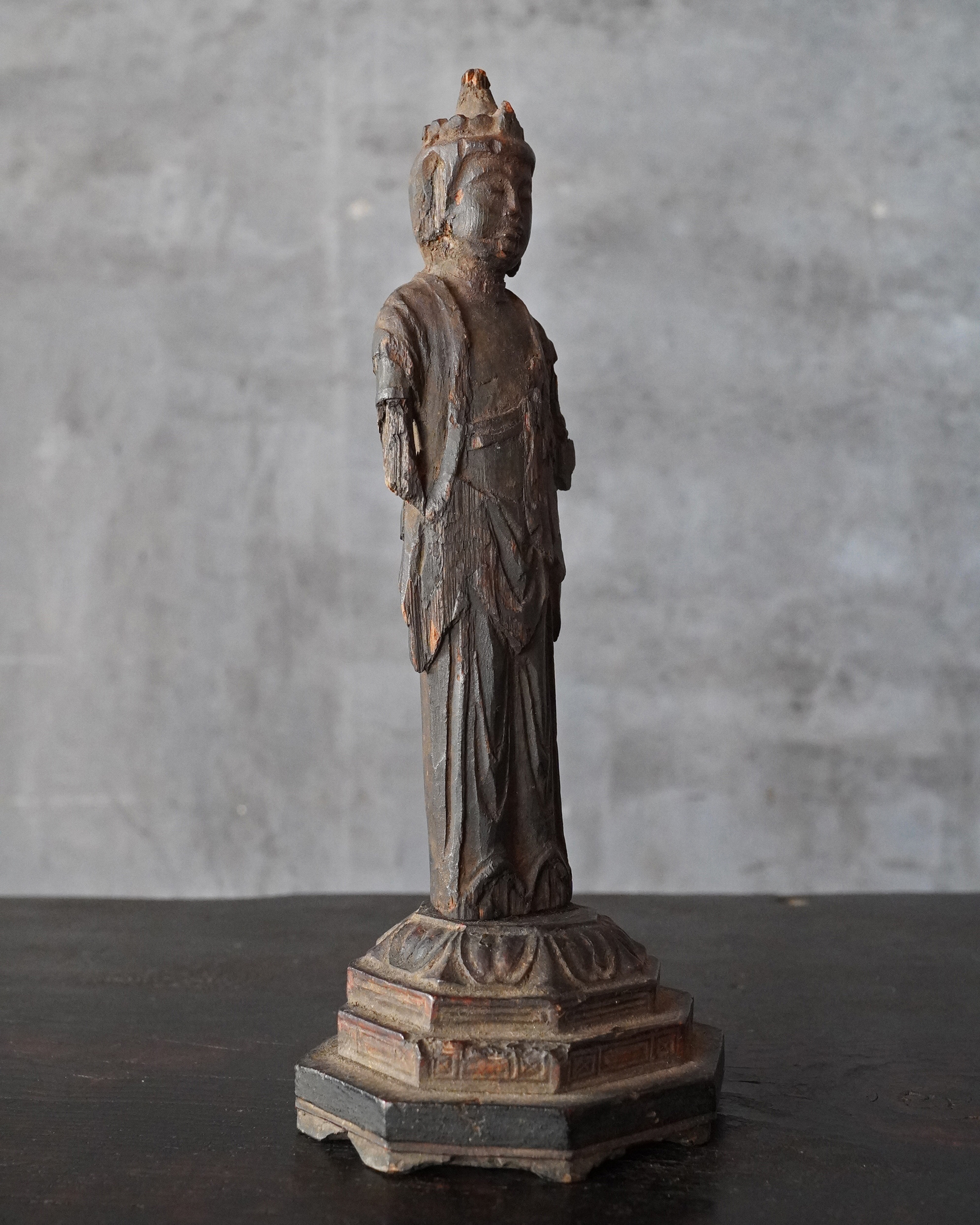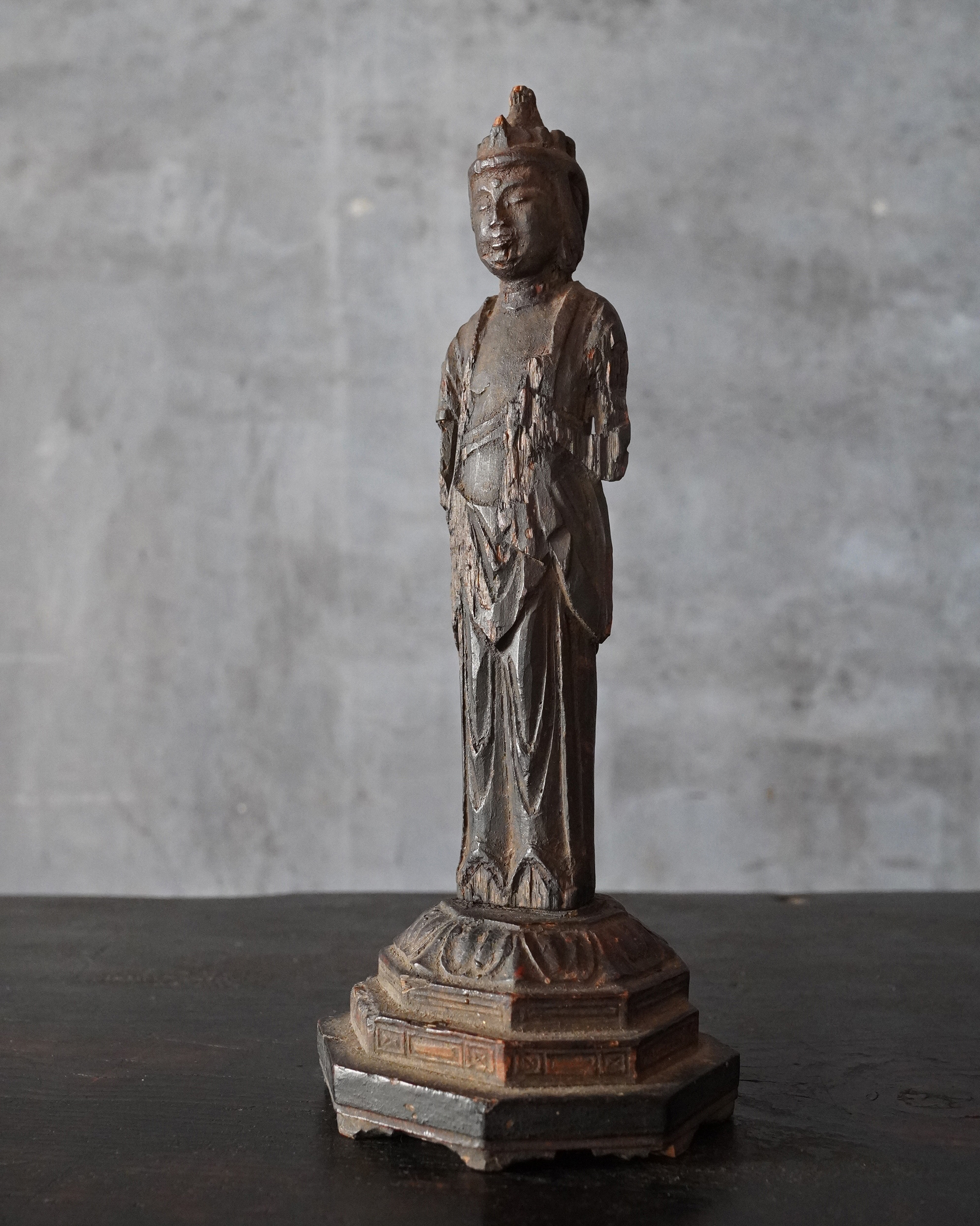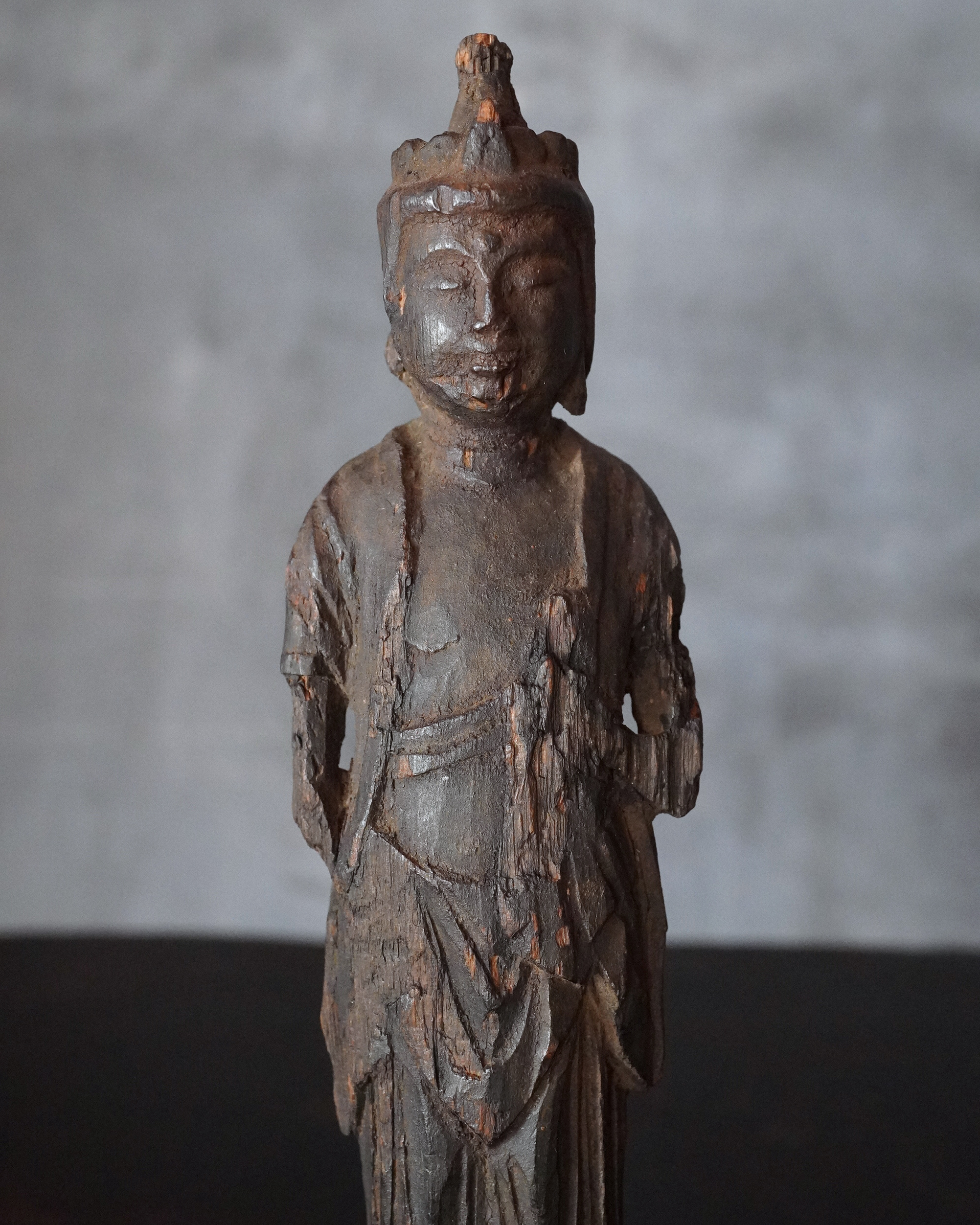 全体の状態こそ経年による傷みが見られますが、その佇まいには時代を経た木彫仏ならではの気品が漂い、非常に端正な立ち姿を保っております。頭上の表現は一見すると宝冠風にも見受けられますが、造形の特徴から十一面観音としての可能性が高いと考えられます。
