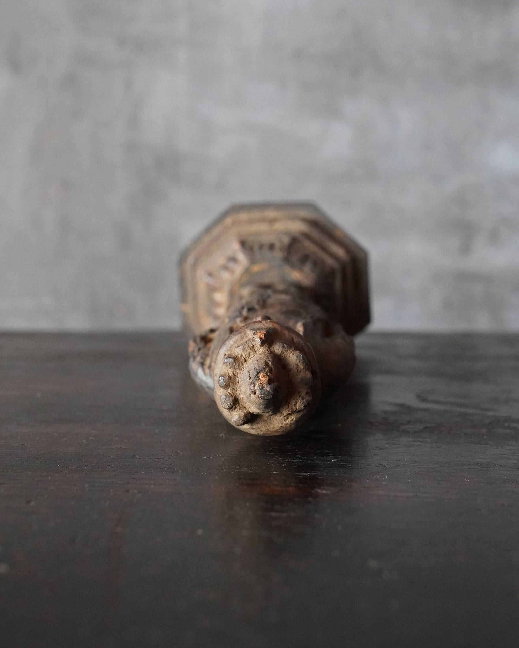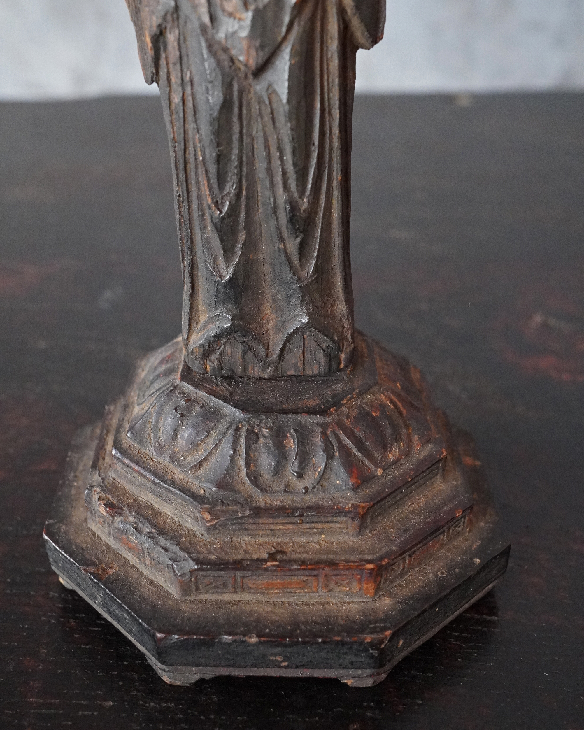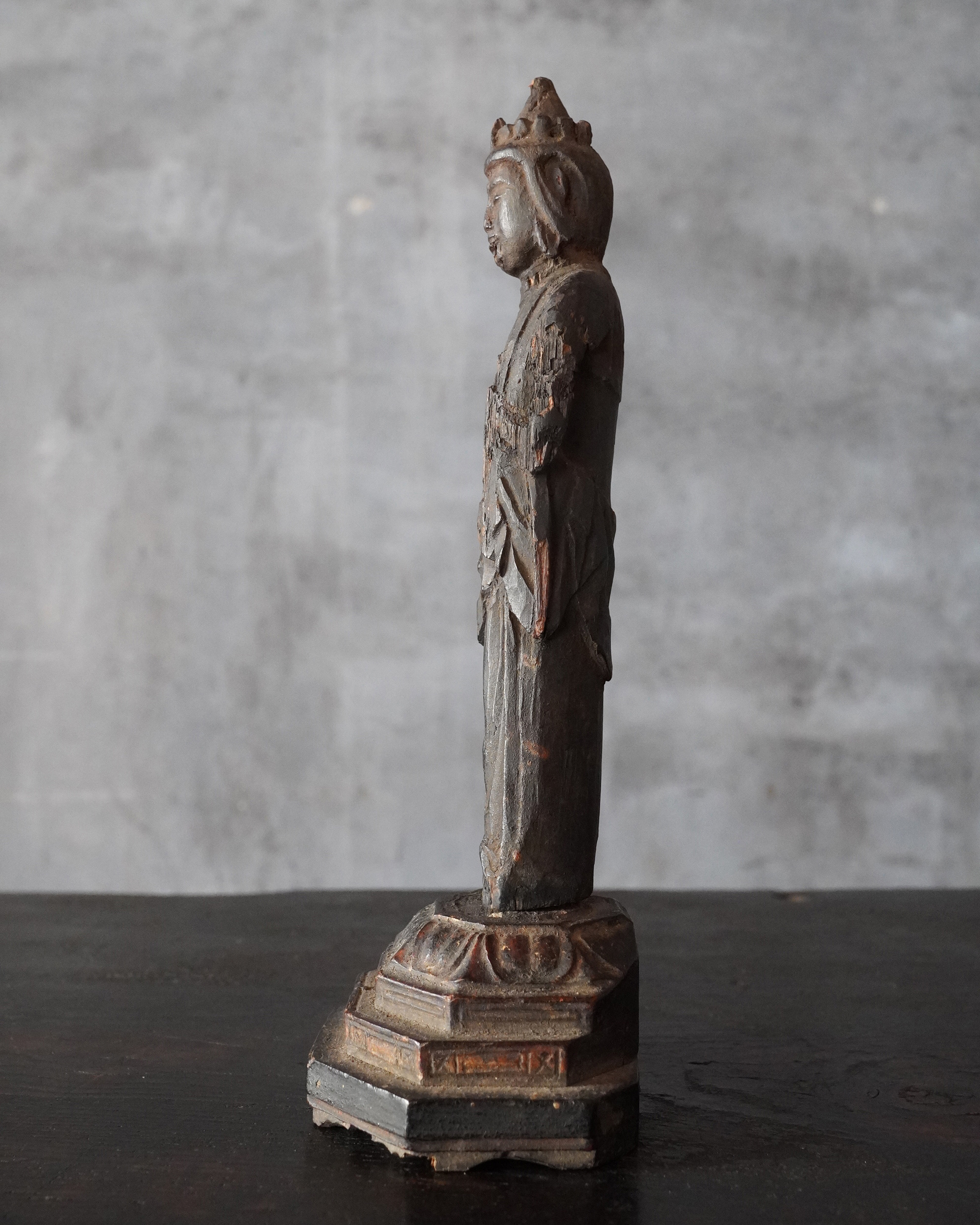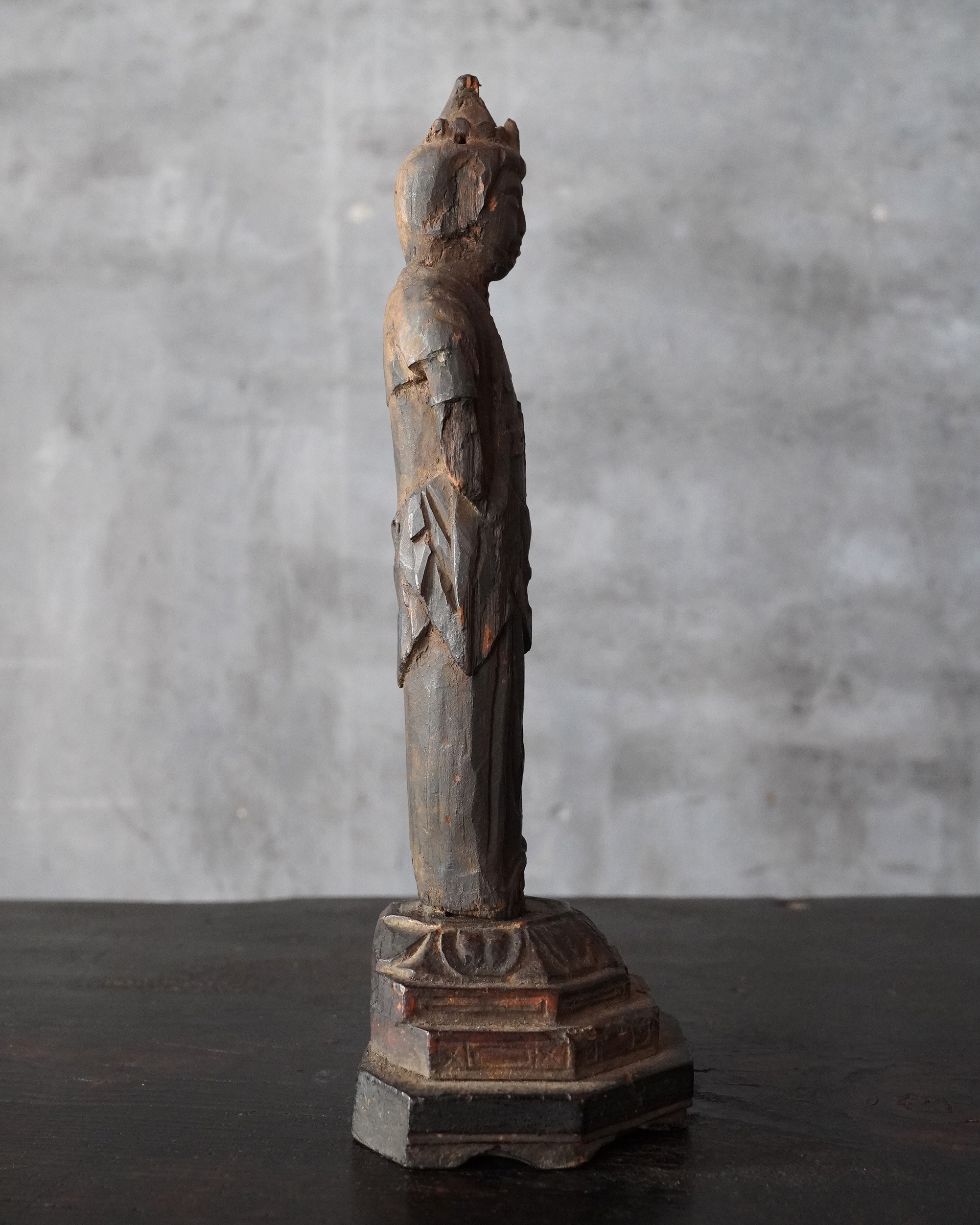 全体の状態こそ経年による傷みが見られますが、その佇まいには時代を経た木彫仏ならではの気品が漂い、非常に端正な立ち姿を保っております。頭上の表現は一見すると宝冠風にも見受けられますが、造形の特徴から十一面観音としての可能性が高いと考えられます。