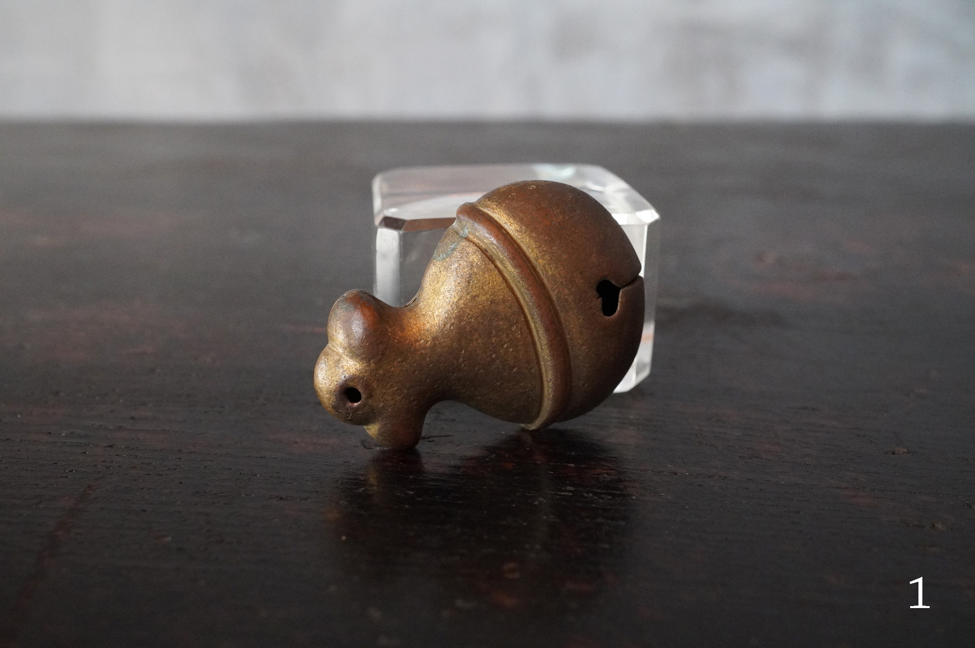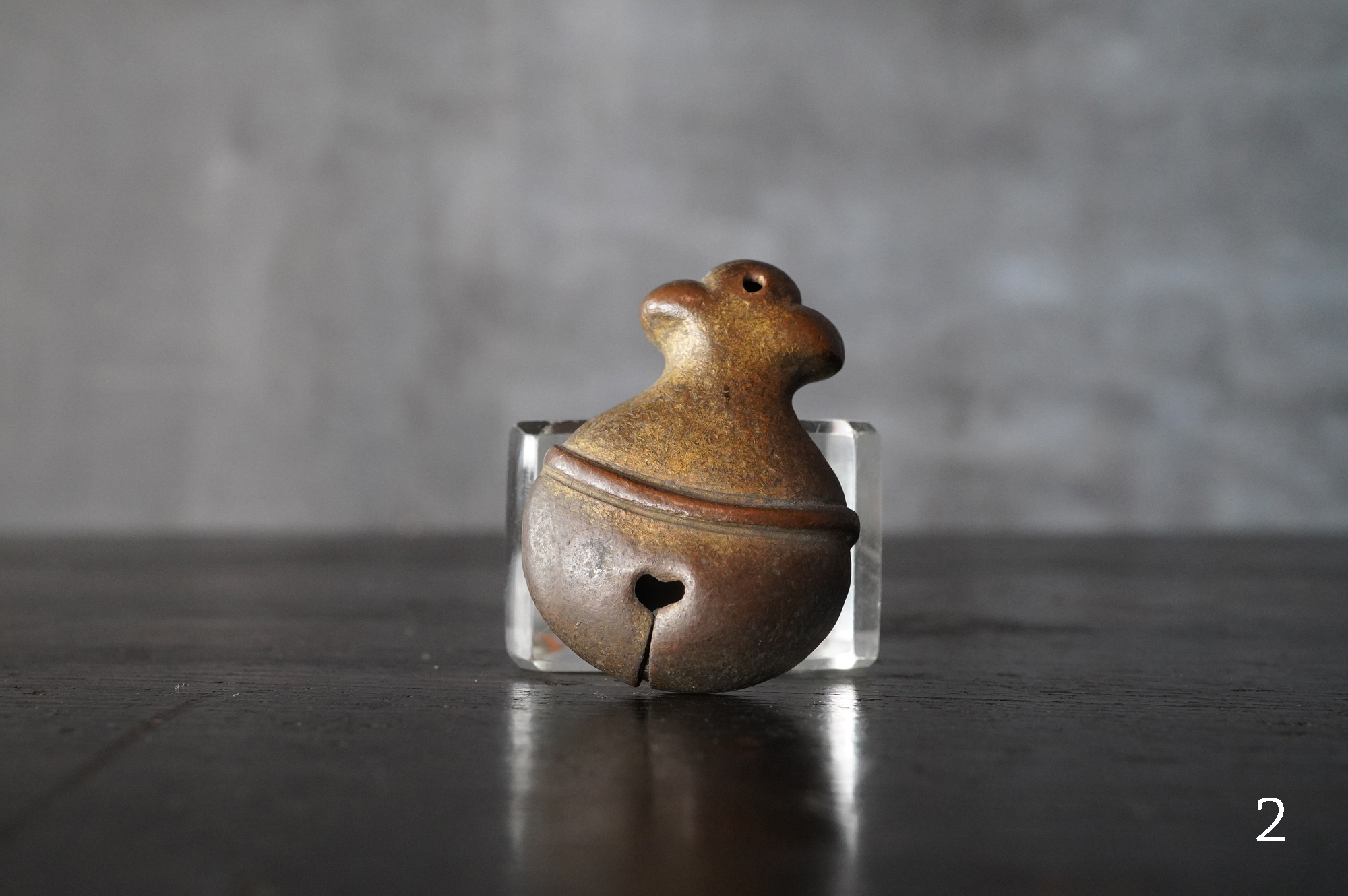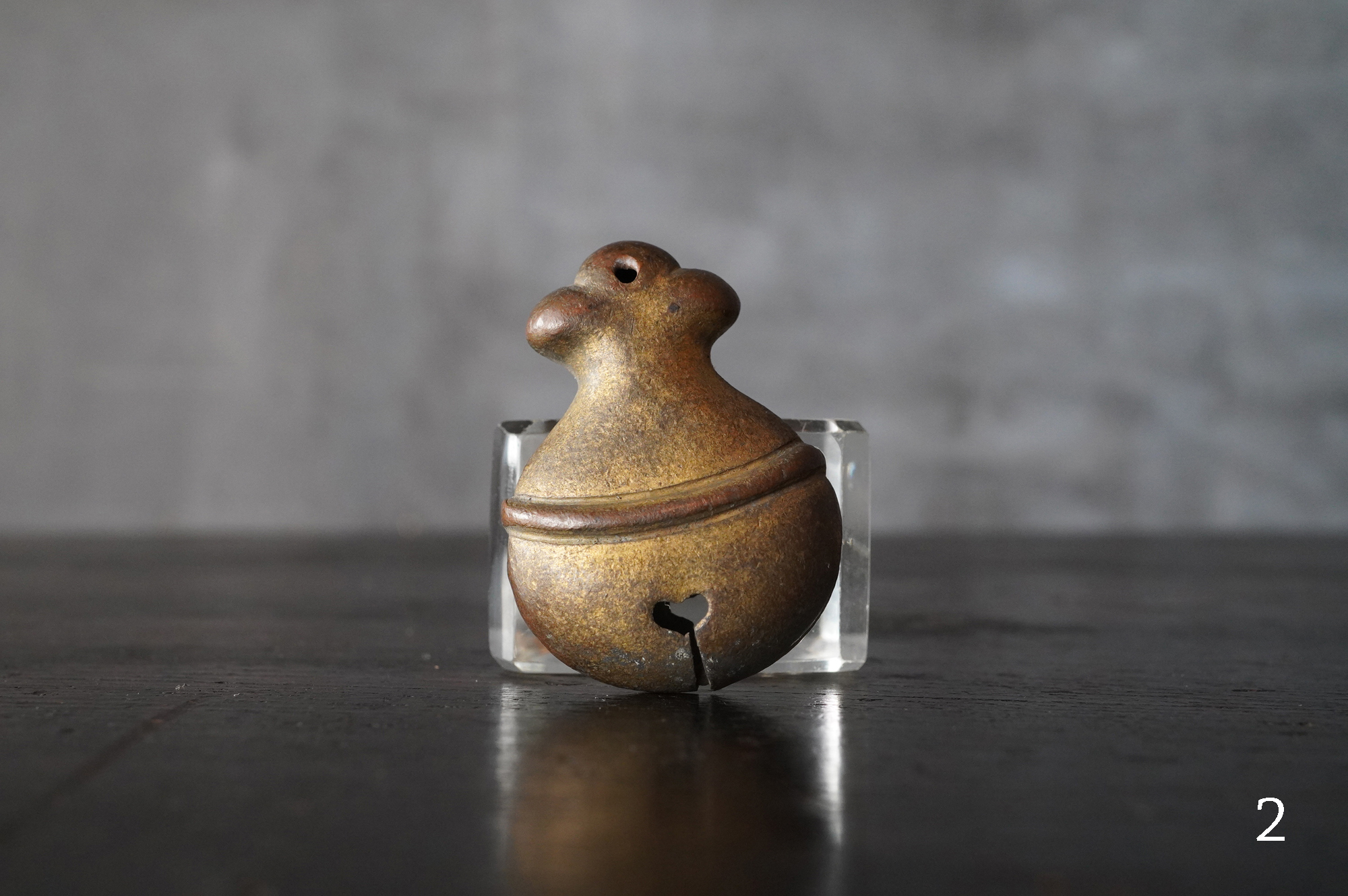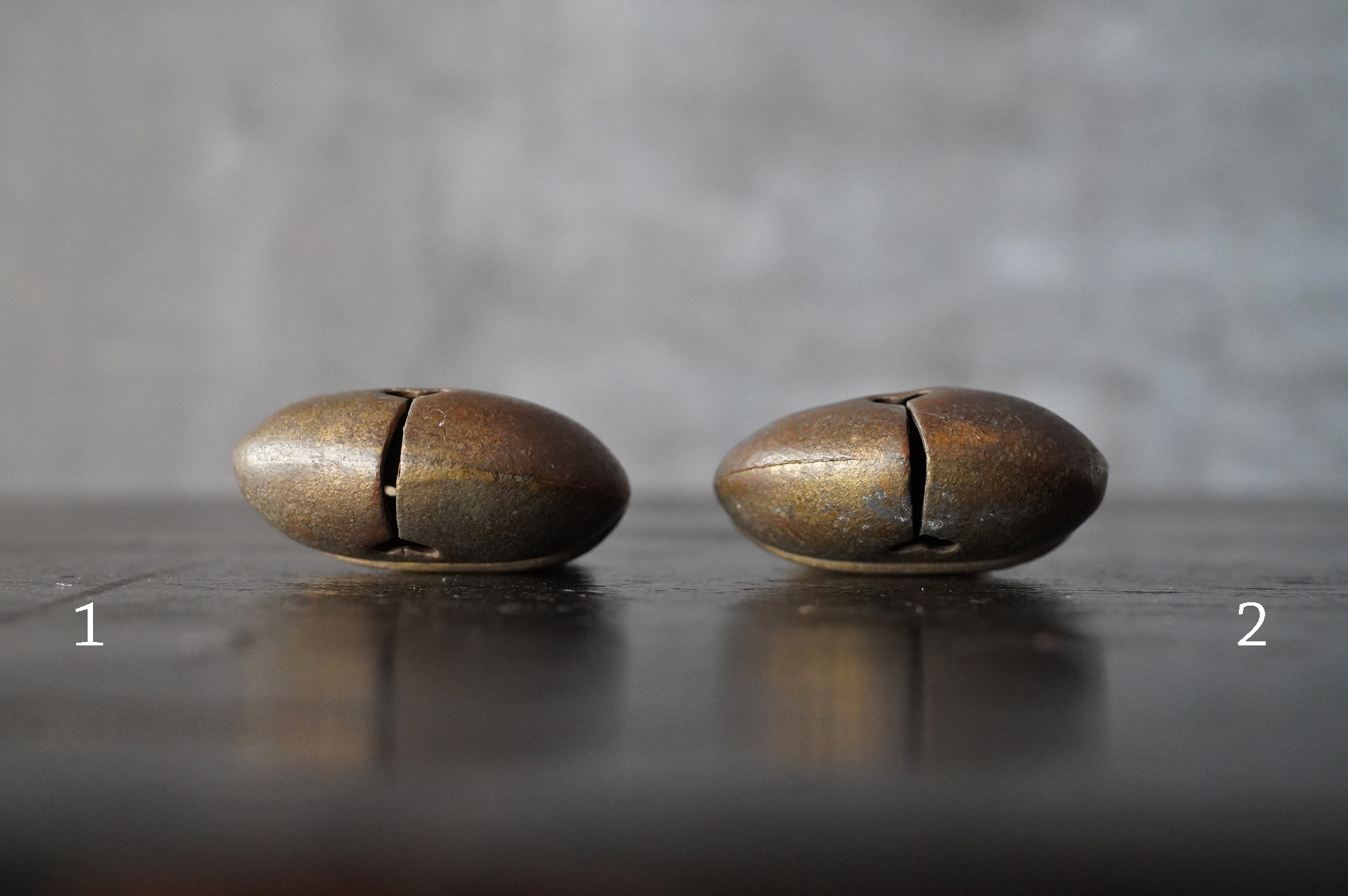厚みのある銅材で端正に作られ、往時の鍍金も多く残ります。内部には鈴子(小さな石)が残存しており、振るとカラカラと趣深い音色を奏でる点も魅力ではないでしょうか。歳月を重ねた味わいの中に、どこか愛らしさの漂う一具。二点ありますので1と2を選んでご注文下さい。どちらも、ほぼ同じ状態と判断しております。