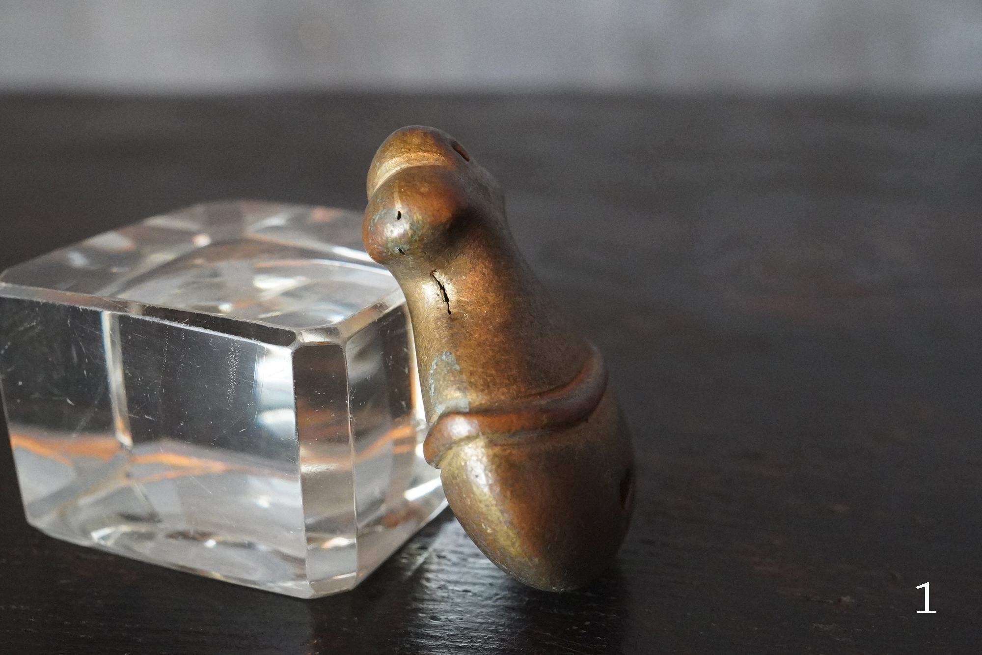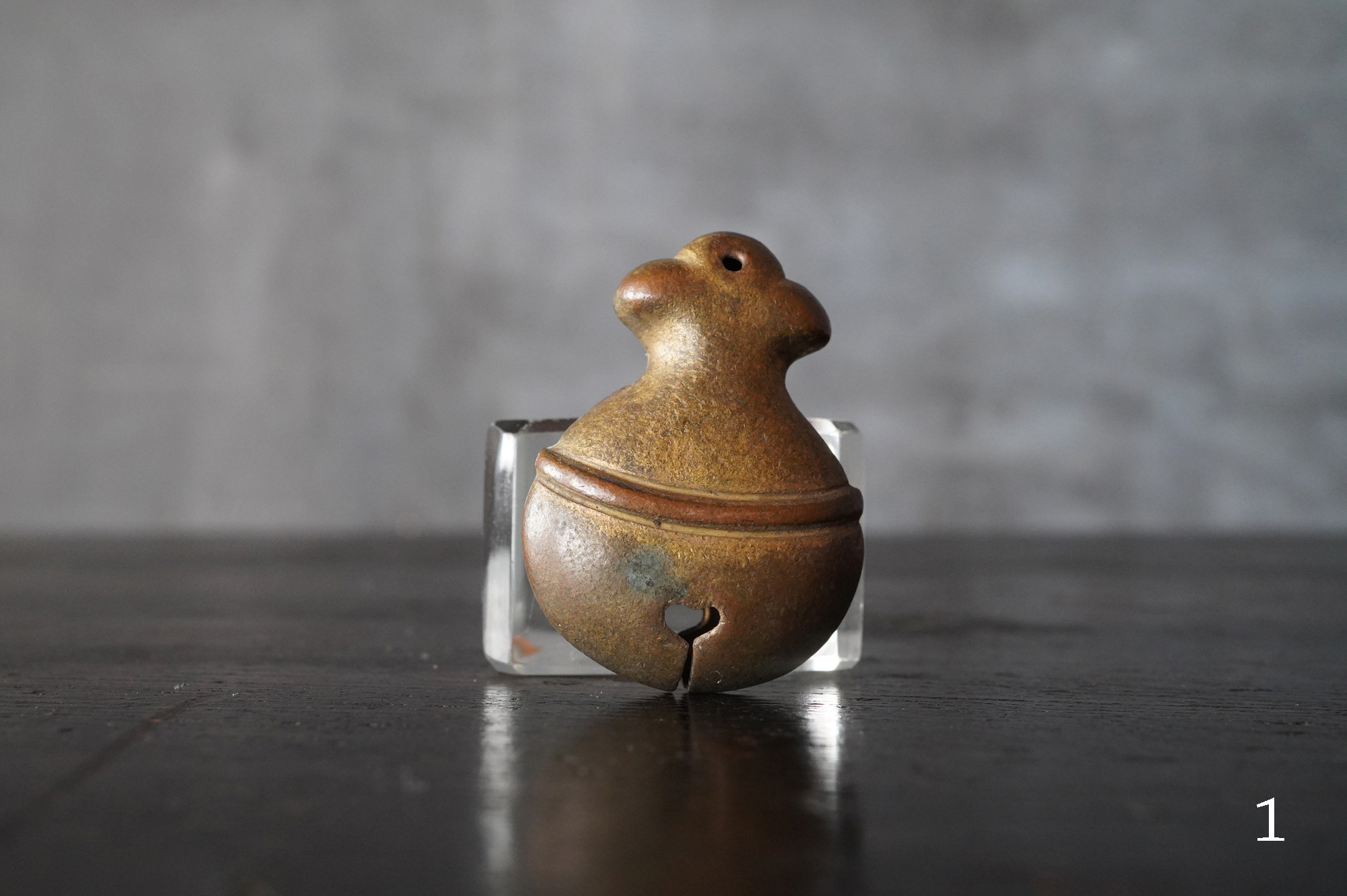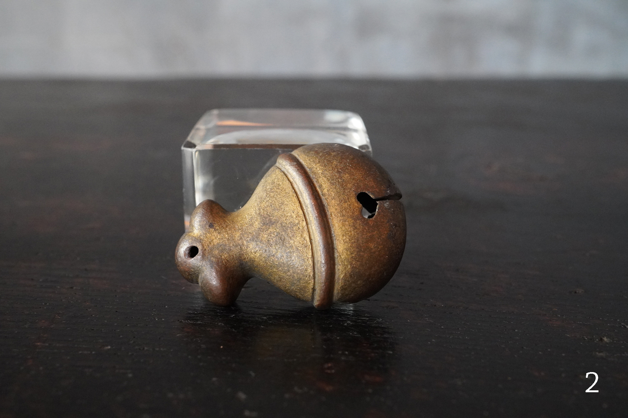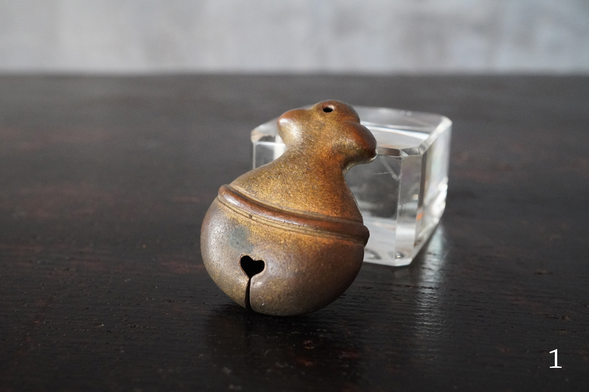 厚みのある銅材で端正に作られ、往時の鍍金も多く残ります。内部には鈴子(小さな石)が残存しており、振るとカラカラと趣深い音色を奏でる点も魅力ではないでしょうか。歳月を重ねた味わいの中に、どこか愛らしさの漂う一具。二点ありますので1と2を選んでご注文下さい。どちらも、ほぼ同じ状態と判断しております。