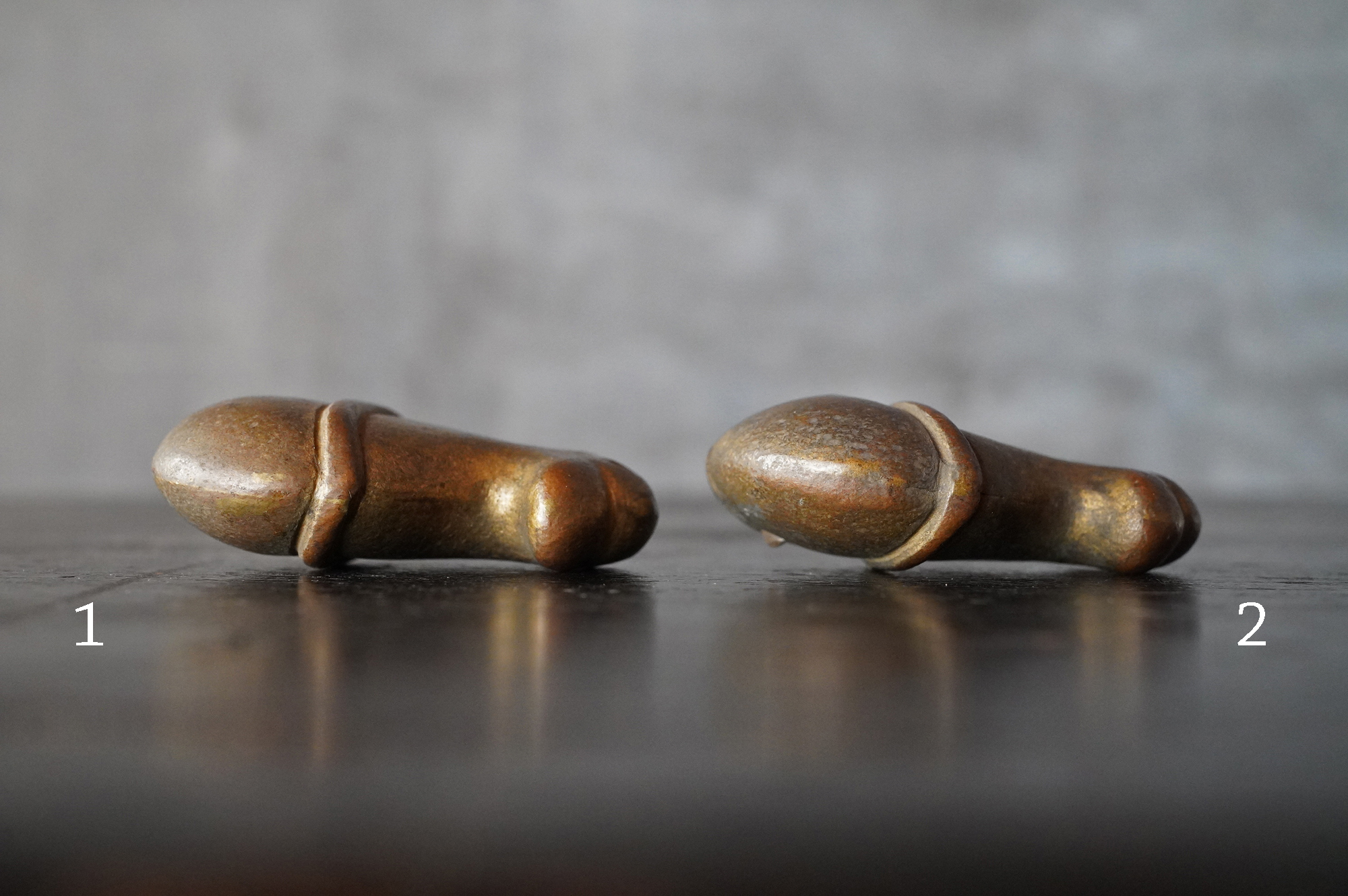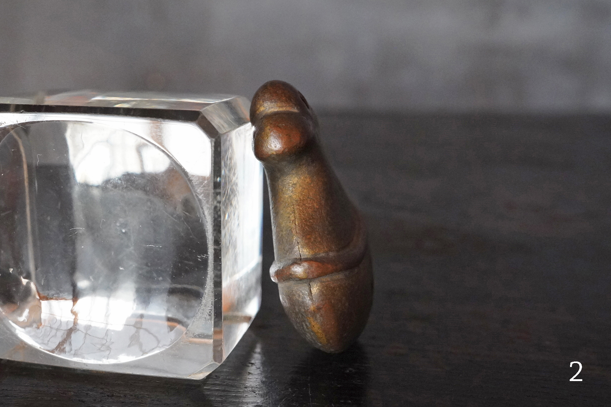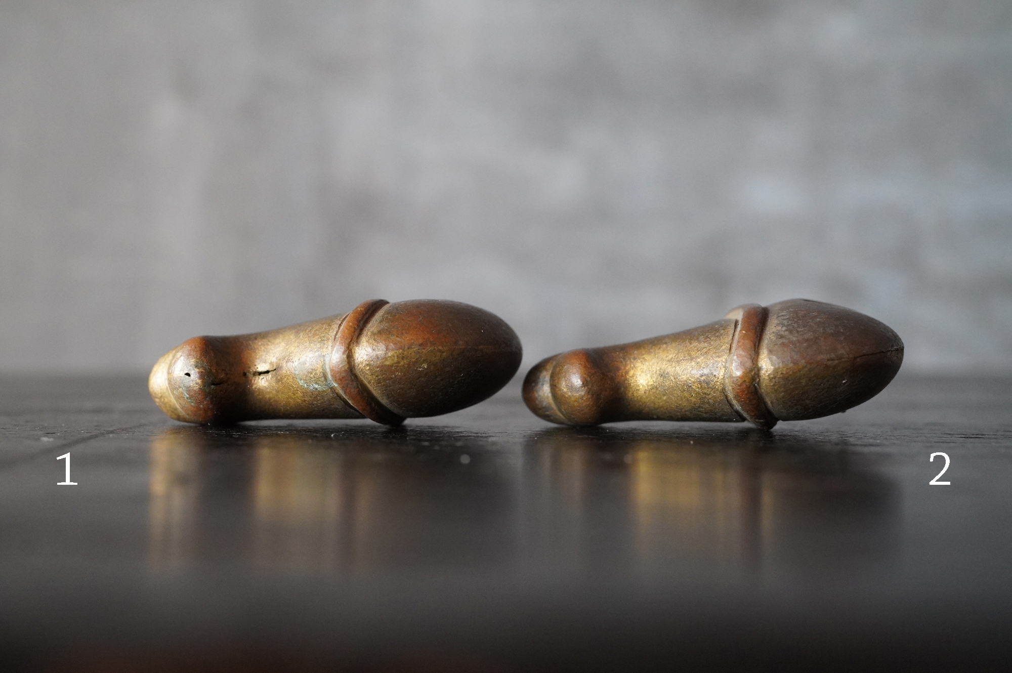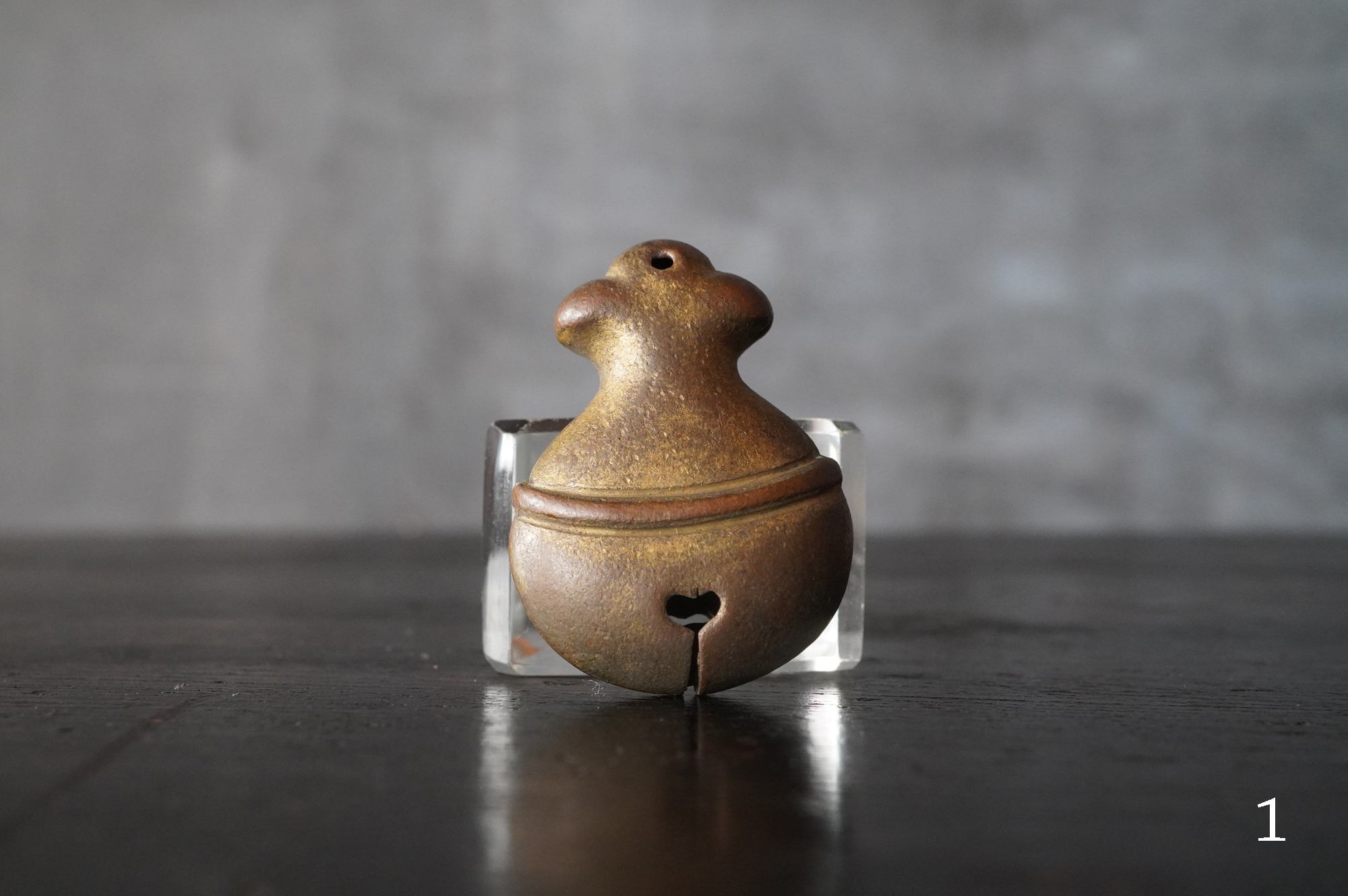 厚みのある銅材で端正に作られ、往時の鍍金も多く残ります。内部には鈴子(小さな石)が残存しており、振るとカラカラと趣深い音色を奏でる点も魅力ではないでしょうか。歳月を重ねた味わいの中に、どこか愛らしさの漂う一具。二点ありますので1と2を選んでご注文下さい。どちらも、ほぼ同じ状態と判断しております。