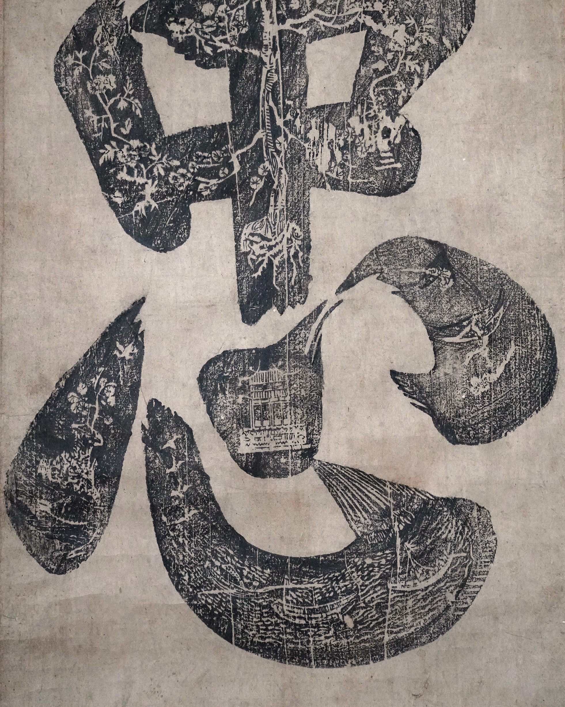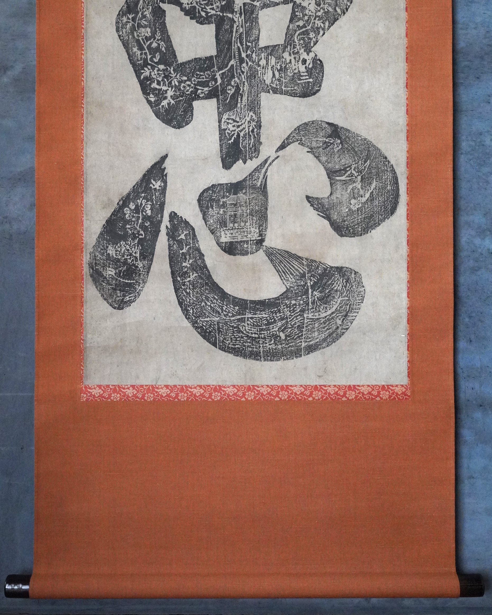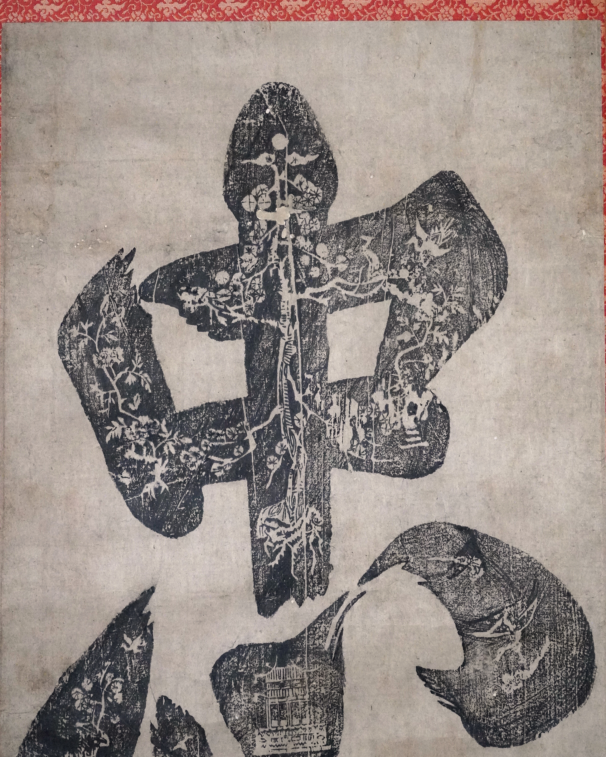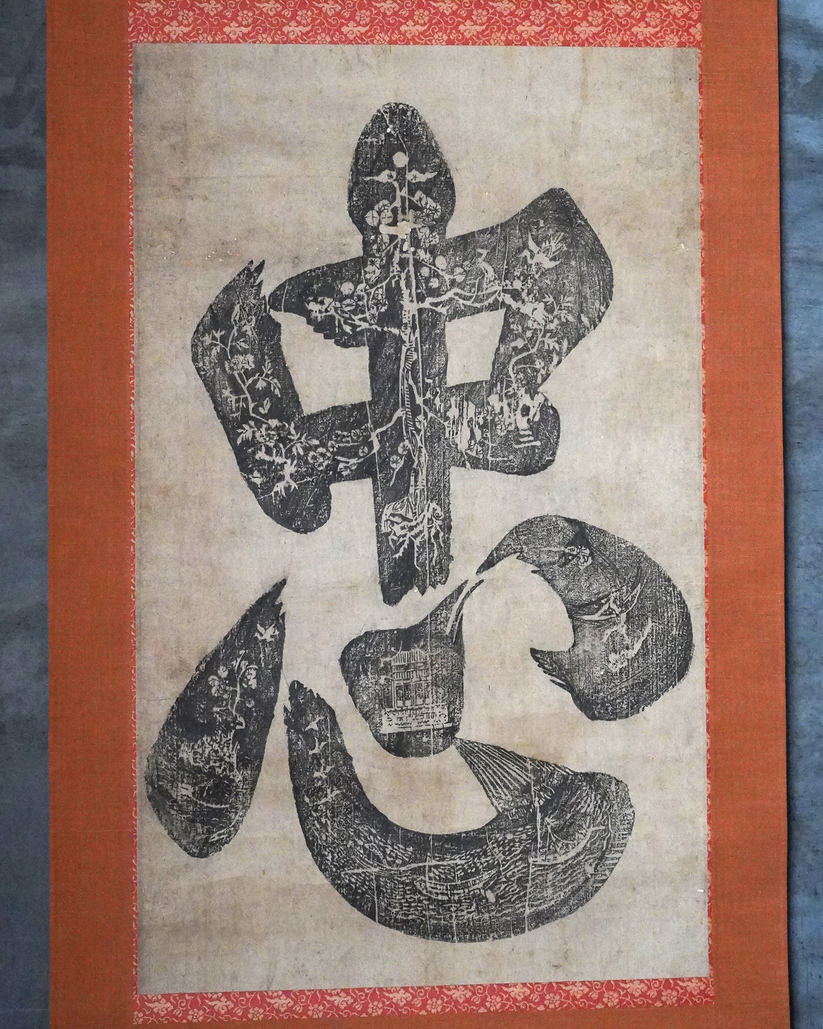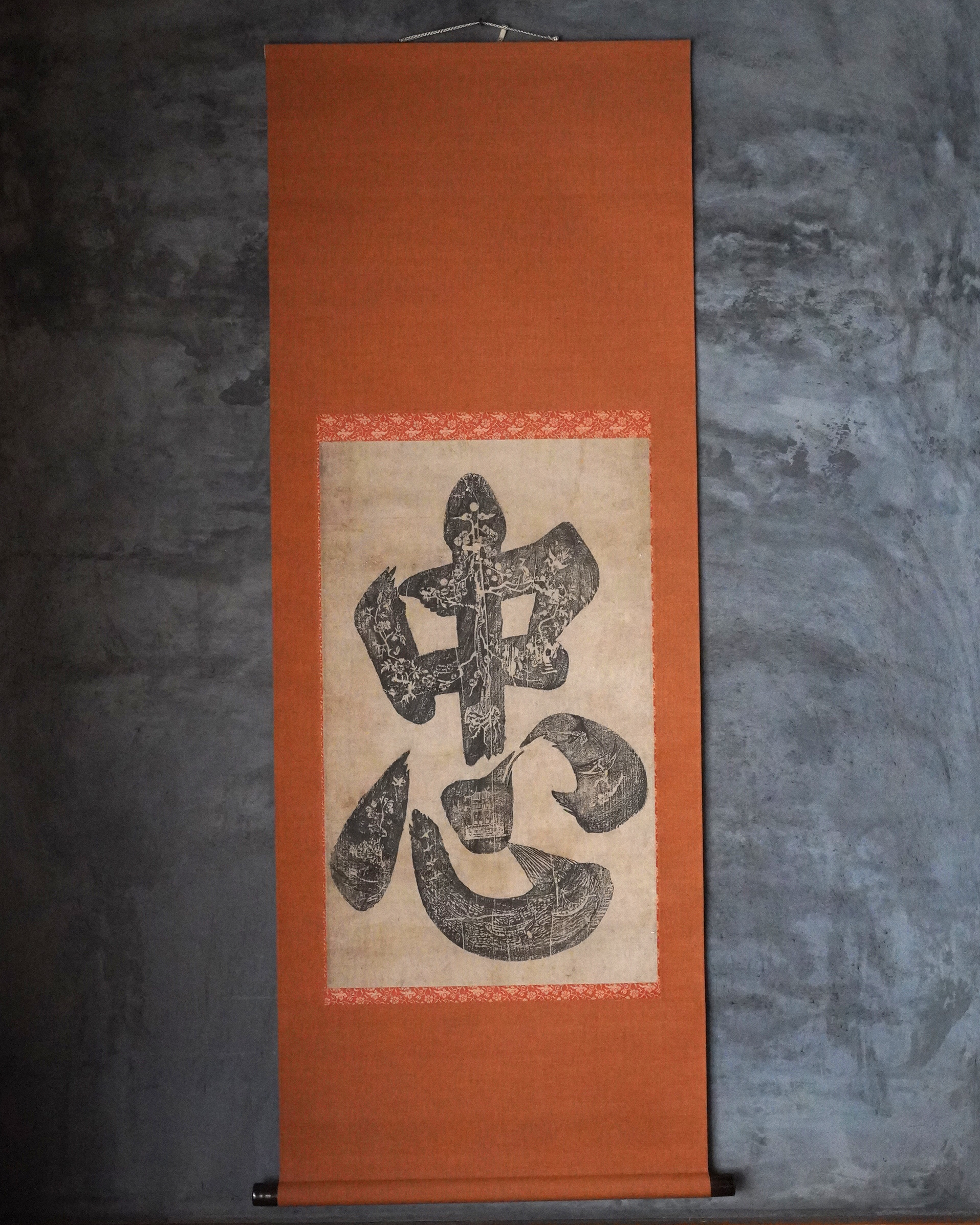 本品は彩色を施さない素朴な木版画で、「忠」の文字が紙面いっぱいに摺り込まれた大文字は迫力があり大陸庶民の力強い気質が伝わってきます。表具は近年の仕立て。李朝時代。