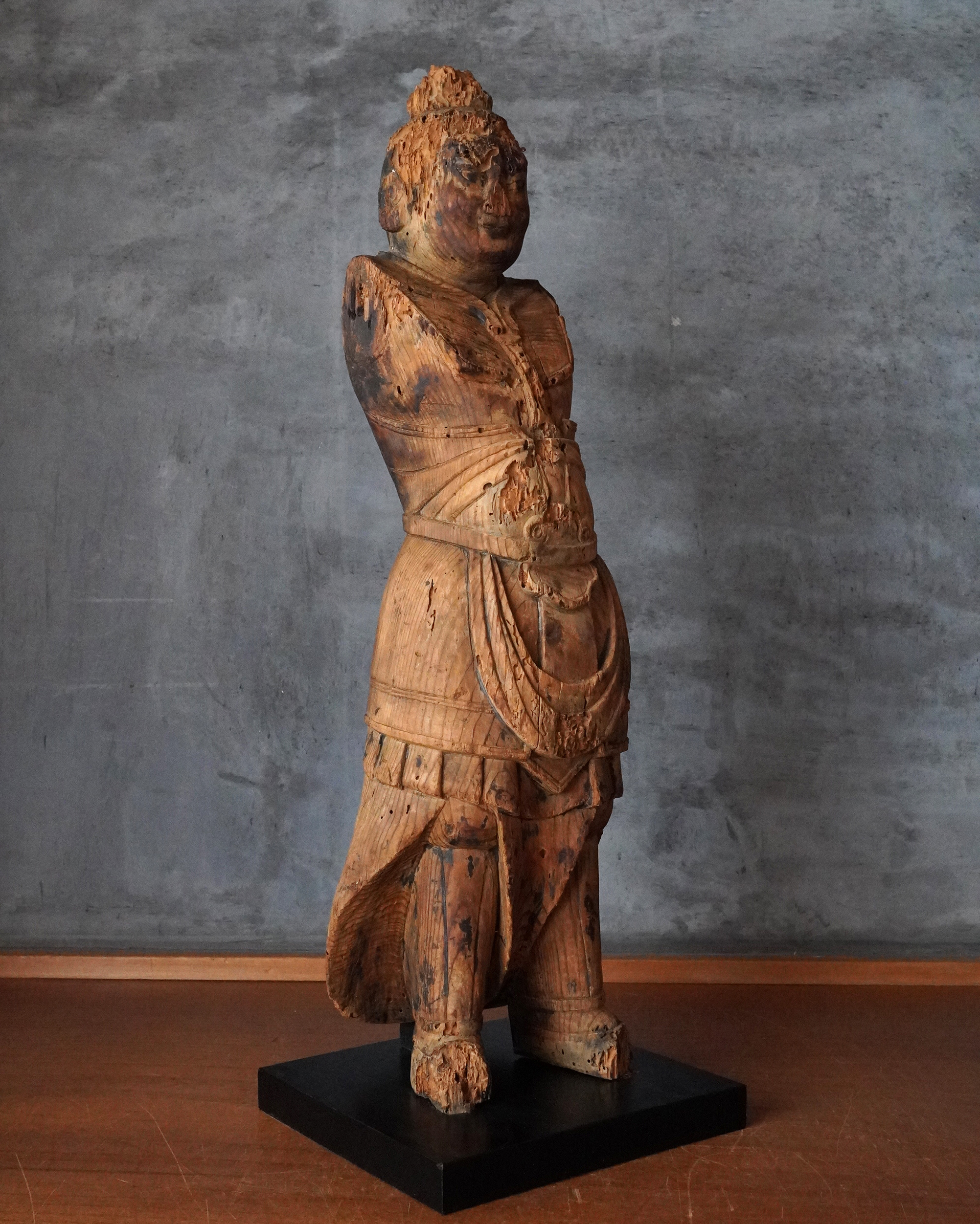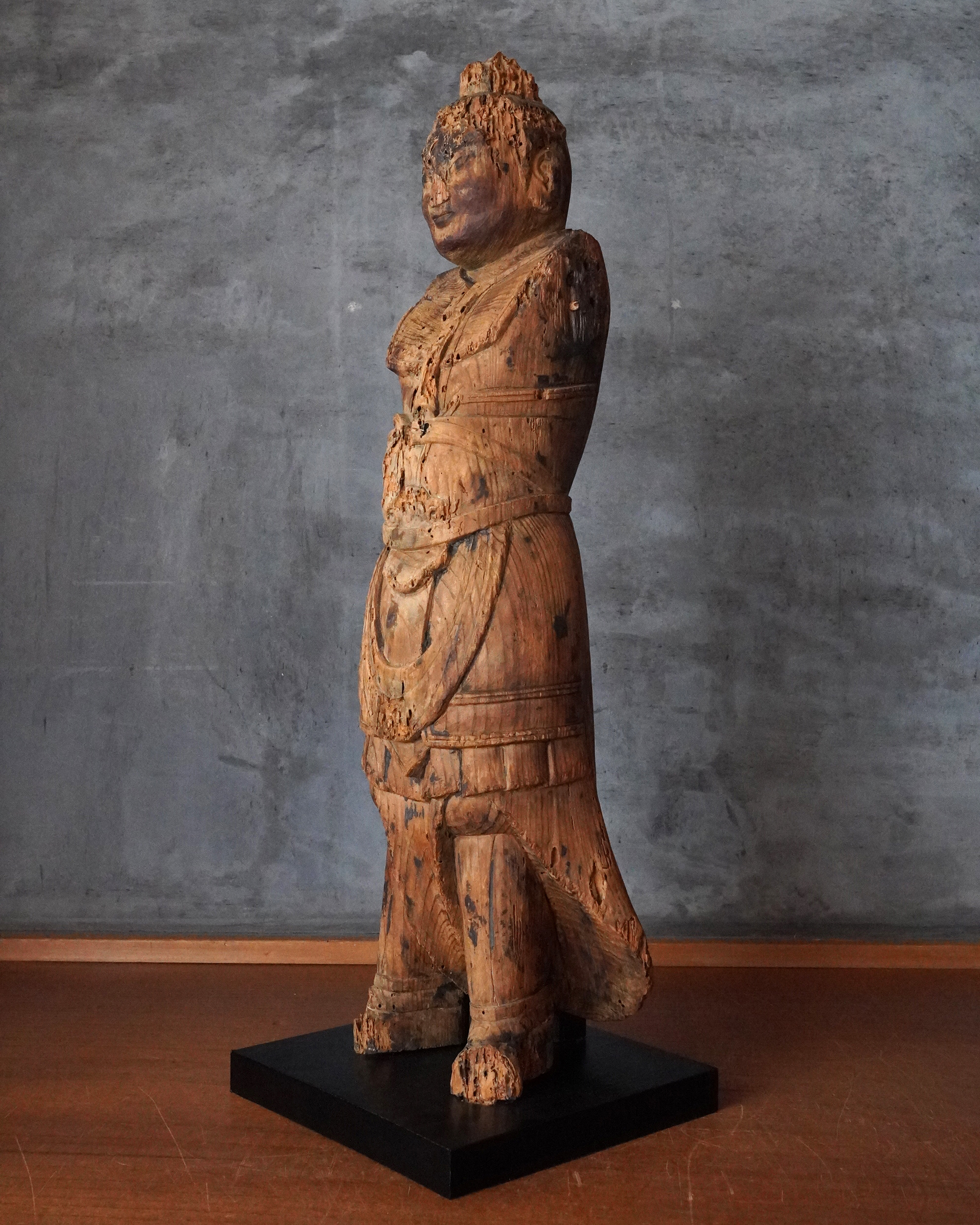 比較的像容をよく留めた天部立像です。ヒノキの一木から彫り出され、量感のある体躯ながら動勢は控えめで、直立に近い落ち着いた姿を示します。憤怒相も過度に誇張されず、これらの点から平安時代後期の作と見てよいでしょう。
