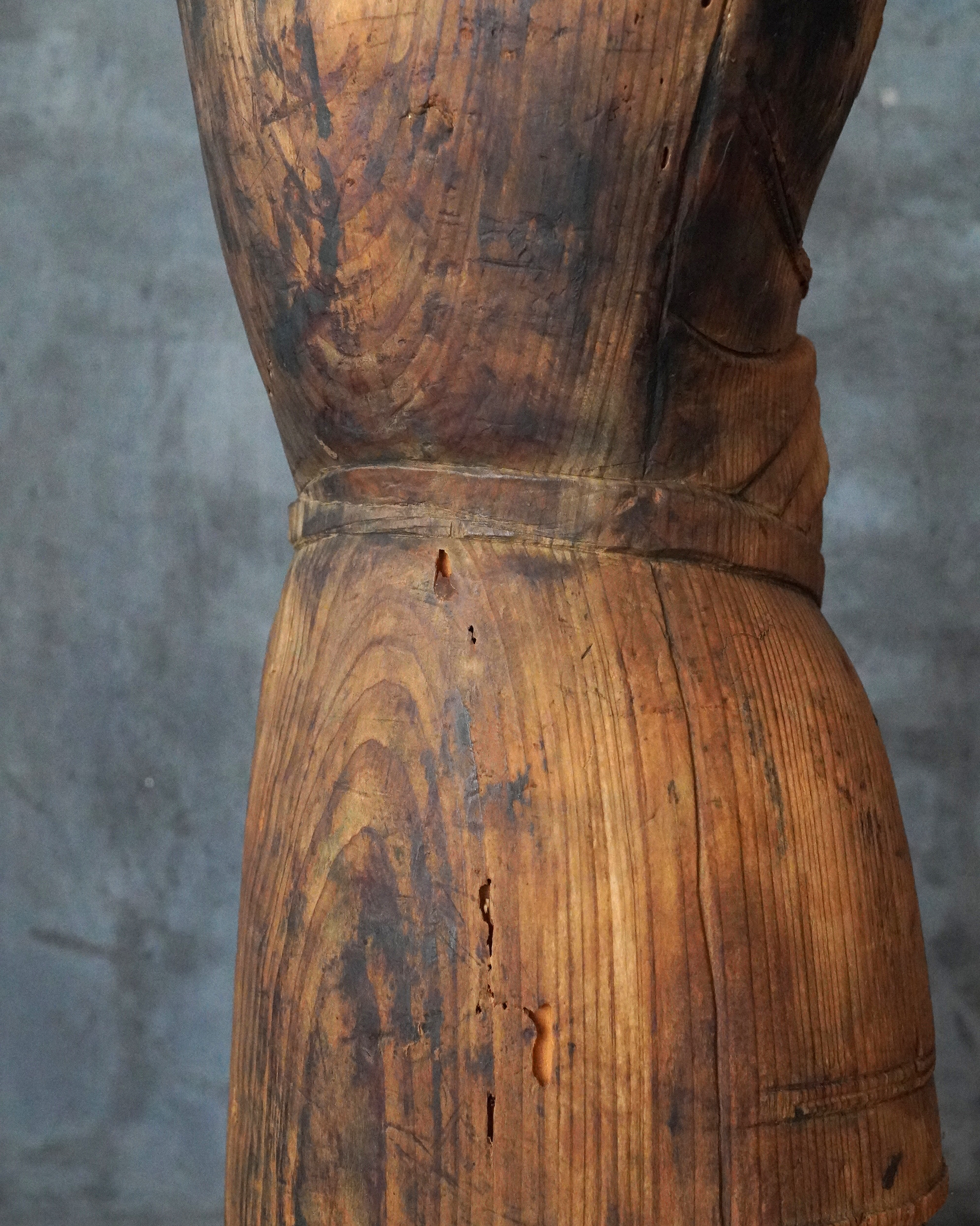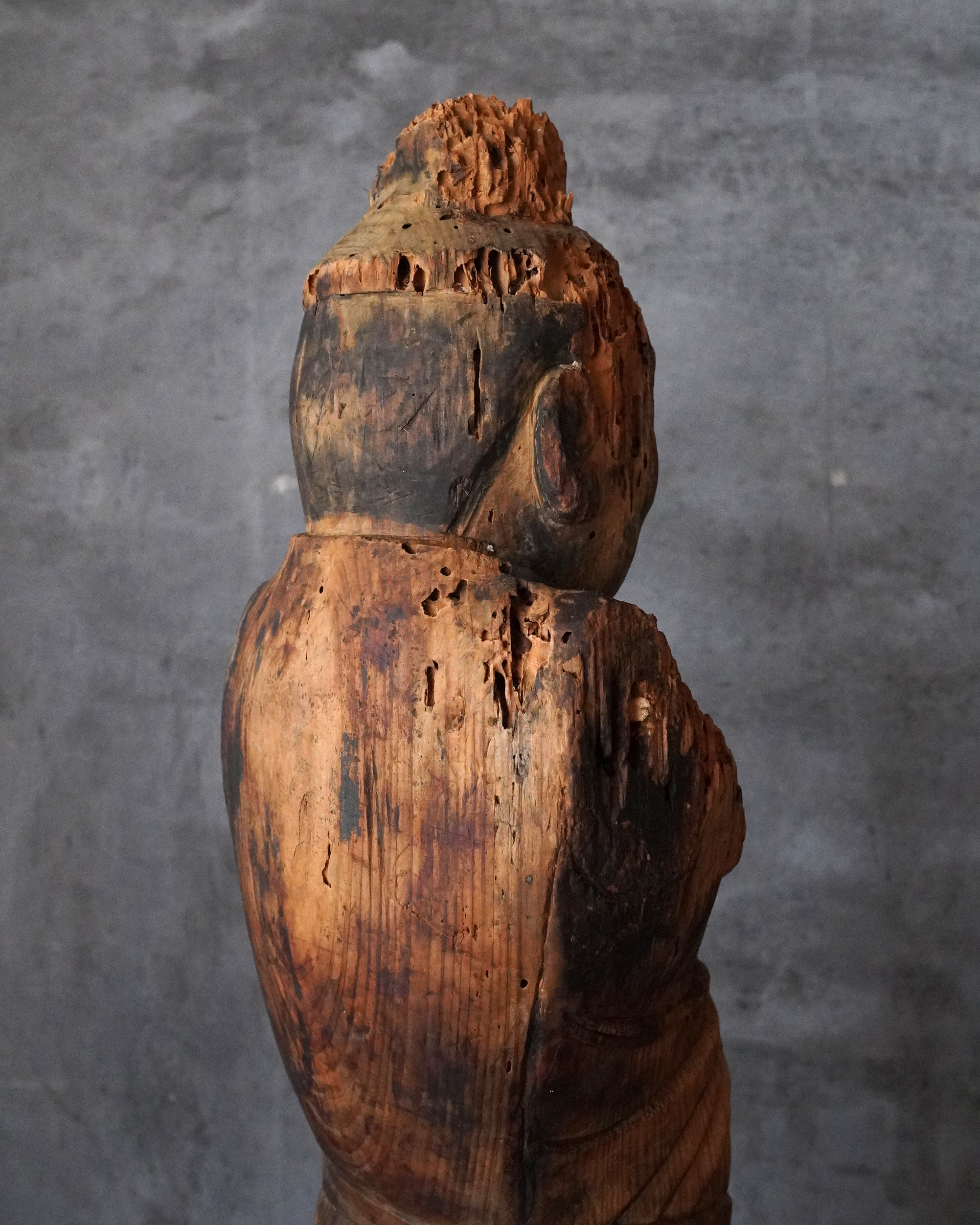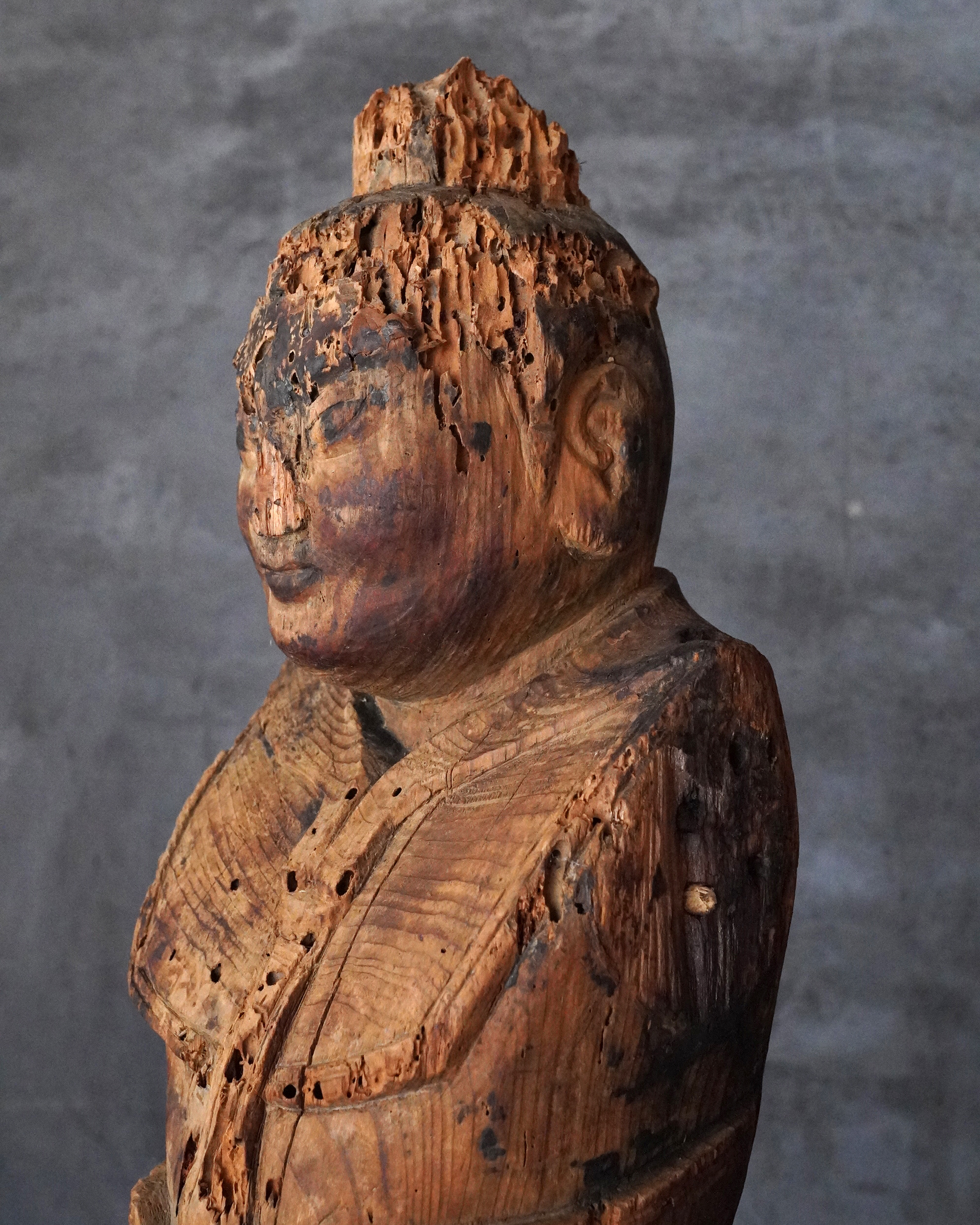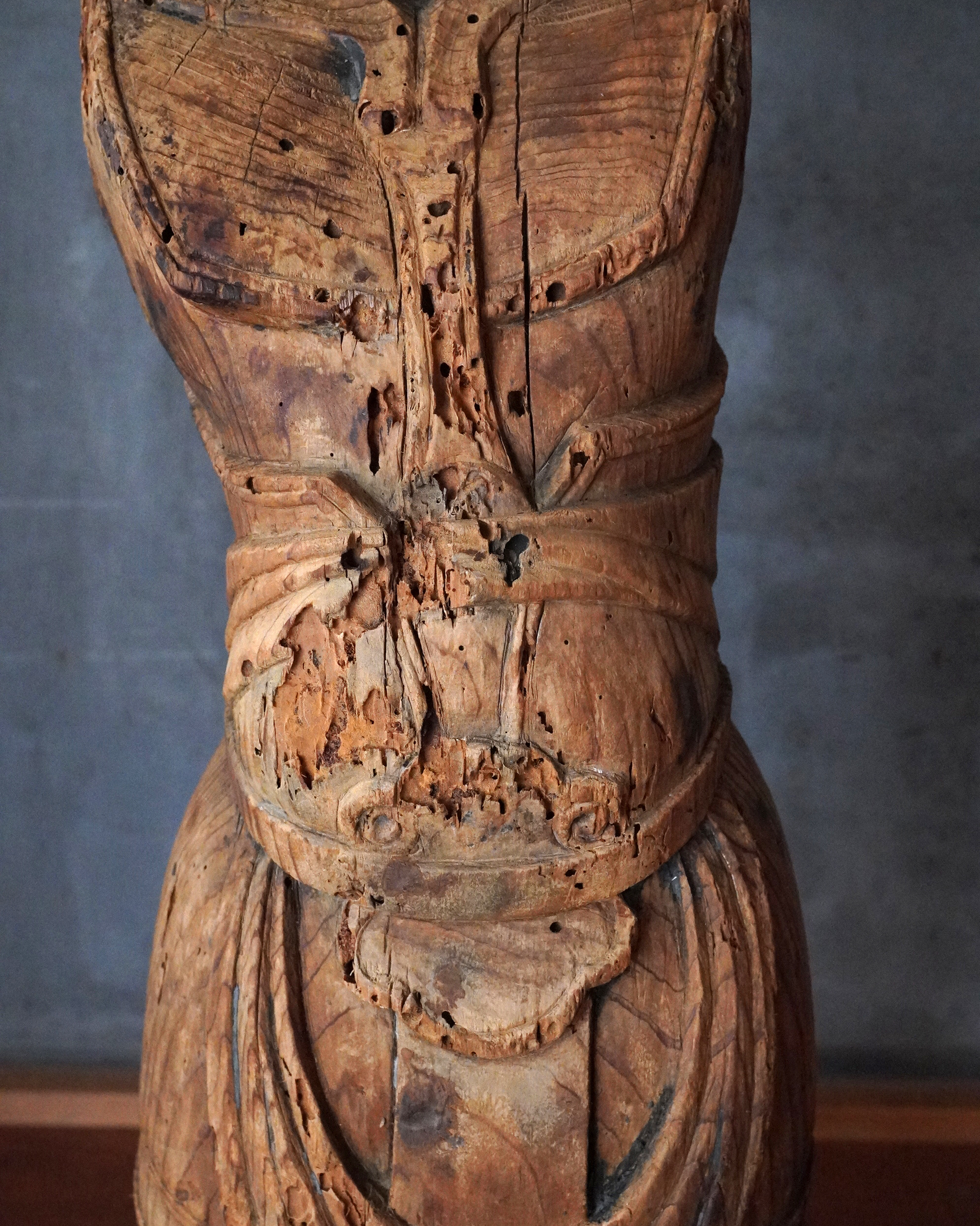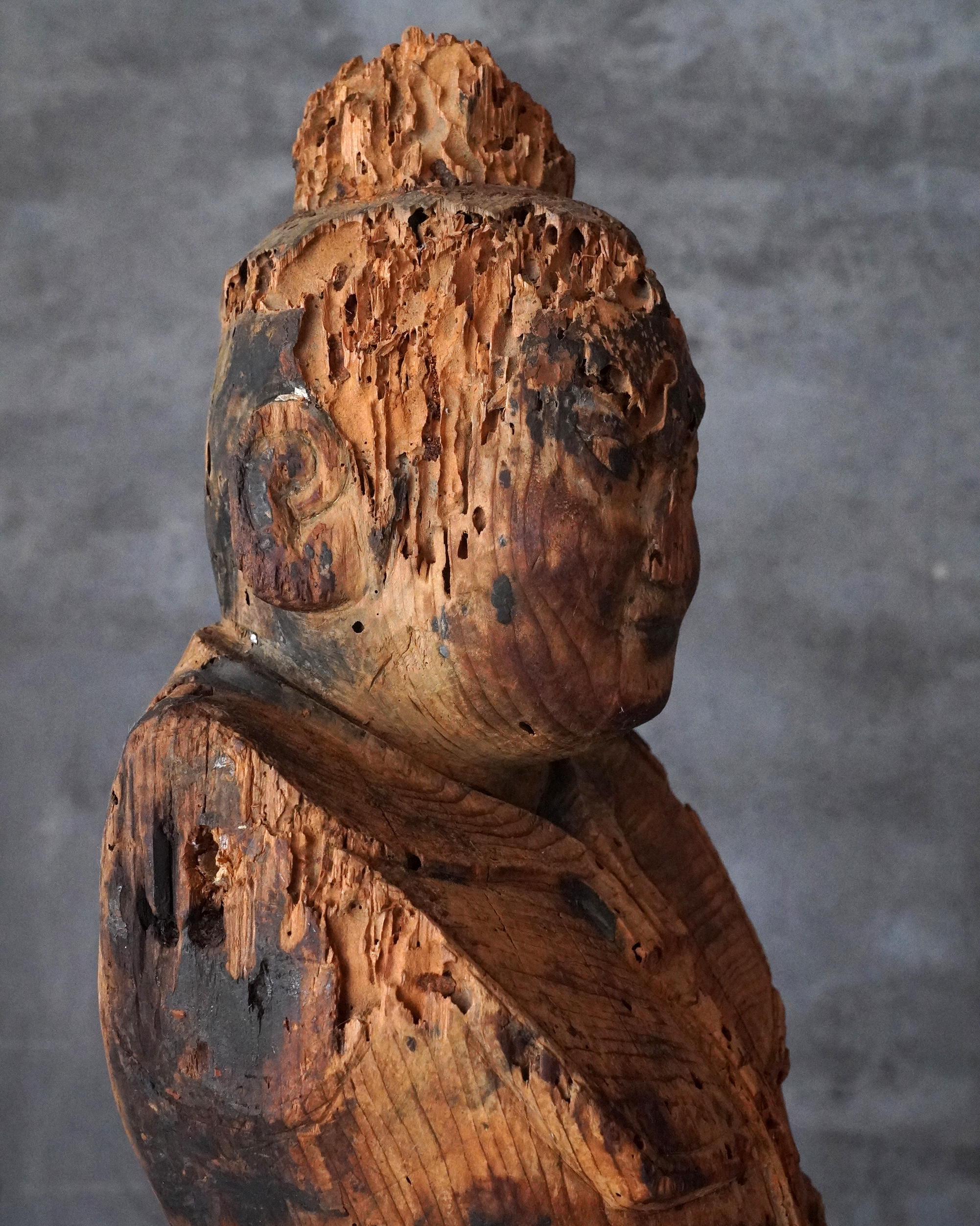 虫食いや破損は多く見られますが、全体の威厳と風格はしっかりと保たれており、堂々たる存在感を放っています。目部をはじめ、ところどころに墨書の痕が残りますが、当初のものか後補かは判別いたしかねます。