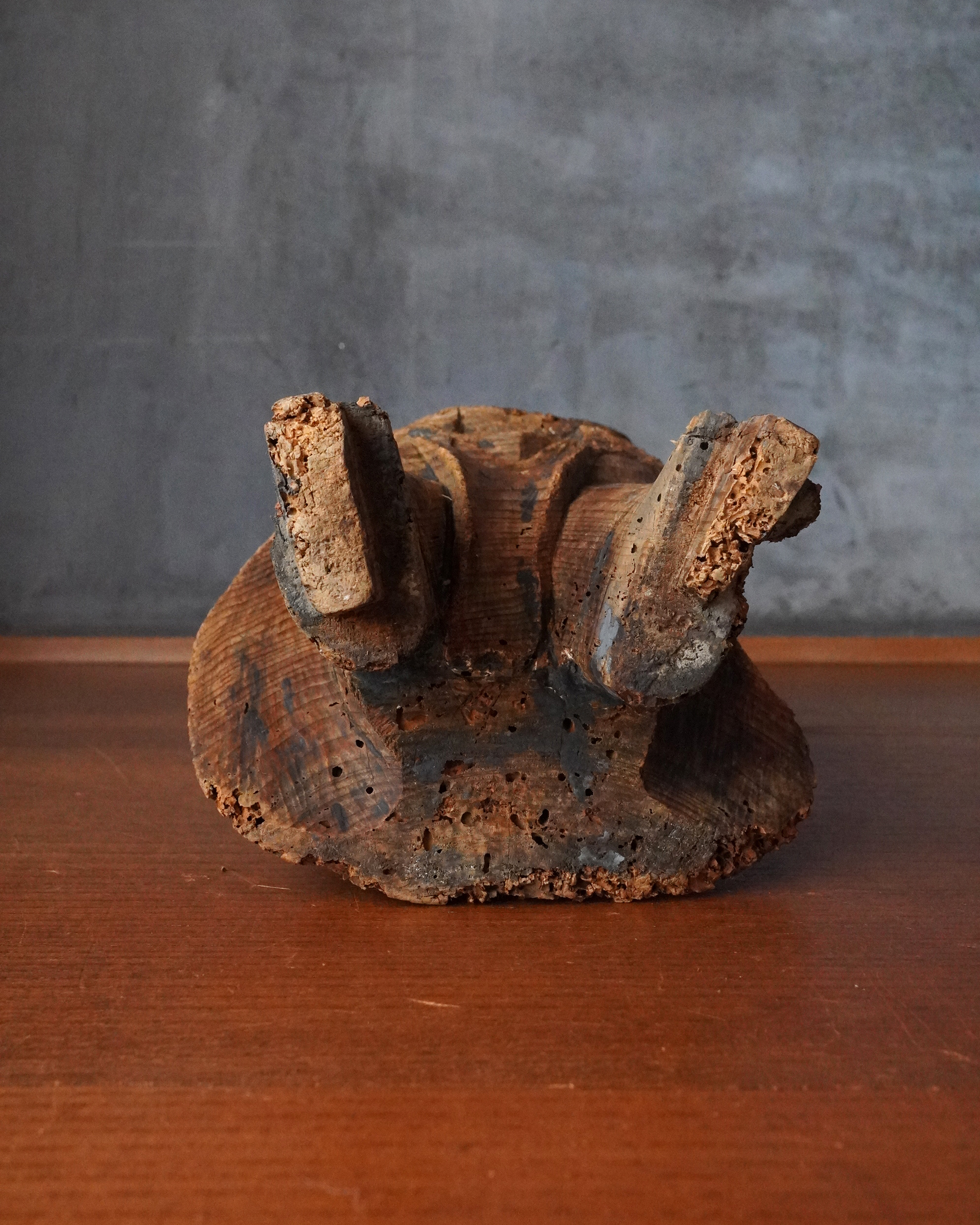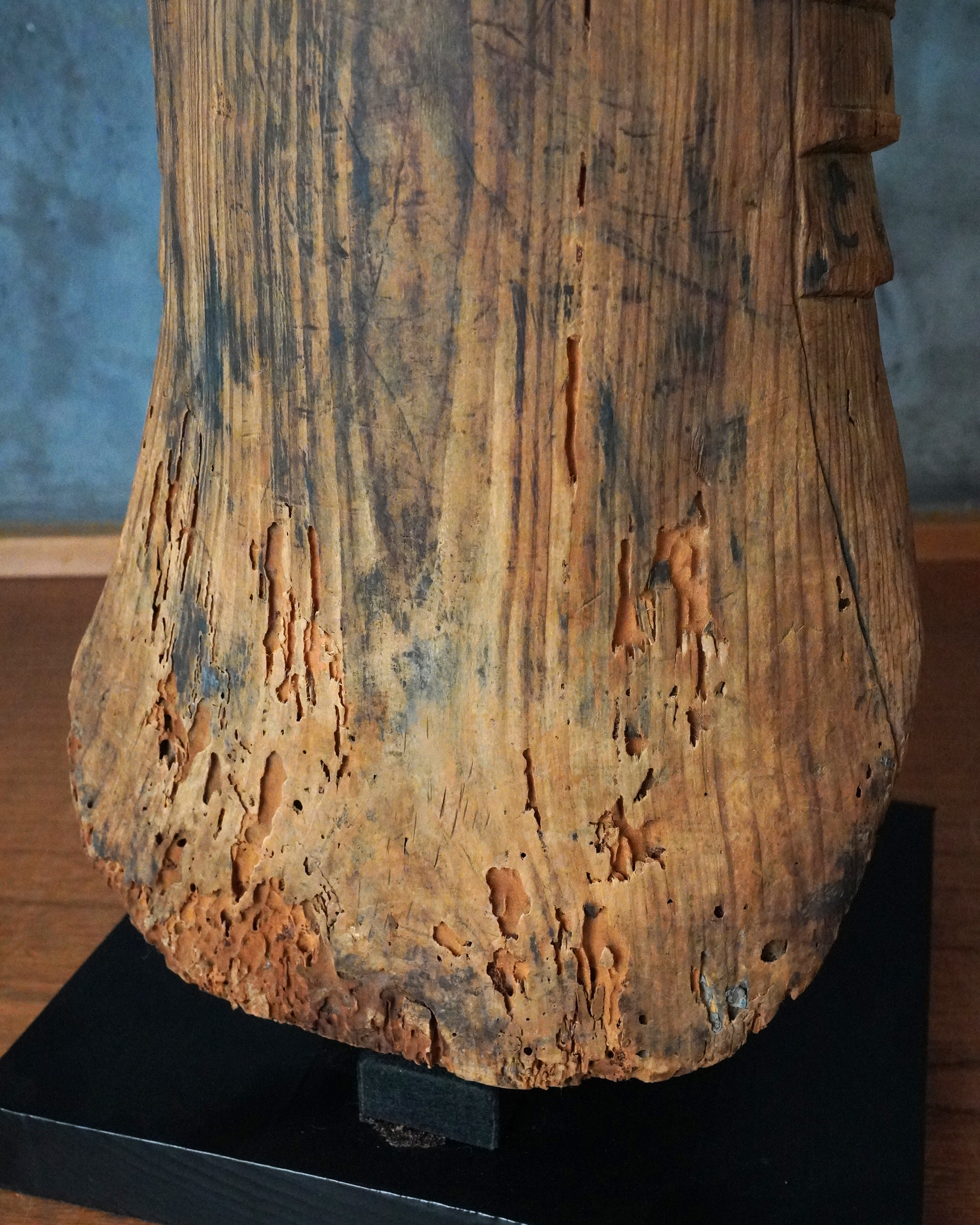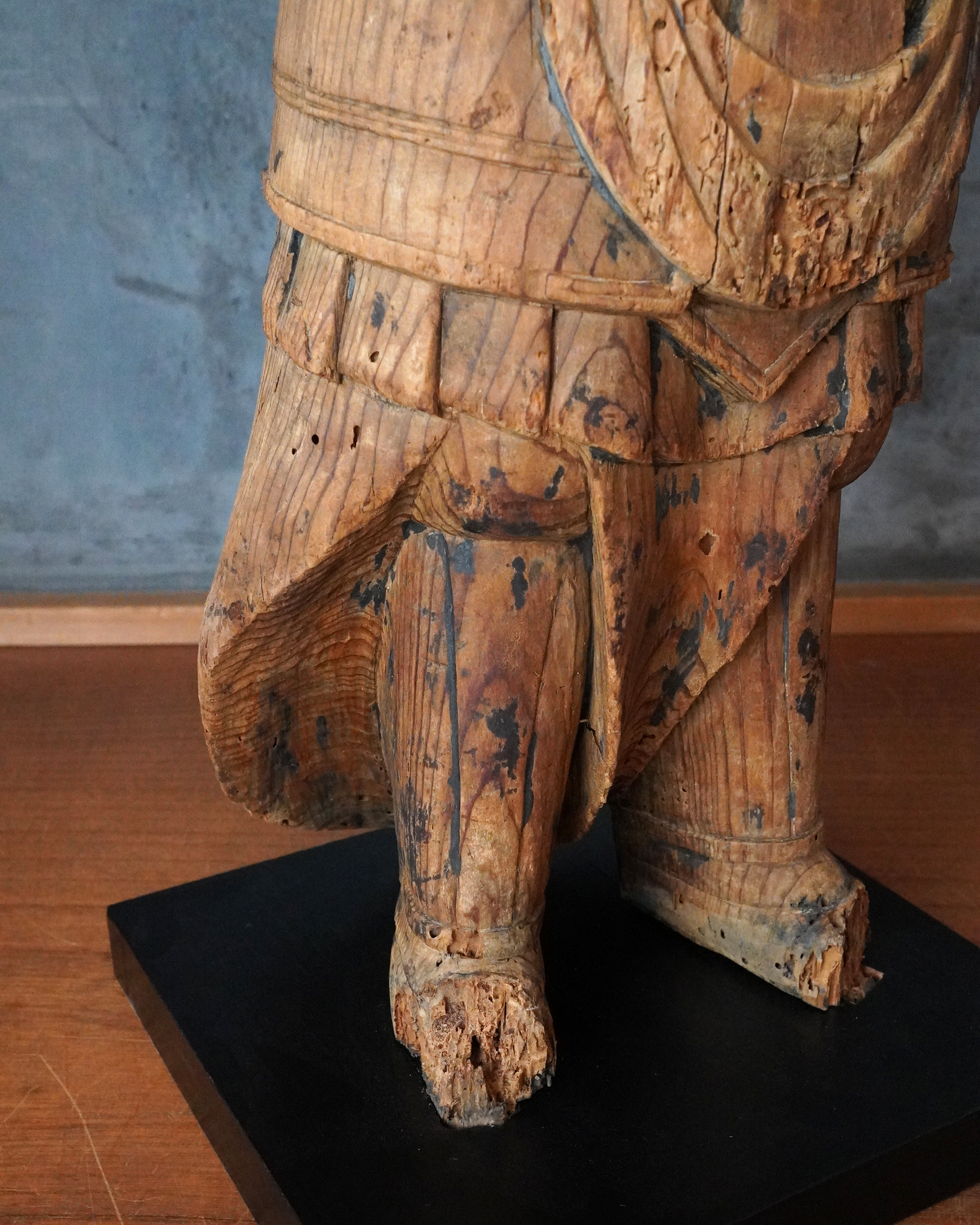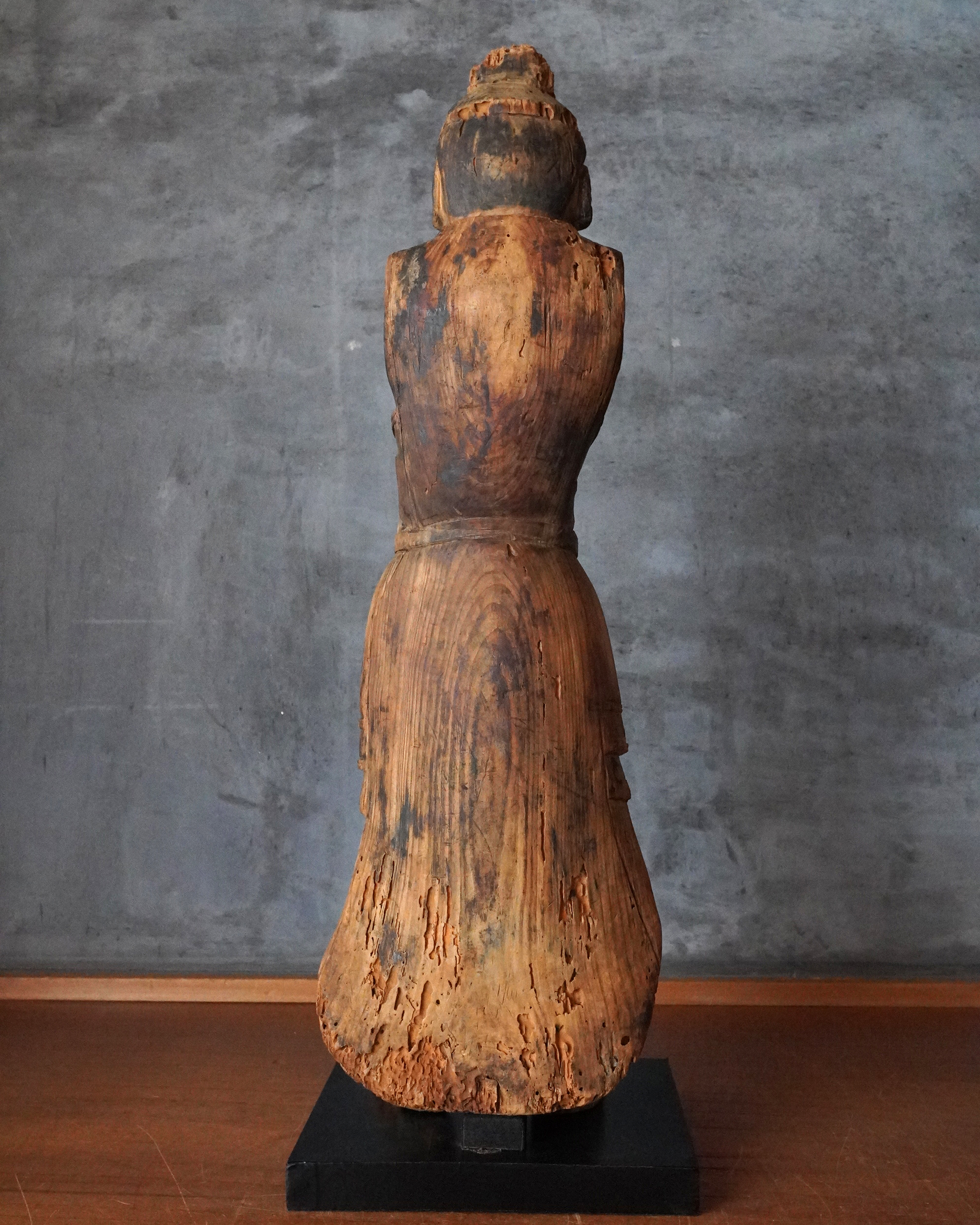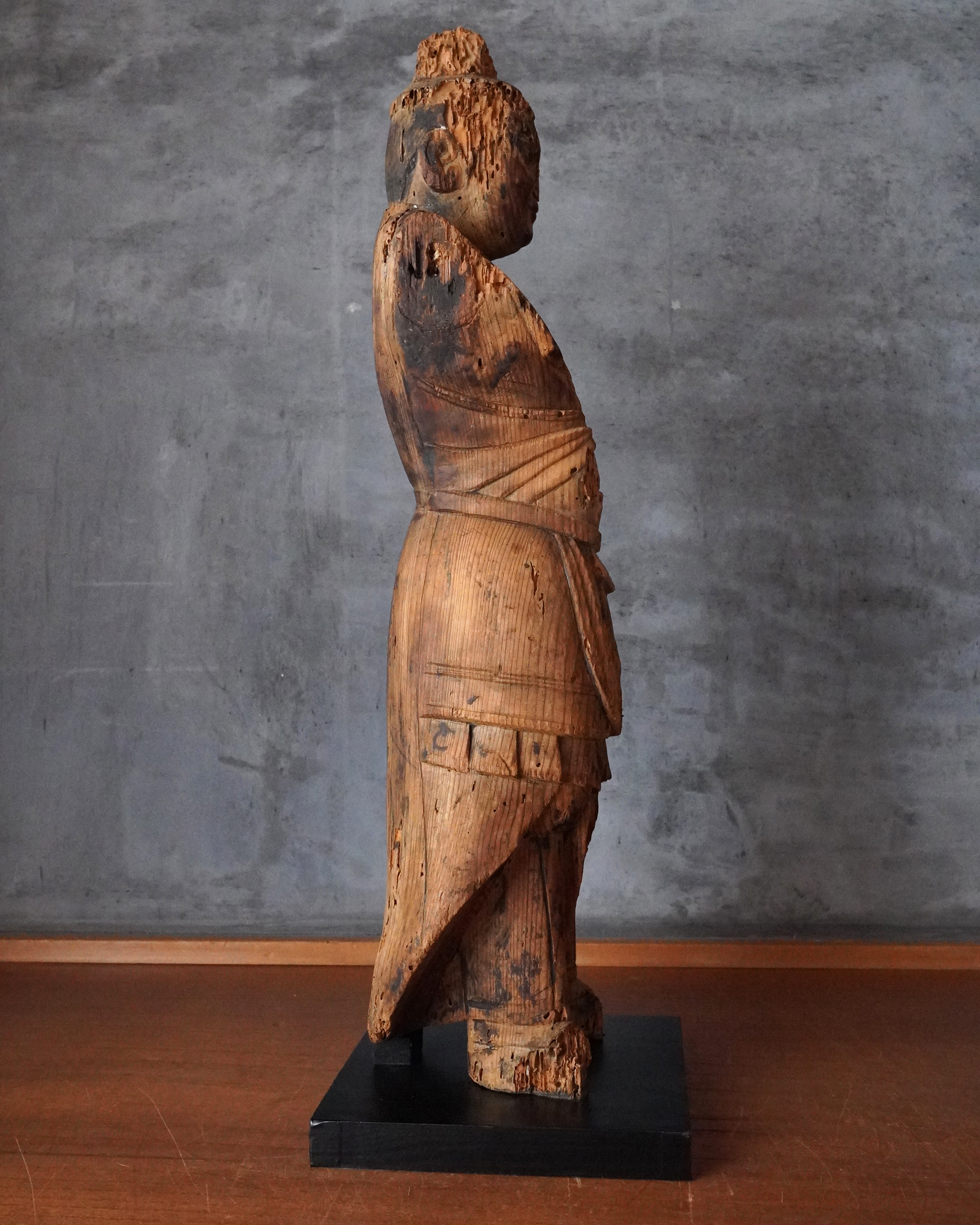 虫食いや破損は多く見られますが、全体の威厳と風格はしっかりと保たれており、堂々たる存在感を放っています。目部をはじめ、ところどころに墨書の痕が残りますが、当初のものか後補かは判別いたしかねます。