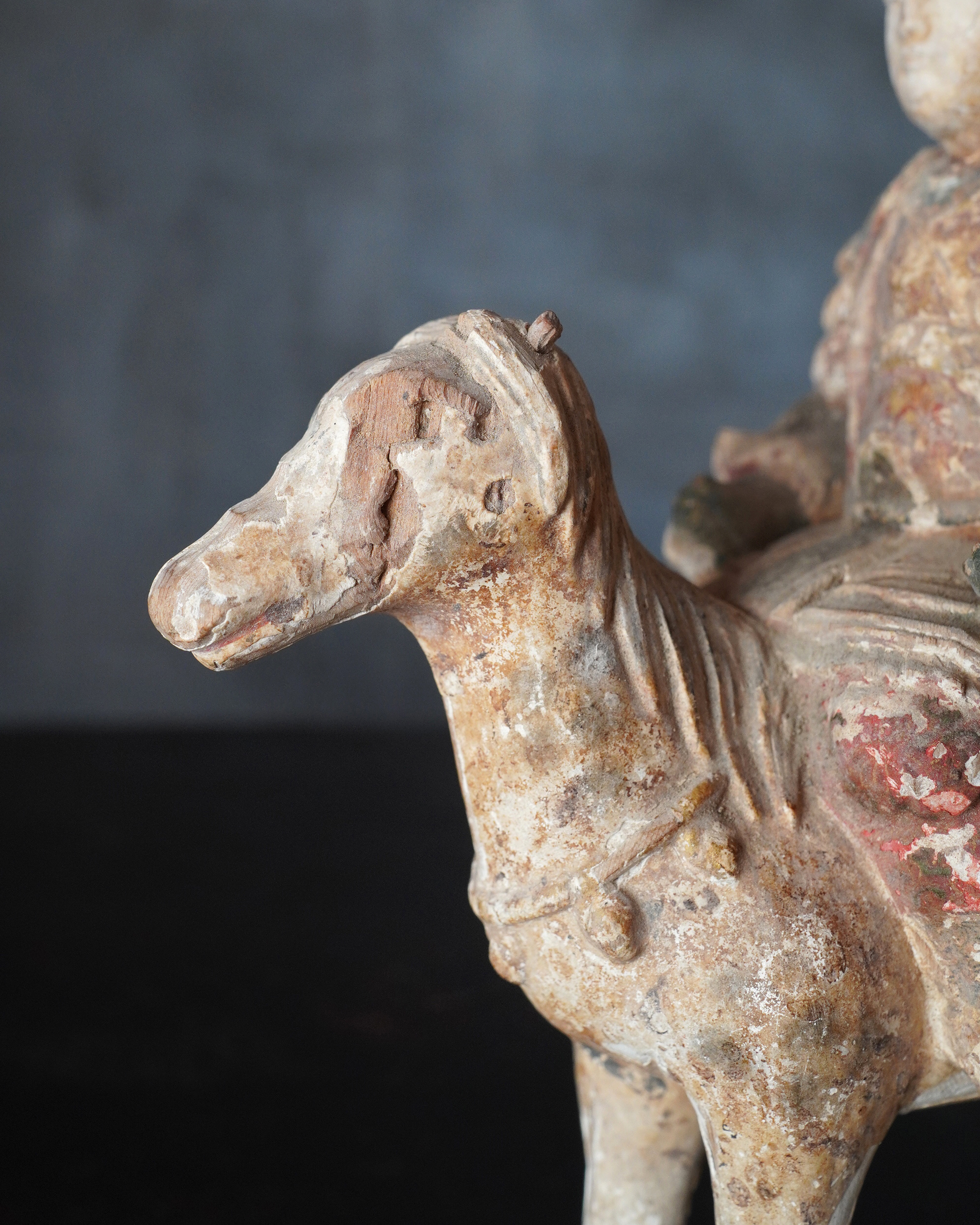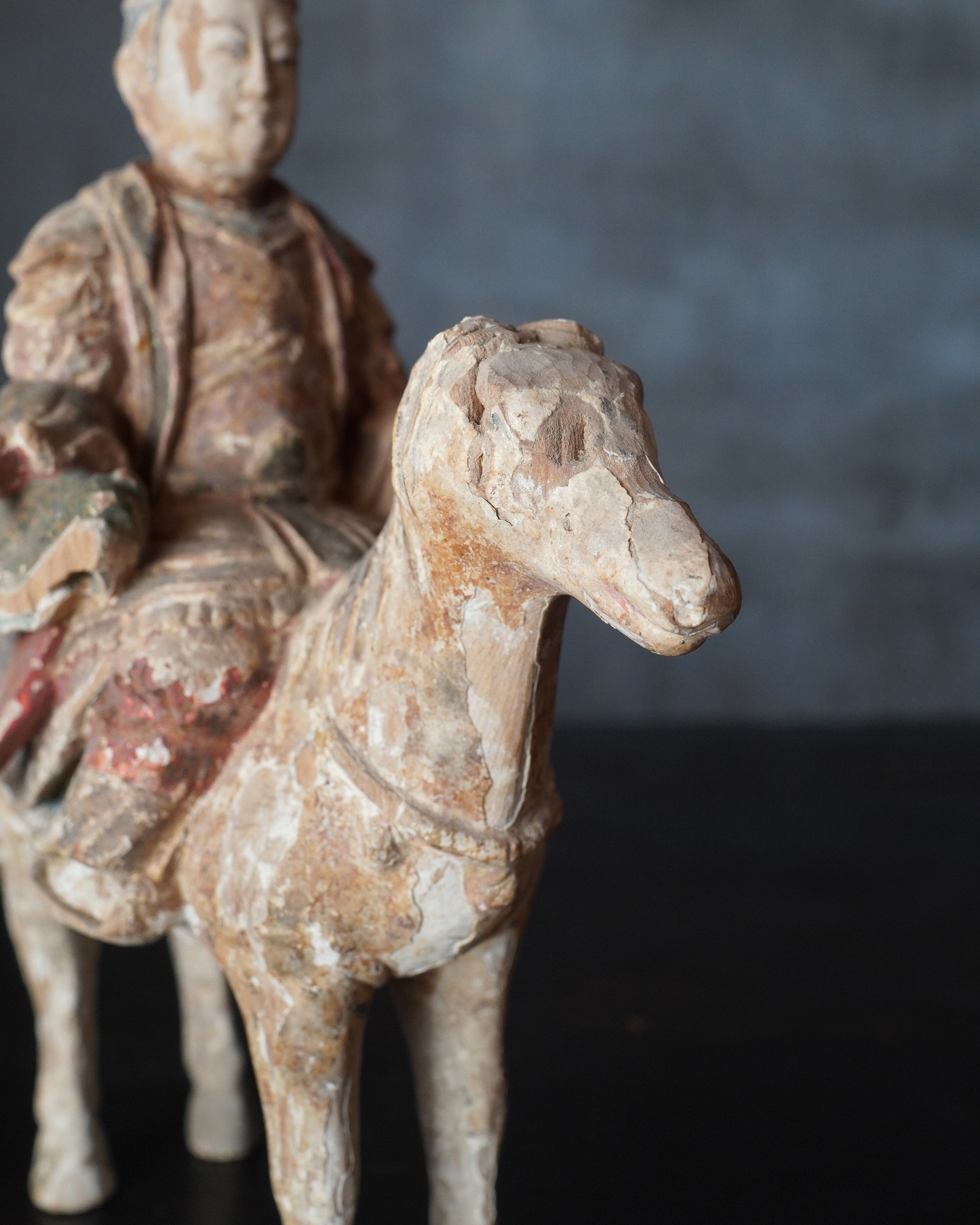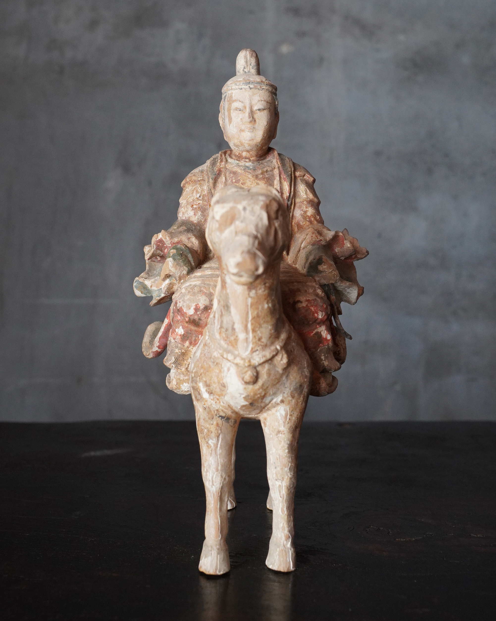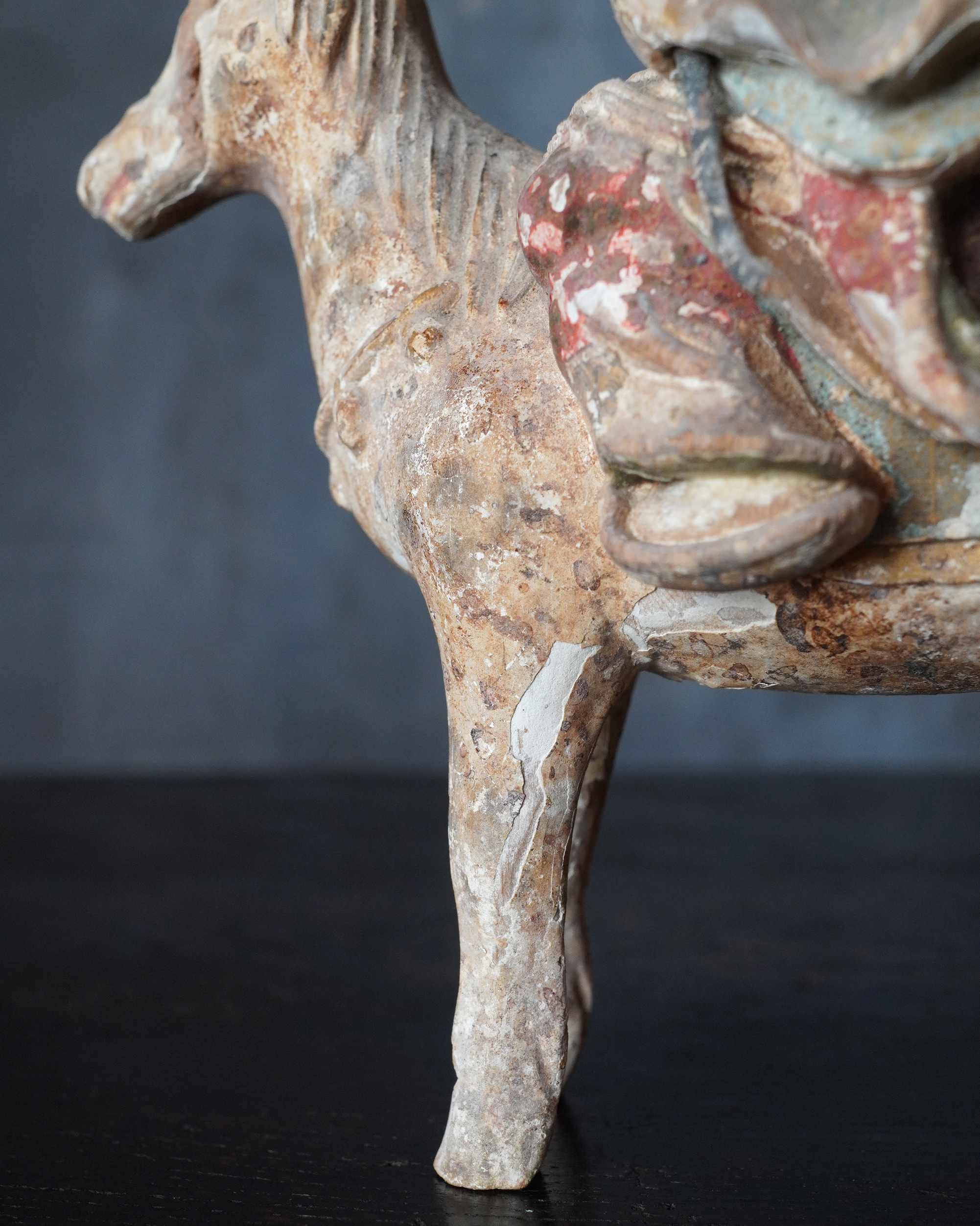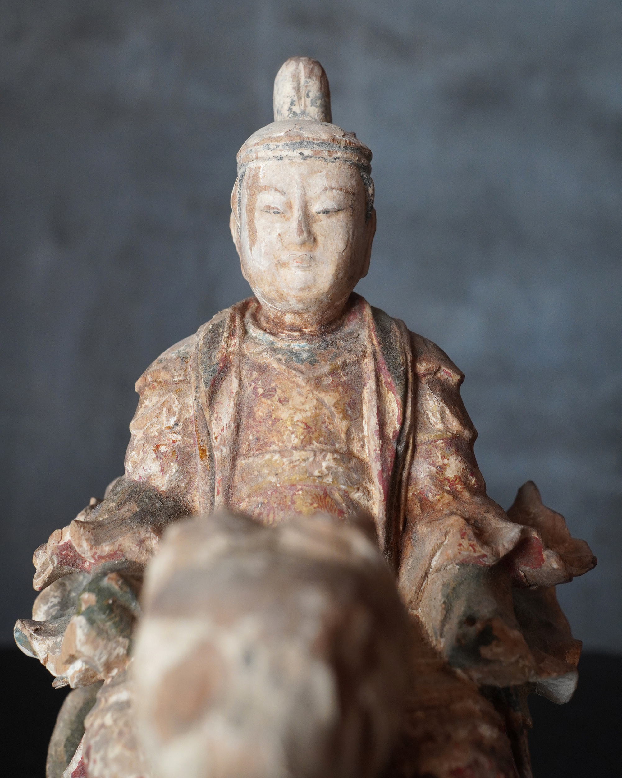馬上に威儀を正して坐す勝軍地蔵像。通常は甲冑姿の作例が多い中、本像は束帯を纏う姿で、地蔵としての相よりもむしろ神格に寄せた表現と受け取れます。当初の鮮やかな彩色は経年により失われ、胡粉の柔らかな白が浮かび上がることで、いっそう神像的な気配を醸しております。