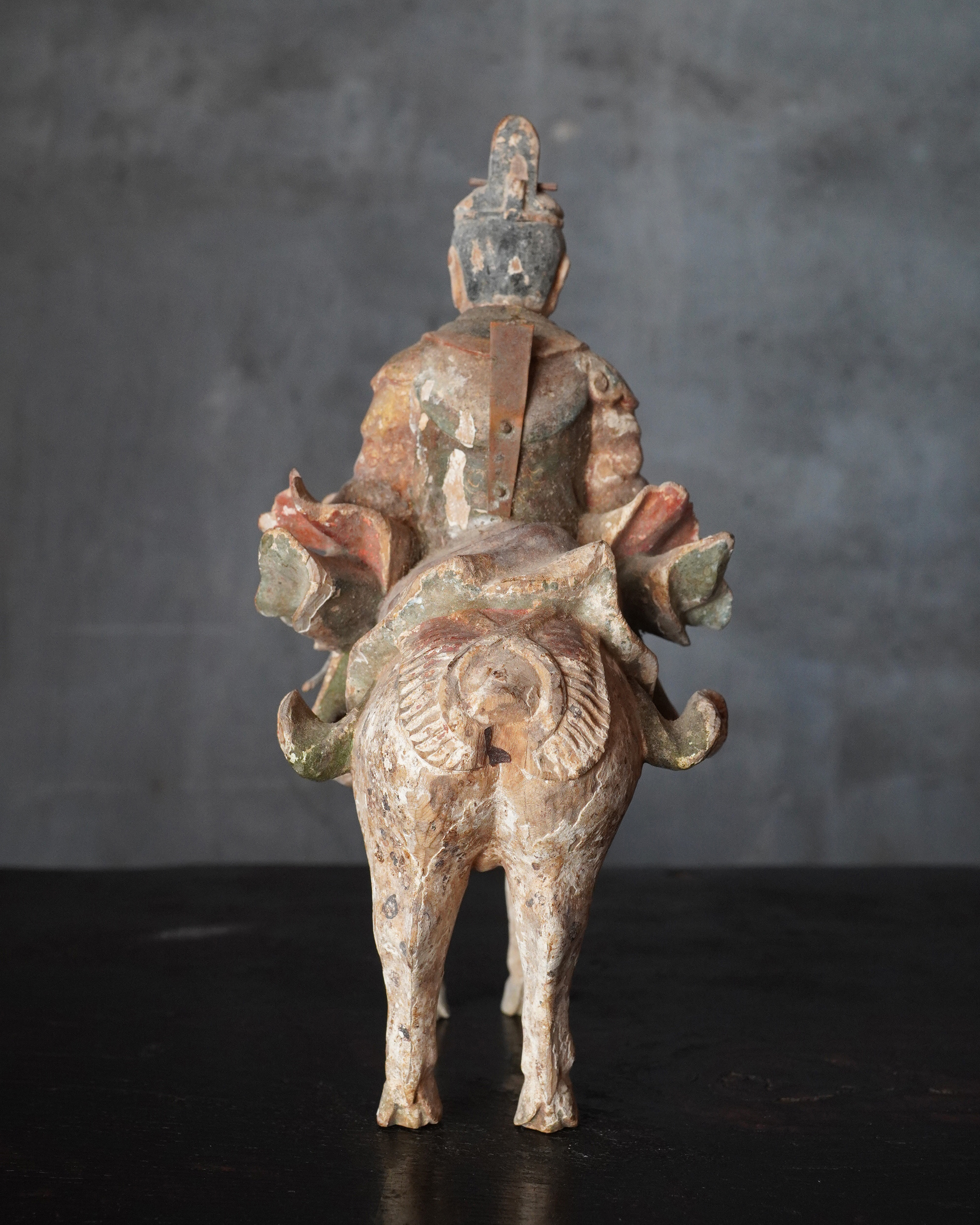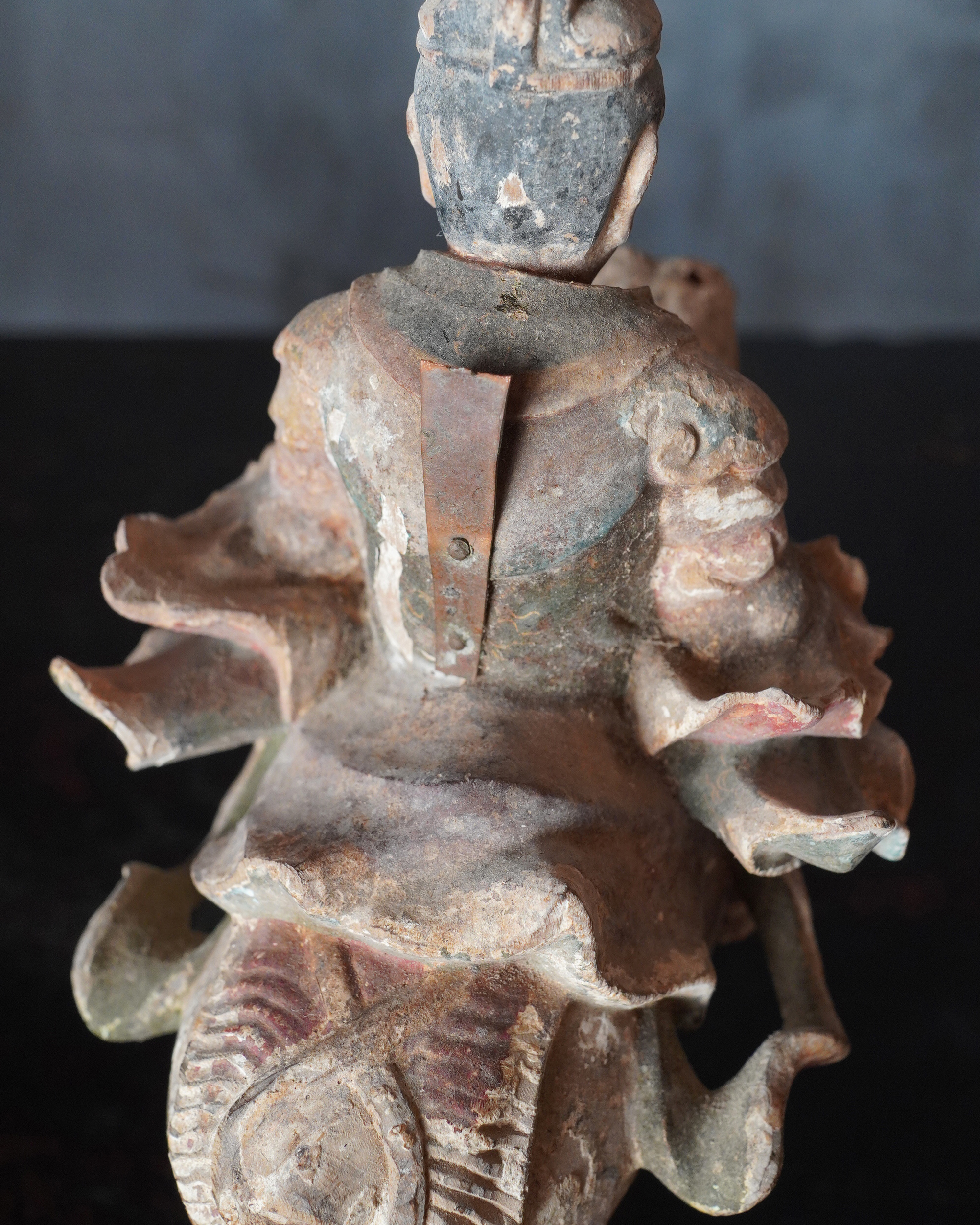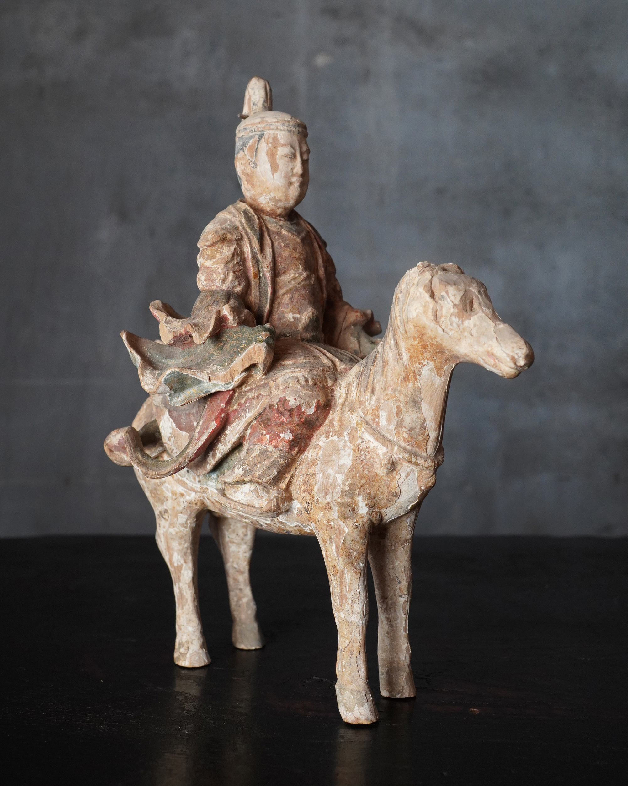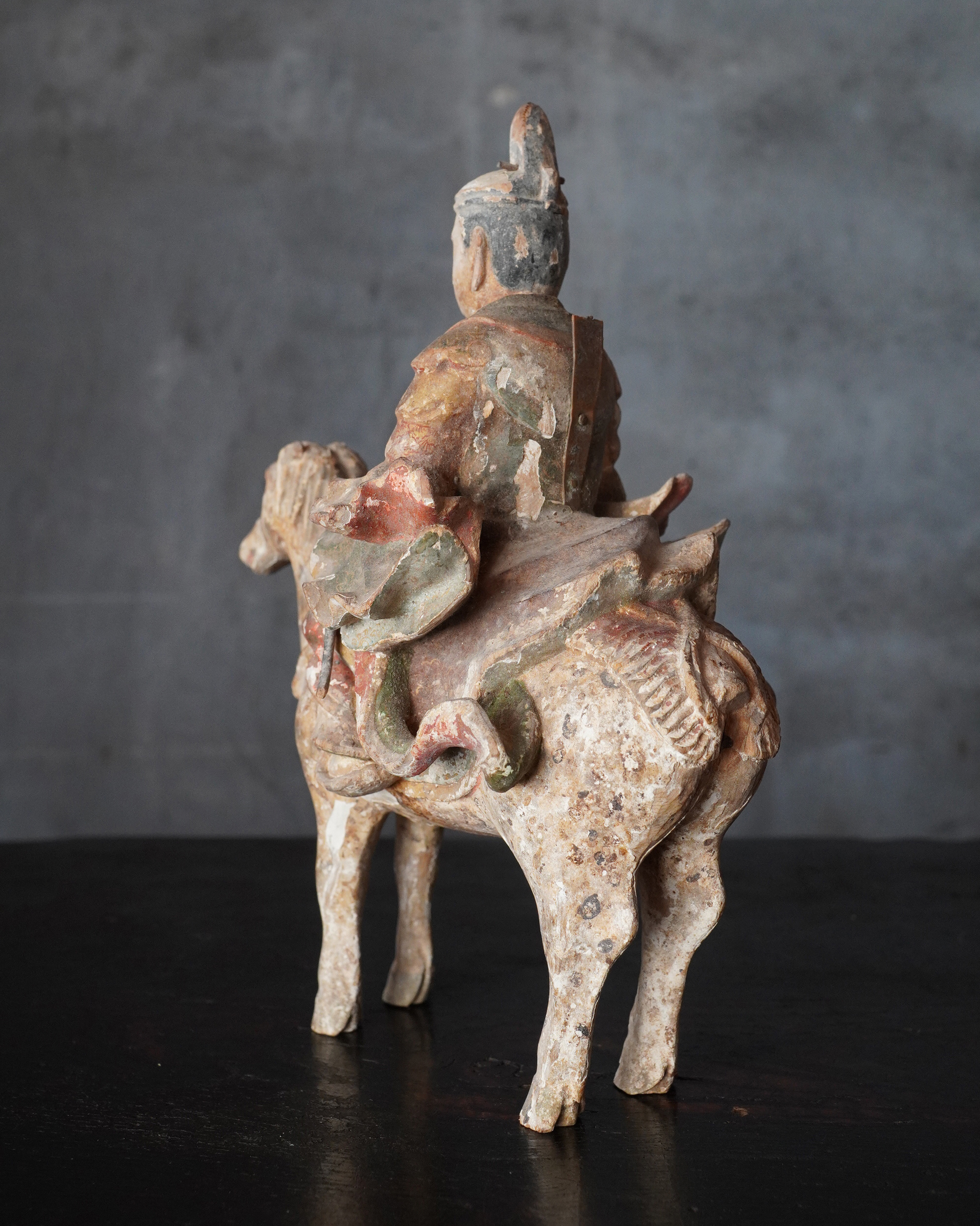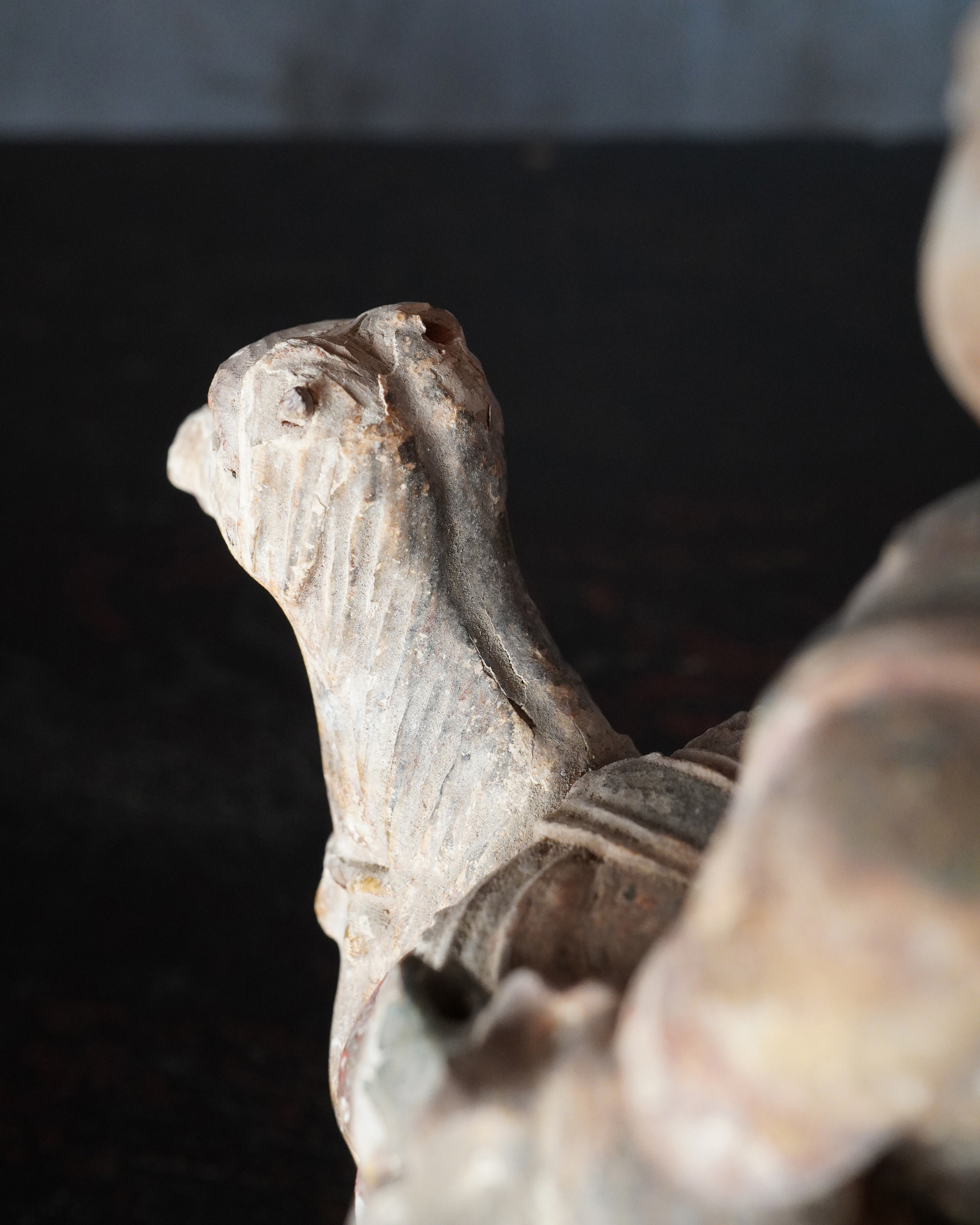馬上に威儀を正して坐す勝軍地蔵像。通常は甲冑姿の作例が多い中、本像は束帯を纏う姿で、地蔵としての相よりもむしろ神格に寄せた表現と受け取れます。当初の鮮やかな彩色は経年により失われ、胡粉の柔らかな白が浮かび上がることで、いっそう神像的な気配を醸しております。