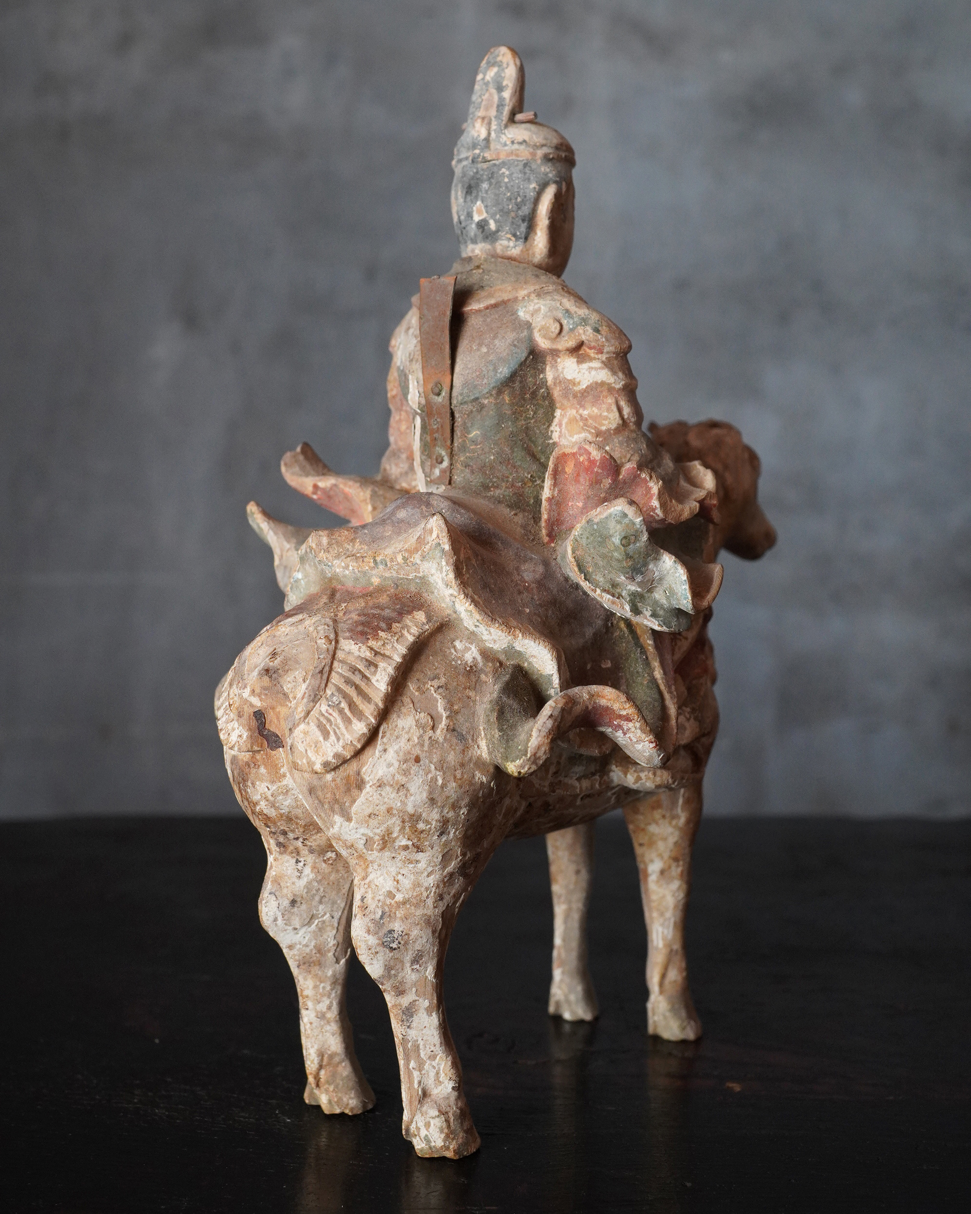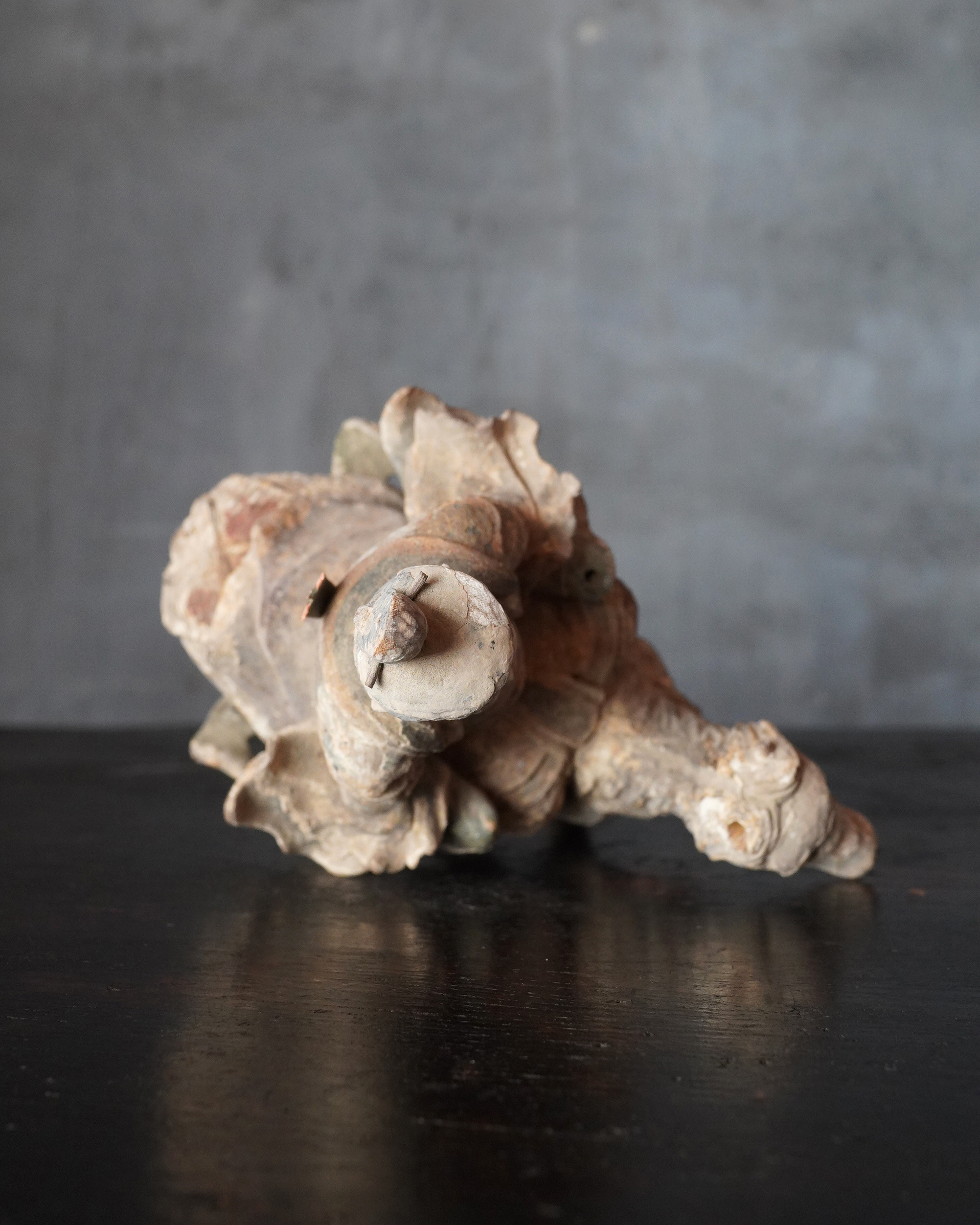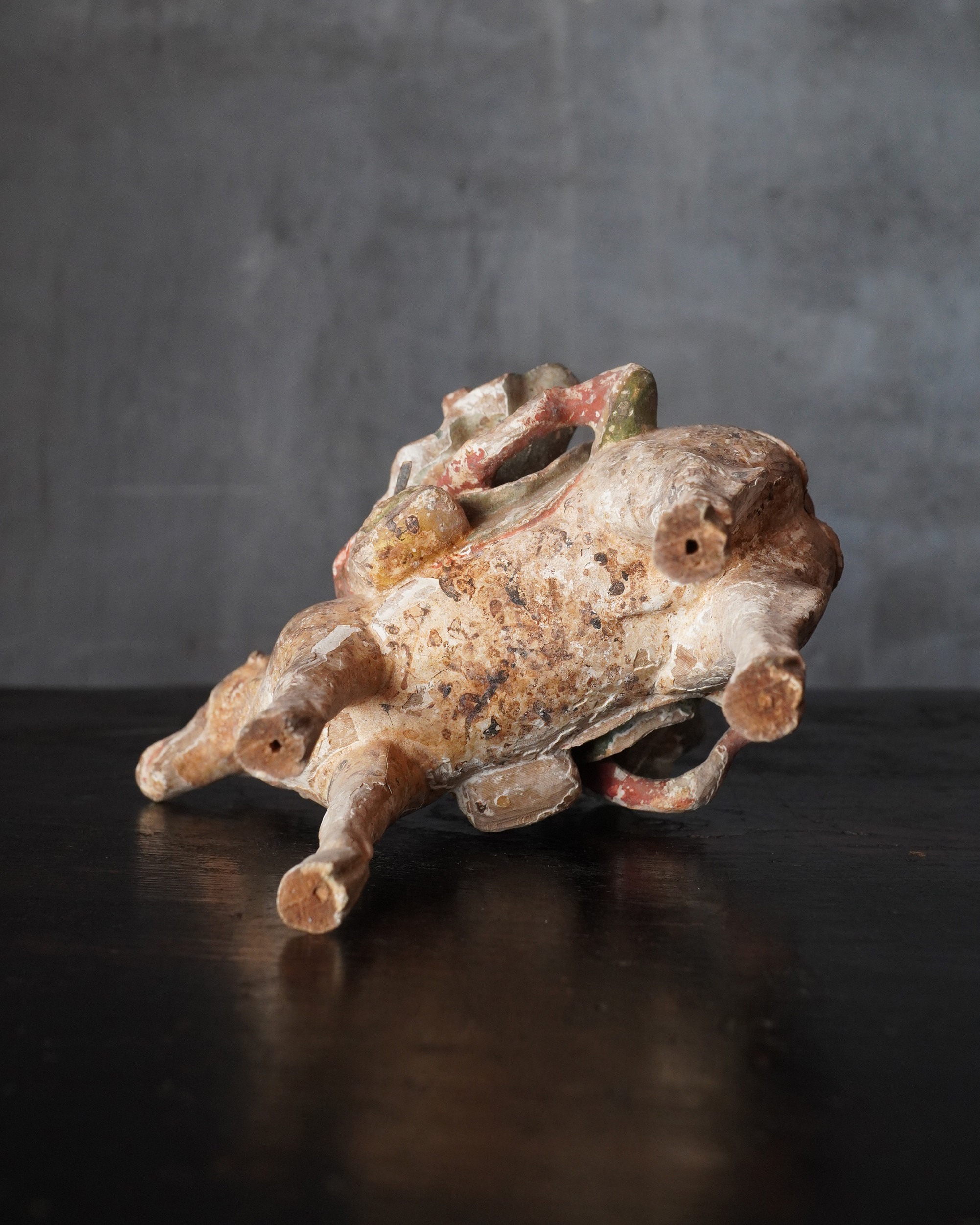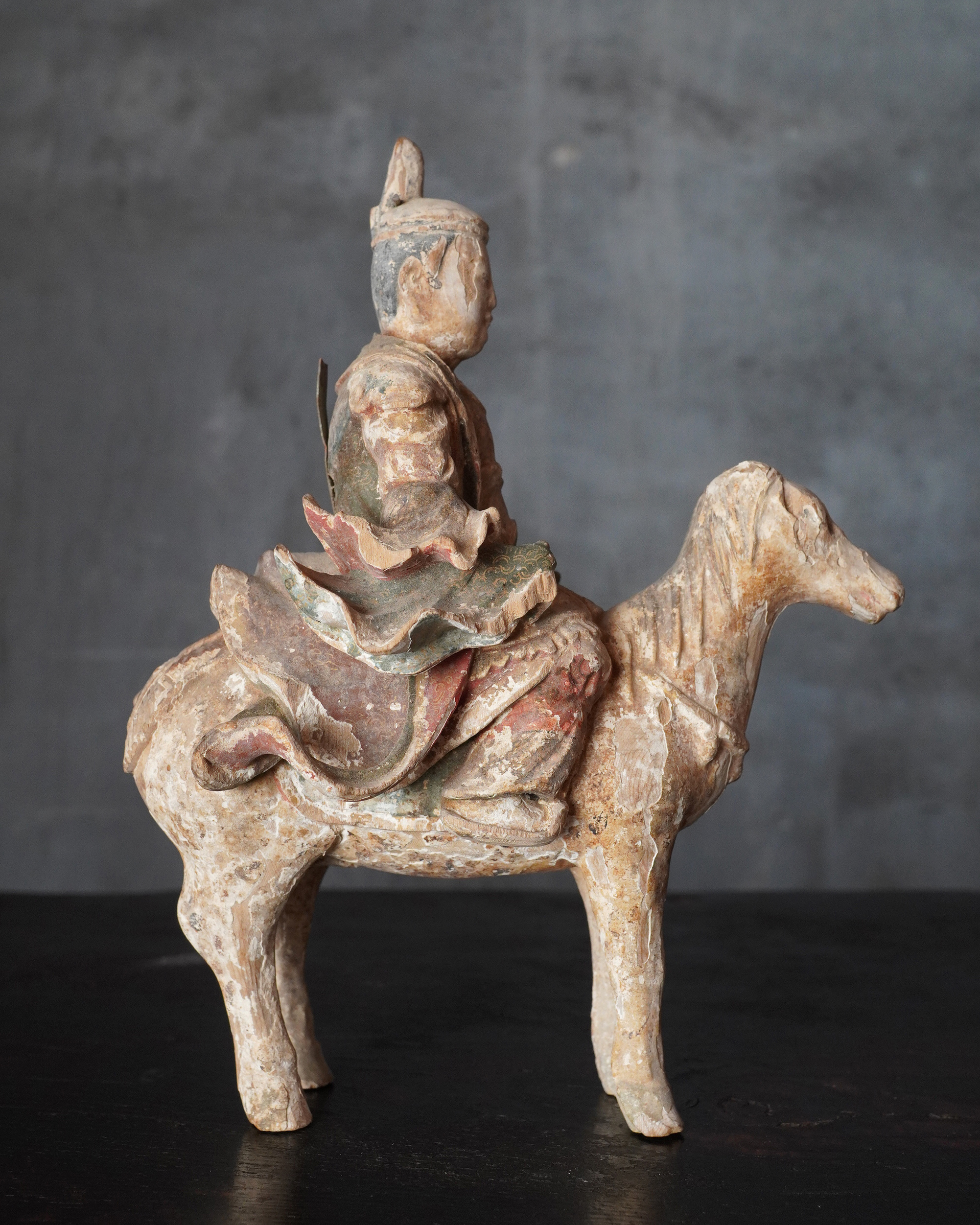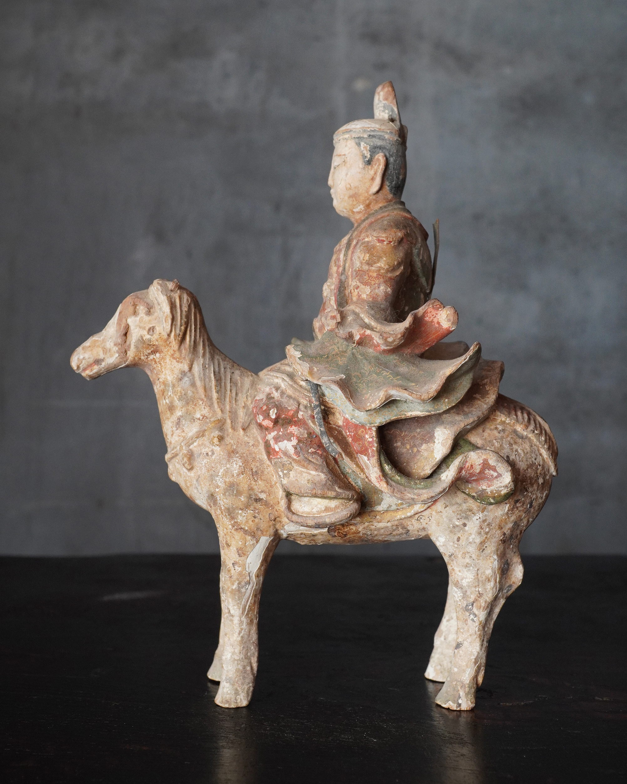 馬上に威儀を正して坐す勝軍地蔵像。通常は甲冑姿の作例が多い中、本像は束帯を纏う姿で、地蔵としての相よりもむしろ神格に寄せた表現と受け取れます。当初の鮮やかな彩色は経年により失われ、胡粉の柔らかな白が浮かび上がることで、いっそう神像的な気配を醸しております。