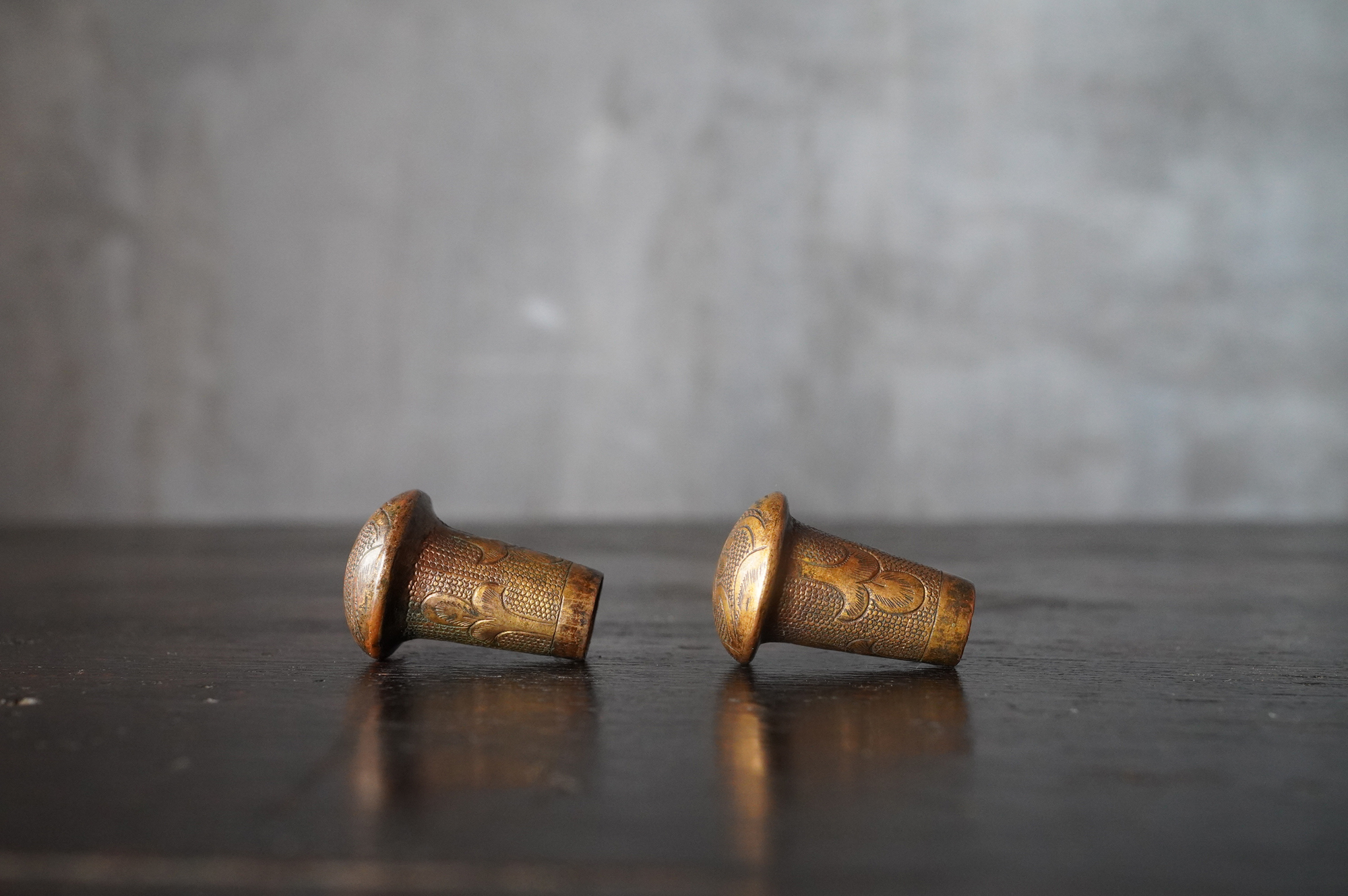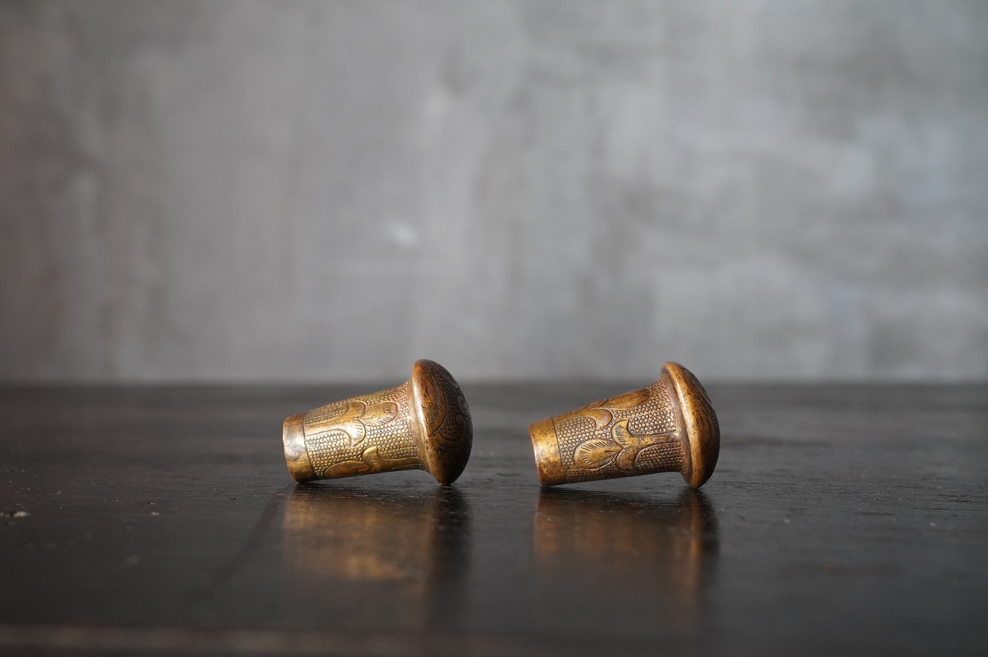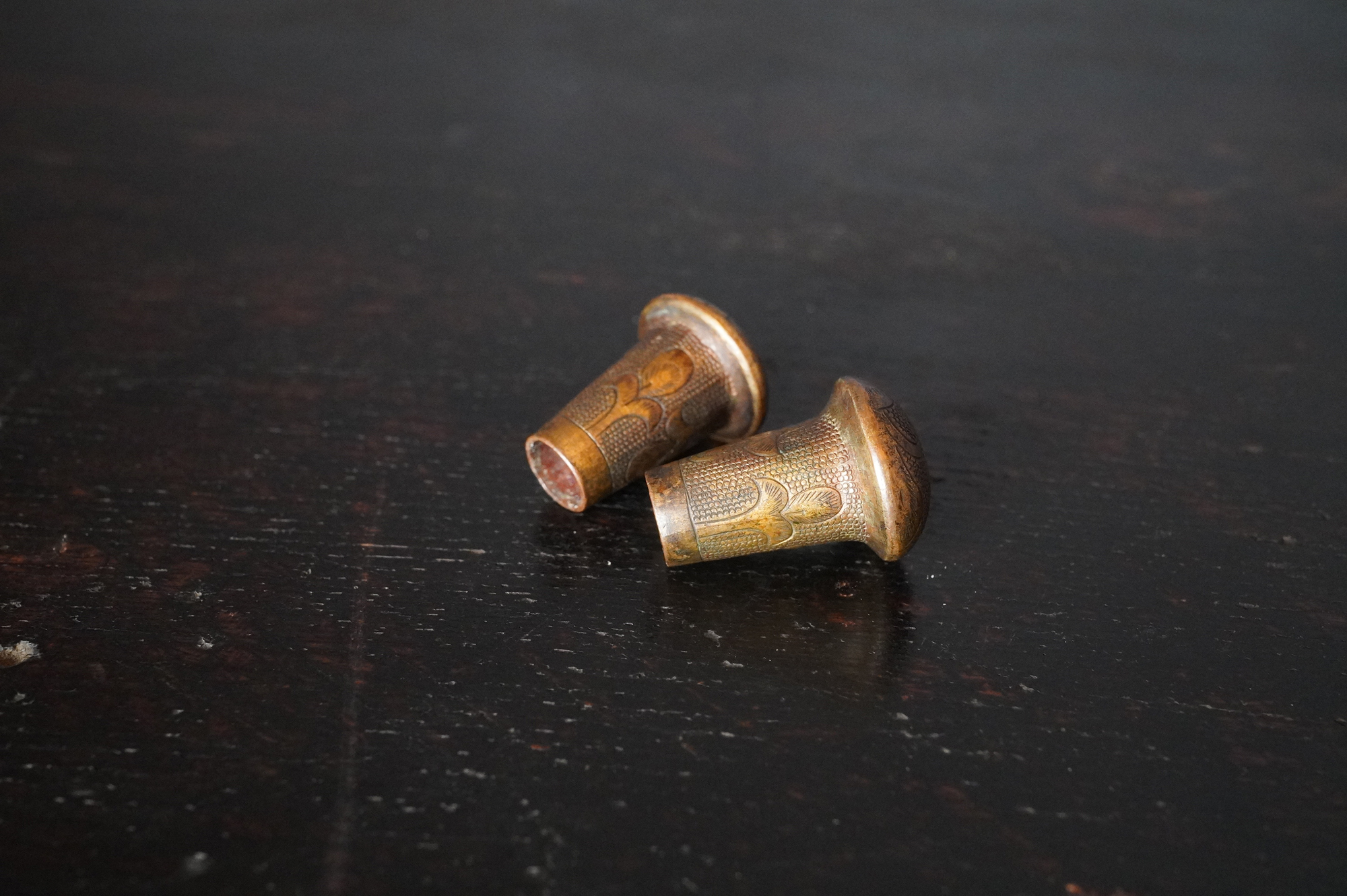 経巻の両端を飾った金銅軸首で、頭部中央には端正な四弁の宝相華を刻み、その周囲を繊細な蕨文が巡ります。側面には三つ葉文を中心に、地を埋めるように魚々子が精緻に施され、まさに中尊寺経に付随した作例に比肩するものです。院政期金工の気品を伝える品。箱はありません。平安後期。