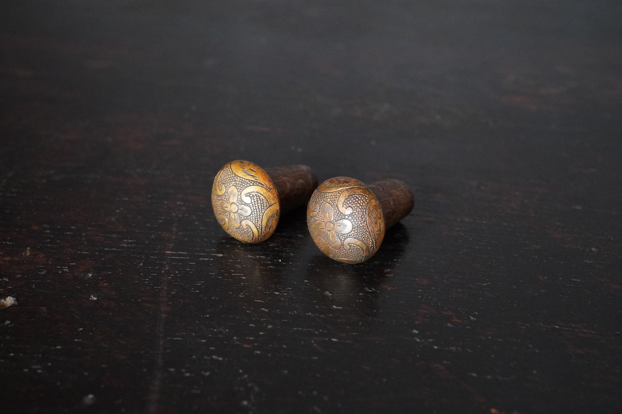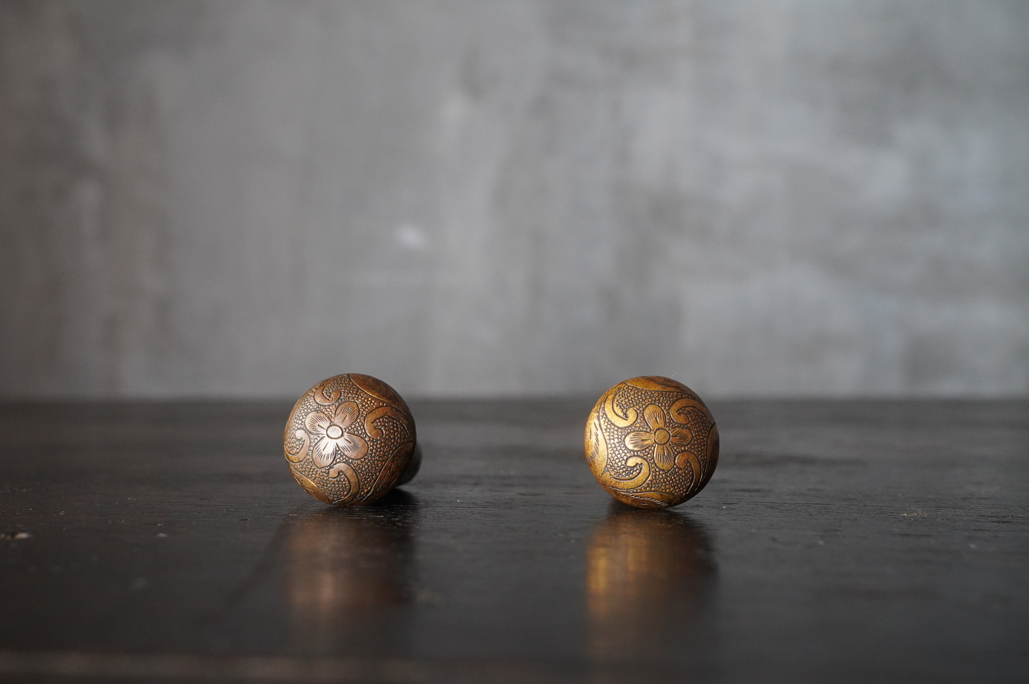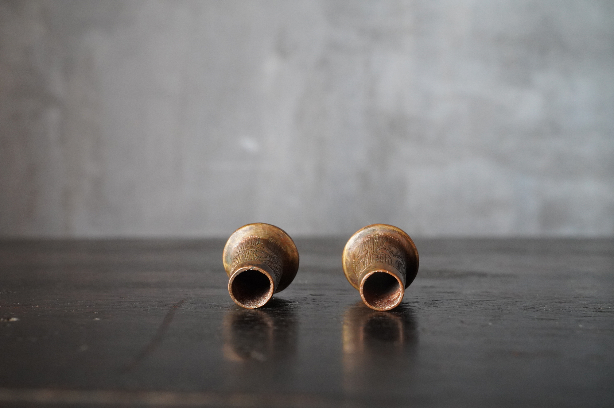 経巻の両端を飾った金銅軸首で、頭部中央には端正な四弁の宝相華を刻み、その周囲を繊細な蕨文が巡ります。側面には三つ葉文を中心に、地を埋めるように魚々子が精緻に施され、まさに中尊寺経に付随した作例に比肩するものです。院政期金工の気品を伝える品。箱はありません。平安後期。