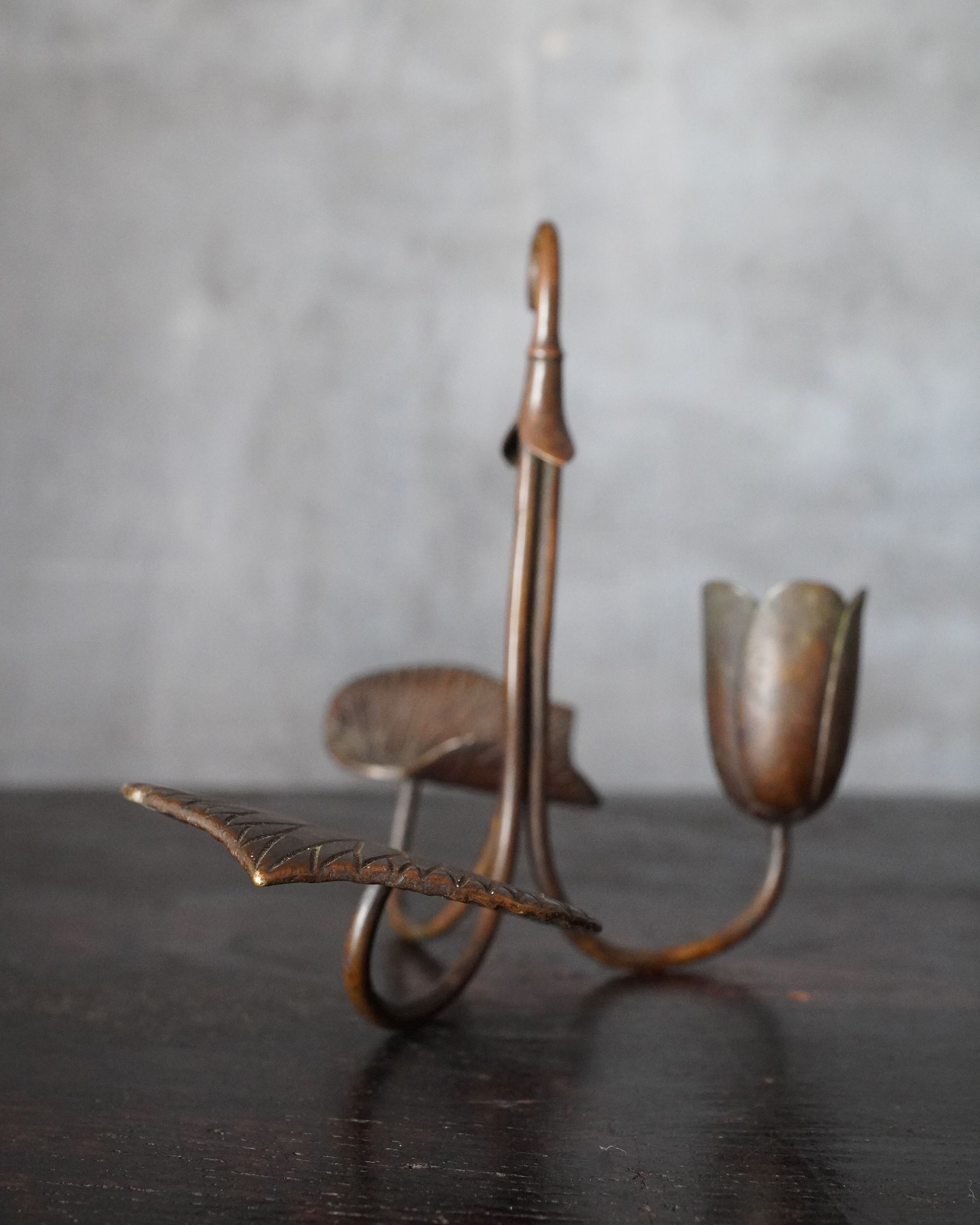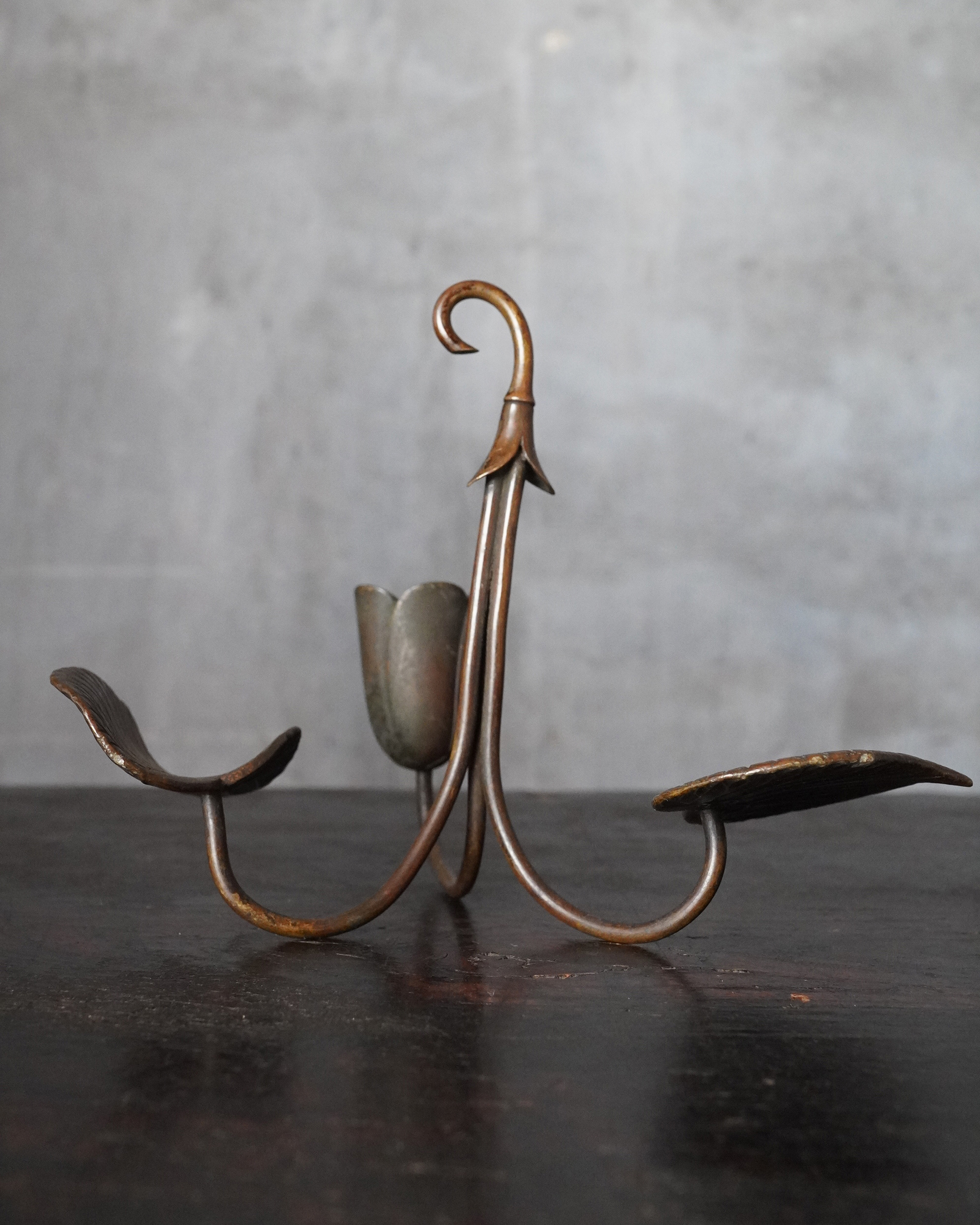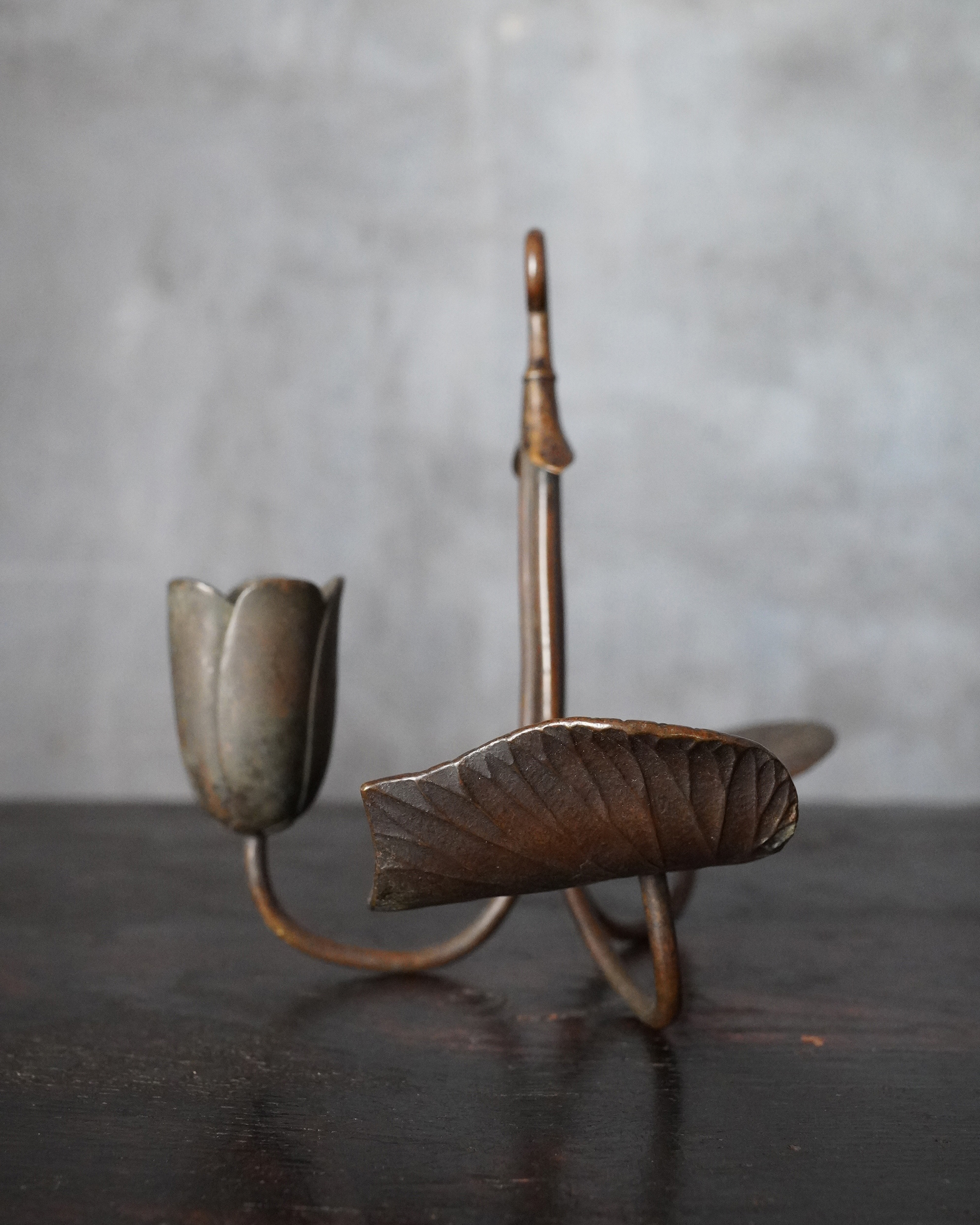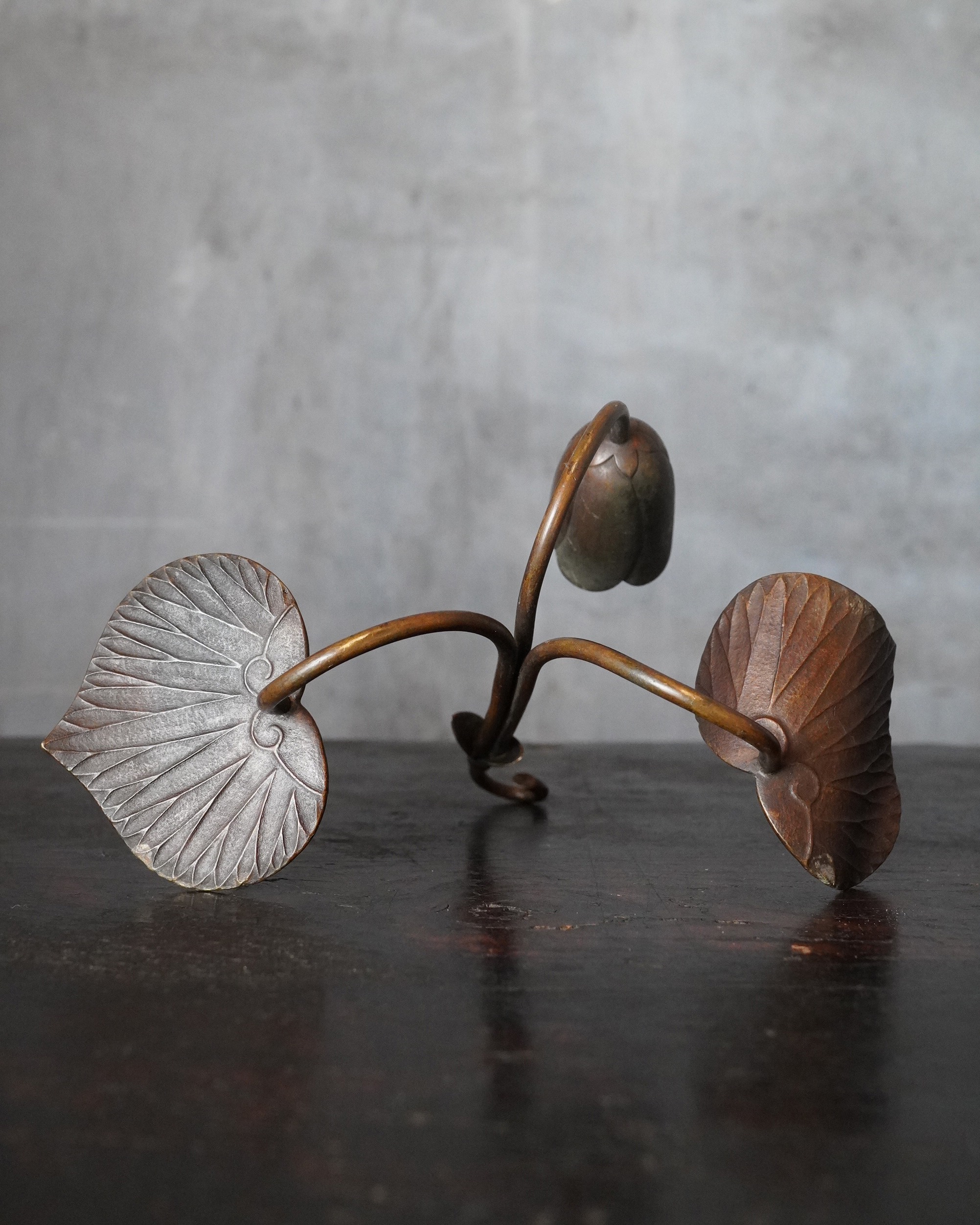 蓮華をかたどった銅製の掛燭台で、華奢にして繊細な細工が魅力の一品。蝋燭を差し込む受けの造作は欧州製品に見られる意匠を踏襲しており、どこかアール・ヌーヴォーの香りを漂わせますが、蓮の表現や全体のまとまり、小品ならではの品格は明治〜大正期の日本の金工のように感じます。