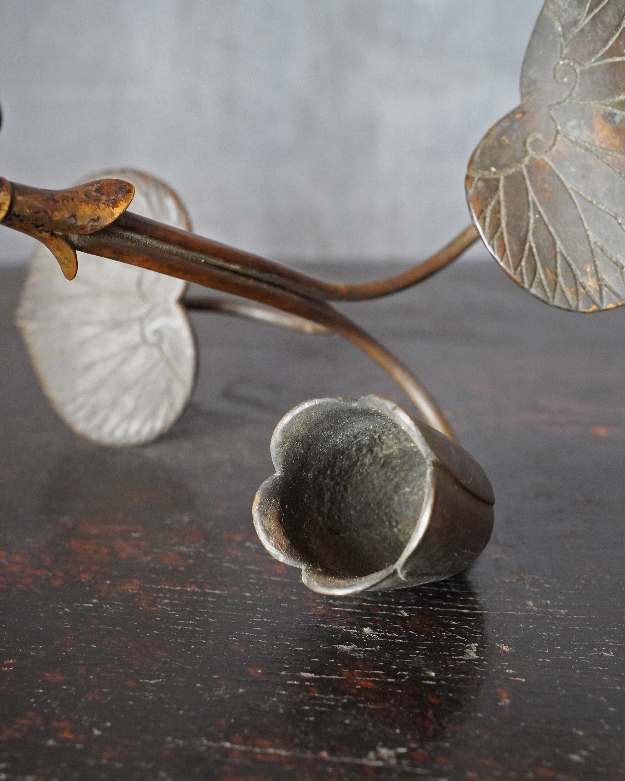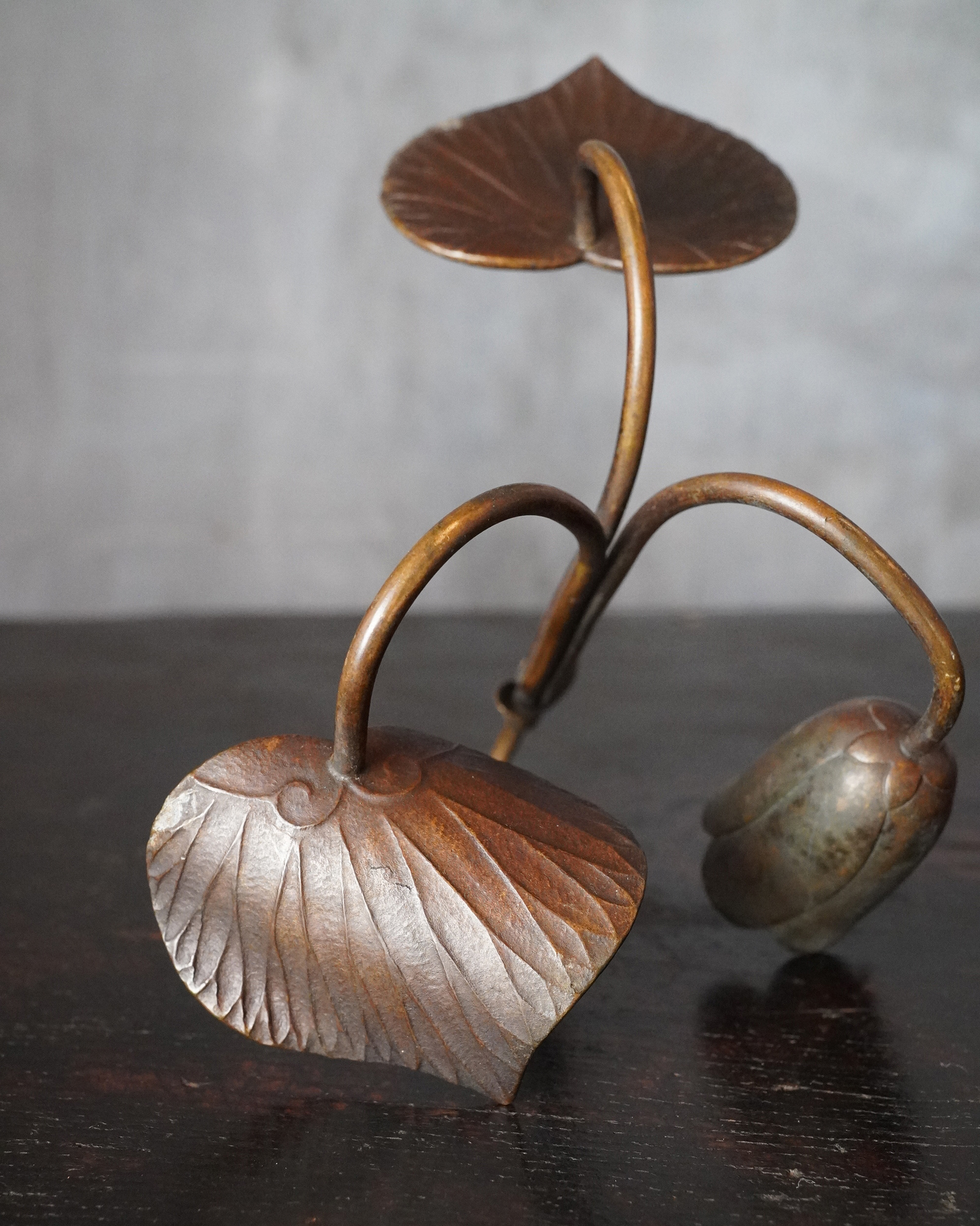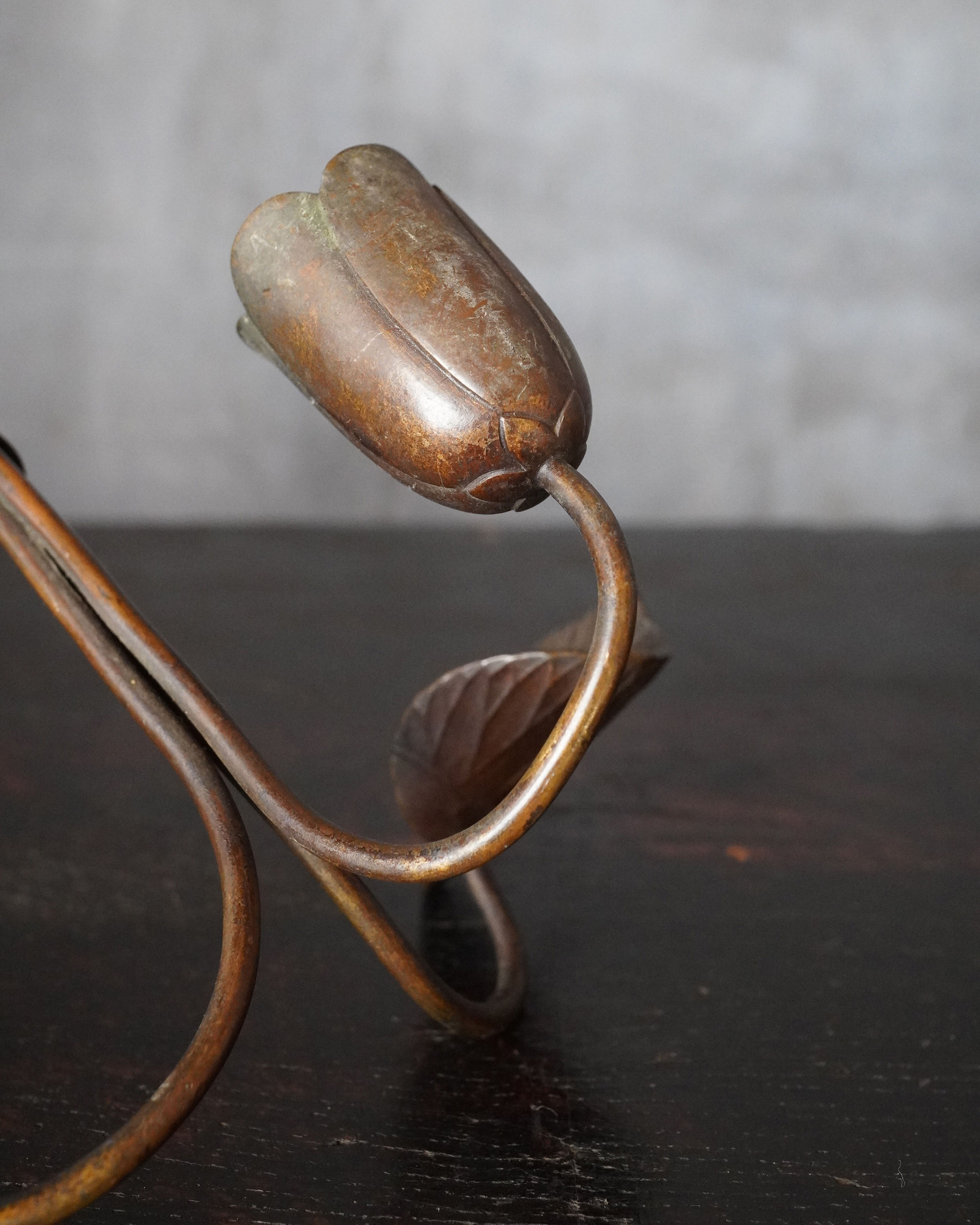 蓮華をかたどった銅製の掛燭台で、華奢にして繊細な細工が魅力の一品。蝋燭を差し込む受けの造作は欧州製品に見られる意匠を踏襲しており、どこかアール・ヌーヴォーの香りを漂わせますが、蓮の表現や全体のまとまり、小品ならではの品格は明治〜大正期の日本の金工のように感じます。