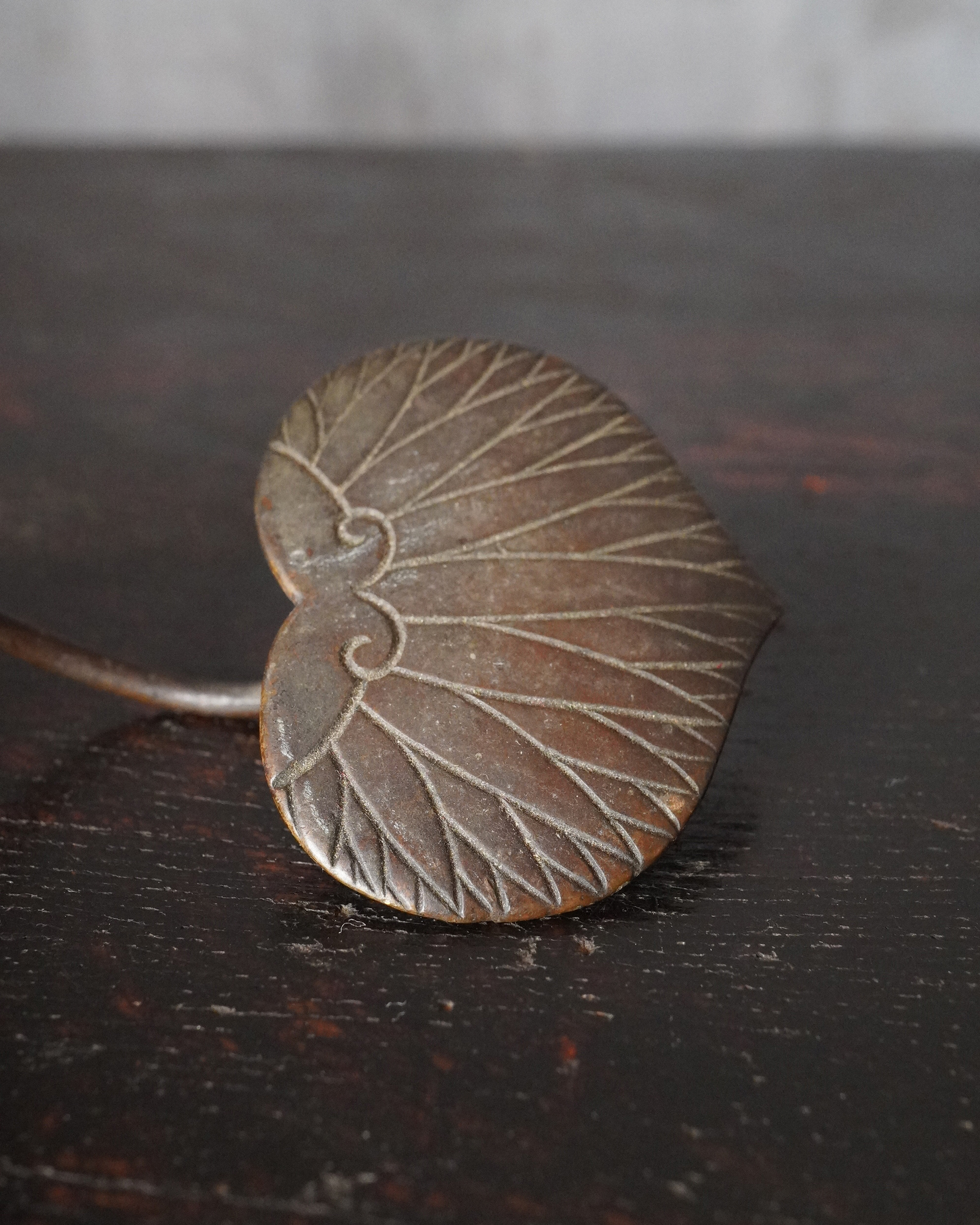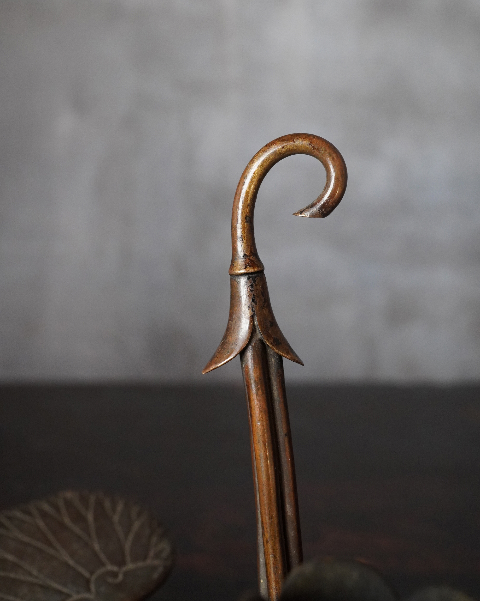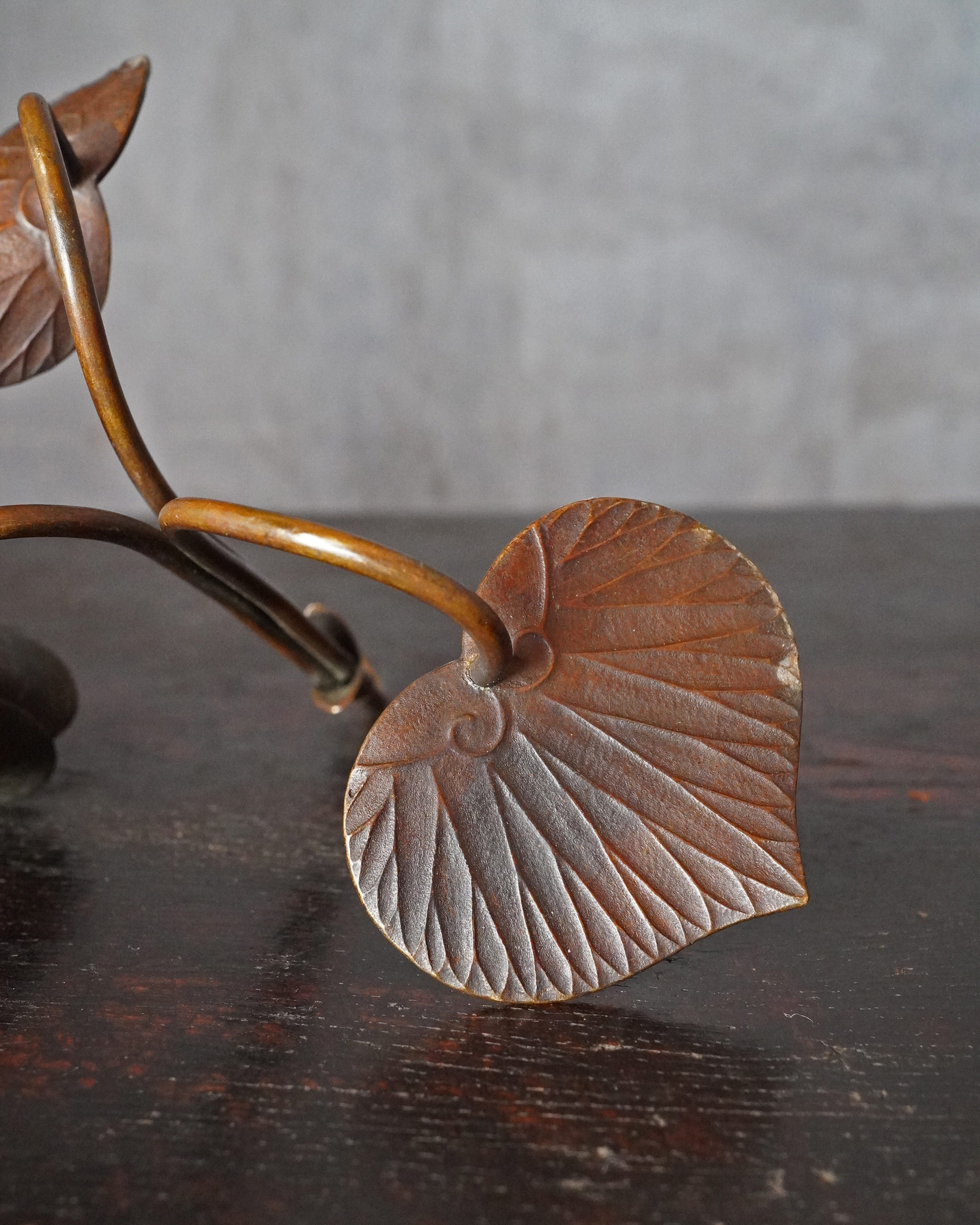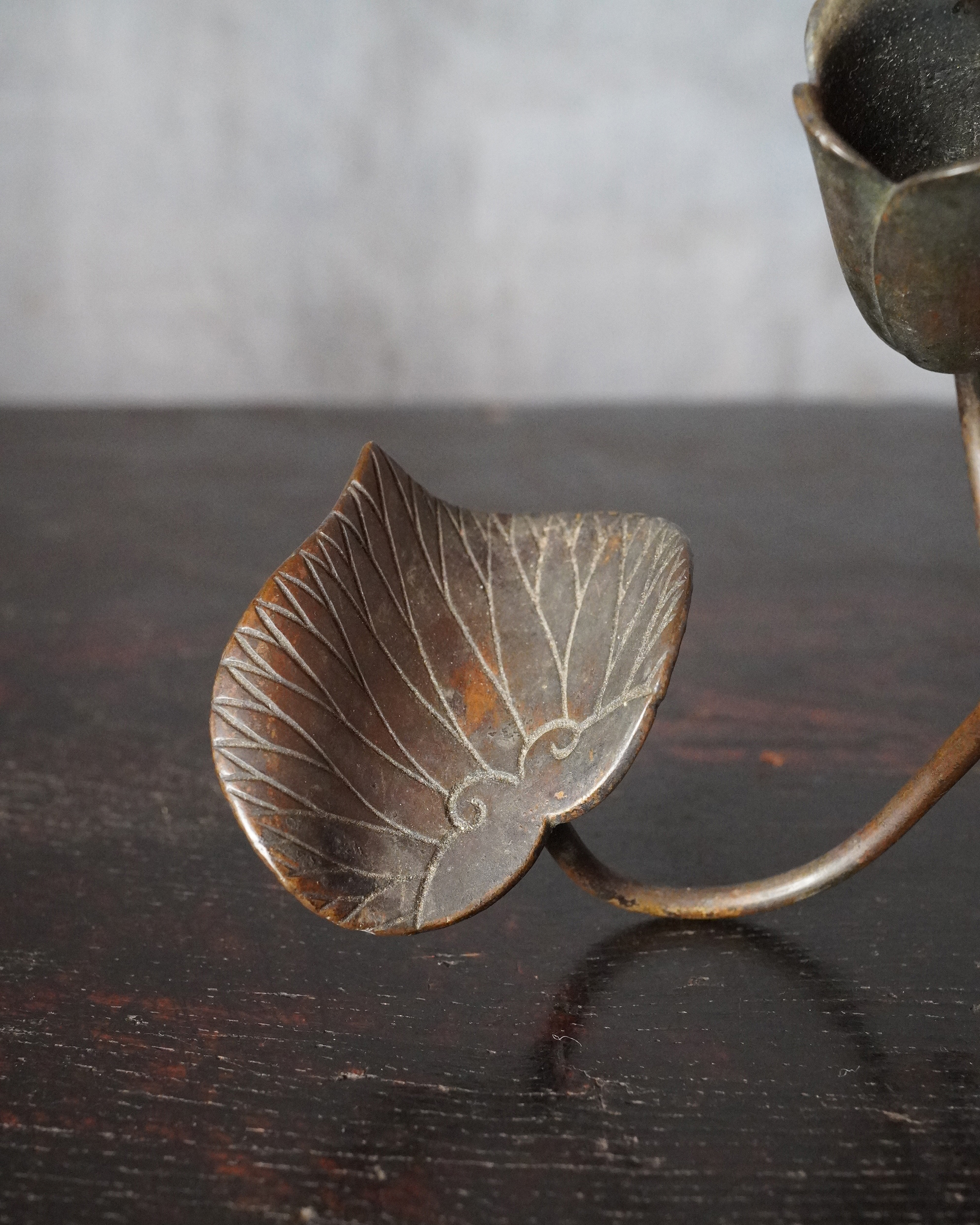 蓮華をかたどった銅製の掛燭台で、華奢にして繊細な細工が魅力の一品。蝋燭を差し込む受けの造作は欧州製品に見られる意匠を踏襲しており、どこかアール・ヌーヴォーの香りを漂わせますが、蓮の表現や全体のまとまり、小品ならではの品格は明治〜大正期の日本の金工のように感じます。