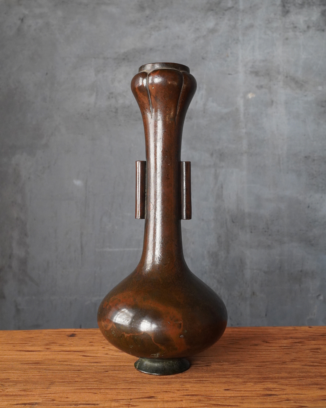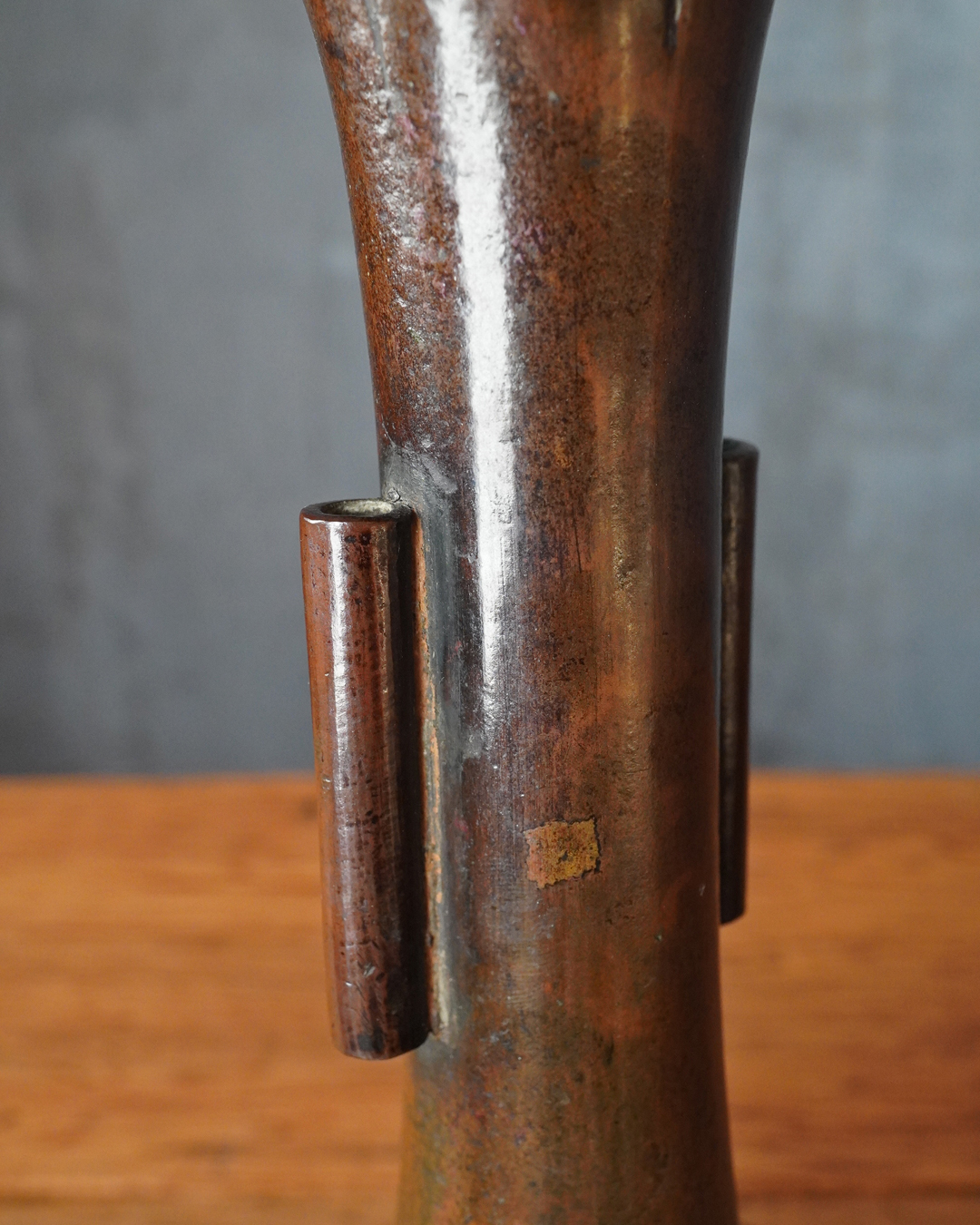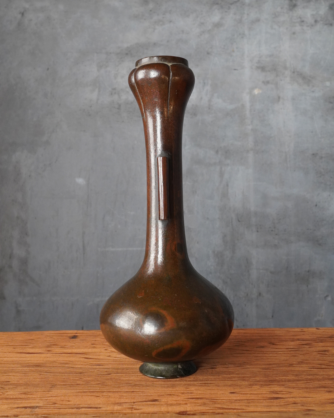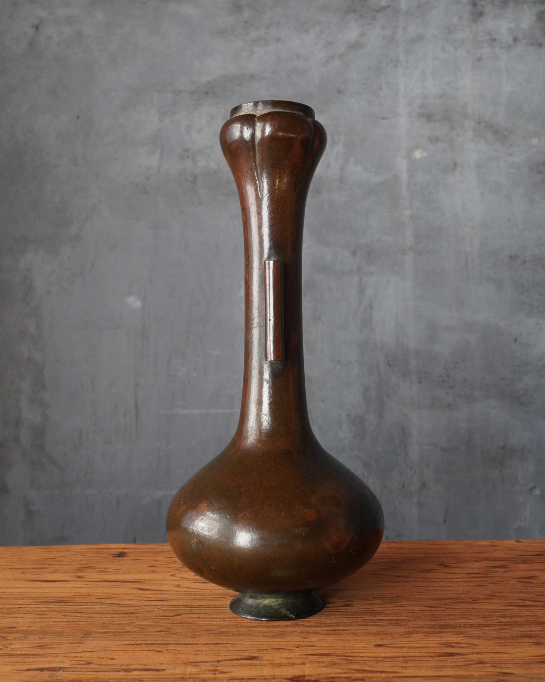 時代を重ねた胡銅の艶やかな肌合いが実に味わい深い花入。控えめで締まりのある小さな高台は古格をよく示し、全体にやや硬質な銅味からも唐物花入としての風格が感じられます。