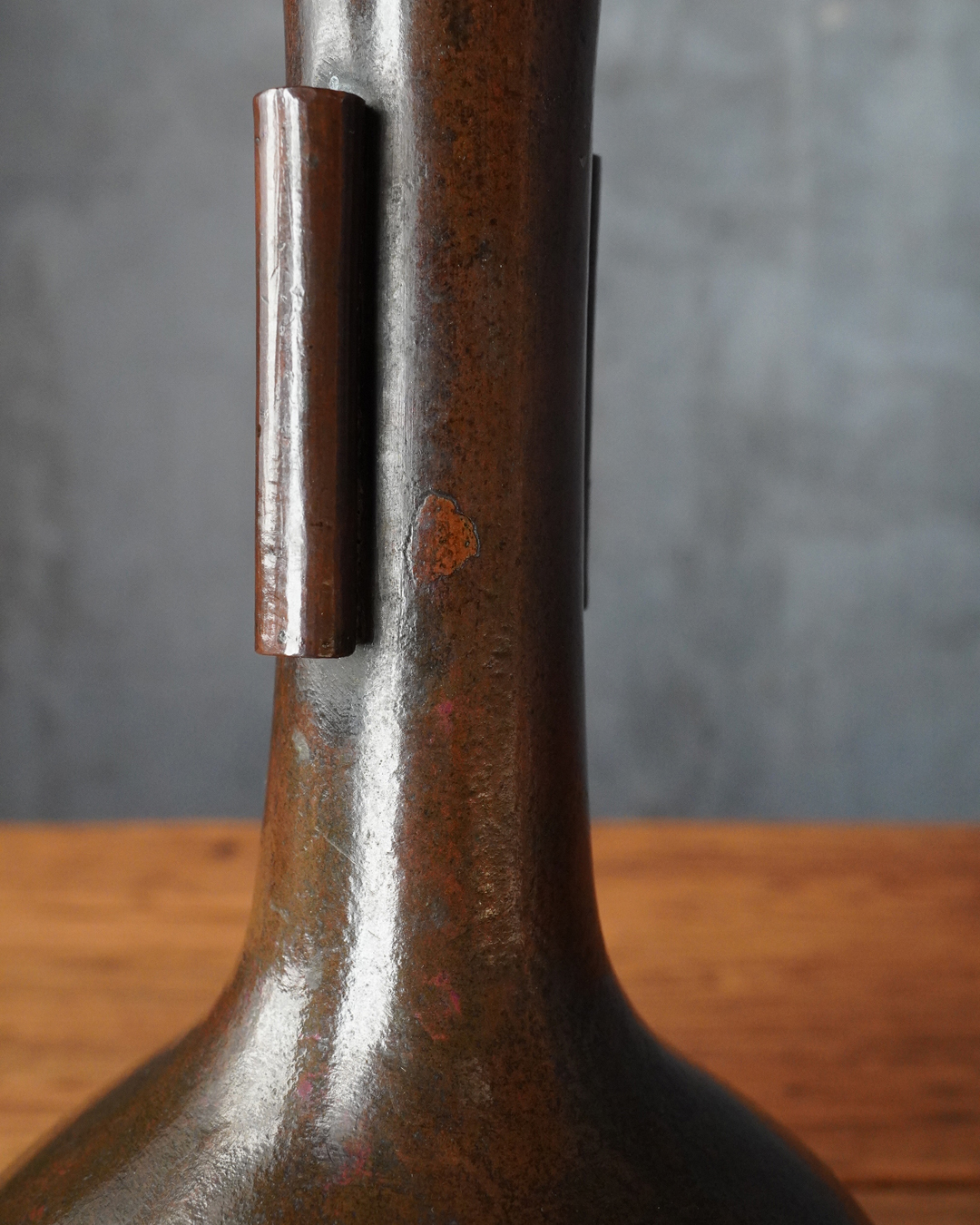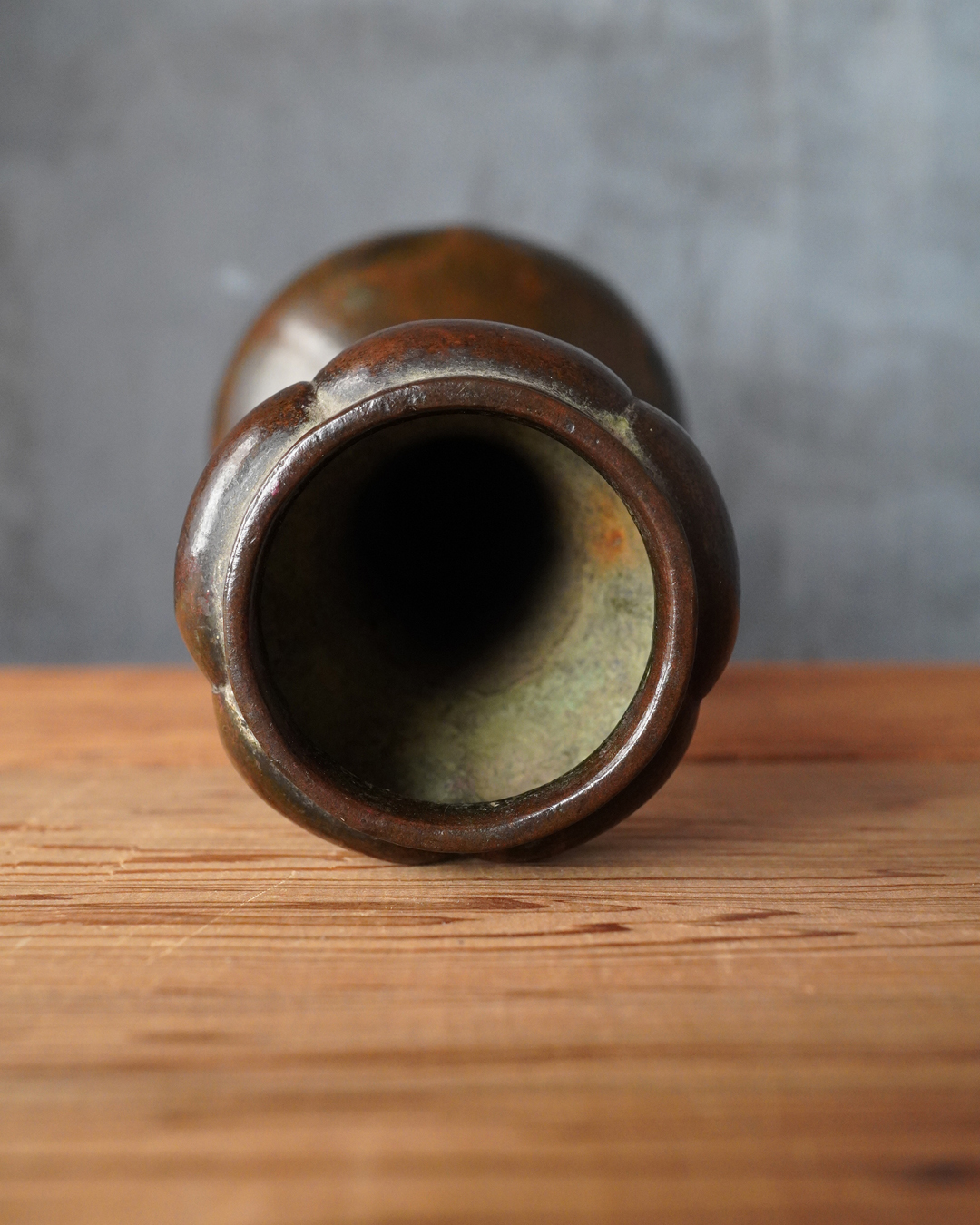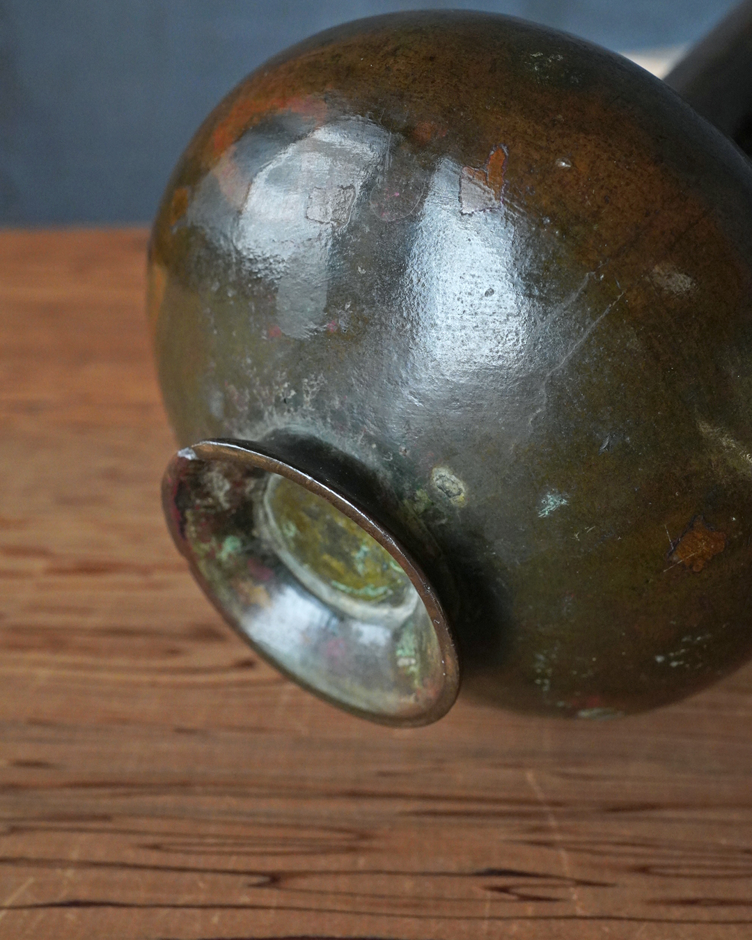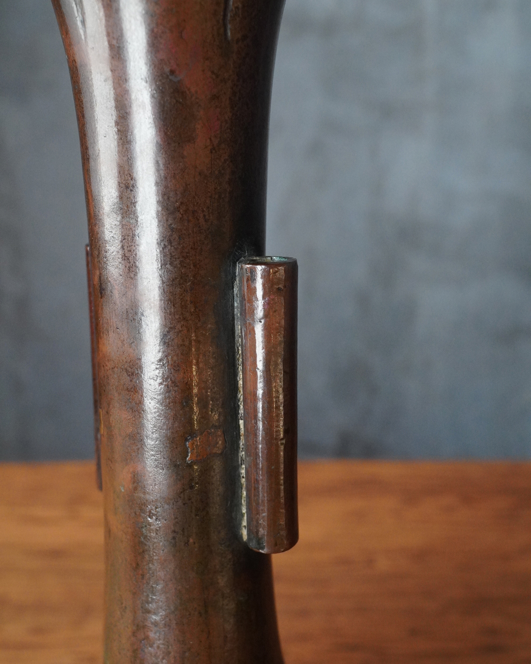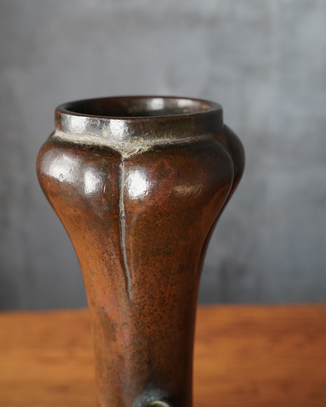 時代を重ねた胡銅の艶やかな肌合いが実に味わい深い花入。控えめで締まりのある小さな高台は古格をよく示し、全体にやや硬質な銅味からも唐物花入としての風格が感じられます。
