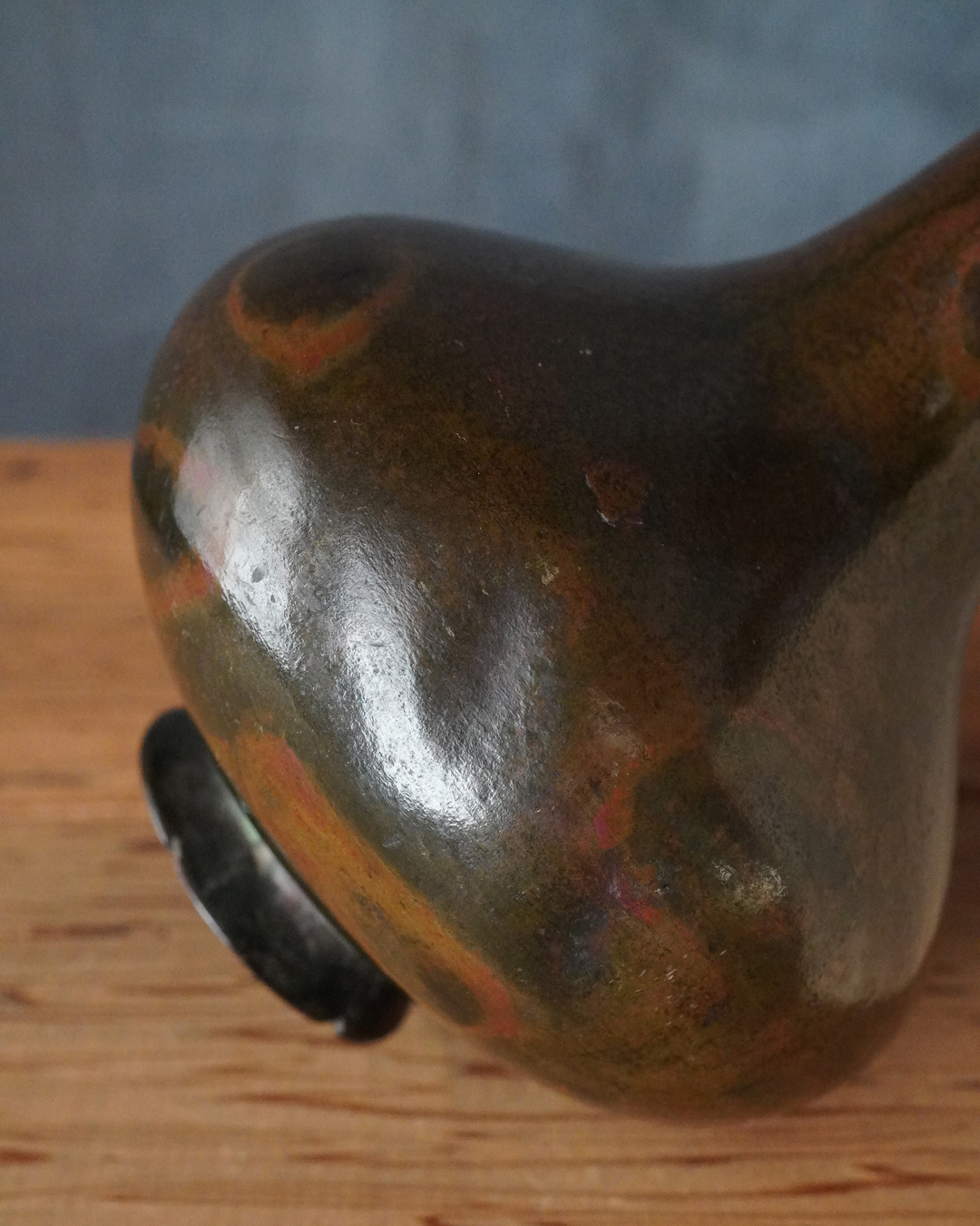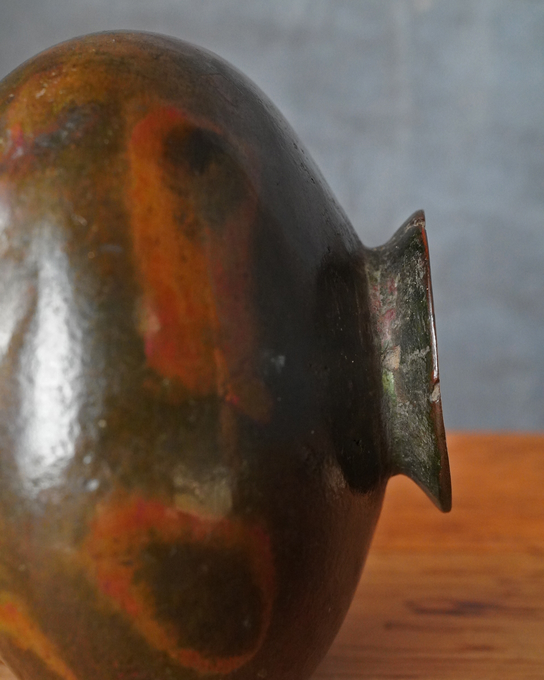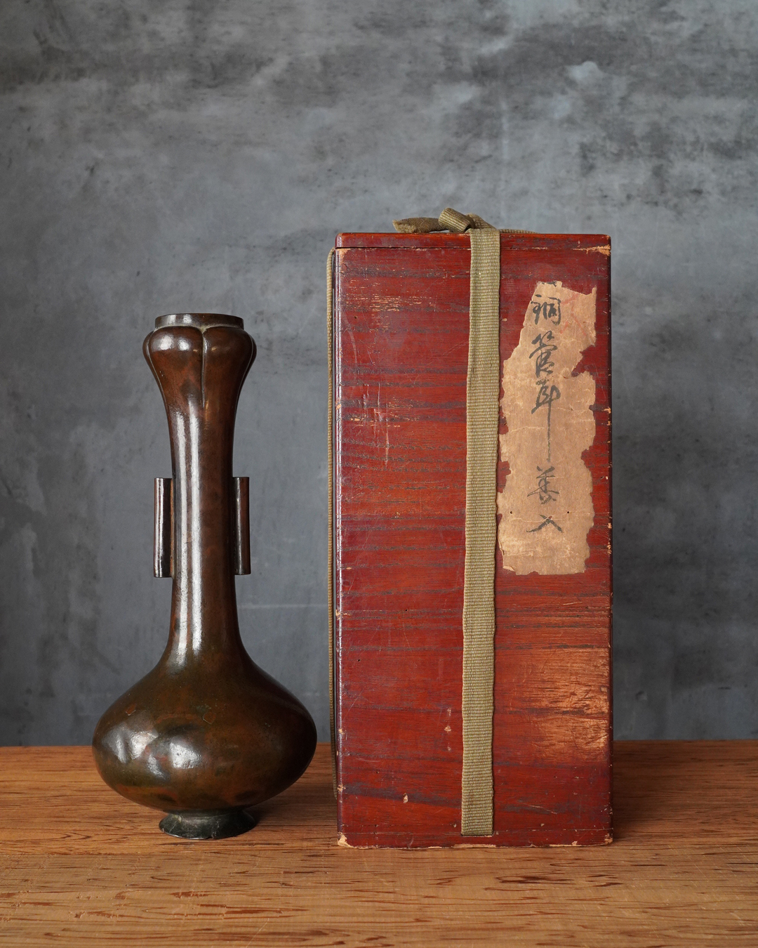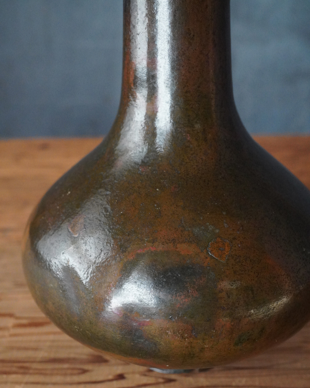 時代を重ねた胡銅の艶やかな肌合いが実に味わい深い花入。控えめで締まりのある小さな高台は古格をよく示し、全体にやや硬質な銅味からも唐物花入としての風格が感じられます。