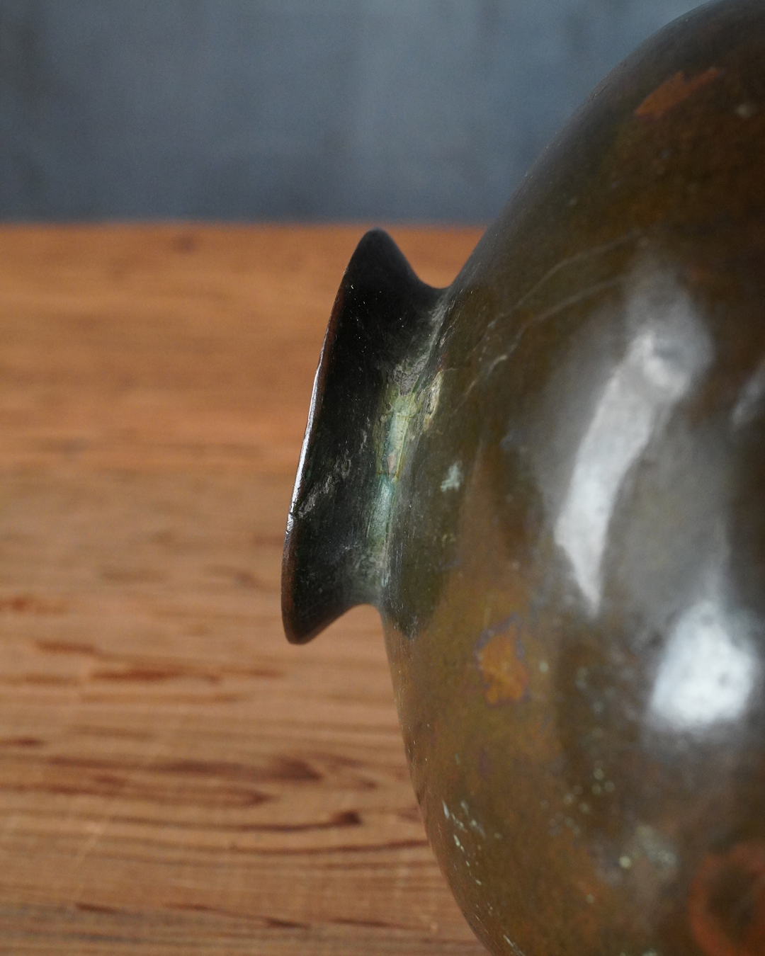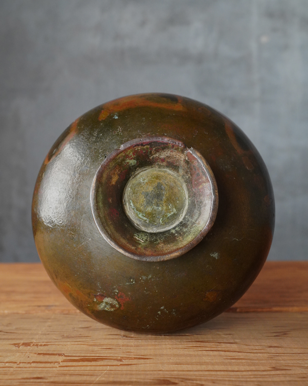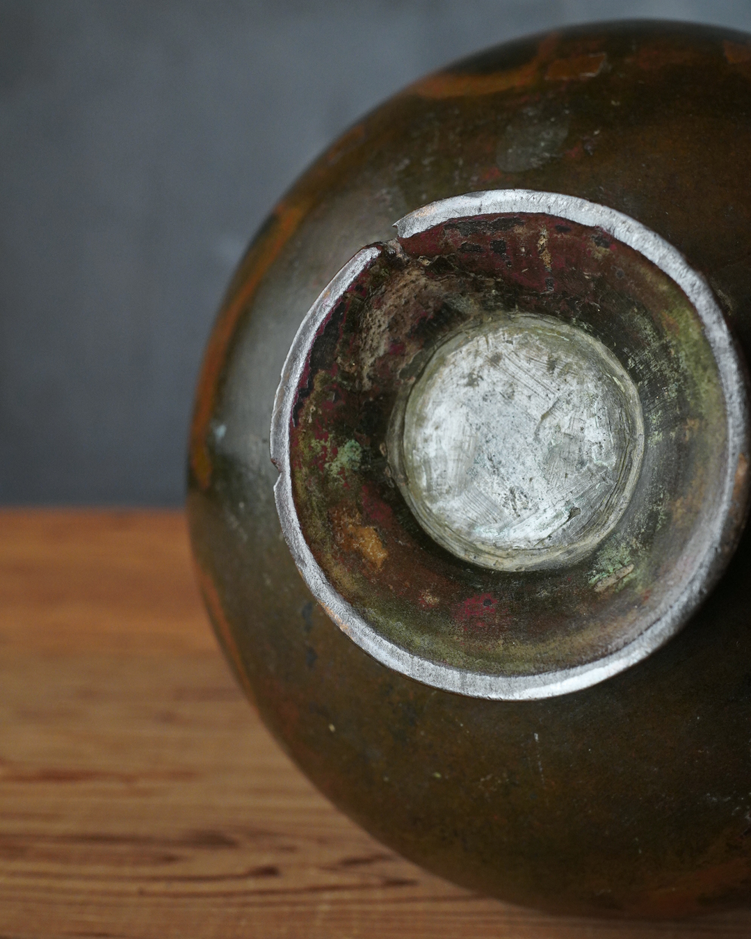 経年による凹みや鋳造の際にできた小孔の補修跡がいくつか、高台の傷みこそ見られますが、それらが気にならないほど本作の持つ気韻は唐物ならではの別格の趣を漂わせています。箱付。17〜18世紀。