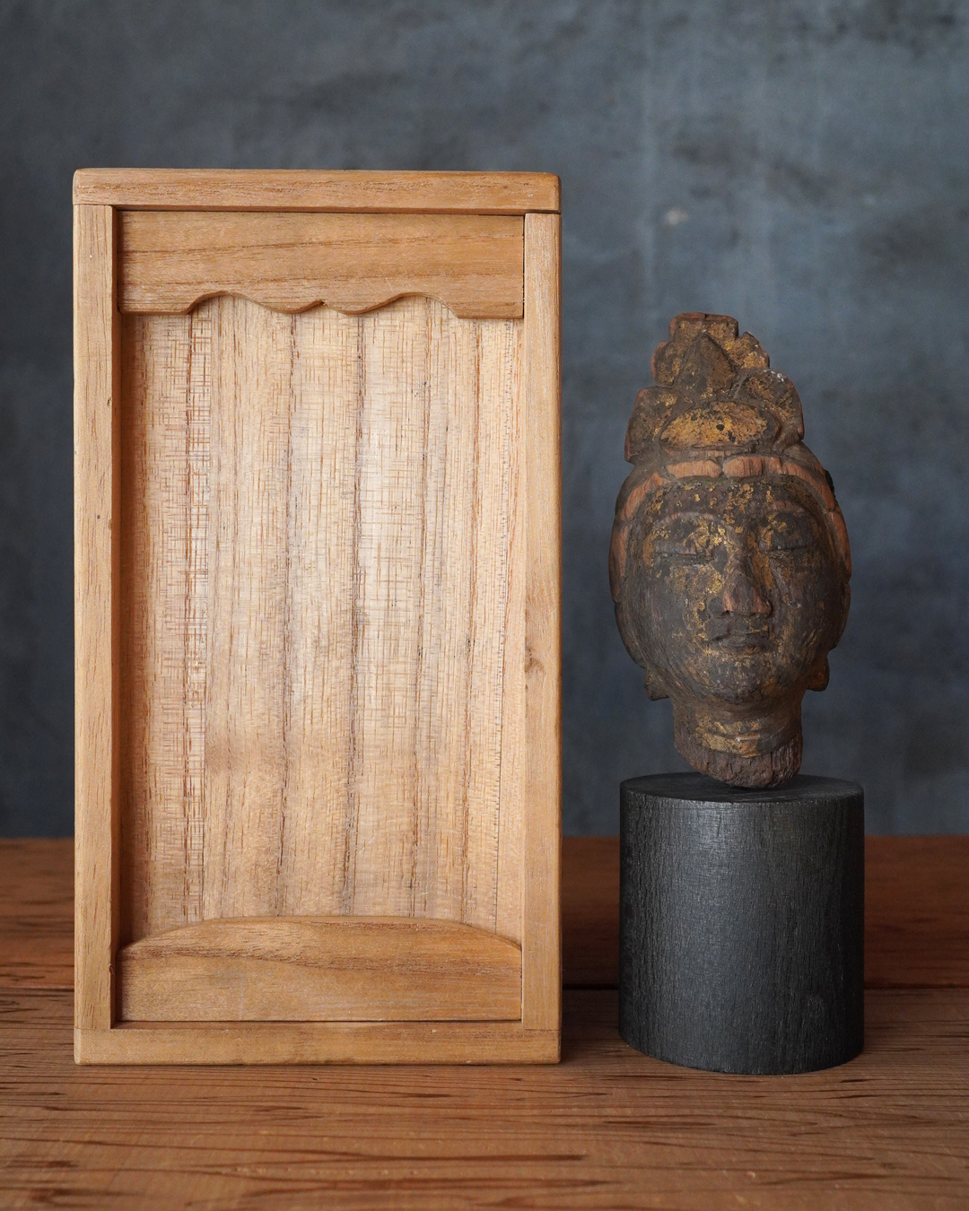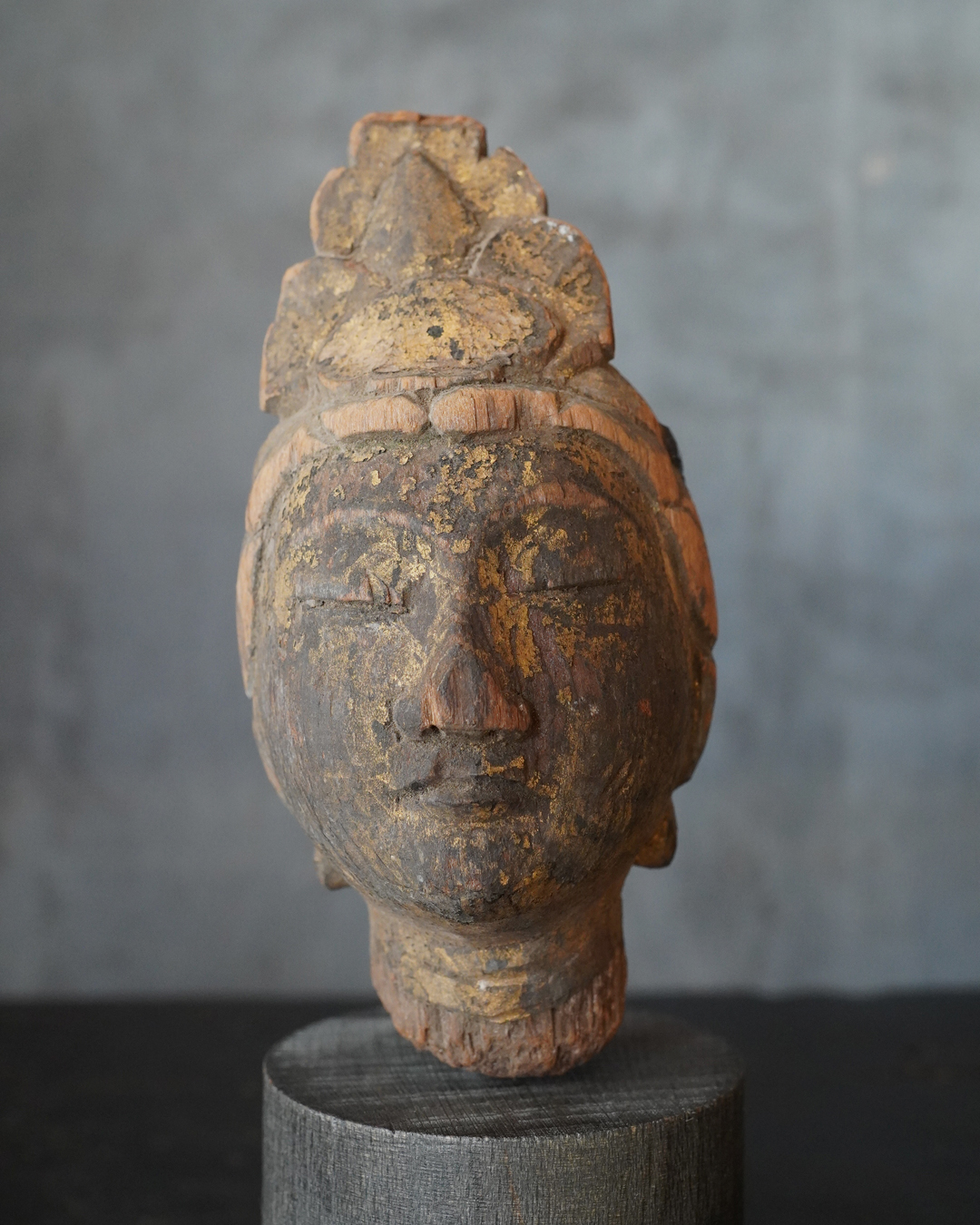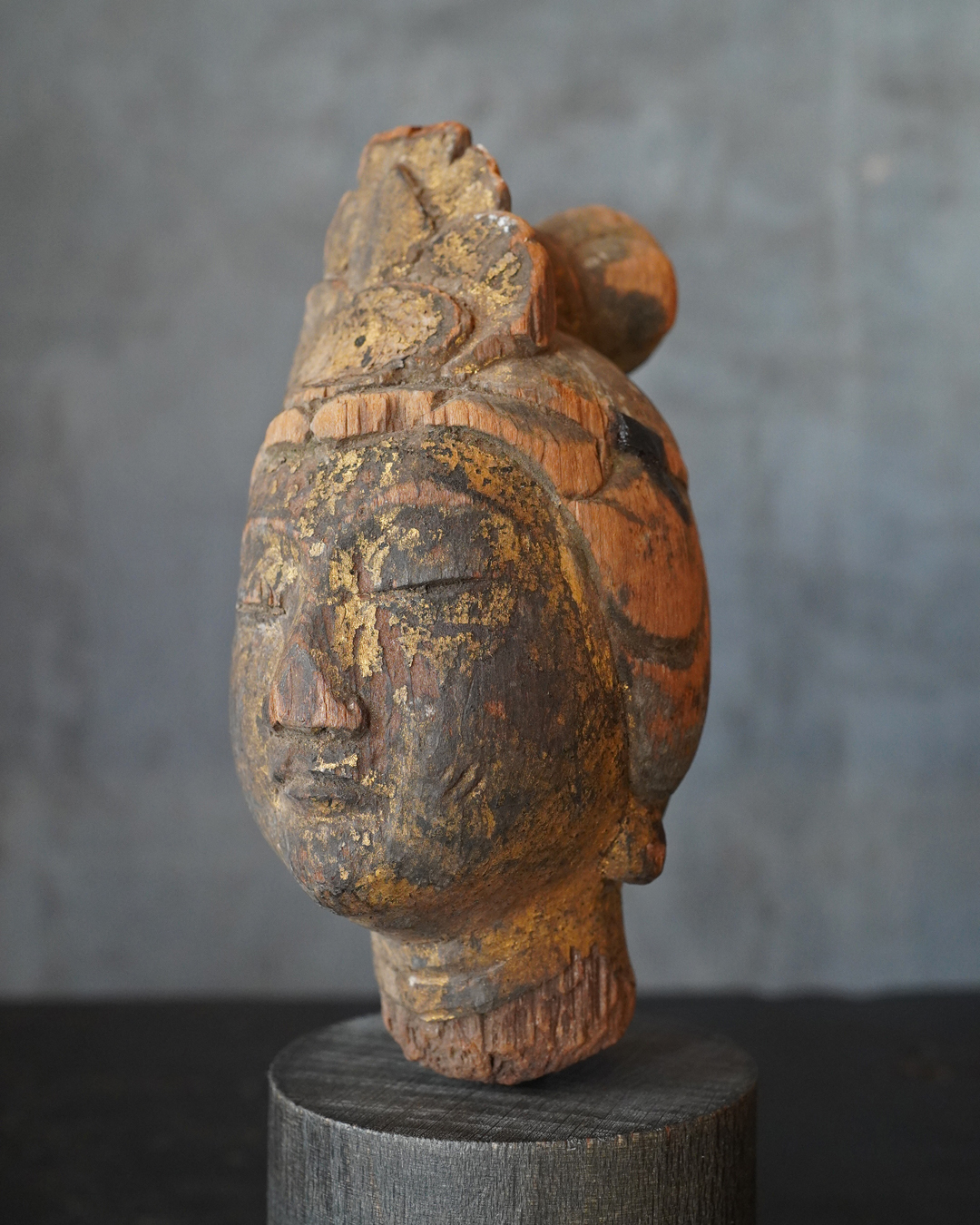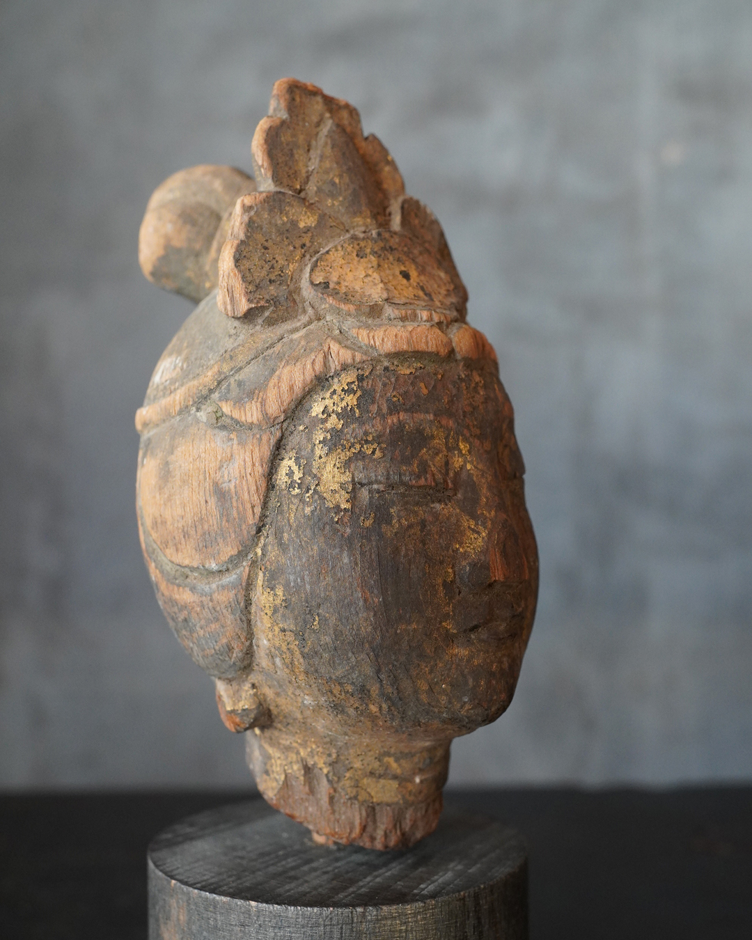 十一面観音像の頭上に配される十面のうちの一つ。穏やかな表情と端正な面貌を備え、作風からは三十三間堂千体観音に通じる雰囲気が感じられます。残欠ではありますが、面相の造形やわずかに残る金彩、用いられている木材の質、自然な経年変化などから、平安時代の作と考えて差し支えないでしょう。これまでに三十三間堂系の作例を何度か扱ってまいりましたが、それらは高さ9cmに満たないのものが多く、本作はそれらと比べて一回り、二回りほど大きく感じられます。このような寸法の作例も十分考えられますが、同時代の別寺院に由来する可能性も含めて捉えるのが妥当でしょう。