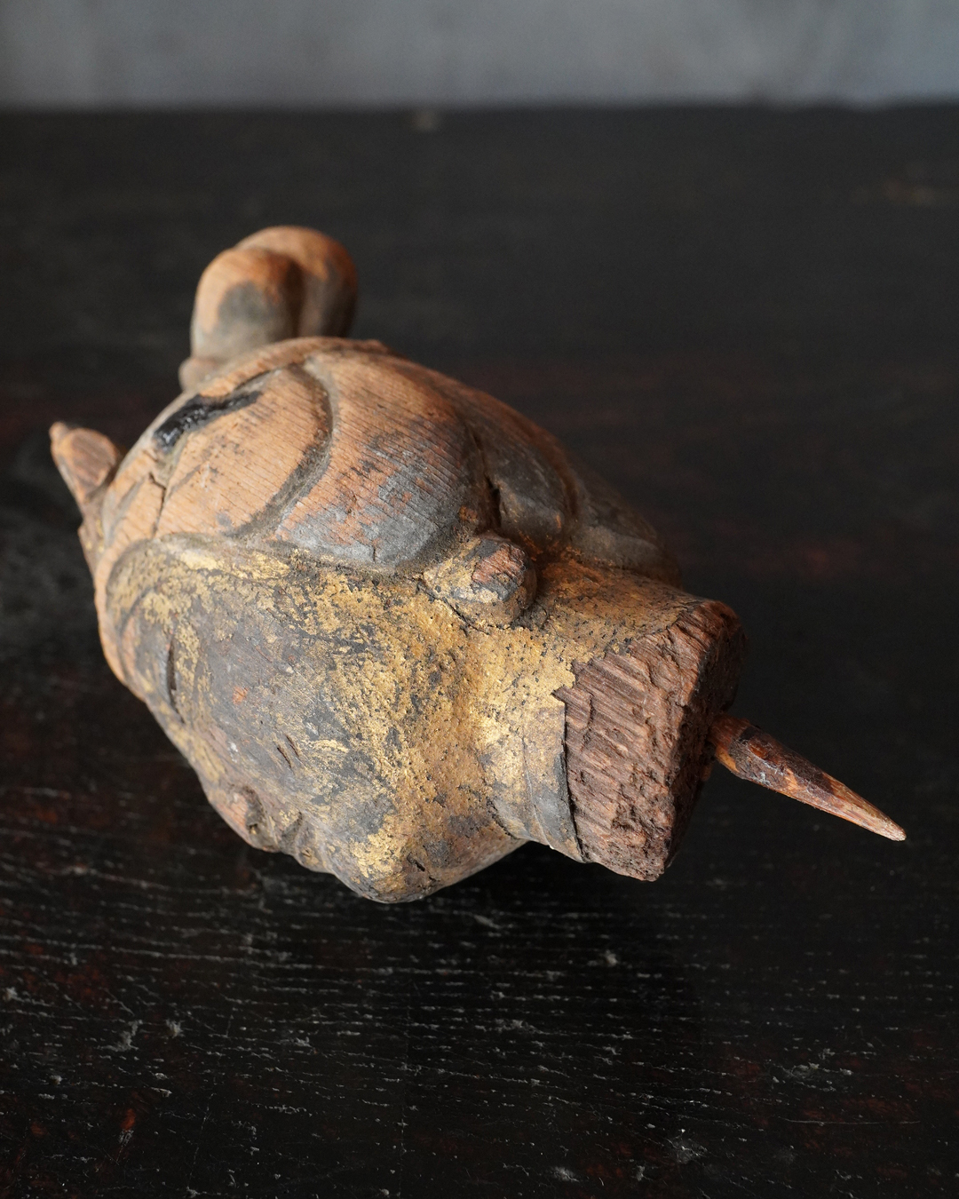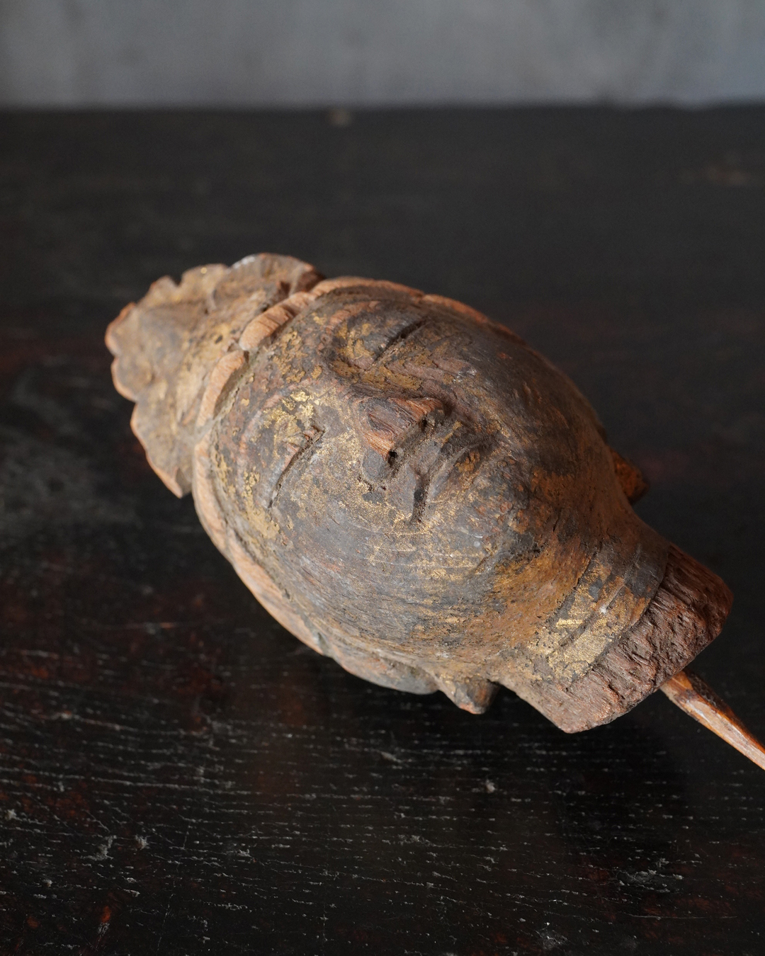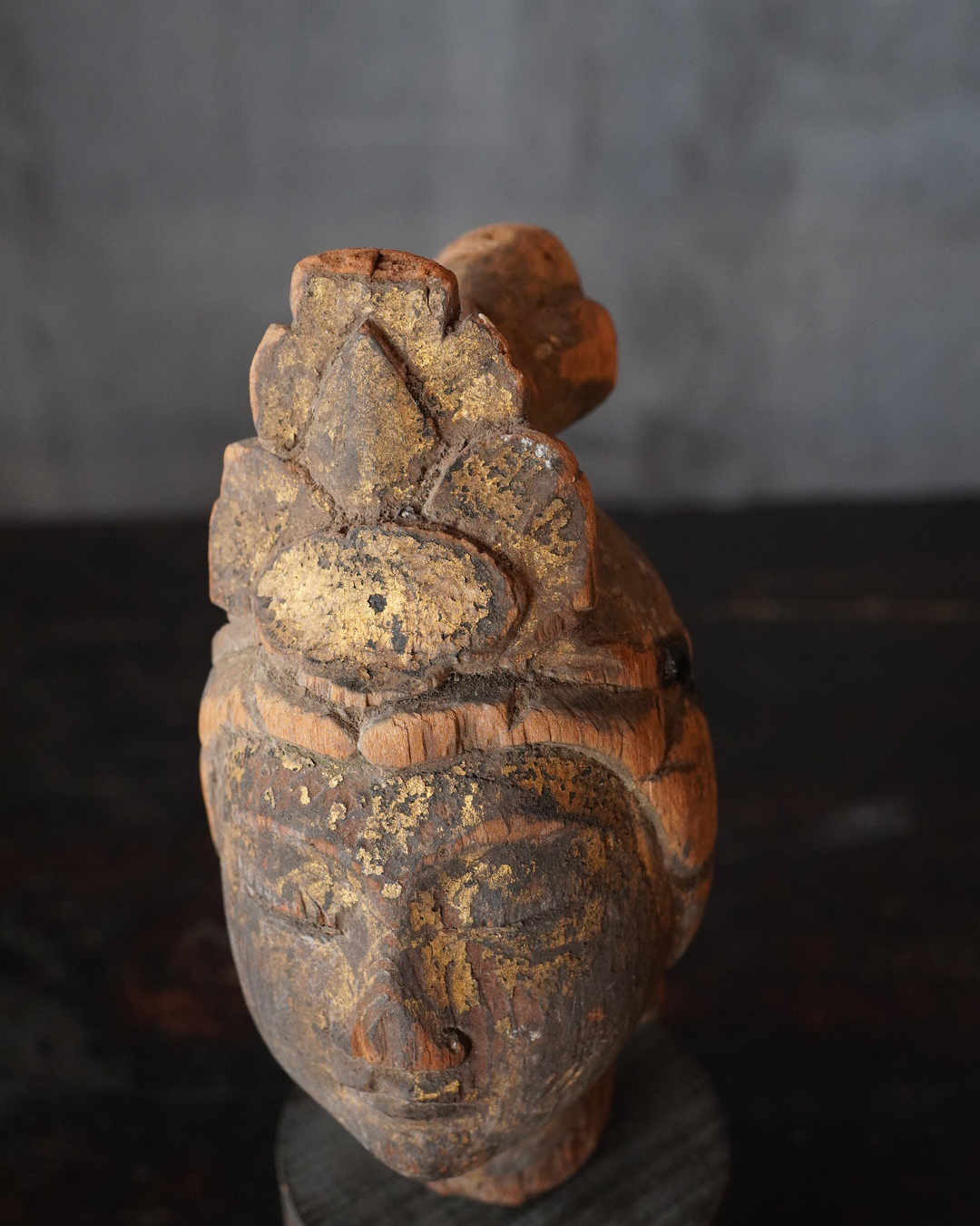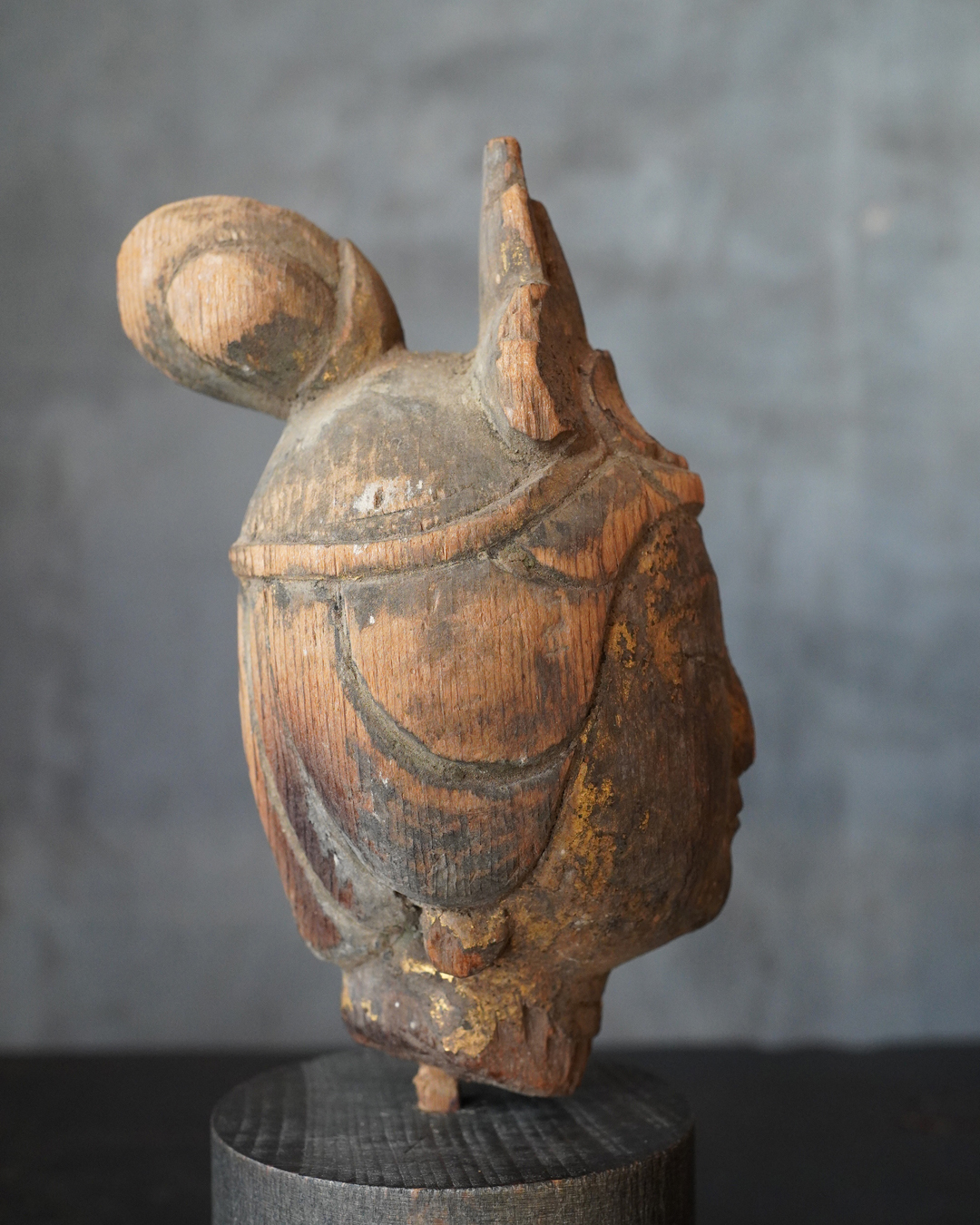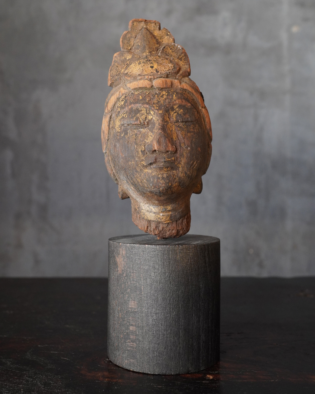 十一面観音像の頭上に配される十面のうちの一つ。穏やかな表情と端正な面貌を備え、作風からは三十三間堂千体観音に通じる雰囲気が感じられます。残欠ではありますが、面相の造形やわずかに残る金彩、用いられている木材の質、自然な経年変化などから、平安時代の作と考えて差し支えないでしょう。これまでに三十三間堂系の作例を何度か扱ってまいりましたが、それらは高さ9cmに満たないのものが多く、本作はそれらと比べて一回り、二回りほど大きく感じられます。このような寸法の作例も十分考えられますが、同時代の別寺院に由来する可能性も含めて捉えるのが妥当でしょう。